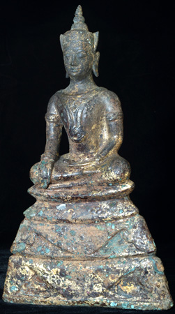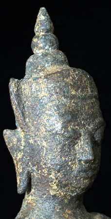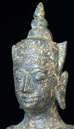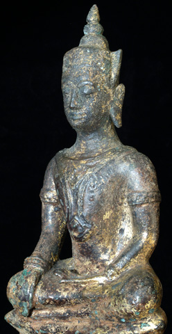 This is a very nice classic Ayuthaya Buddha in Royal Attire. He is a lovely face and very good overall feel. A good size at 10.5 inches tall. Has a wonderfully complex patina, with remains of lacquer and gilding. Nice balance between the proportions of the base and the Buddha.