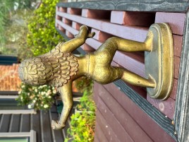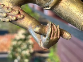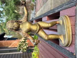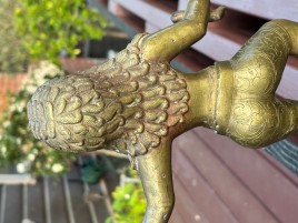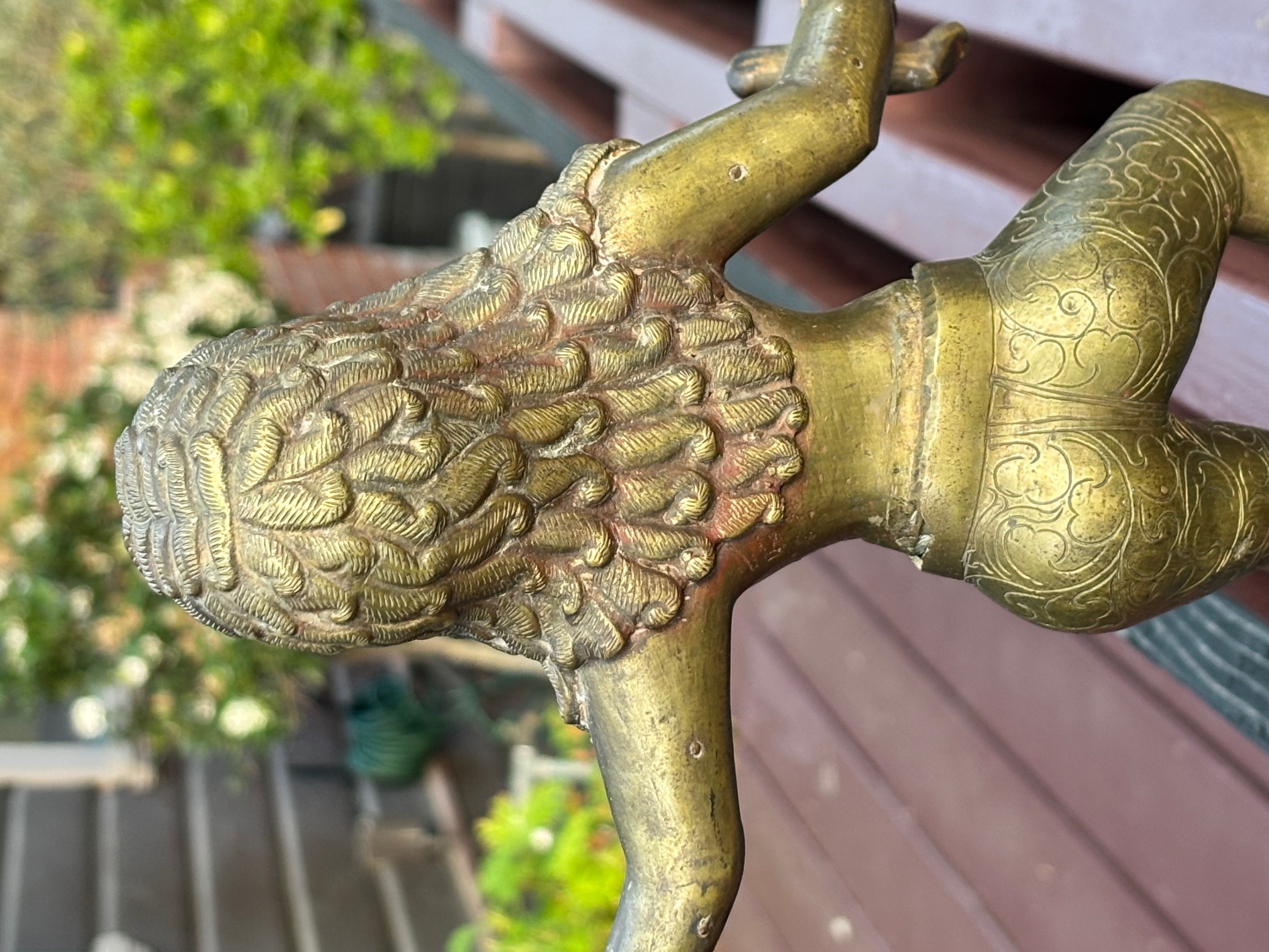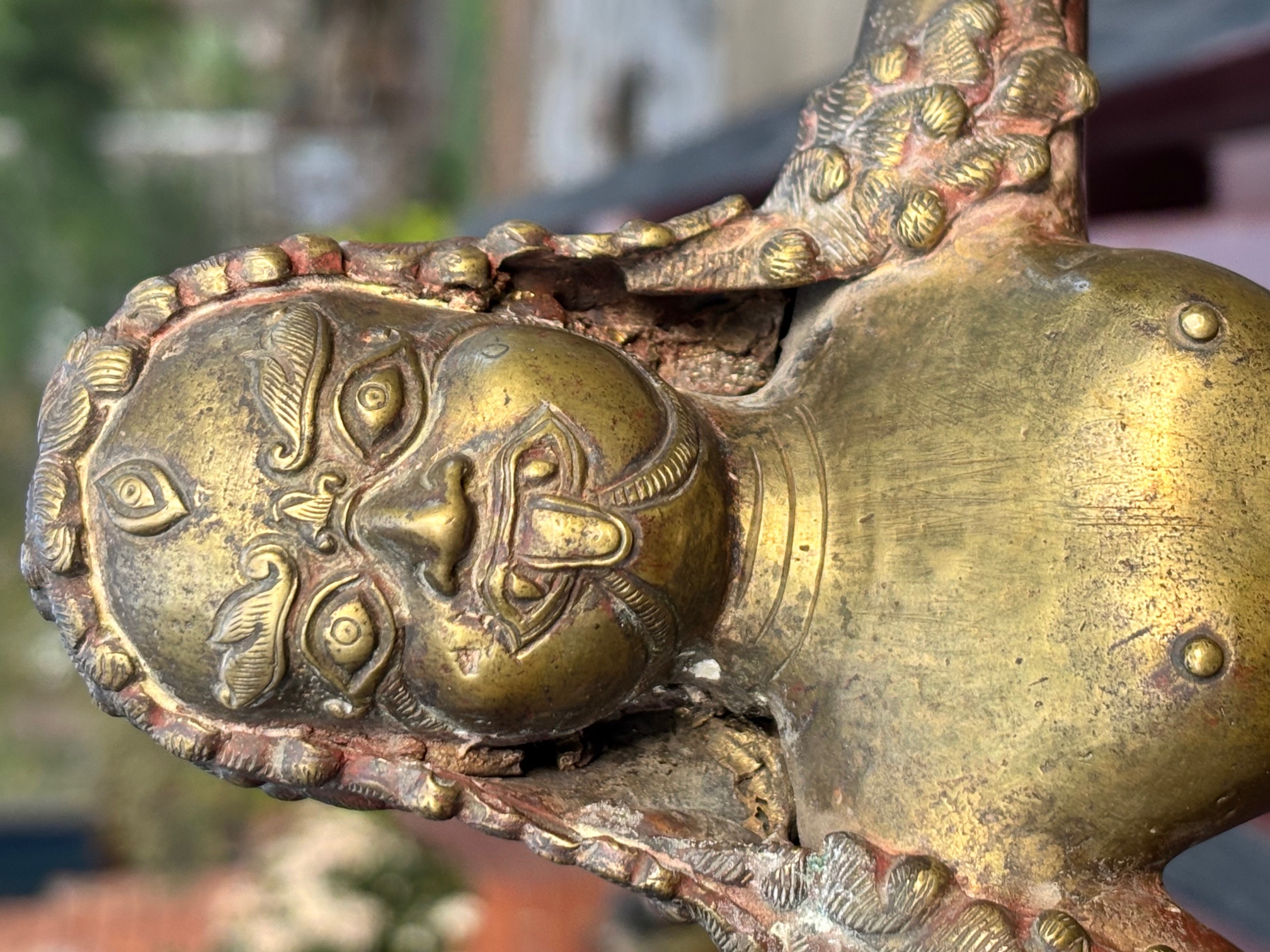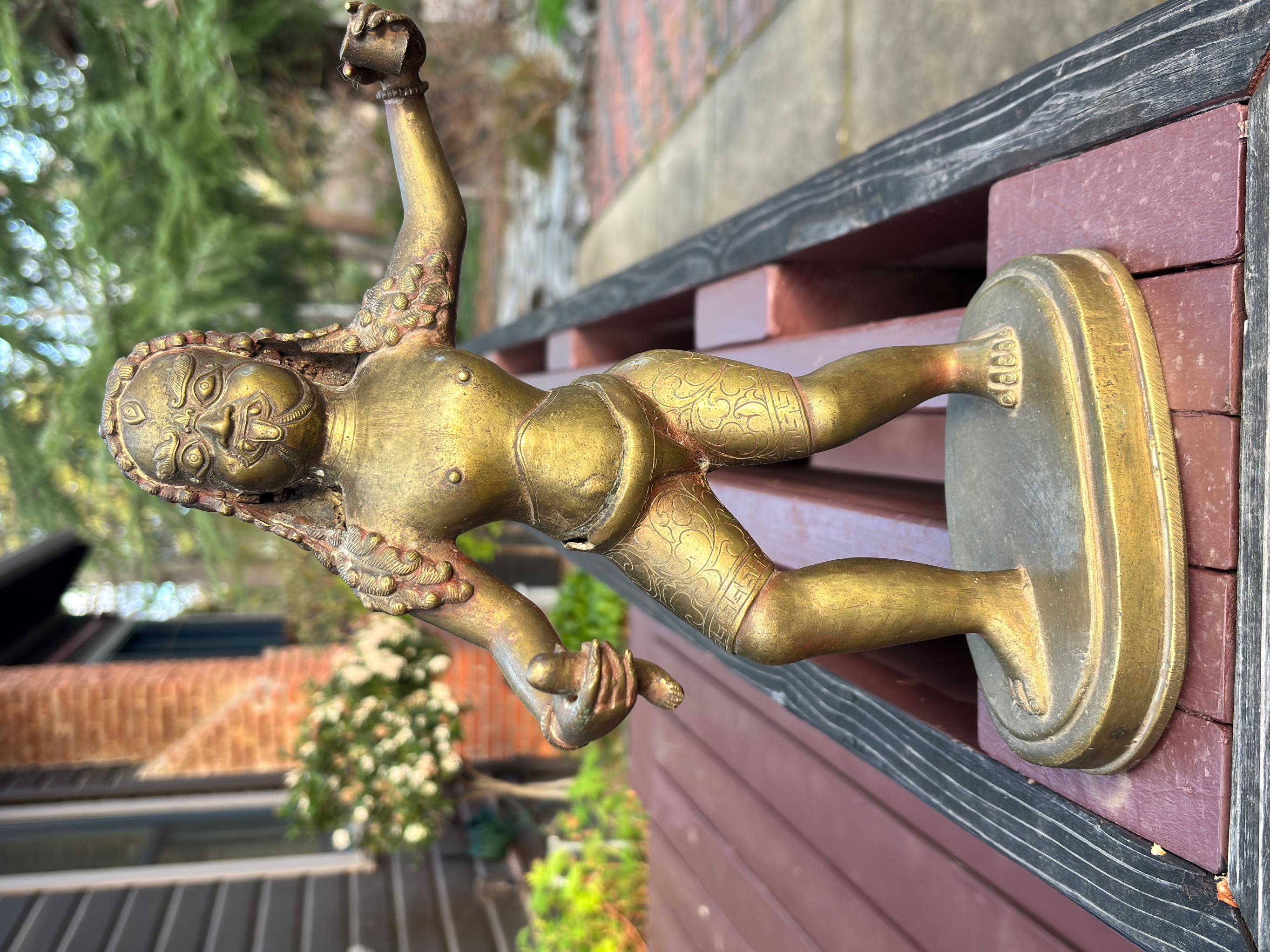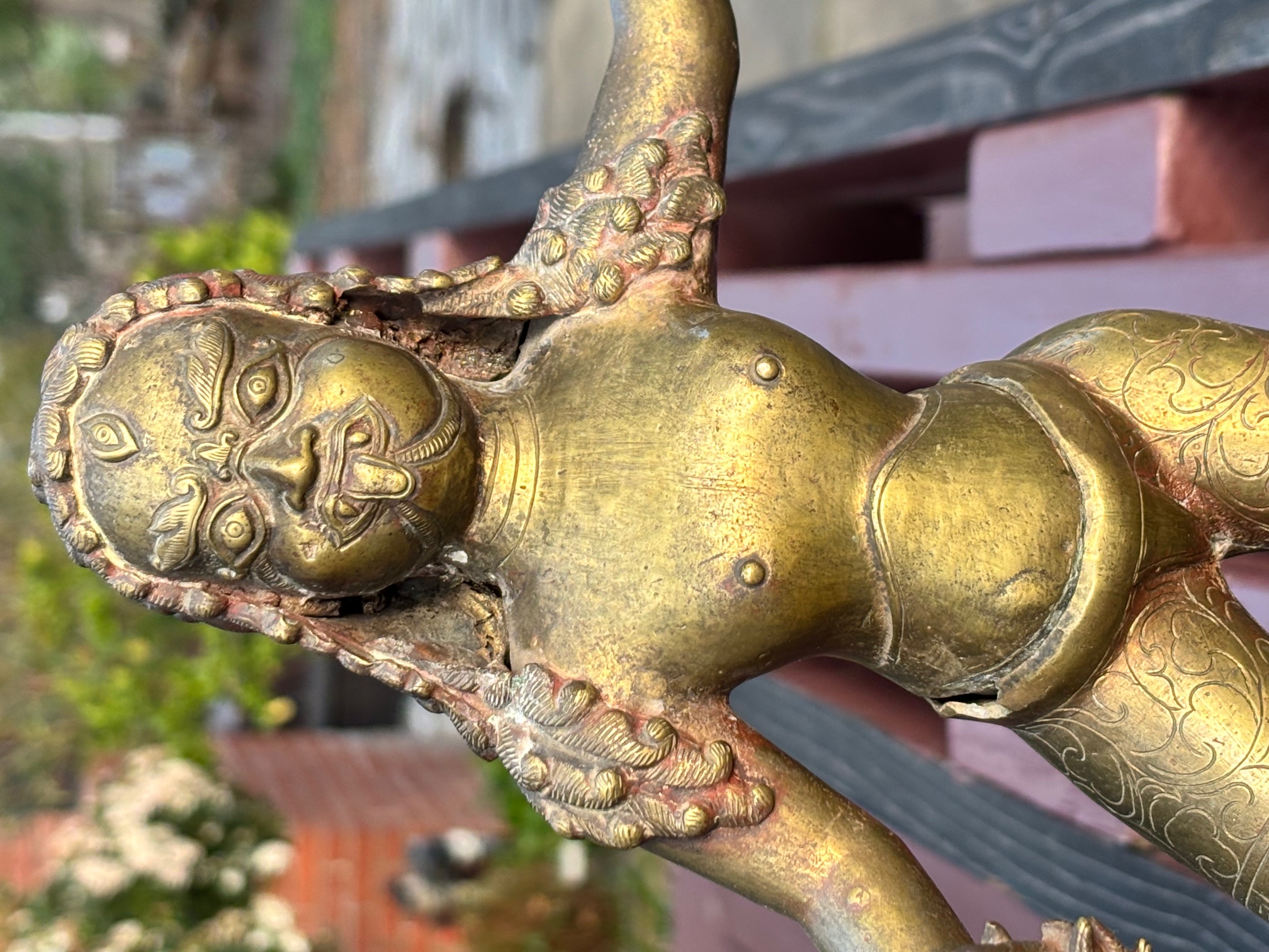 Powerful 18th/early 19thC/early 19thC Nepalese dakini. Cast in two halves in bronze, which is typical for this time period. It is currently possible to take it apart. I was going to crimp it more tightly together so that it was more solidly held in one, but I thought it was more interesting to leave it 'as is' so that the next owner could see what the inside looks like. It is up to them whether to leave it as is or to tighten it up or not. You can see what the inside looks like in the photos. Rare type, good size. 11.25"H x 8"W x 3.5"D