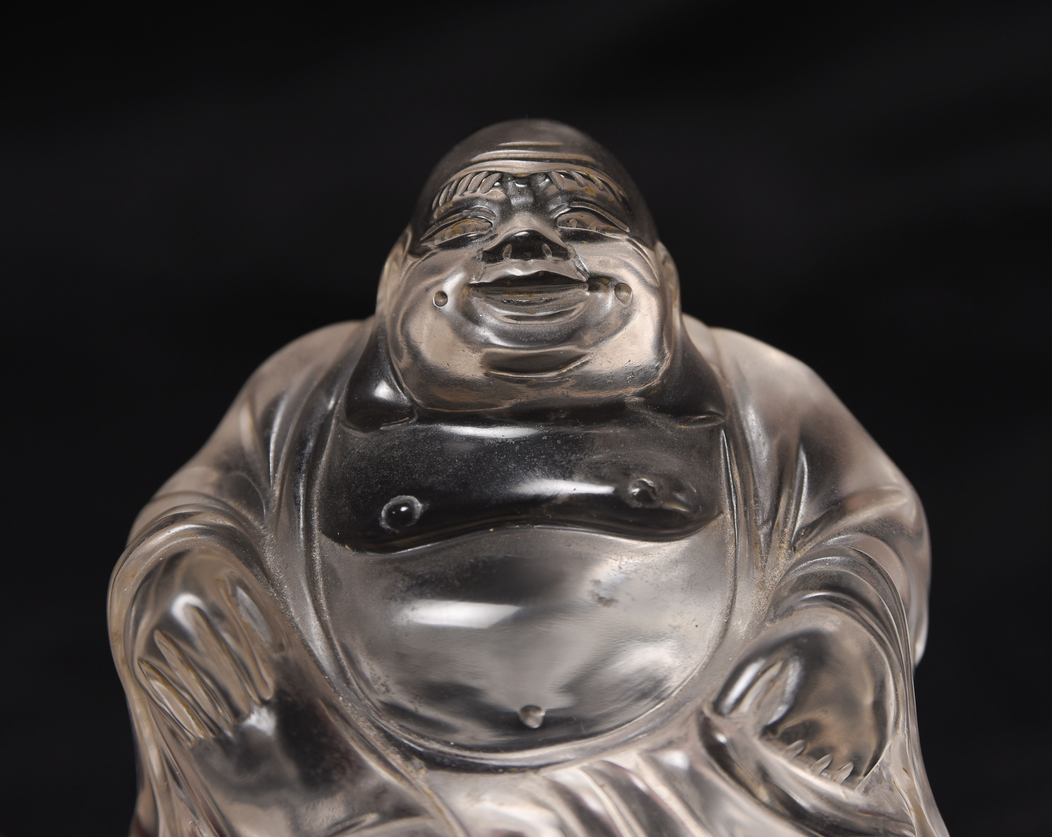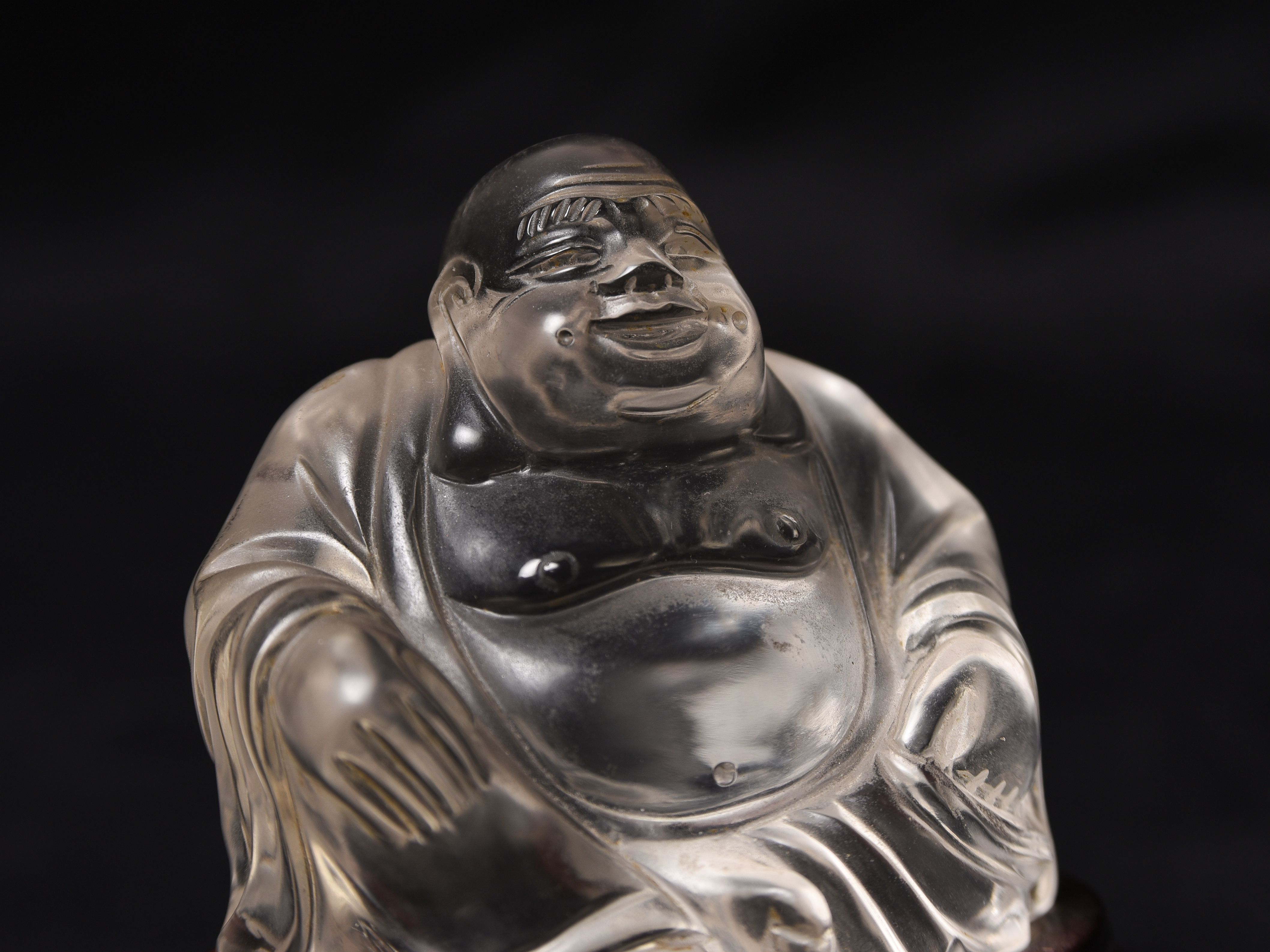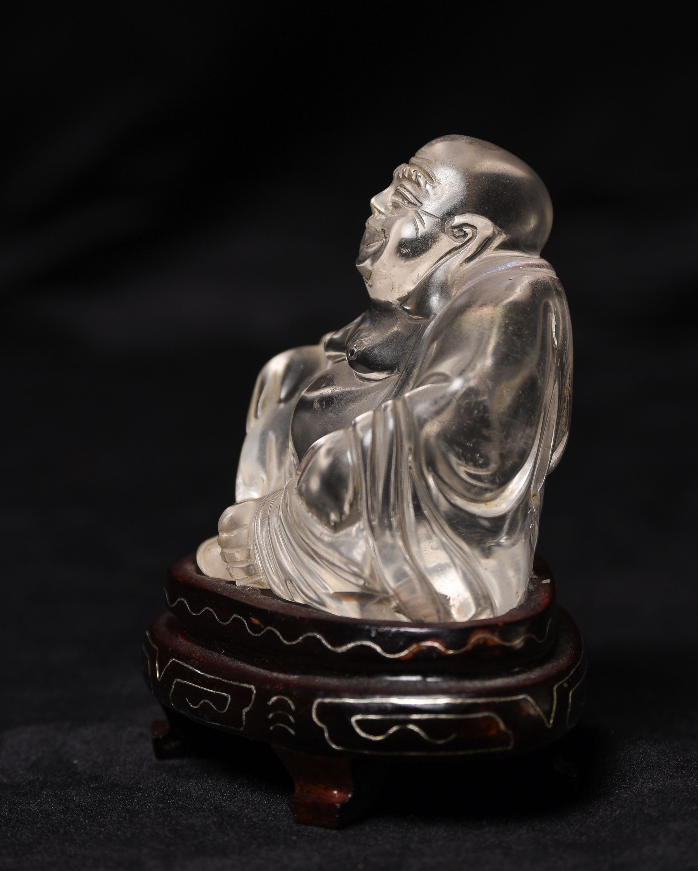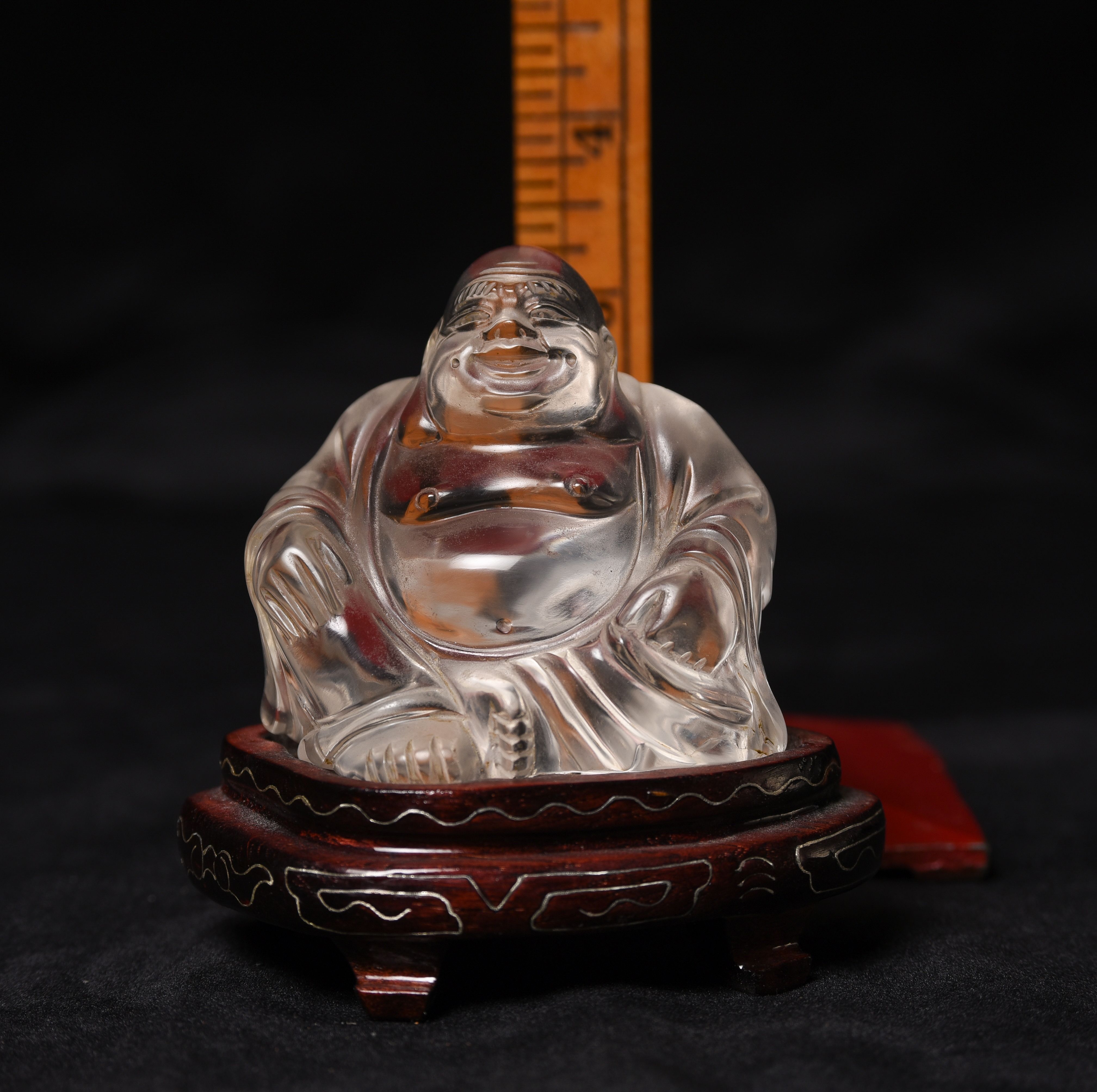 Chinese Quartz Crystal Hotai ("Happy Buddha" ) Really nice carving. Substantial piece of very clear quartz. Quartz is 2.5 inches tall by 2.75 inches wide (not including wire inlaid custom stand). Estate piece.