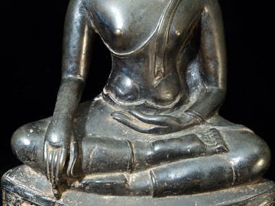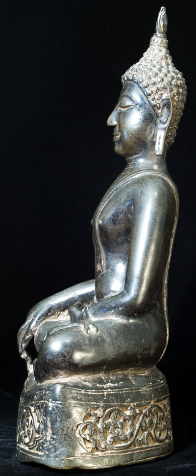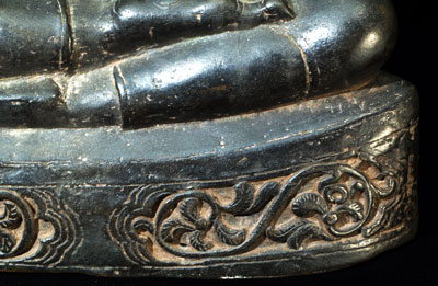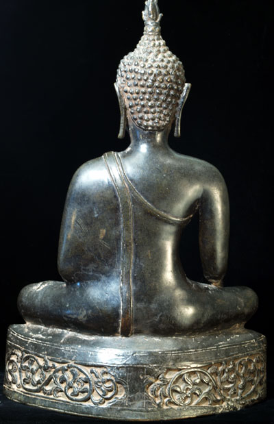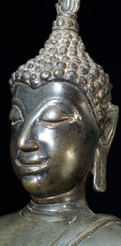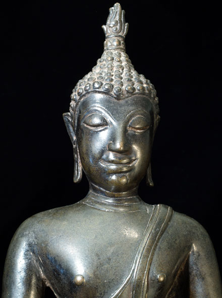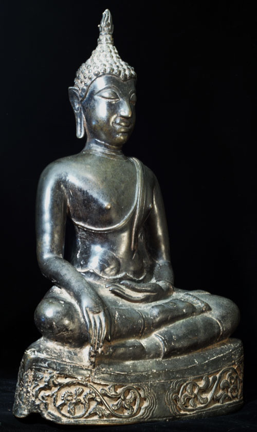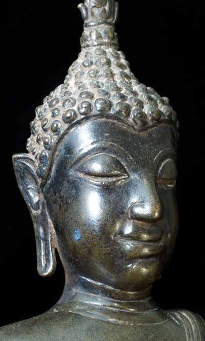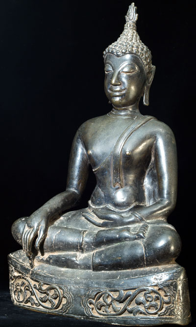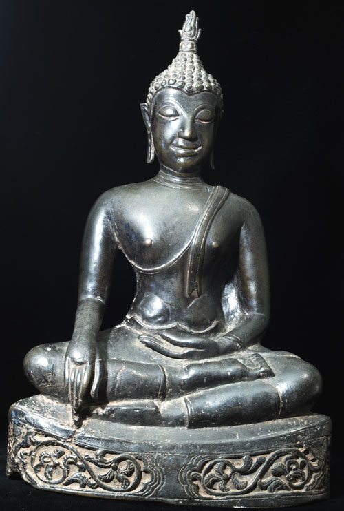 This is a personal favorite- a very rare Northern Sukothai Buddha. Wonderful, unusual face and uncommon base. . Traces of black lacquer remain. Not inexpensive- quite special. Sits 13.5 inches tall by 9 inches wide at the base.