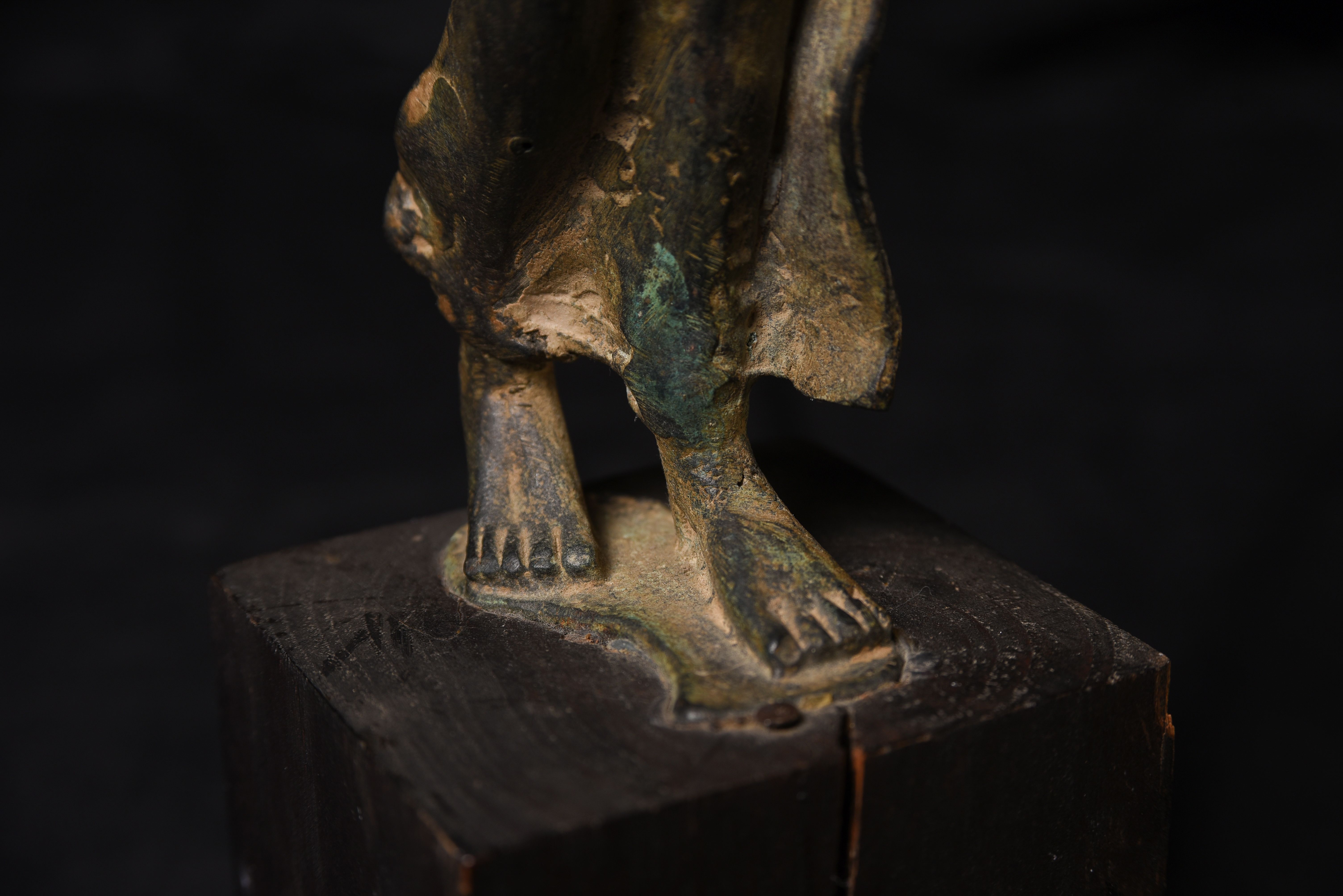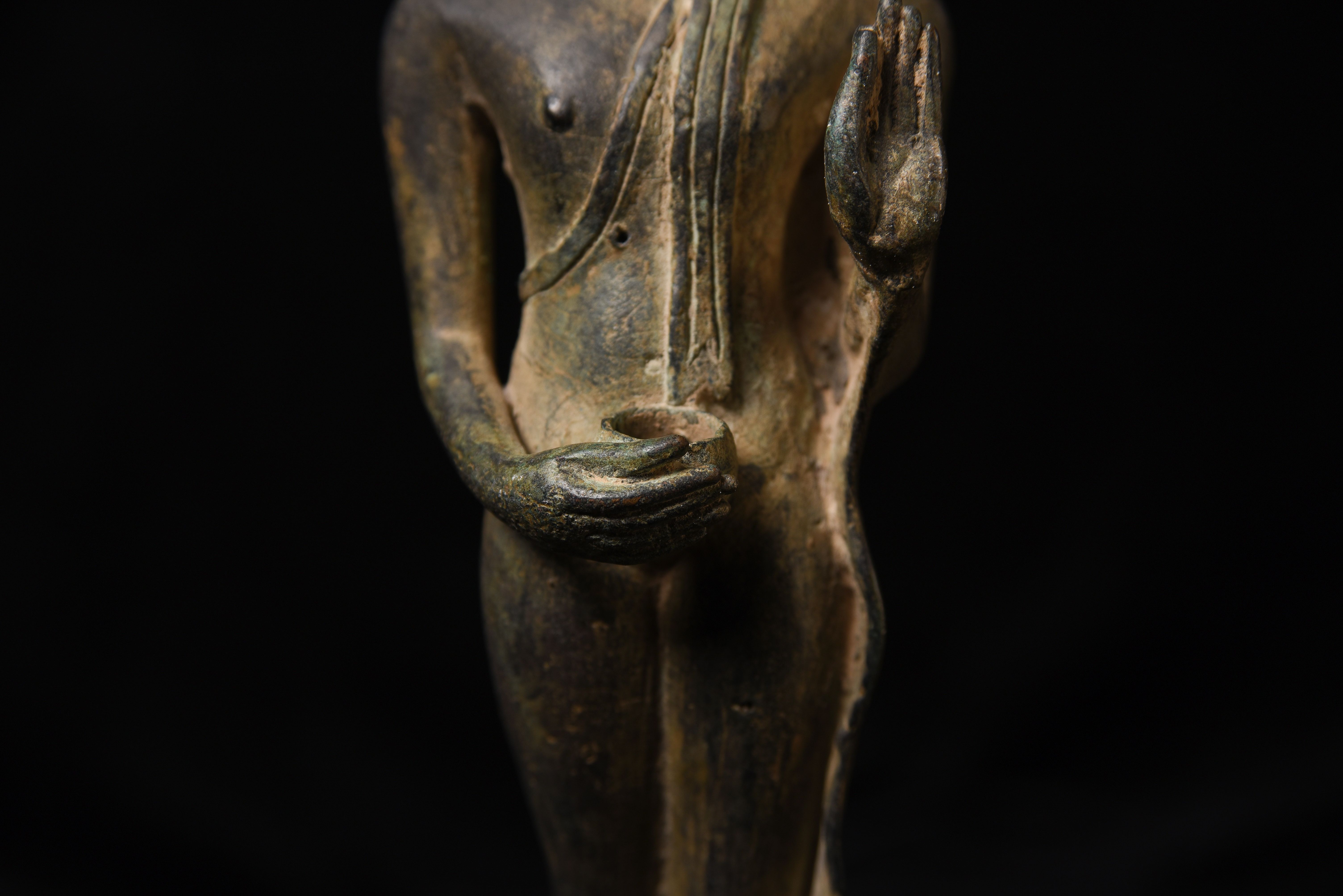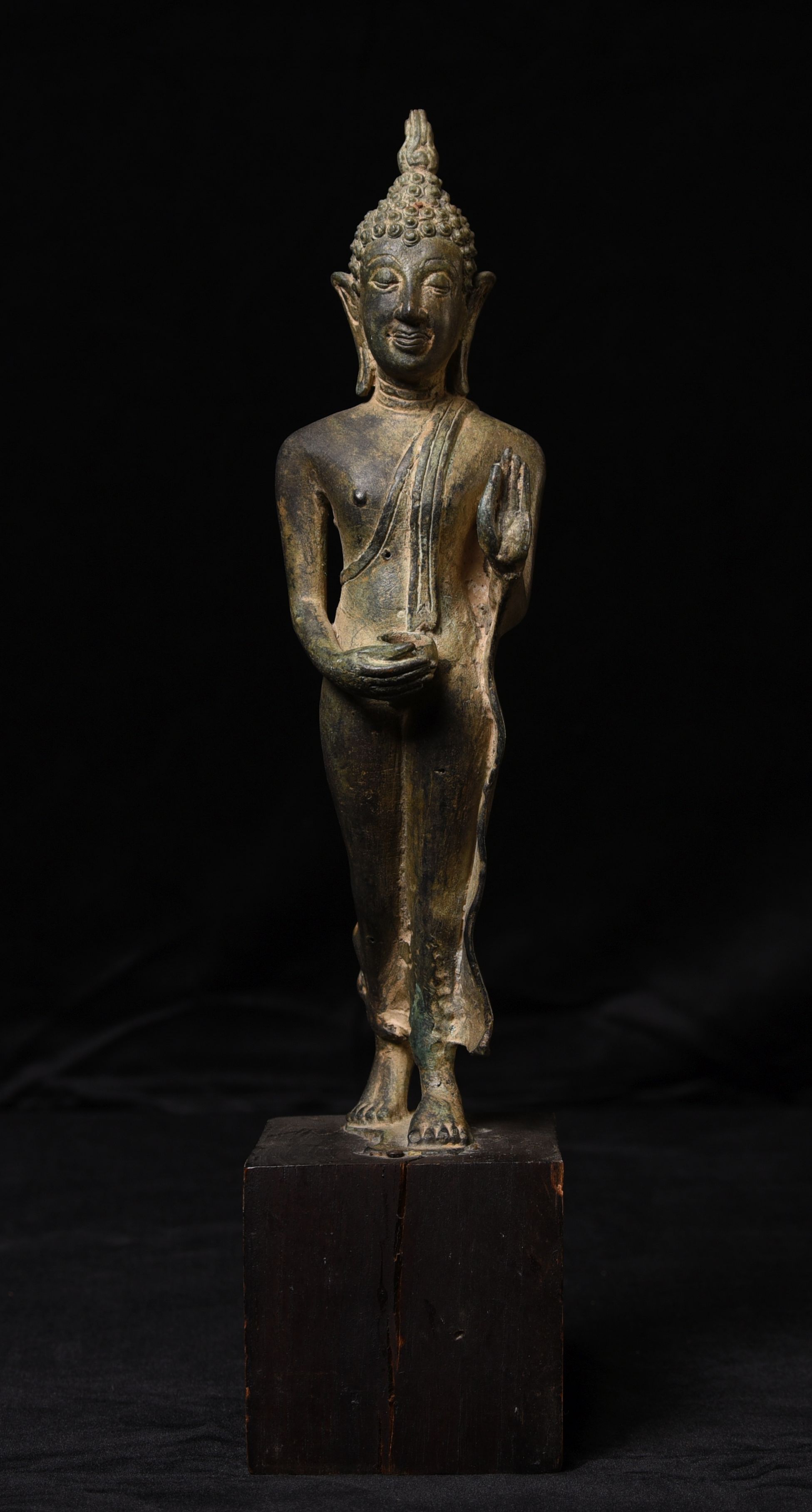 Northern Thai bronze Walking Buddha- probably late 19th/Beginning of the 20th (King Rama V Period). It has quite a different feel and look than the much more common Rattanokosin Walking Buddha from the same period, which is typically adorned with elaborate attire. This one is a very rare type. 10.5 inches tall, 13.5 including the base (base is cracked)