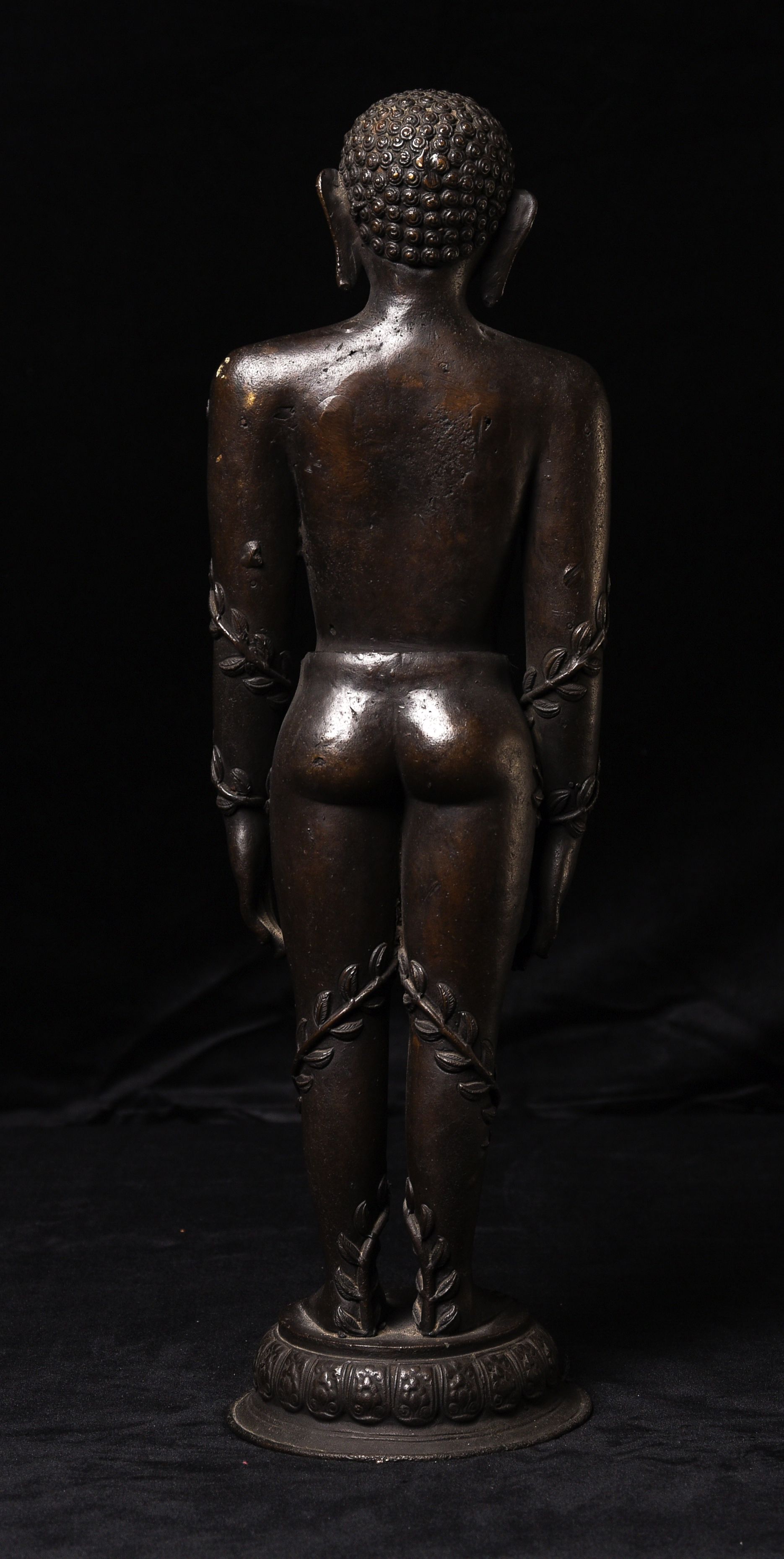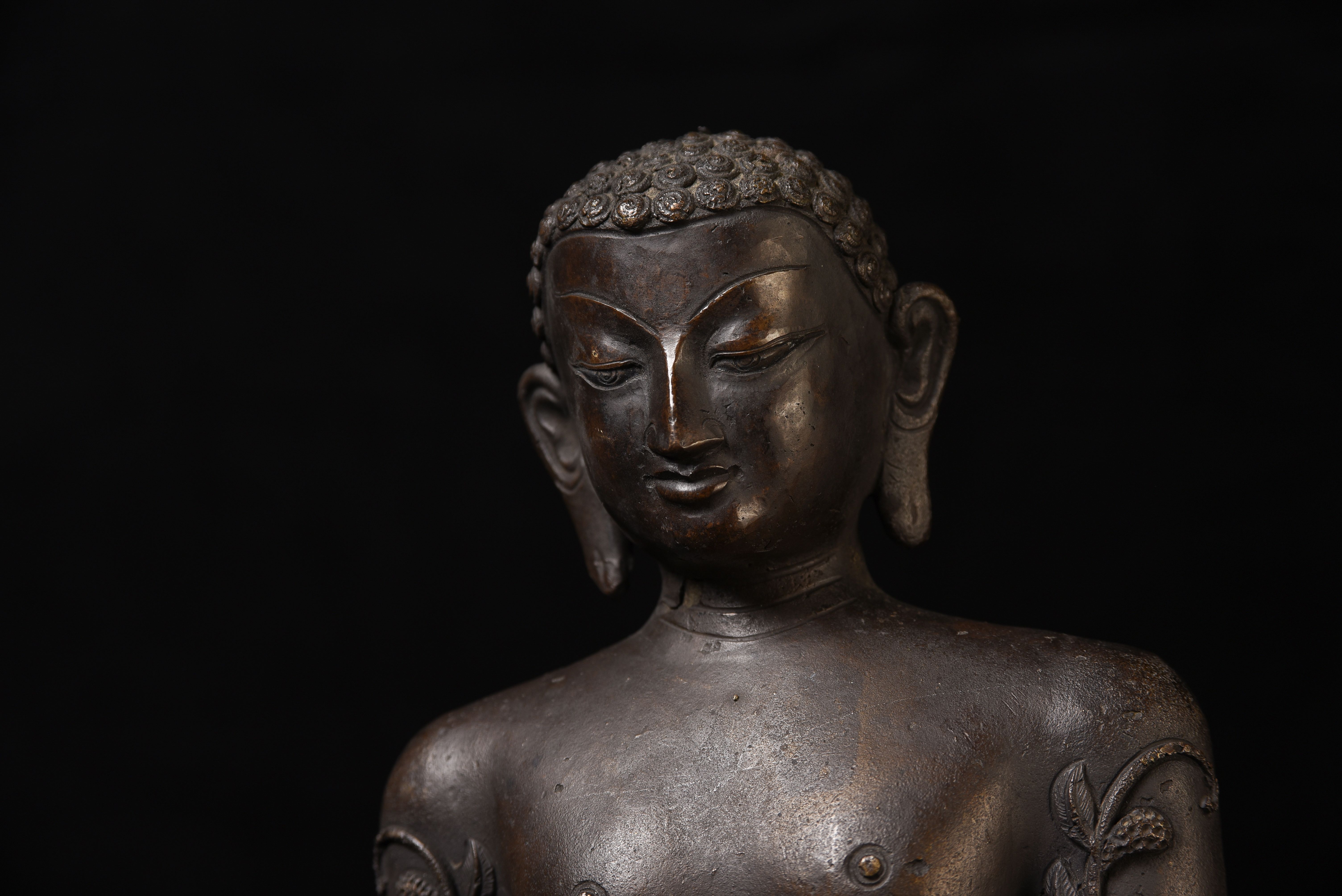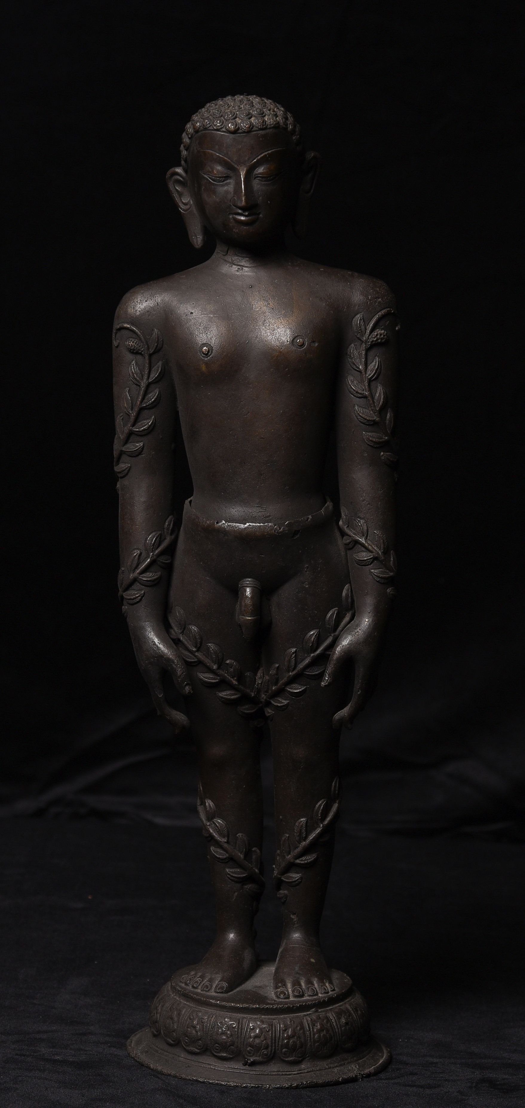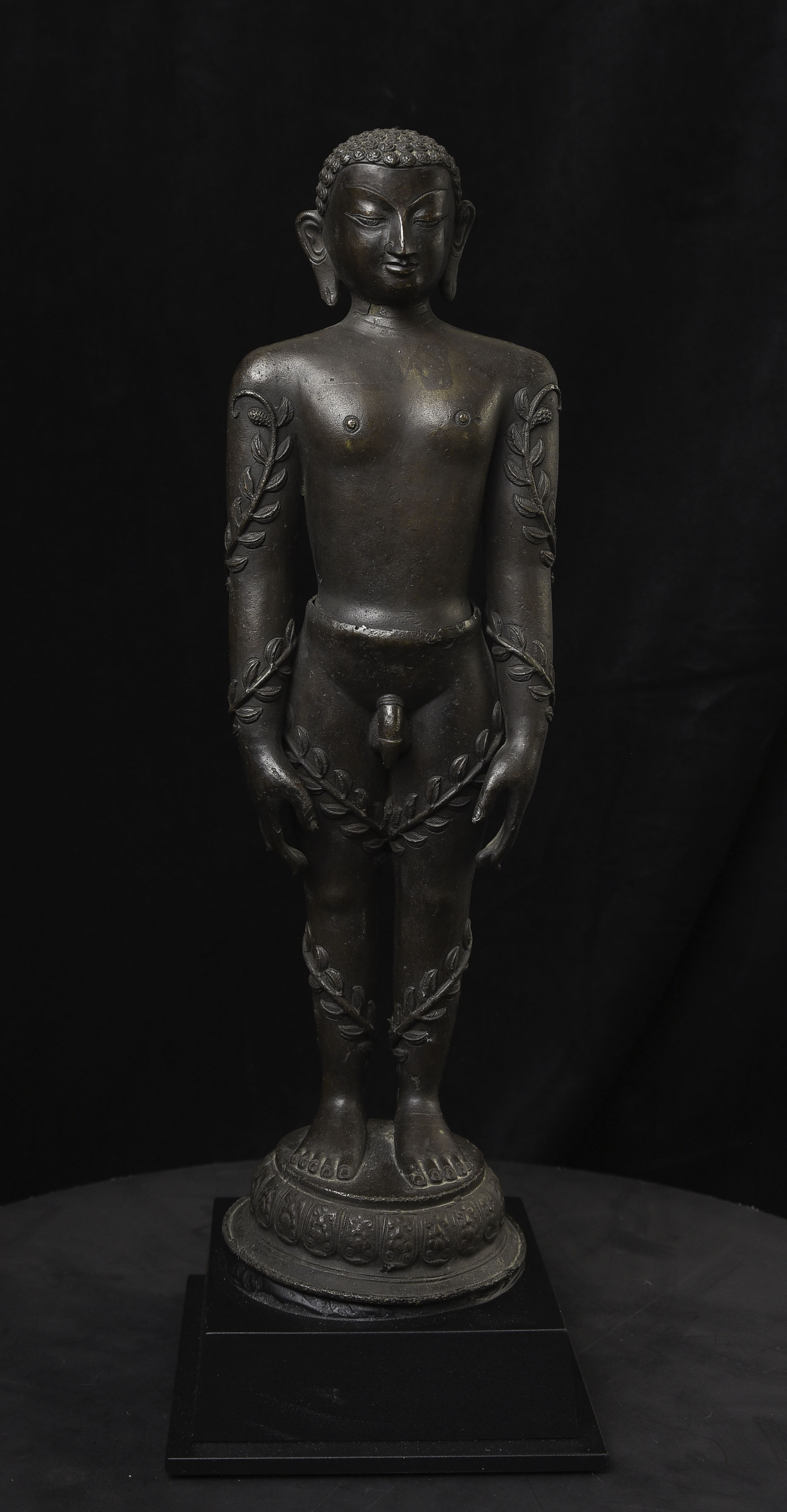 Large Nepalese bronze Jain figure. I had thought it was 18/19th- just saw a very close example in a good German Auction house dated Circa 1600 to 1700 ad. Rare to find in this very large size. The new custom museum-style base makes the figure stand straight.