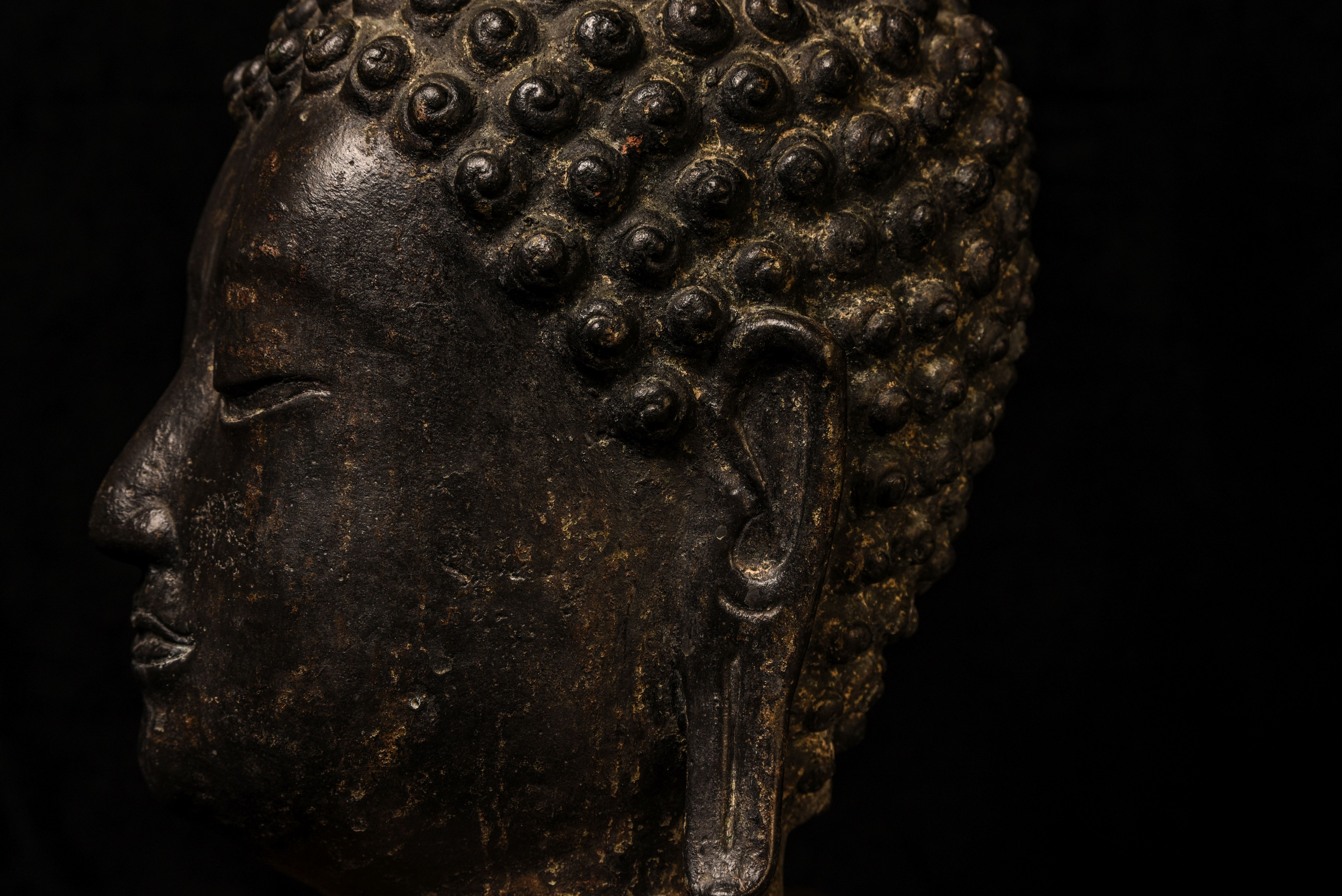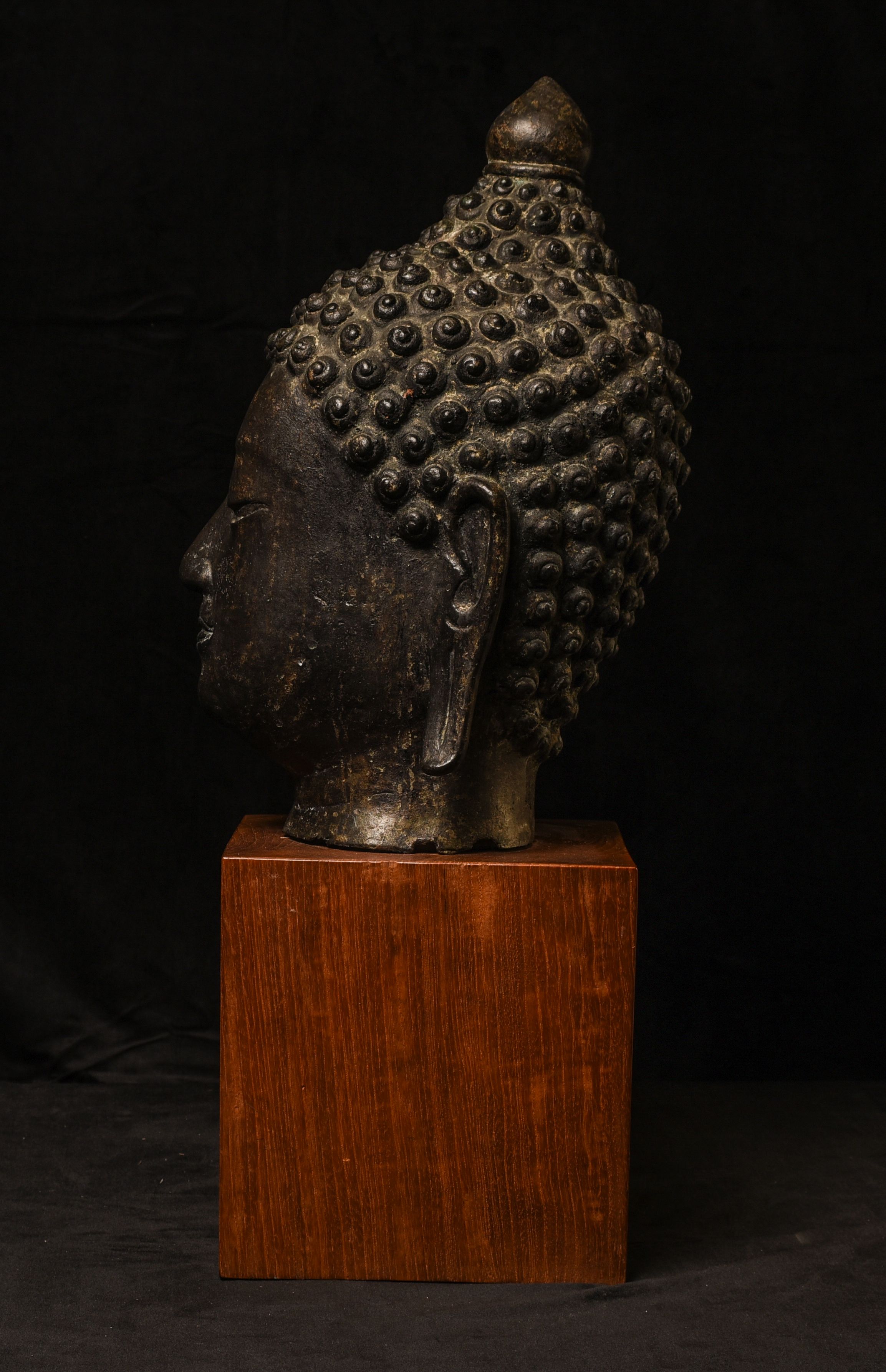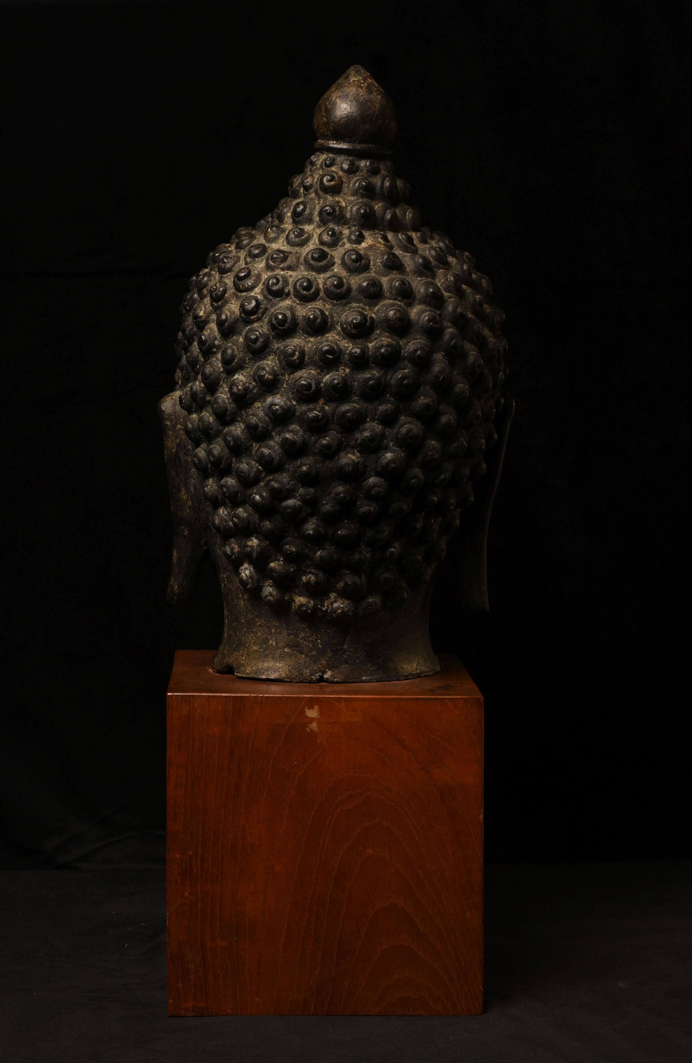 Large decorative Thai Buddha head. Very well priced for its size/impact. 16 inches tall for the head only (23 inches on the base) ,but much larger than the height alone suggests (much larger than life) due to the overall roundness. Deep concentration, this Buddha commands any room into which it is placed.