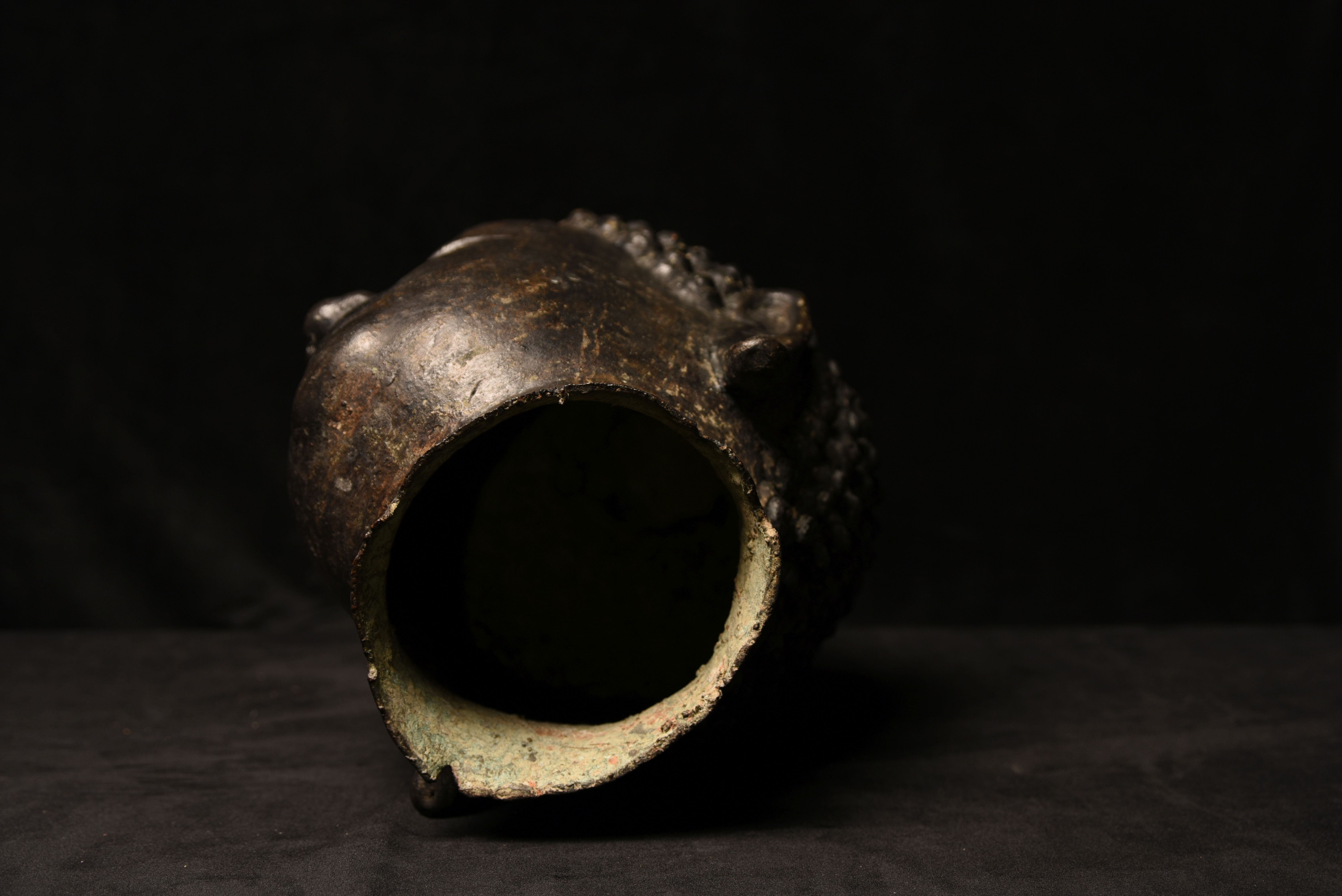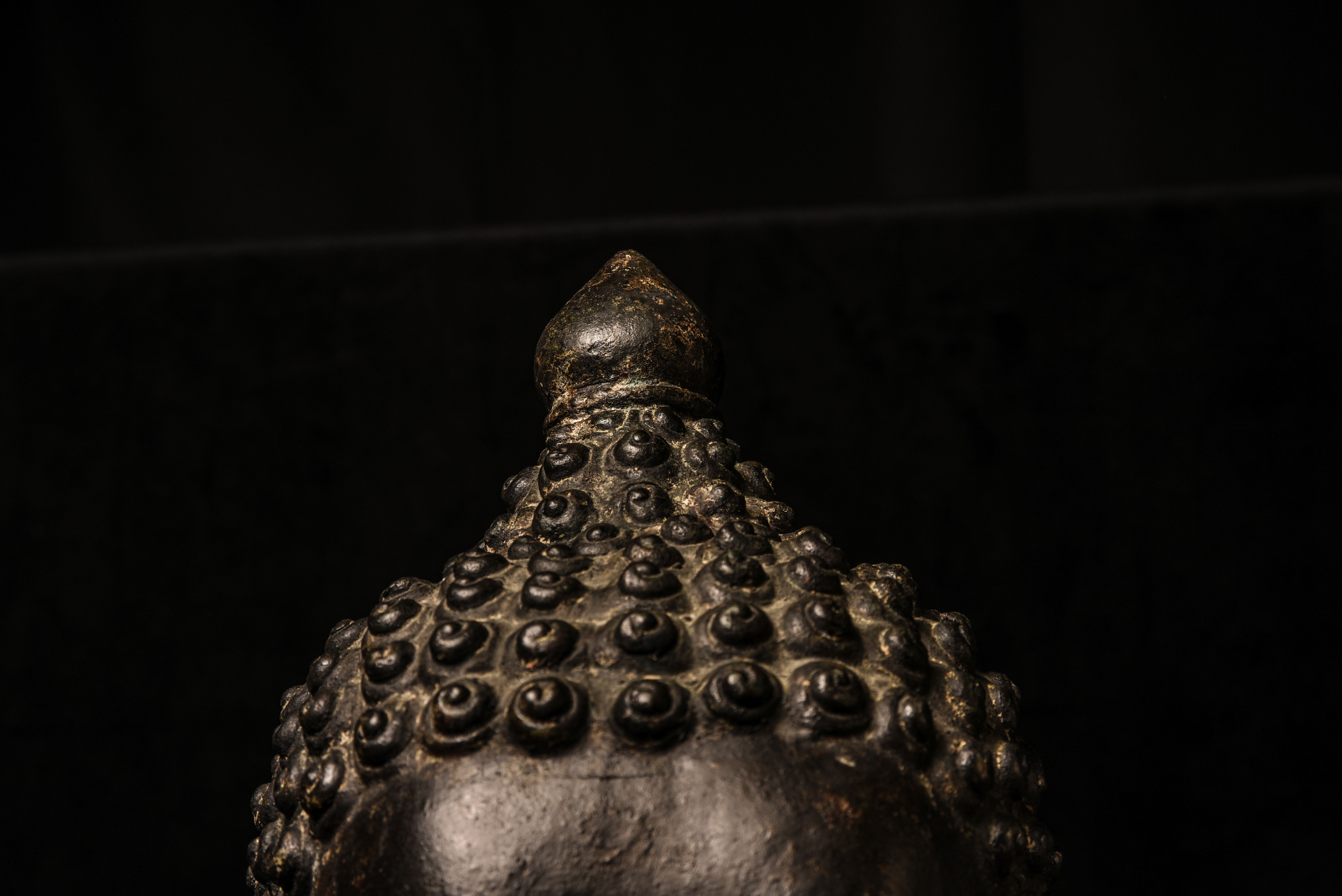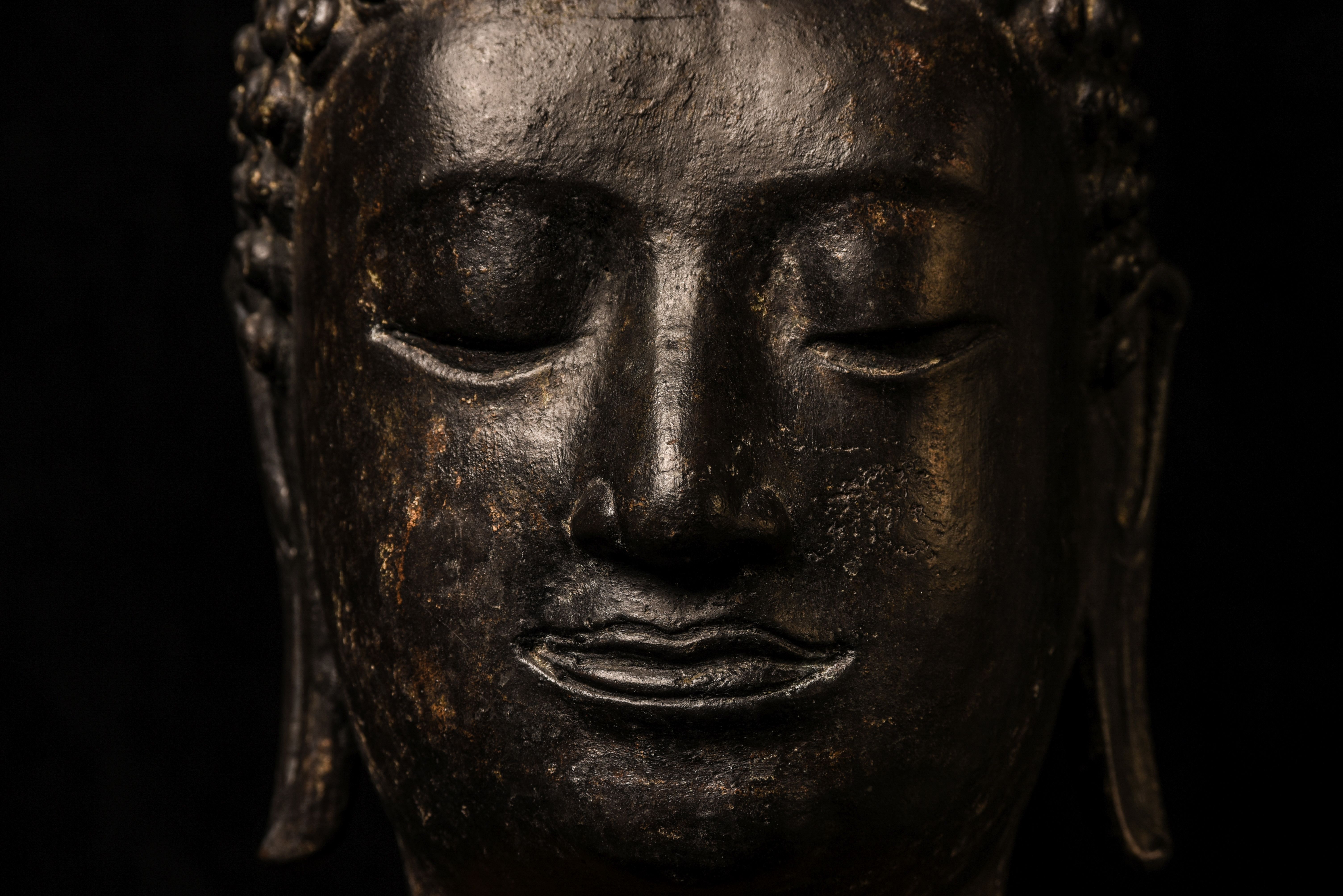 Large decorative Thai Buddha head. Very well priced for its size/impact. 16 inches tall for the head only (23 inches on the base) ,but much larger than the height alone suggests (much larger than life) due to the overall roundness. Deep concentration, this Buddha commands any room into which it is placed.
