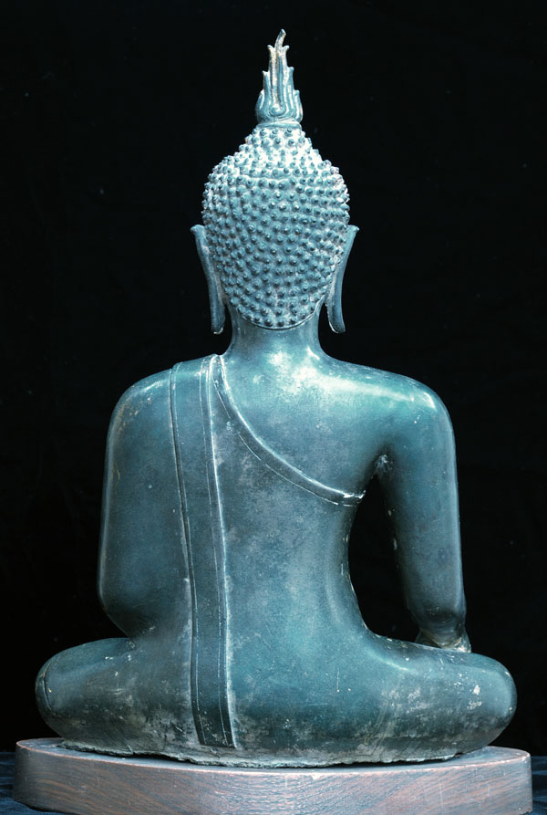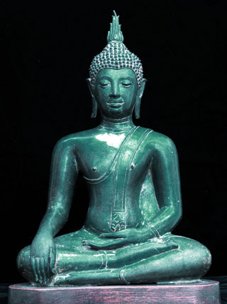 This is a 15thC Northern Thai Buddha of the highest caliber. He has an intense jade green patina with some traces of gilding and lacquer which is still evident around the hair . His face is supremely beautiful in a way which is hard to put in to words. This is simply one of the best Buddhas I have ever owned, and it is certainly the best I have ever offered for sale. It is also the most expensive, although for very good reason. Even in high end auction catalogues you will rarely find Northern Thai Buddhas of this quality (and when you do take a look at their auction estimates). Sits 15.25 inches tall by 10 inches wide at the knees, although he is larger than the dimensions convey. This Buddha (as is also true for many other medium and large high quality Northern Thai Buddhas of this type from this period) does not have the original base- they were removed during an early period during which the bronze was needed to make other Buddha images. On his traditional base this Buddha would sit a good 20 inches high.