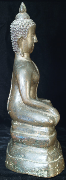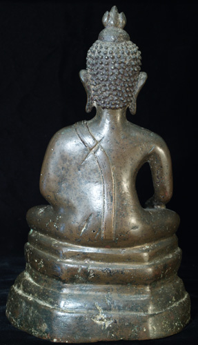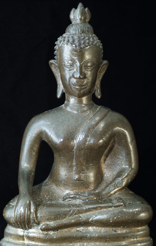 Very rare bronze Buddha from the kingdom of Payao, which was located in an area of the mountains of what is now Northern Thailand. Almost all of the Buddhist sculpture created in the classic period from this area was sculpted in terracotta or stone. This is only the second Payao bronze I have managed to purchase in 20 years, and the first was quite small. Buddhas from this area have very distinctive long faces, with wonderful mouths. This particular Buddha incorporates aspects of Sri Lankan and Sukothai Buddhist art- this is evident in things such as the style of the finial, the short base, the hairline, and the proportions of the arms and legs. There are traces of an inscription on the front of the base. He has an untouched chocolate brown patina and sits 9 and 3/8 inches tall by 5.5 inches wide.