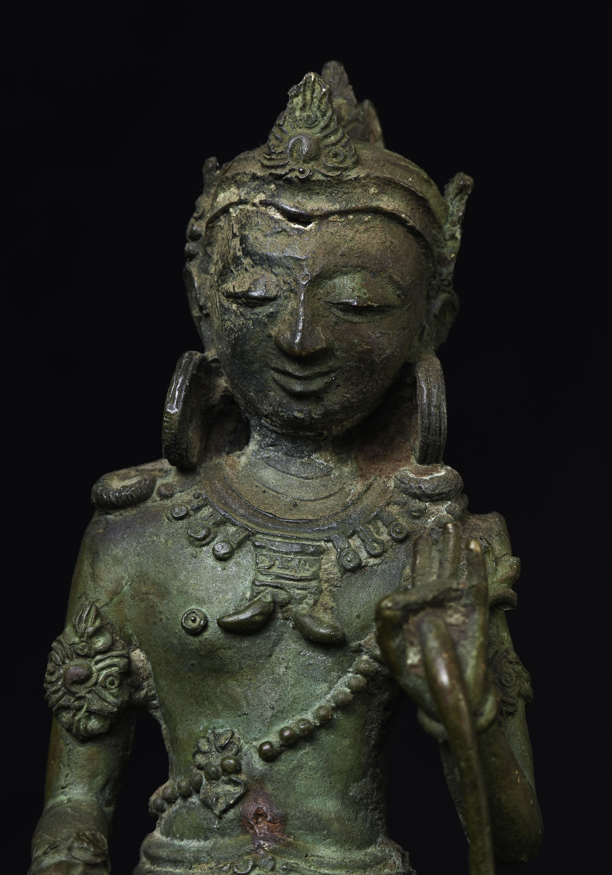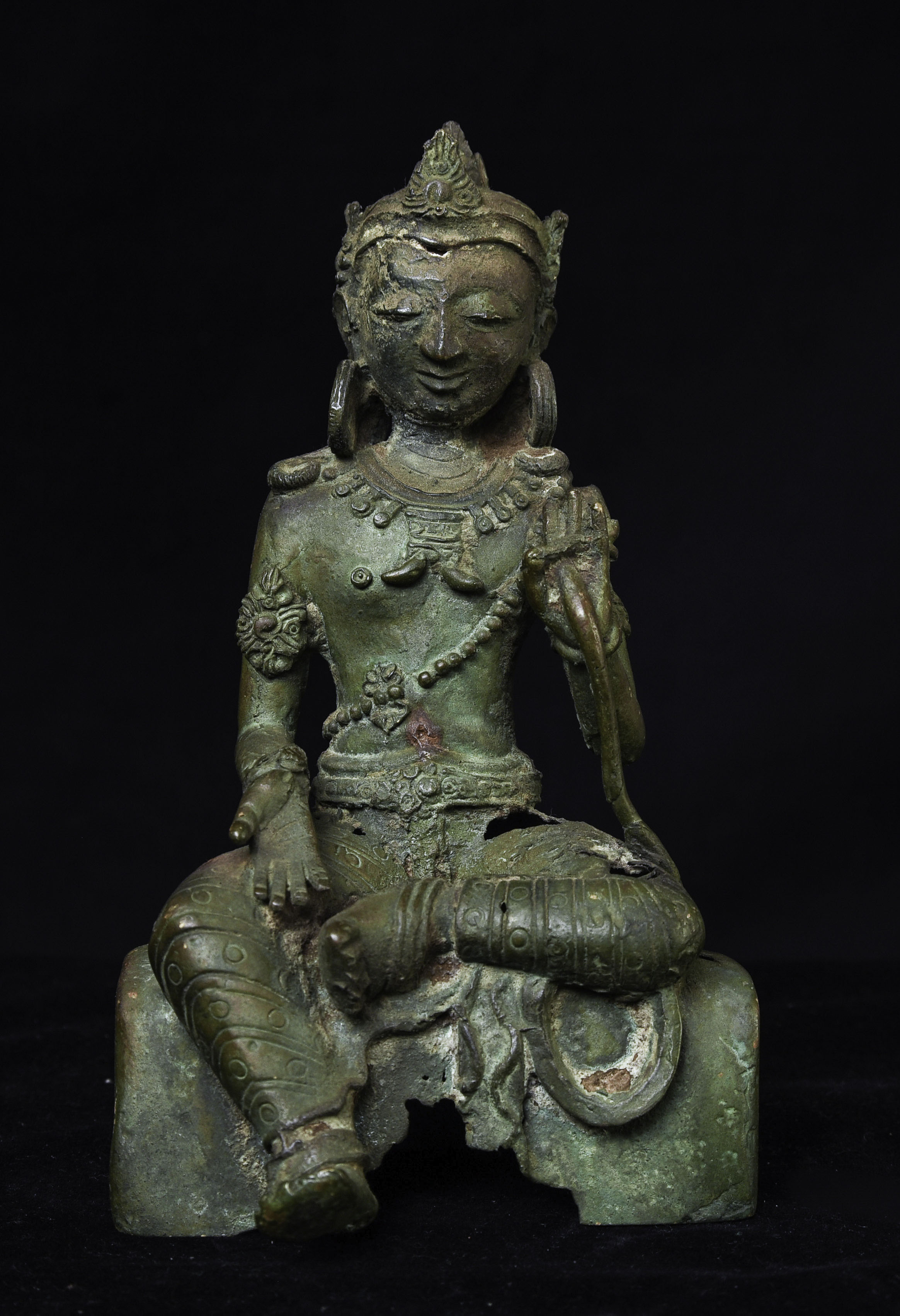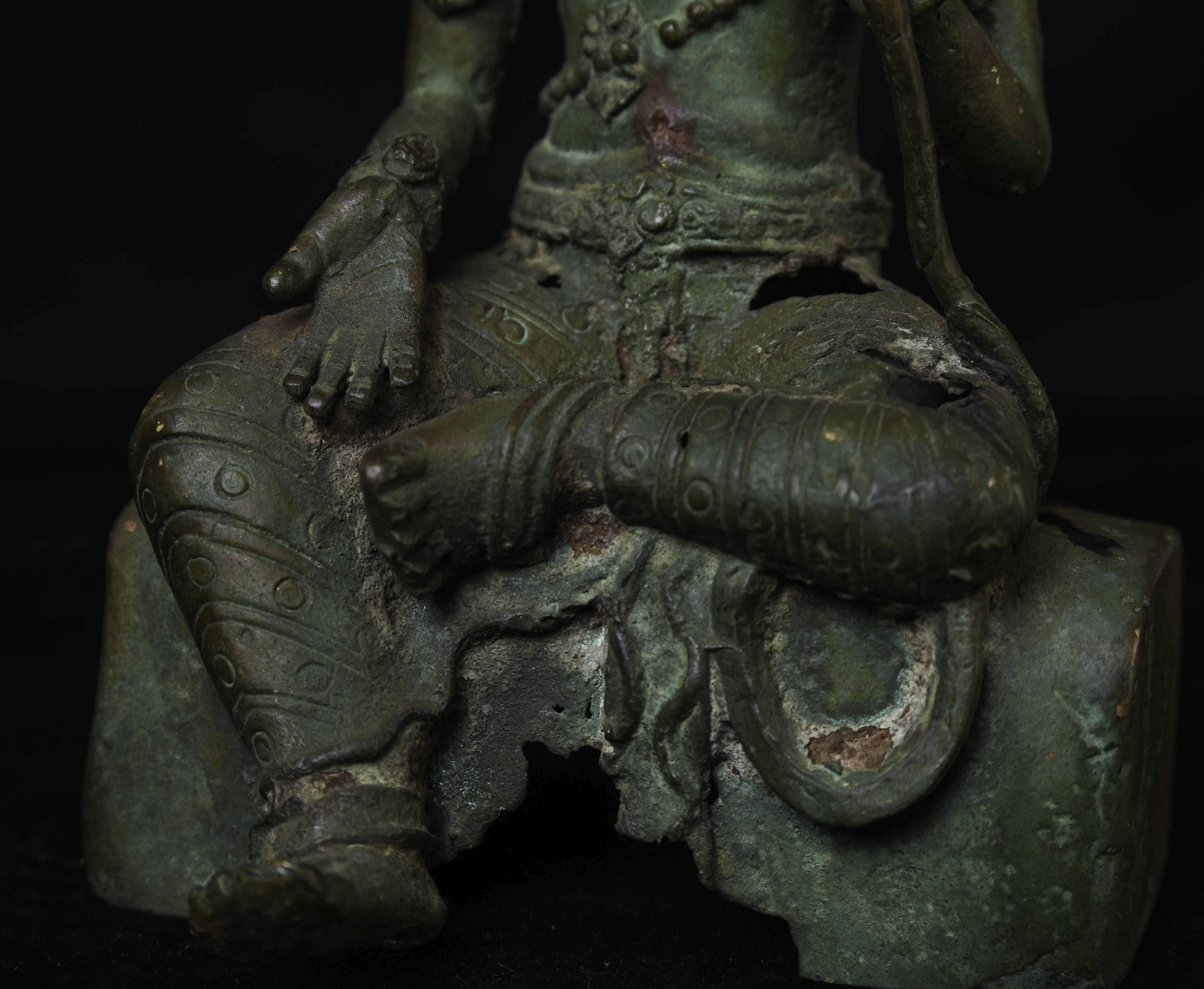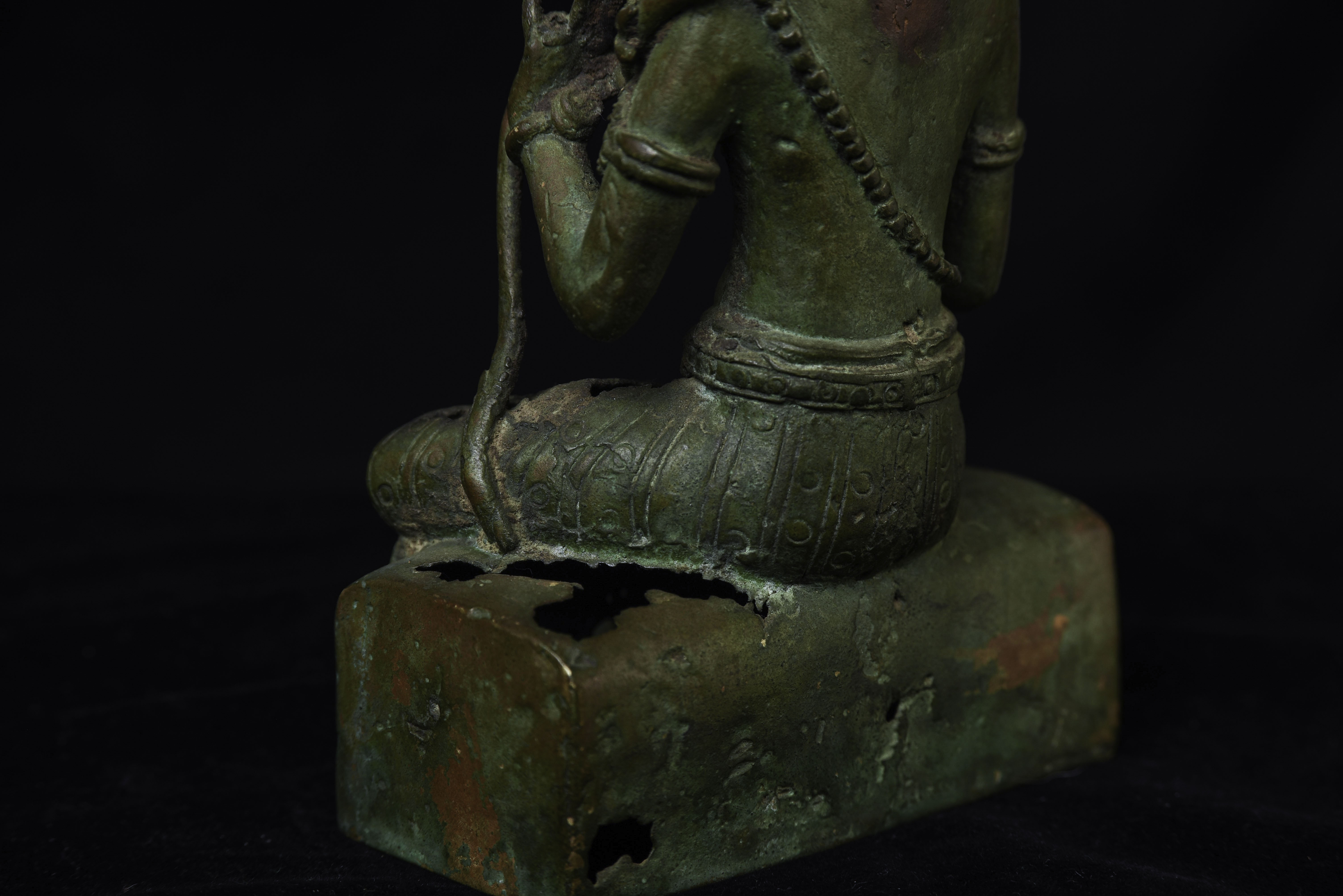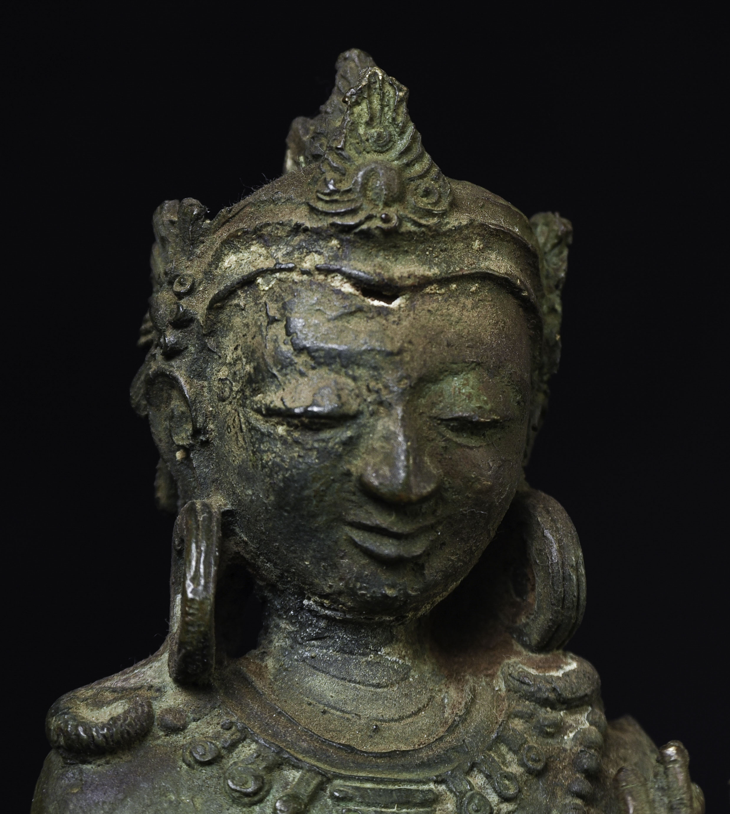 Very early Burmese Buddha, probably 11th century or earlier. It is one of the most distinctive early Burmese bronzes I have come across in years. The casting is remarkable in that it is done so incredibly thin while still being done so well. This very thin casting was sometimes done during times when bronze was scarce. It is notable that it is sitting in a position of Royal ease, which signifies that it is likely a Hindu figure rather than a Buddhist figure as this one likely is. The face has echoes of pre-Pagan, Arakan, Early Mon, and even Pyu. My bet is on It being from a Hindu group in early Arkan, but we will see. Let me know if you have any ideas or photos of closely related examples. - 6.75" ( 17.145cm ).