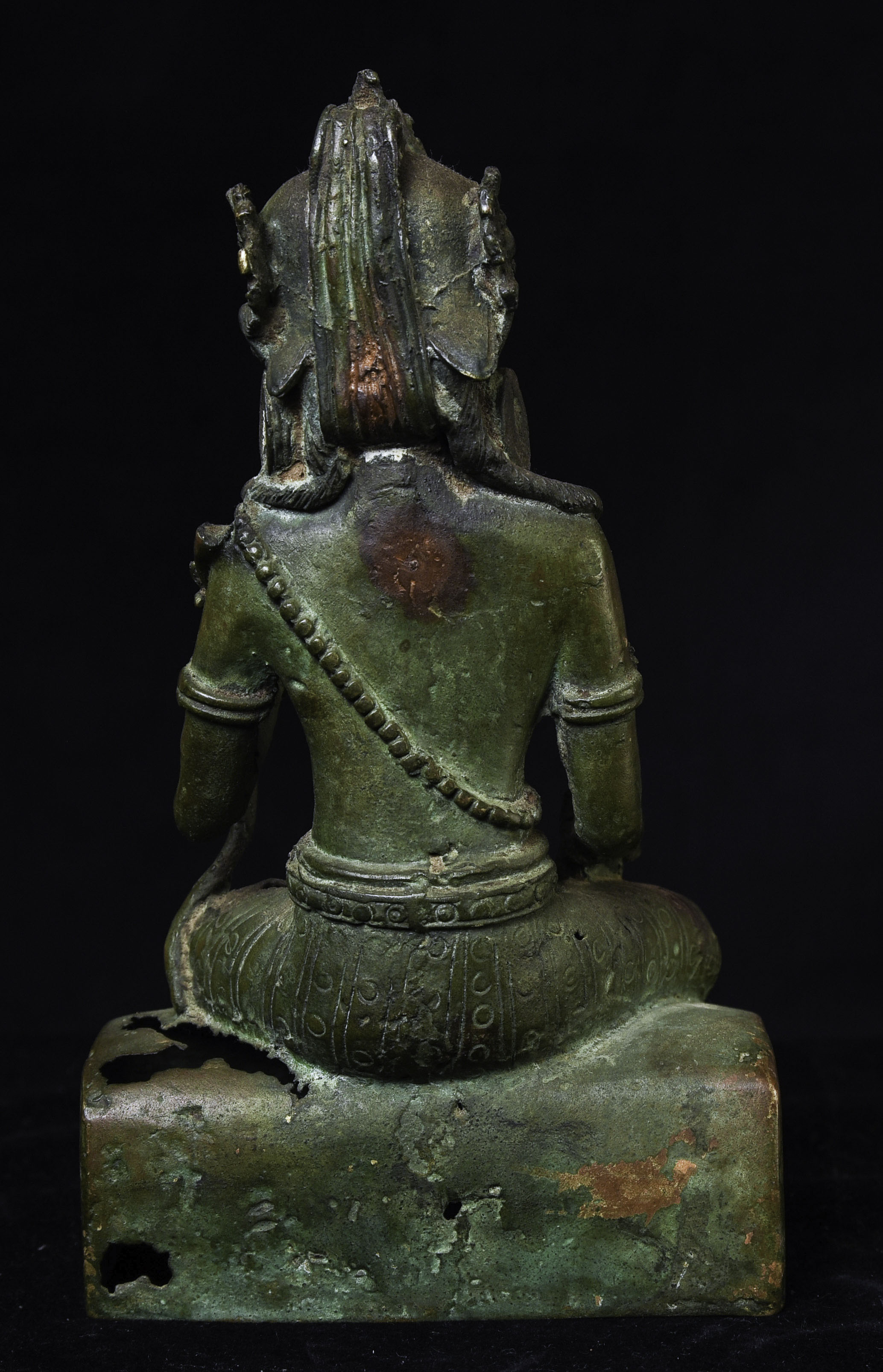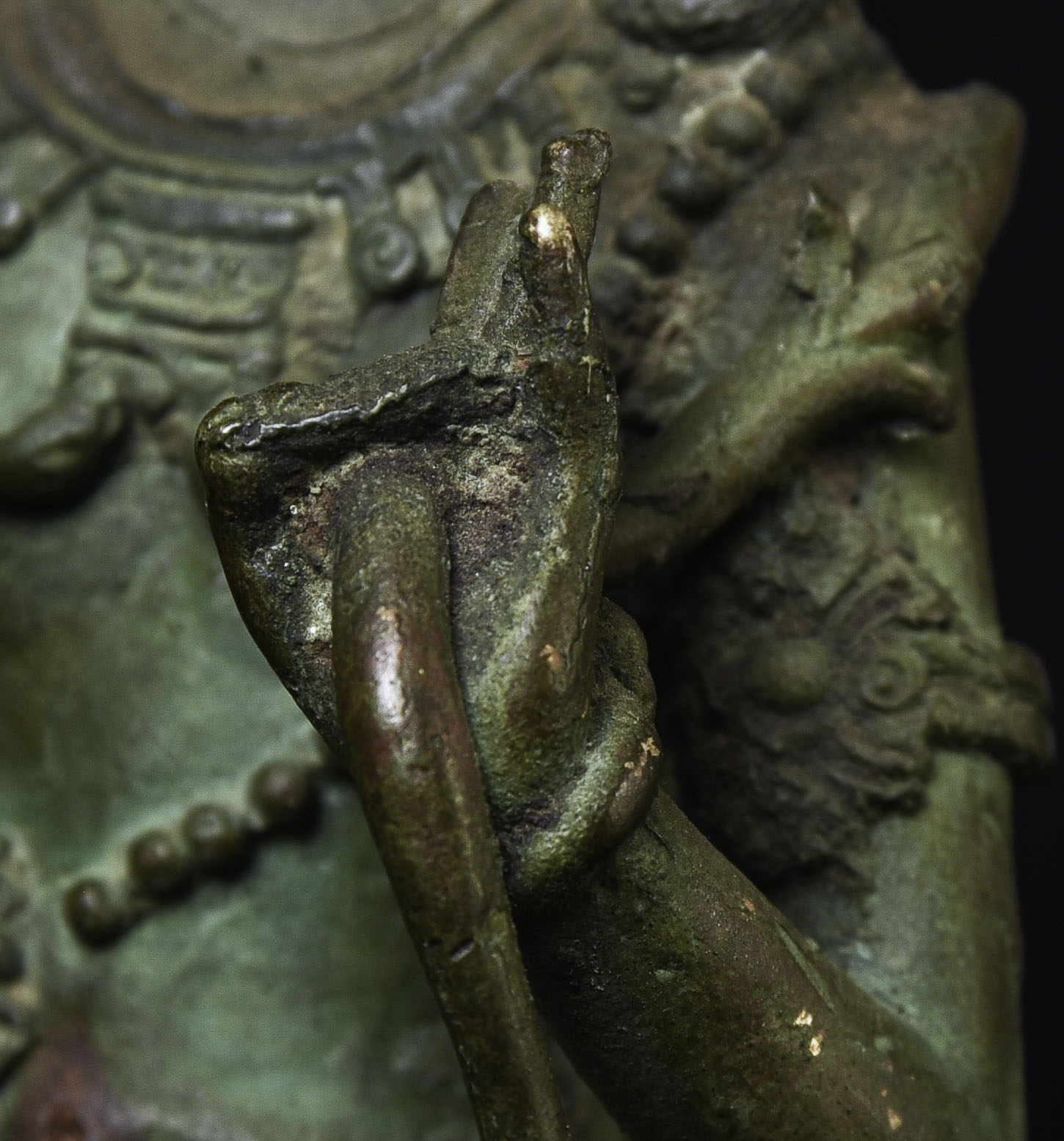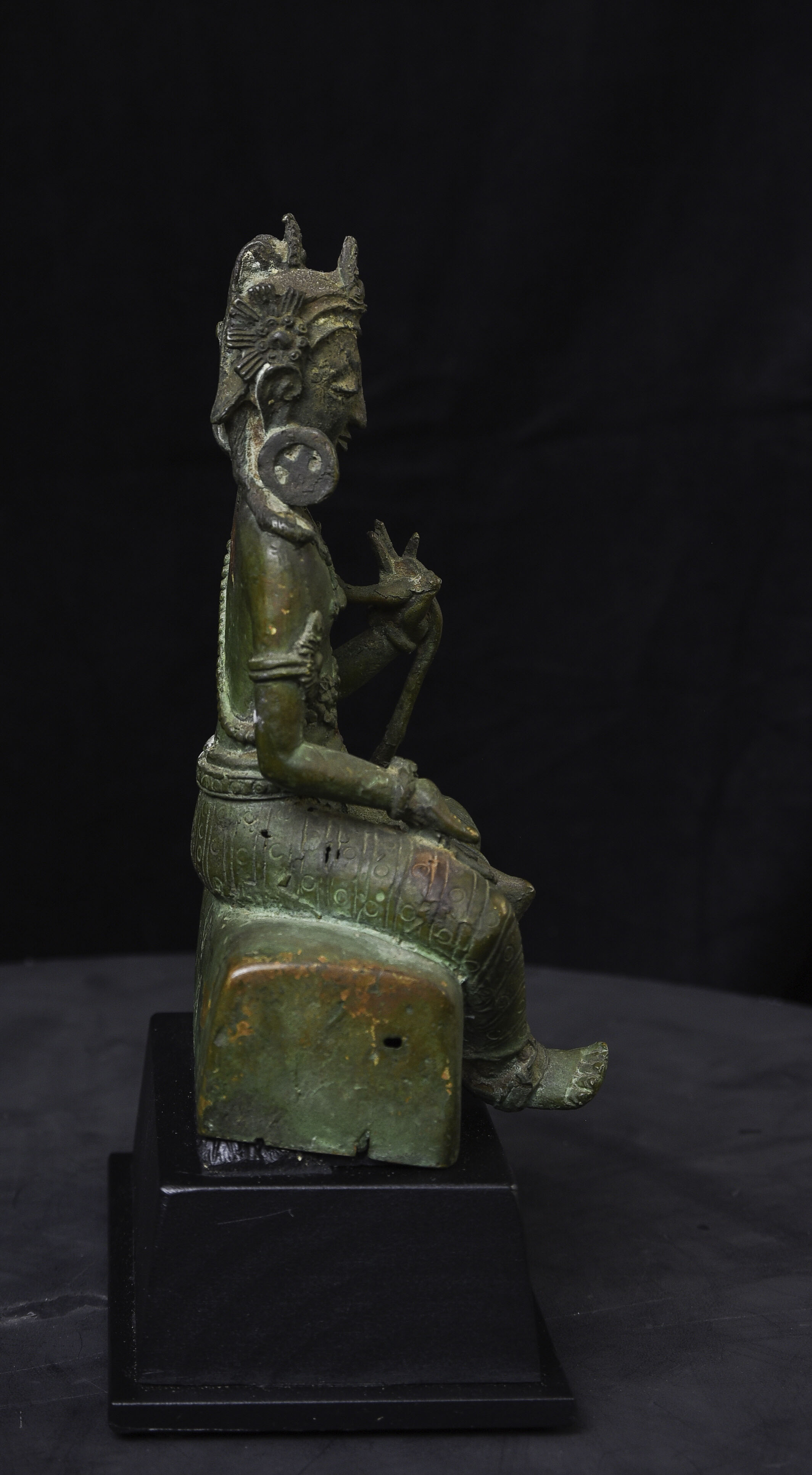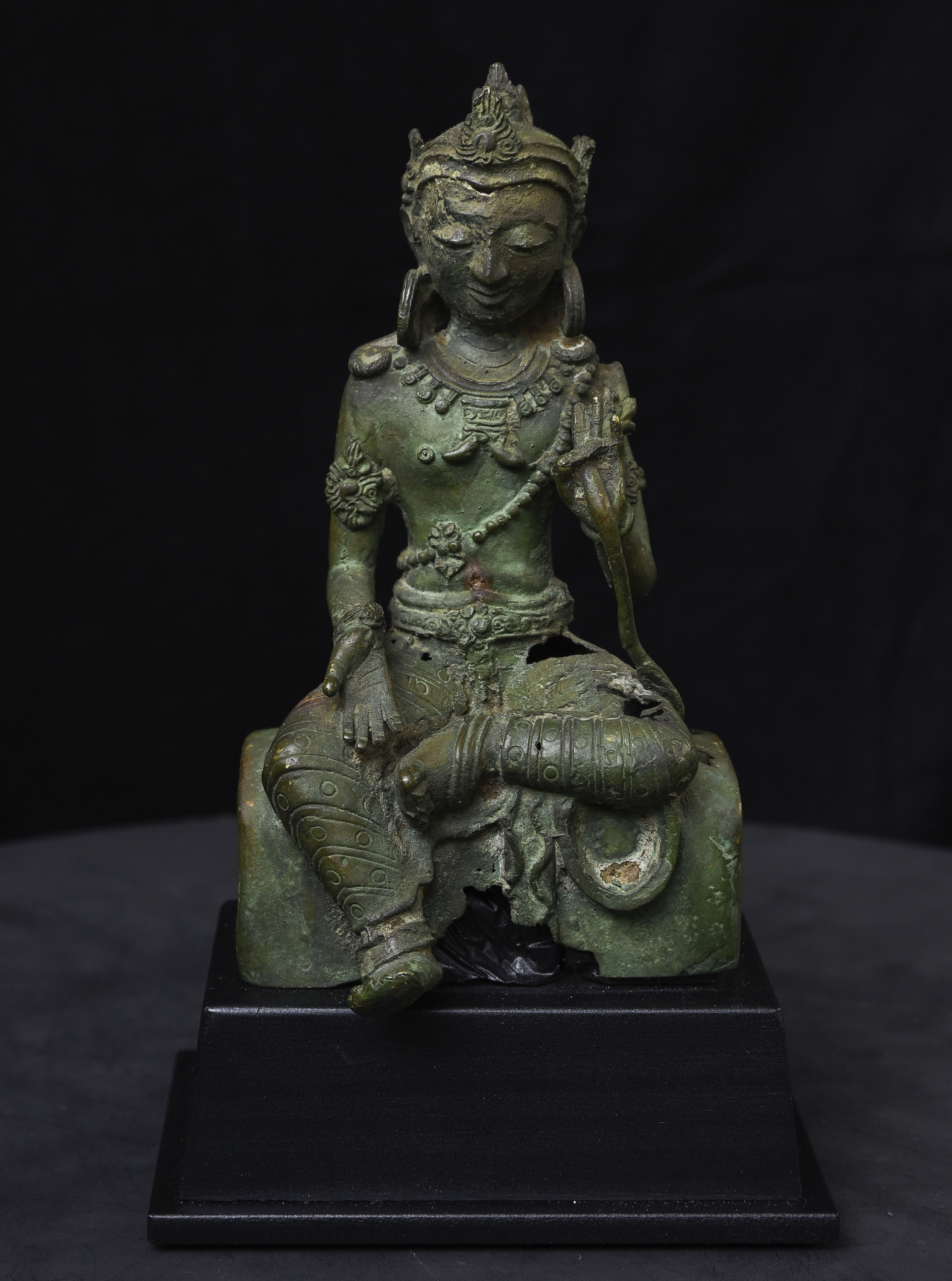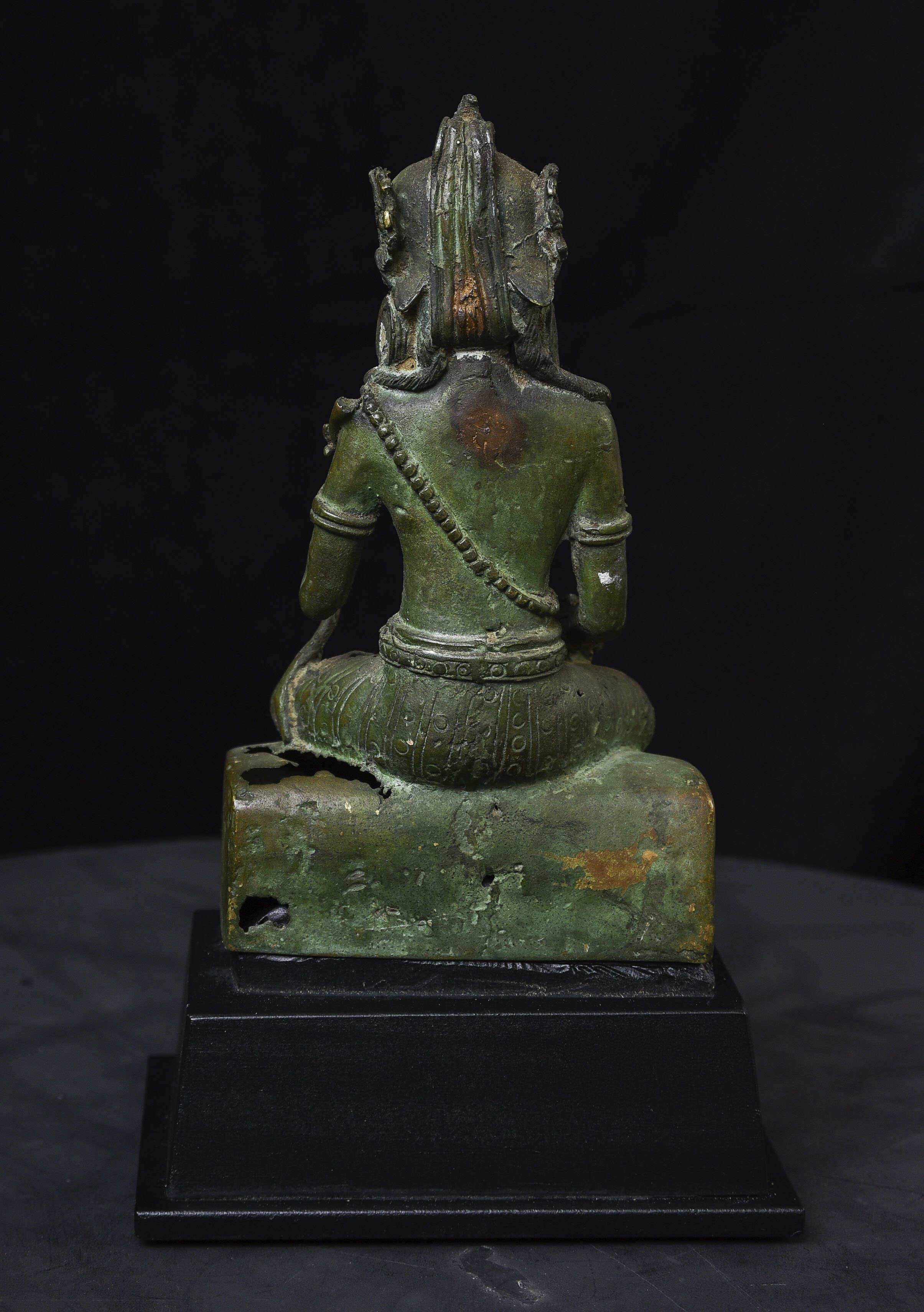 Very early Burmese Buddha, probably 11th century or earlier. It is one of the most distinctive early Burmese bronzes I have come across in years. The casting is remarkable in that it is done so incredibly thin while still being done so well. This very thin casting was sometimes done during times when bronze was scarce. It is notable that it is sitting in a position of Royal ease, which signifies that it is likely a Hindu figure rather than a Buddhist figure as this one likely is. The face has echoes of pre-Pagan, Arakan, Early Mon, and even Pyu. My bet is on It being from a Hindu group in early Arkan, but we will see. Let me know if you have any ideas or photos of closely related examples. - 6.75" ( 17.145cm ).