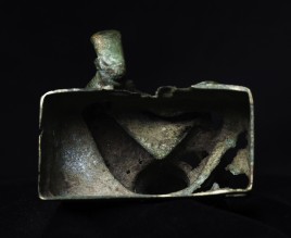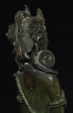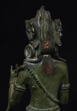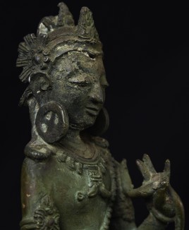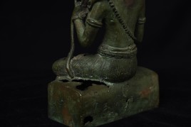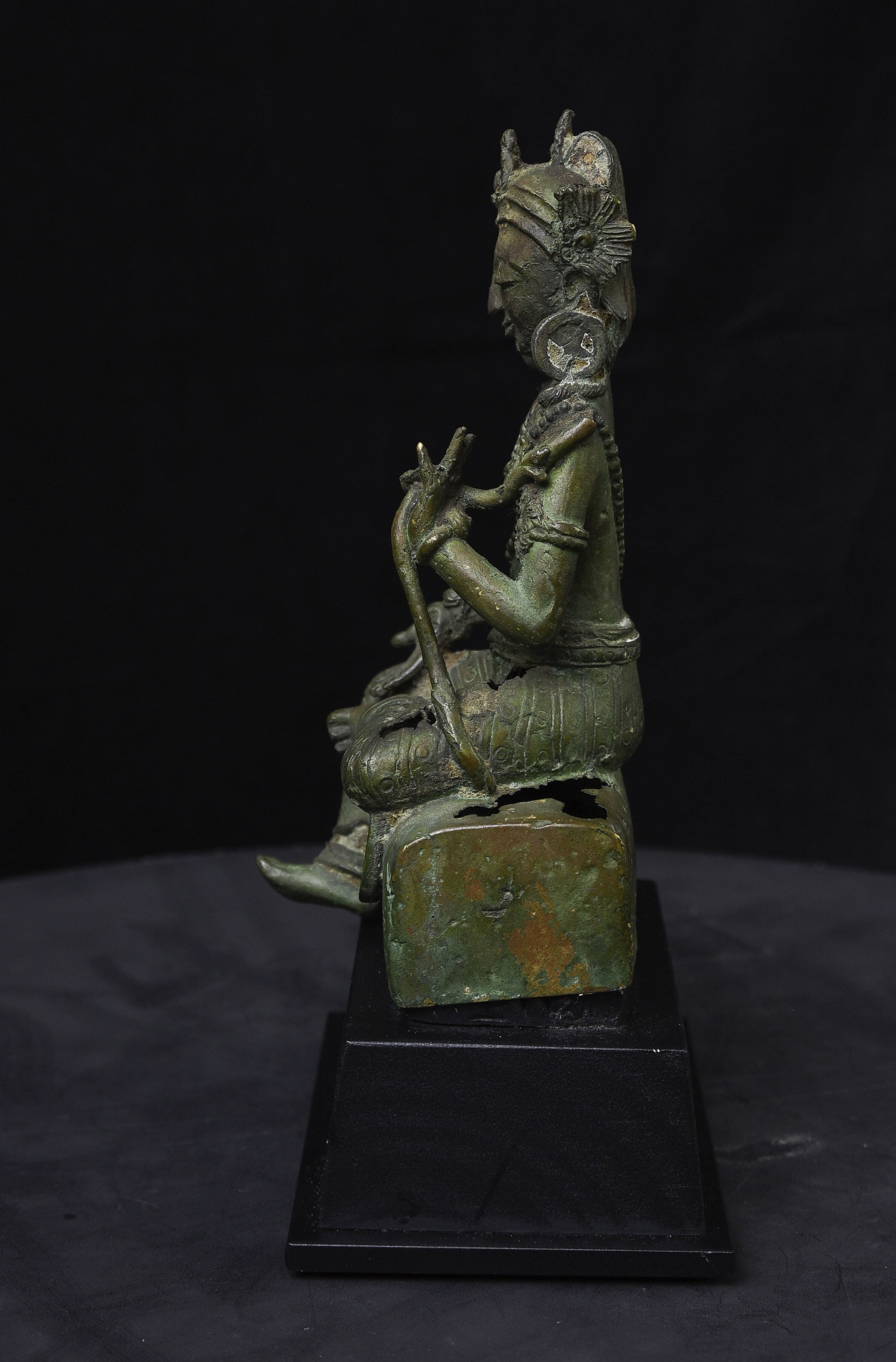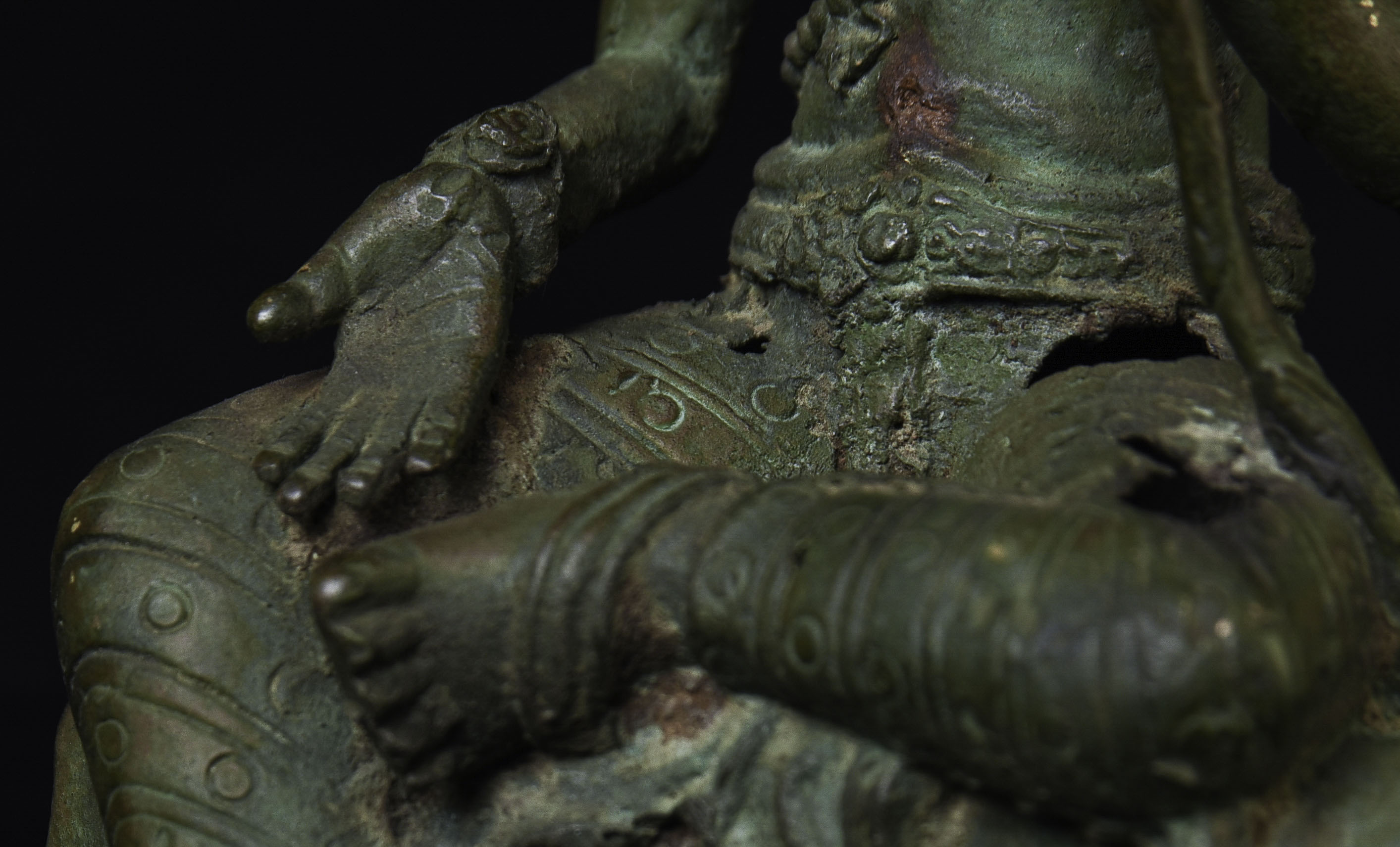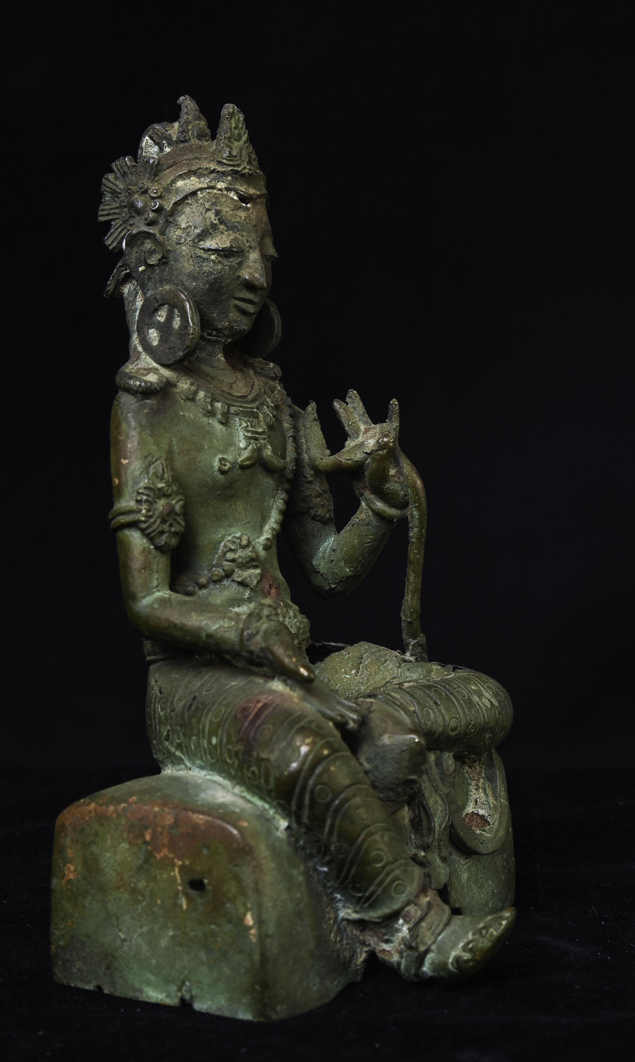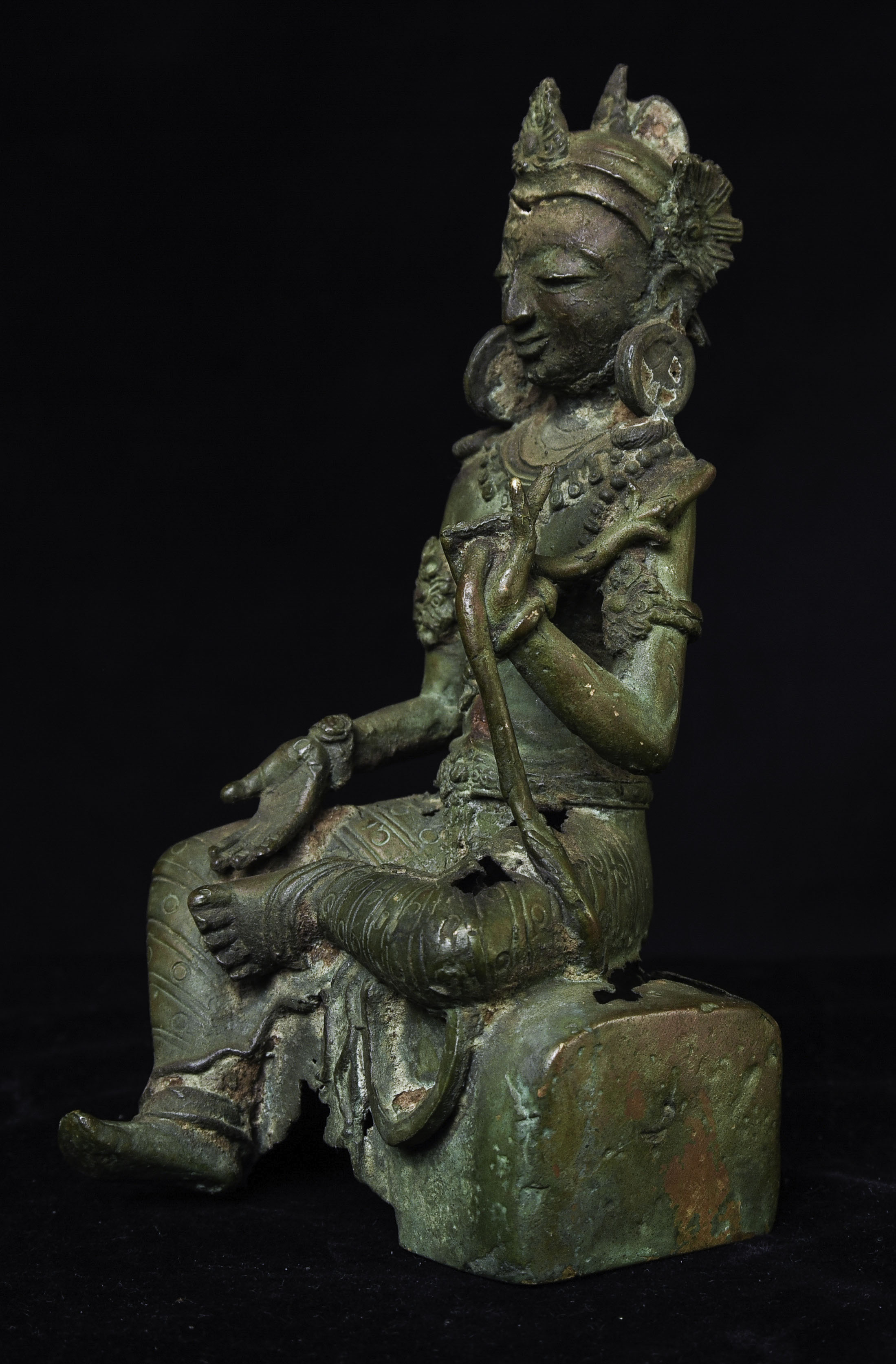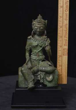 Very early Burmese Buddha, probably 11th century or earlier. It is one of the most distinctive early Burmese bronzes I have come across in years. The casting is remarkable in that it is done so incredibly thin while still being done so well. This very thin casting was sometimes done during times when bronze was scarce. It is notable that it is sitting in a position of Royal ease, which signifies that it is likely a Hindu figure rather than a Buddhist figure as this one likely is. The face has echoes of pre-Pagan, Arakan, Early Mon, and even Pyu. My bet is on It being from a Hindu group in early Arkan, but we will see. Let me know if you have any ideas or photos of closely related examples. - 6.75" ( 17.145cm ).
