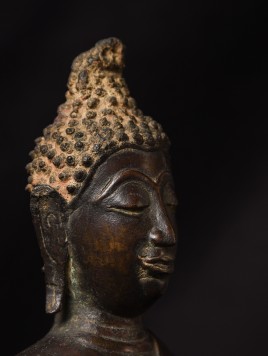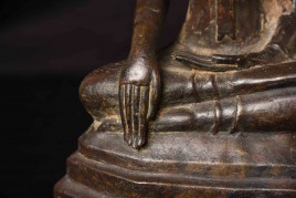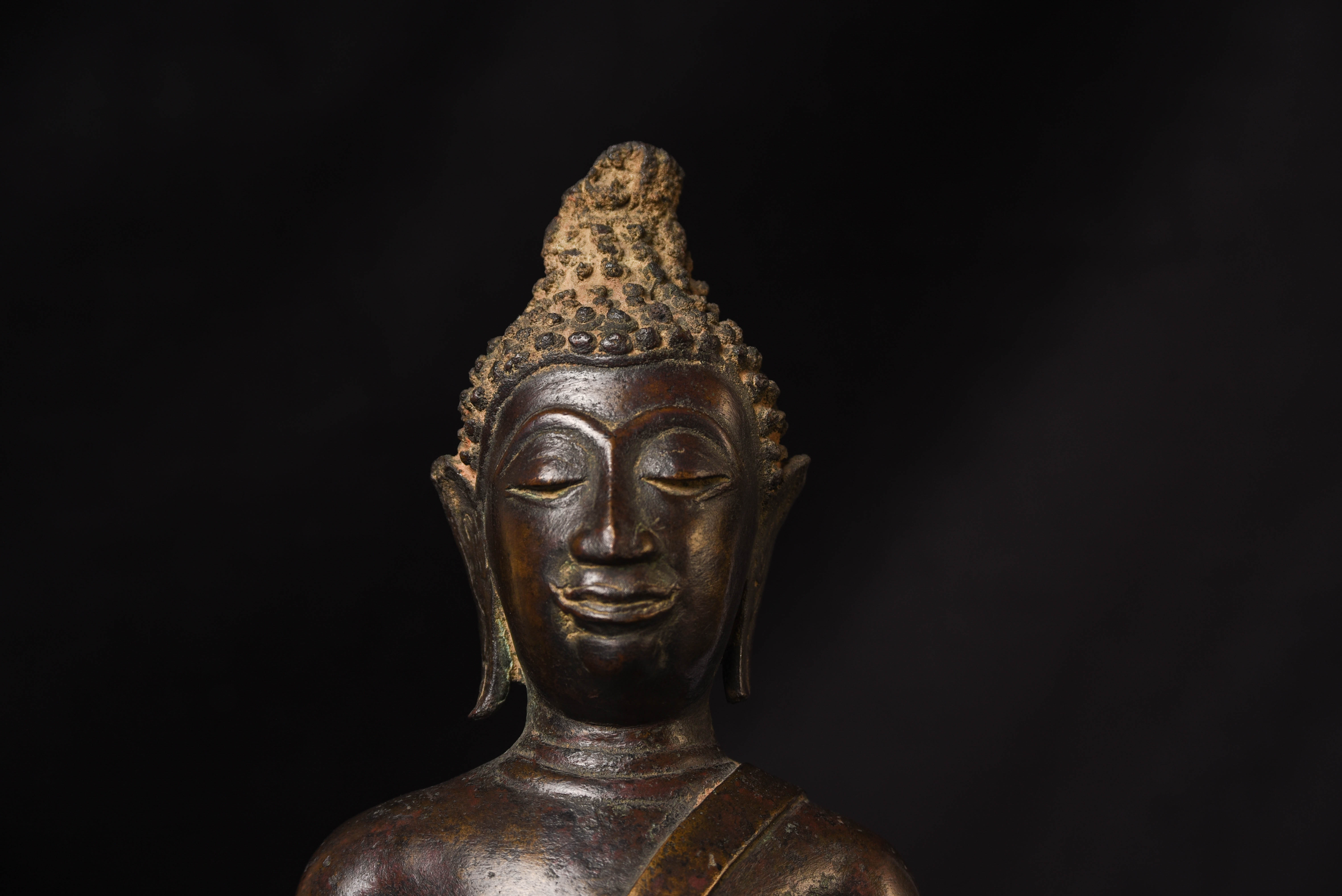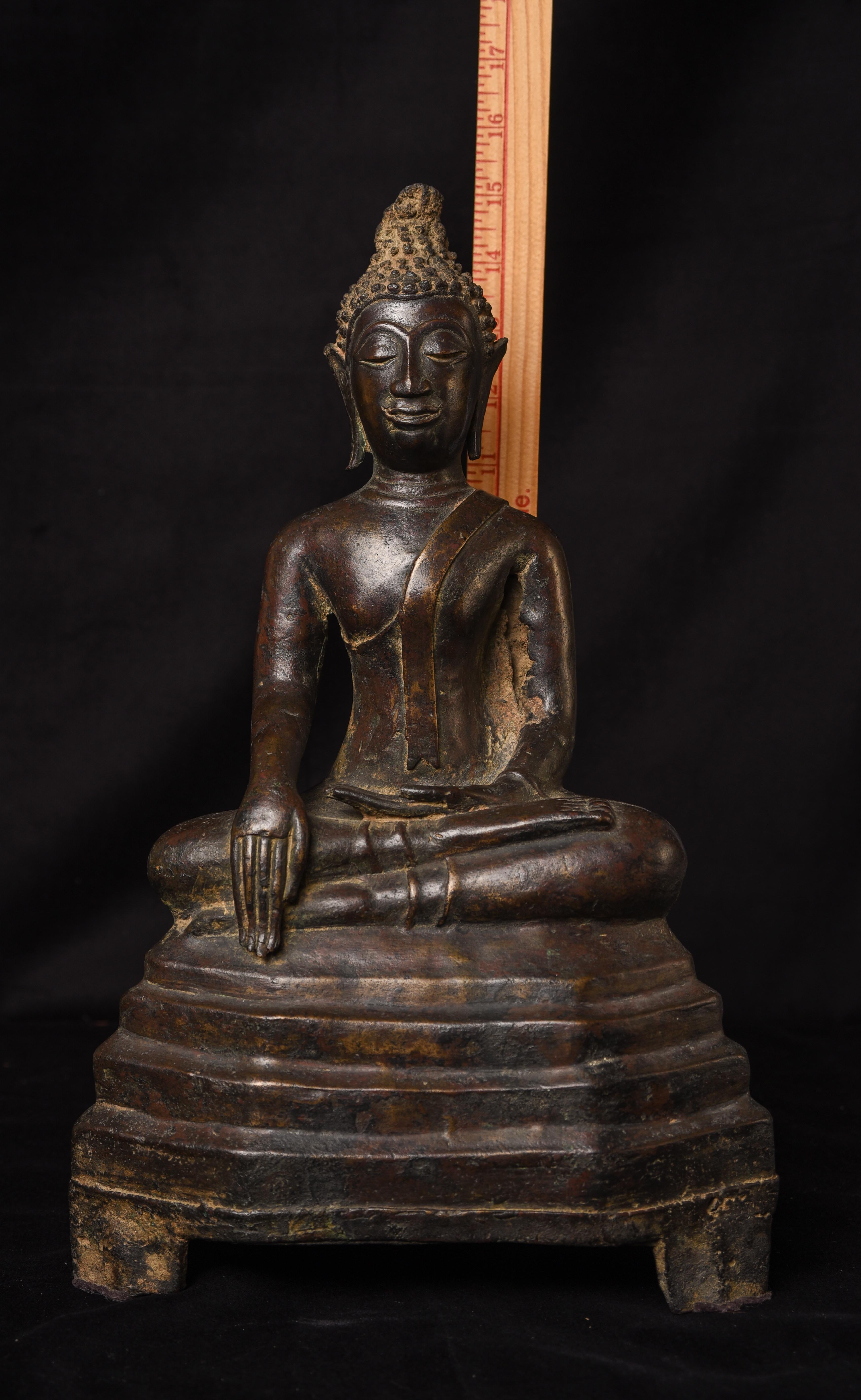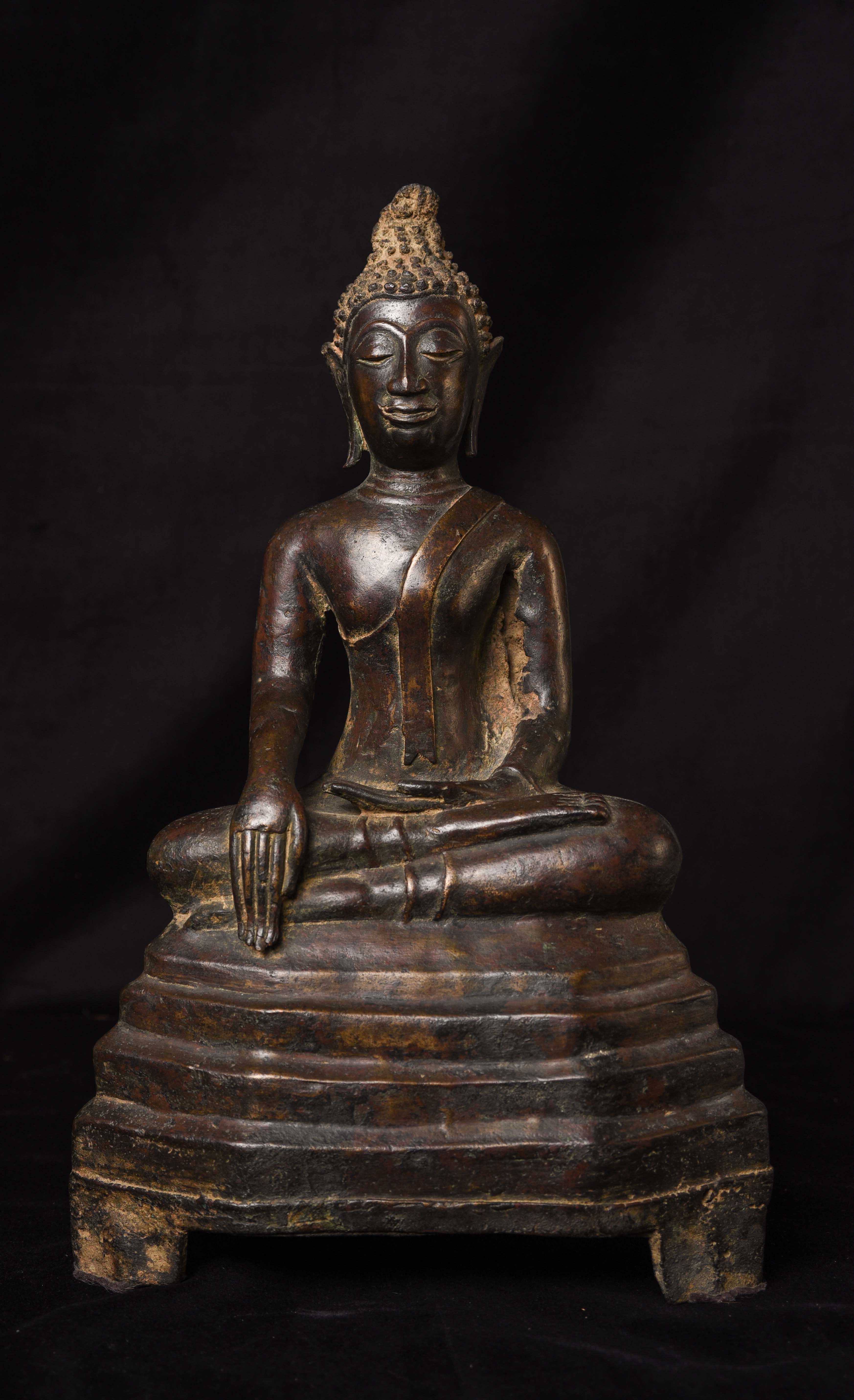Large, High-quality 16thC Thai Bronze Buddha, with a very distinctive style of base. The face and hair-line show a connection to the late Utong style. Sits an impressive 15" ( 38.1cm). A few original casting flaws, and loss to the finial on the top of the head. Shows exceptionally well- it has real charisma. Deep chocolate patina. Great face,