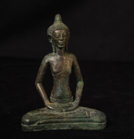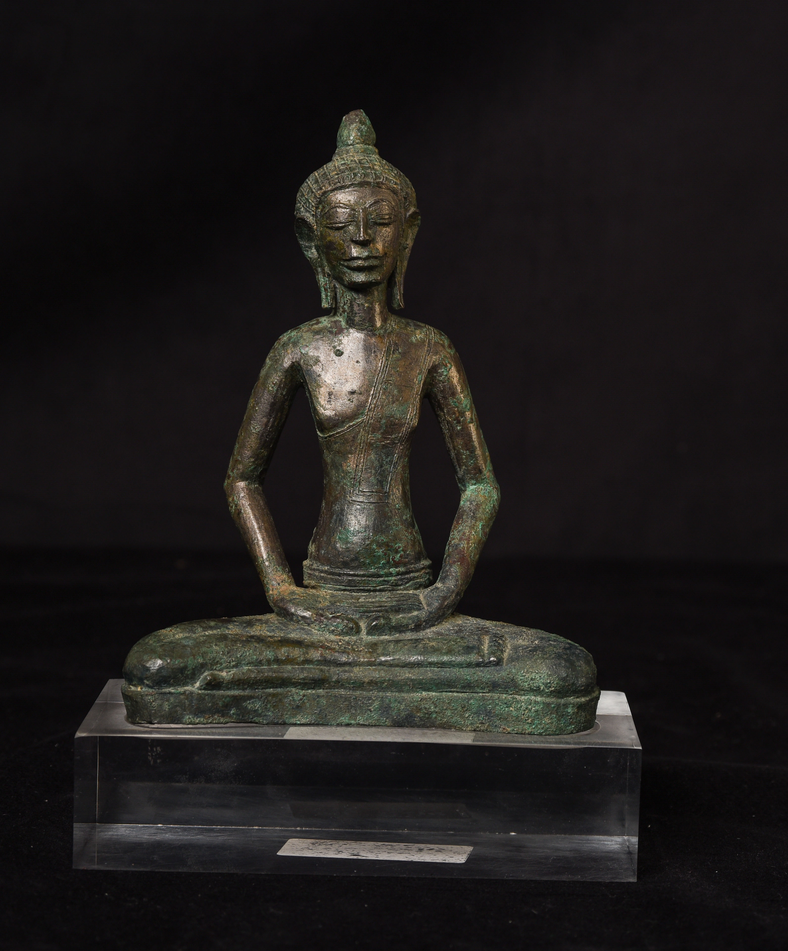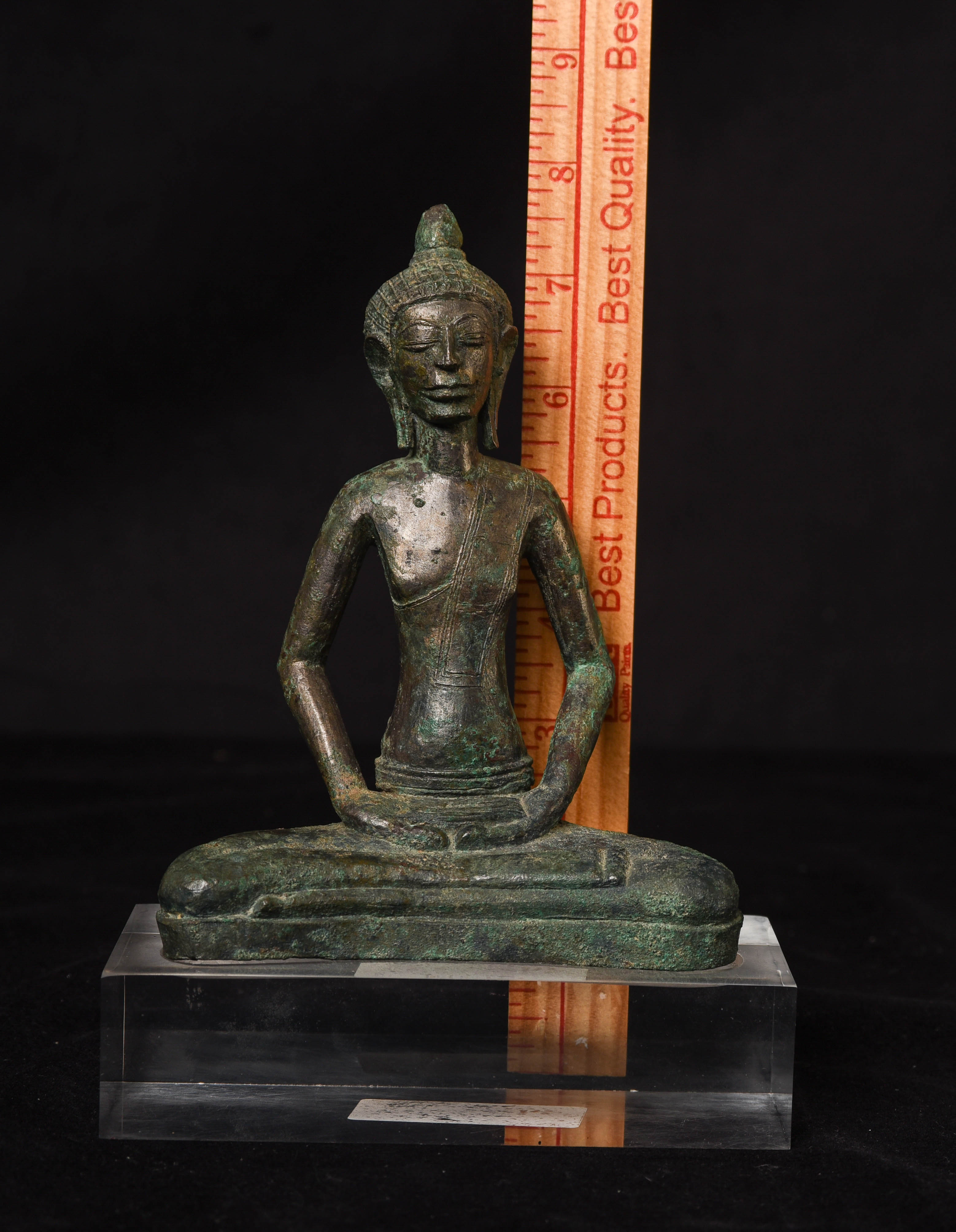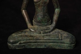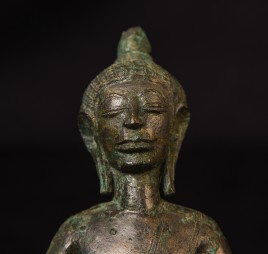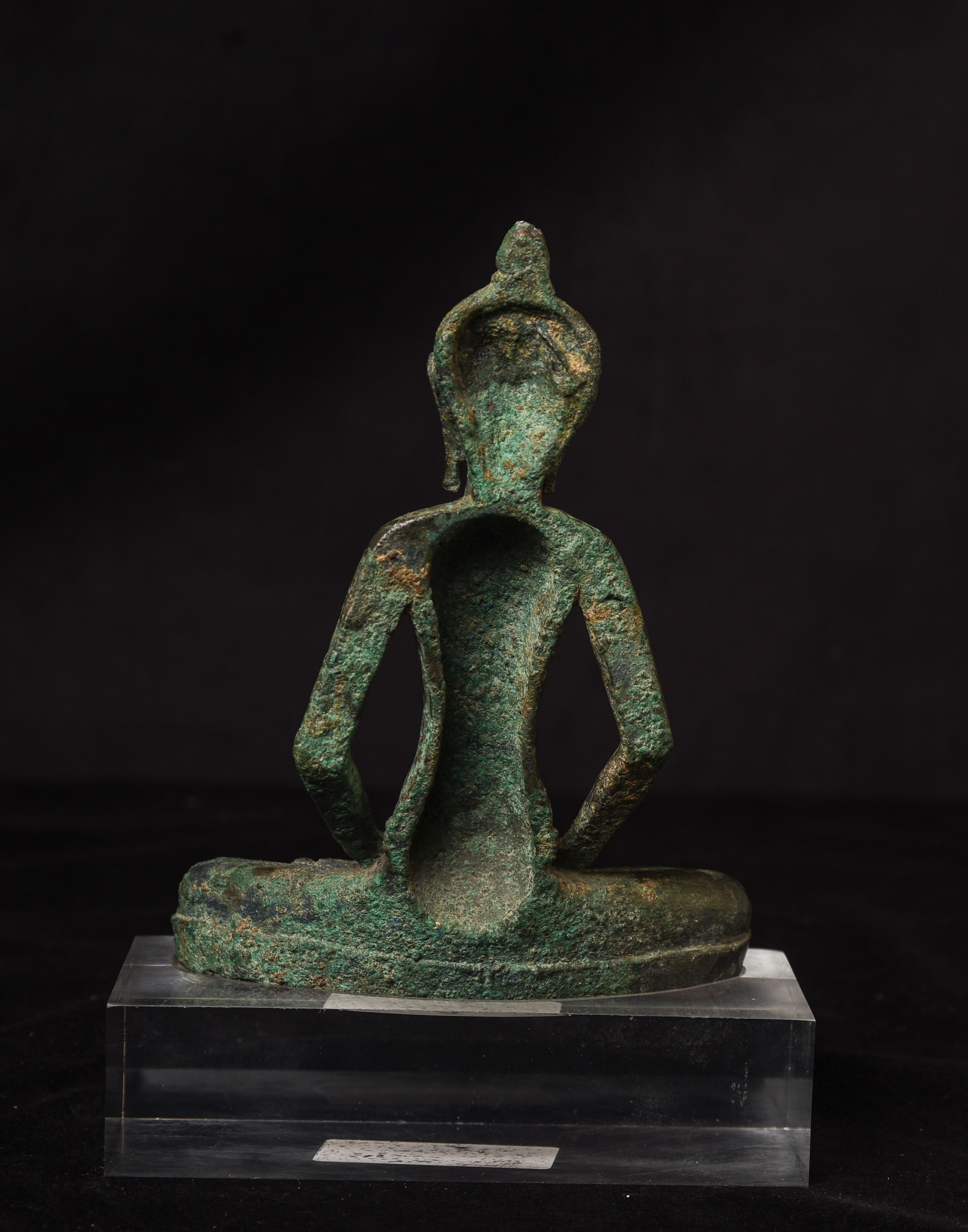 And all-time favorite-a Sublime 9th-century Burmese bronze Buddha. being"Pyu", but I believe this it is sculpted in the Mon style. I believe I saw this very same Buddha in an early 1980's Sotheby's or Christie's catalog-I've sold off many of my catalogs, so I'mcannot find the catalog anymore. I can tell you that this very same Buddha made a big impression on me 30 years ago when I began collecting early and rare Burmese bronze Buddhas-this Buddha has something so incredibly sensitive in the modeling of the face that shows great sophistication. it continues into the very singular proportions and the way connect is tilted slightly to one side and the head looks up just a little bit. The overall impact is extremely powerful.
