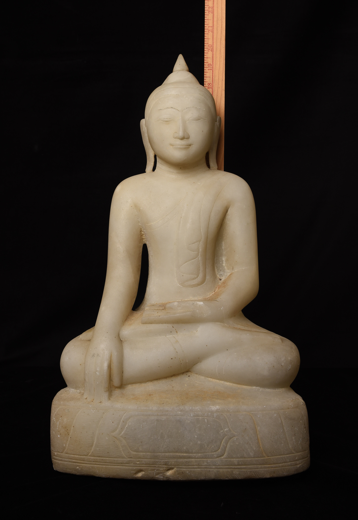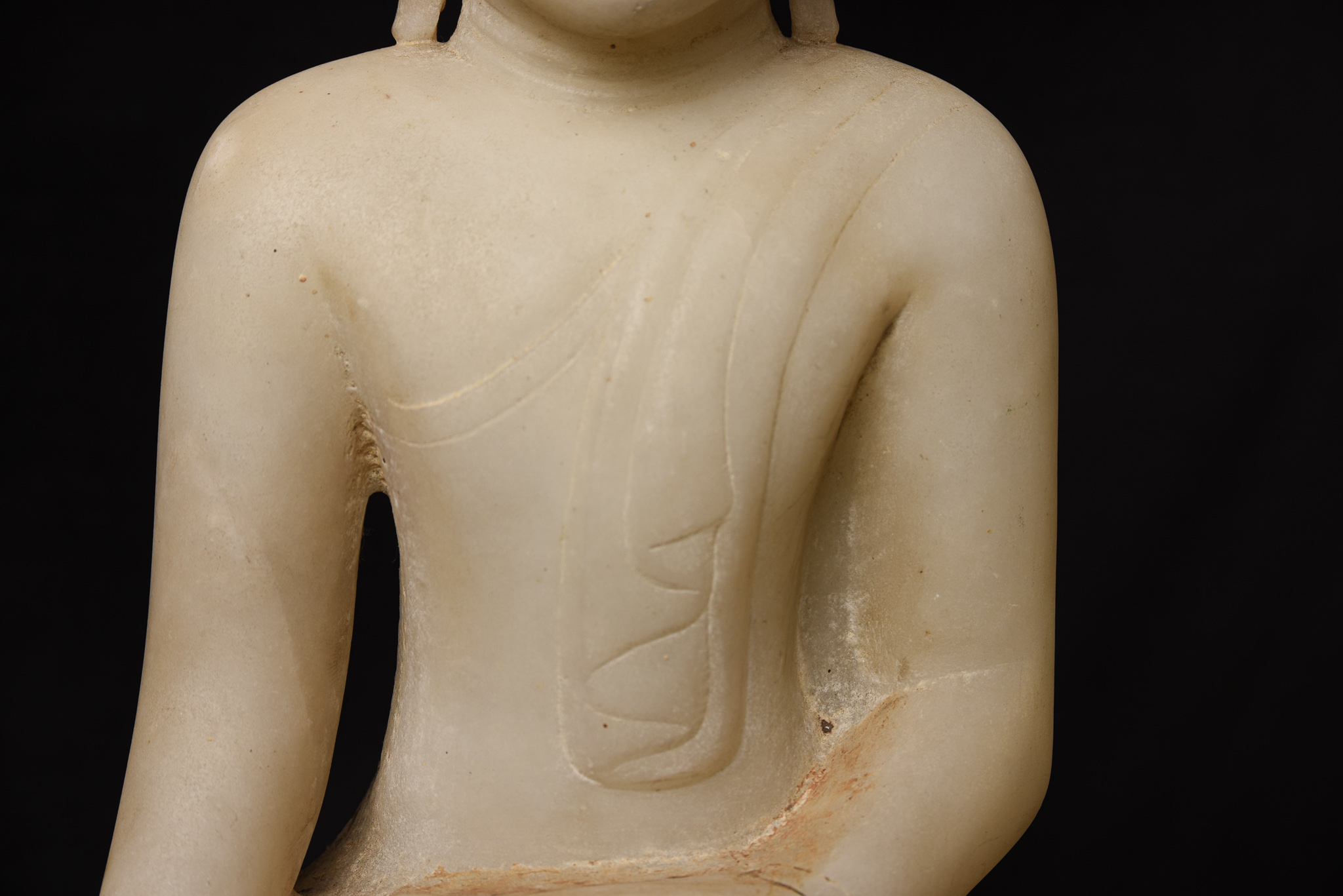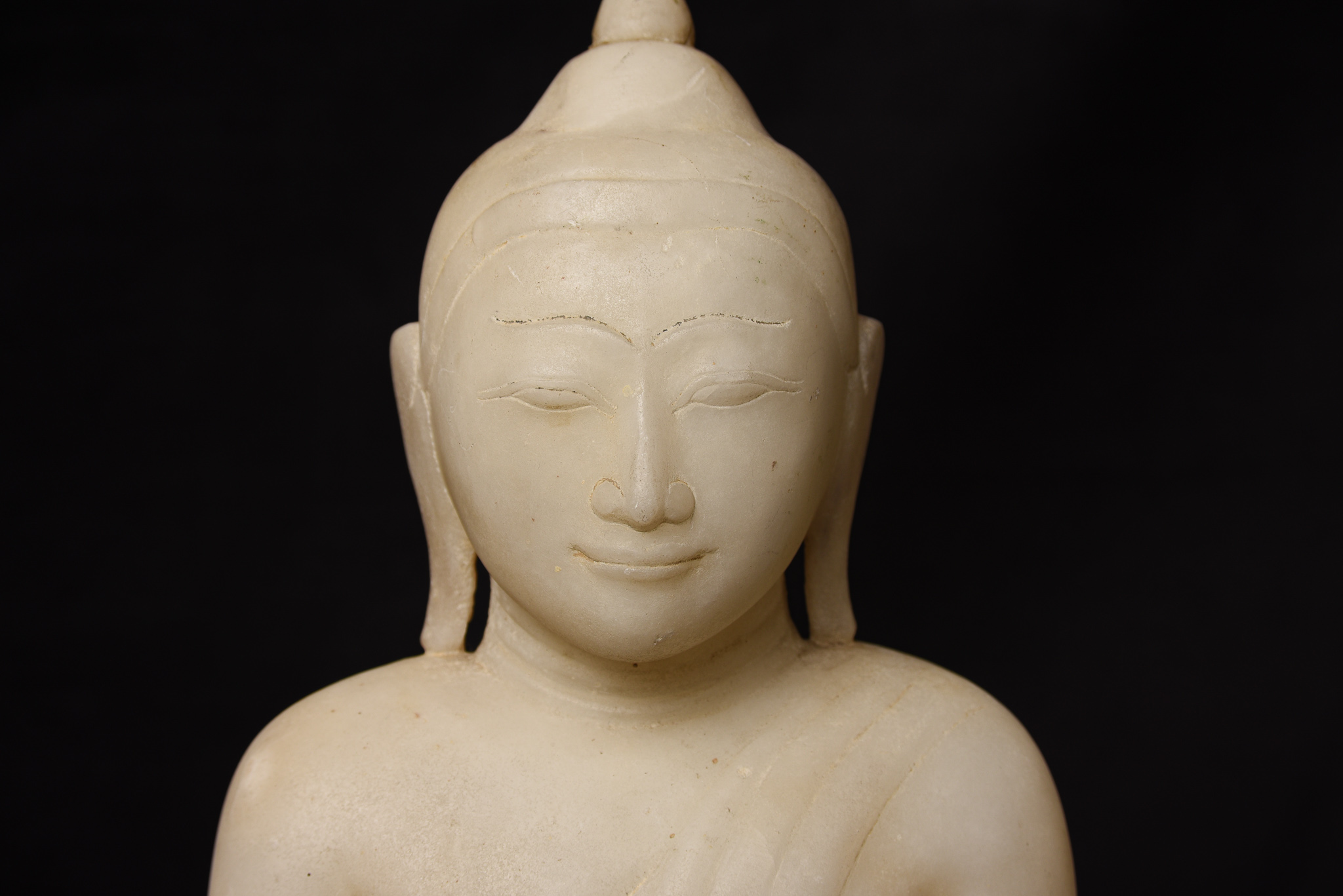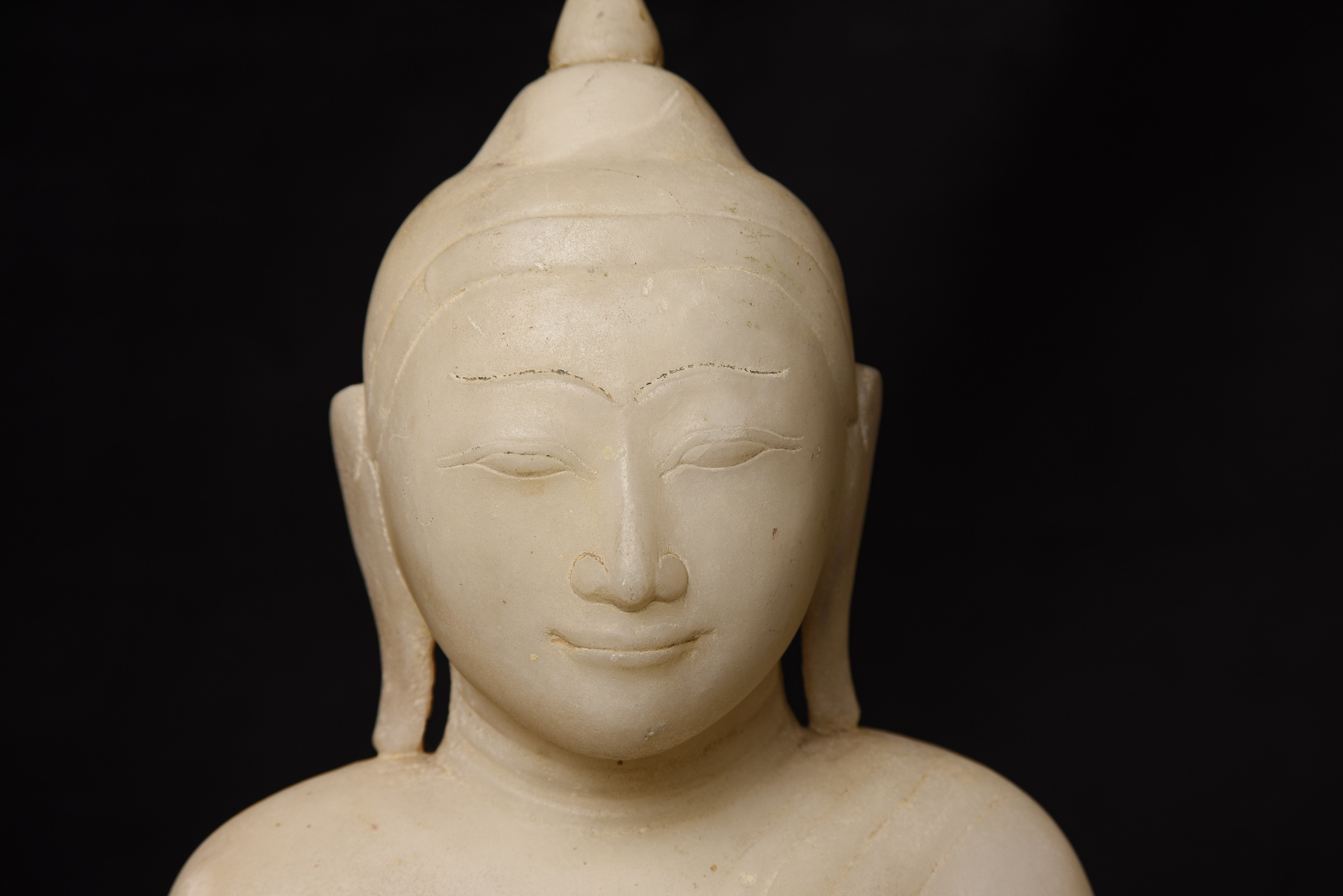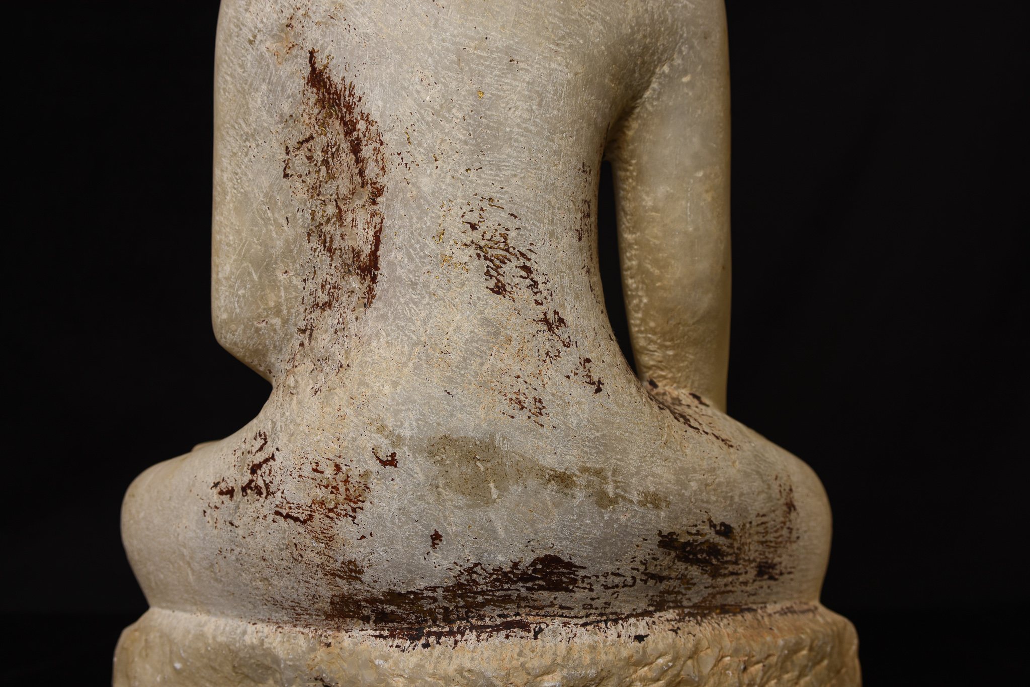 Superb 17thC Burmese Ava Buddha carved in Alabaster. This is a stellar example in every way. Large size, outstanding condition, beautiful skillful carving, and most importantly, it has an exquisite face that lights up the world. Traces of more than one layer of lacquer (both red and black). Often this type of Buddha was found in caves in large numbers. My best understanding is that the multiple Buddhas amplified the spiritual power of the location. One of the nicest of this type I've ever had the pleasure of offering. Will fill up any room with its presence. Repair to the tip of the finial. Condition is exceptional for alabaster, which is much more likely to chip and crack than marble. Often this type of Buddha has significant breaks and losses. This one looks great -look at the photos carefully!! Sits an impressive 20" (50.08cm).