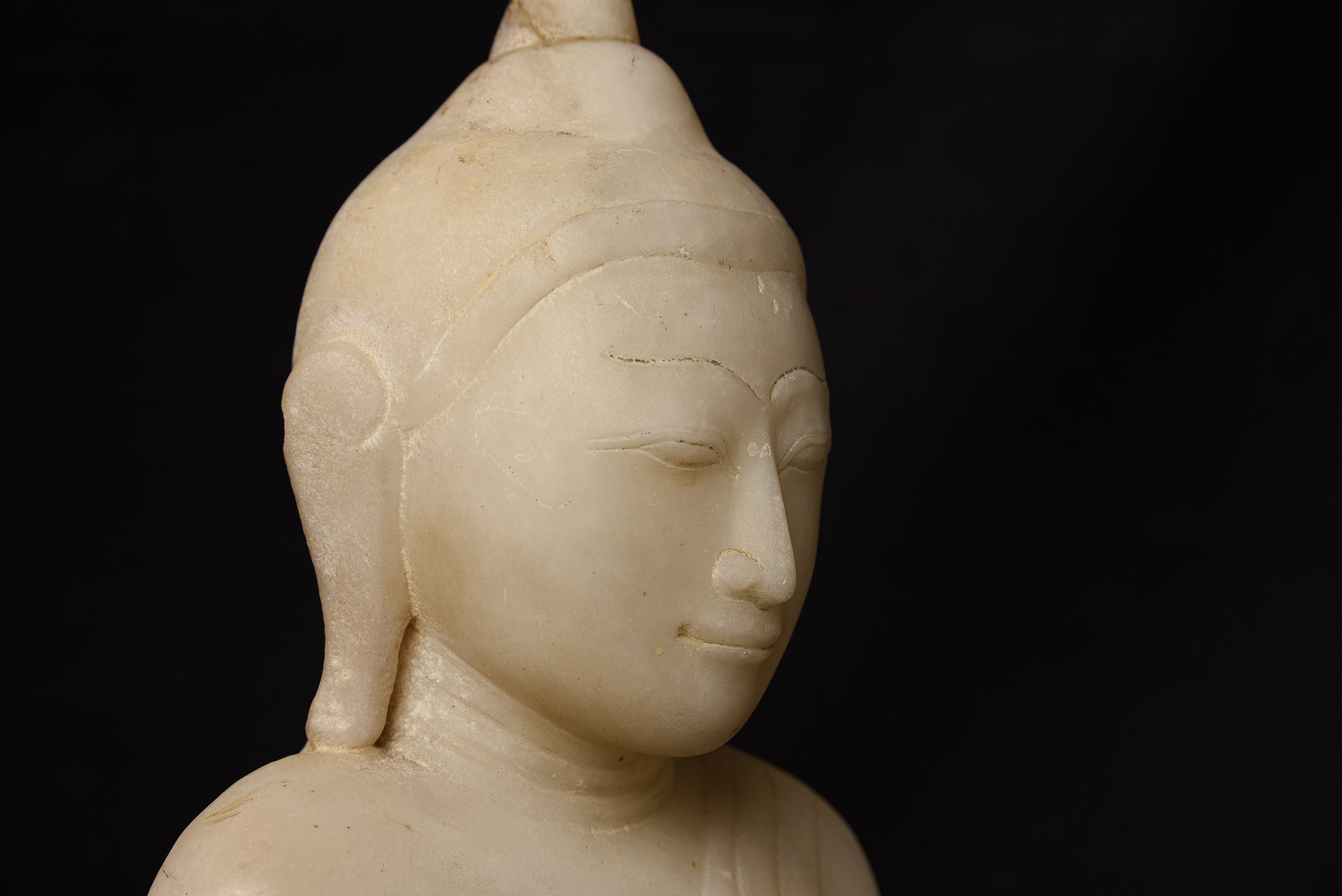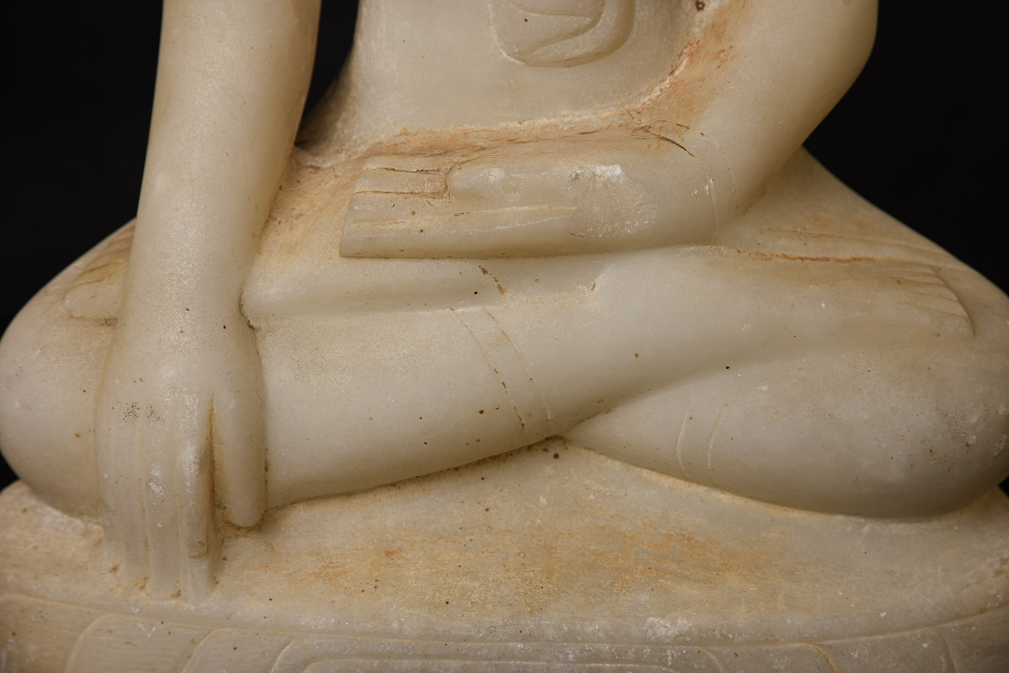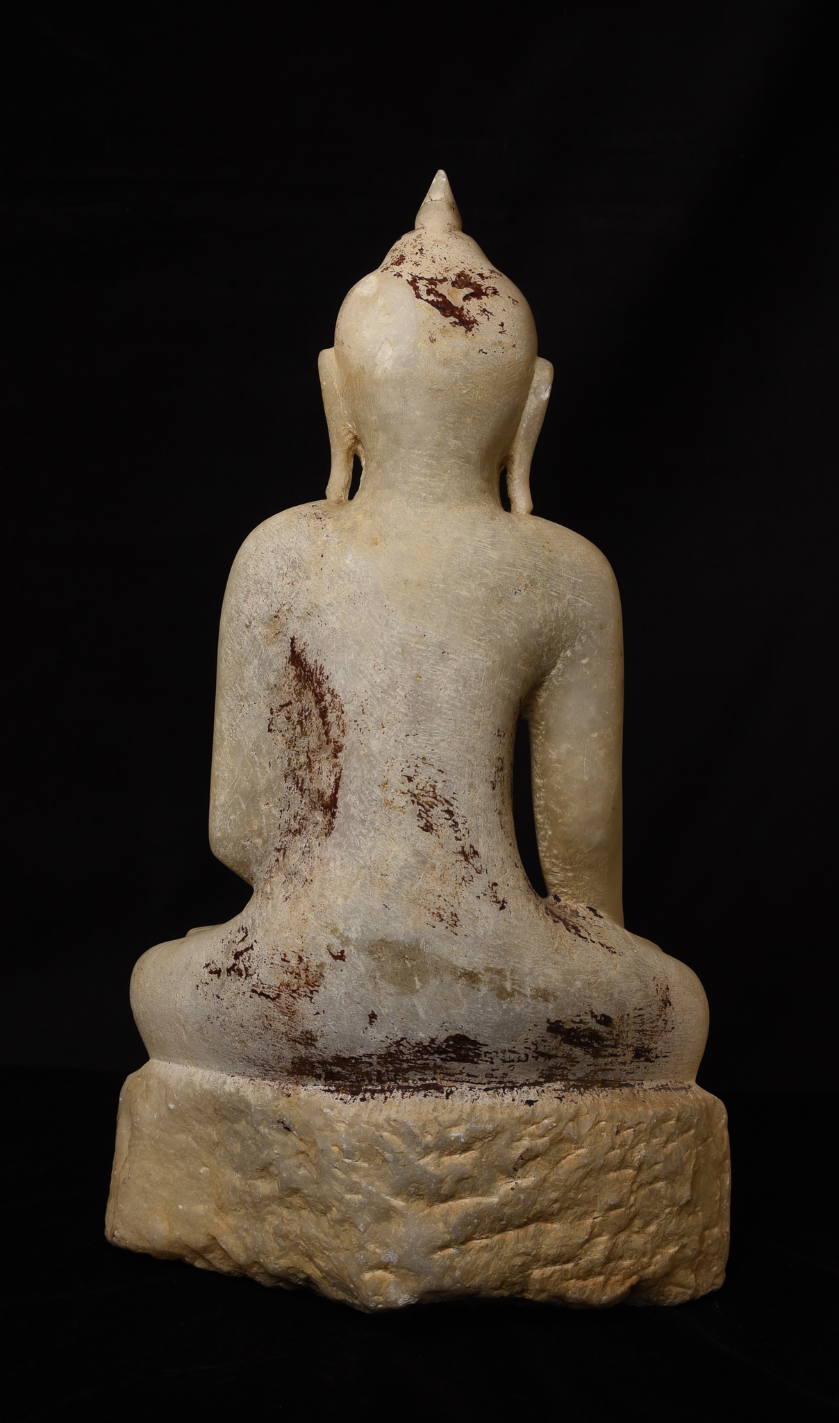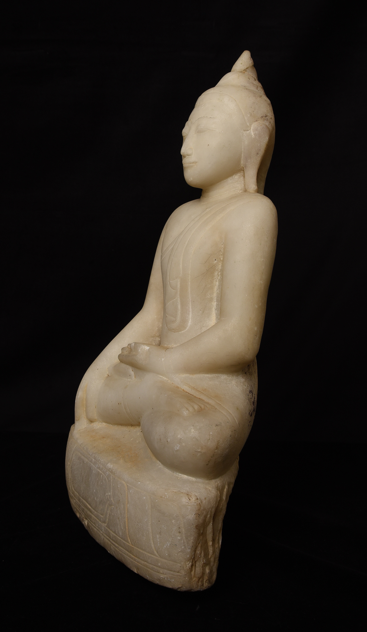 Superb 17thC Burmese Ava Buddha carved in Alabaster. This is a stellar example in every way. Large size, outstanding condition, beautiful skillful carving, and most importantly, it has an exquisite face that lights up the world. Traces of more than one layer of lacquer (both red and black). Often this type of Buddha was found in caves in large numbers. My best understanding is that the multiple Buddhas amplified the spiritual power of the location. One of the nicest of this type I've ever had the pleasure of offering. Will fill up any room with its presence. Repair to the tip of the finial. Condition is exceptional for alabaster, which is much more likely to chip and crack than marble. Often this type of Buddha has significant breaks and losses. This one looks great -look at the photos carefully!! Sits an impressive 20" (50.08cm).