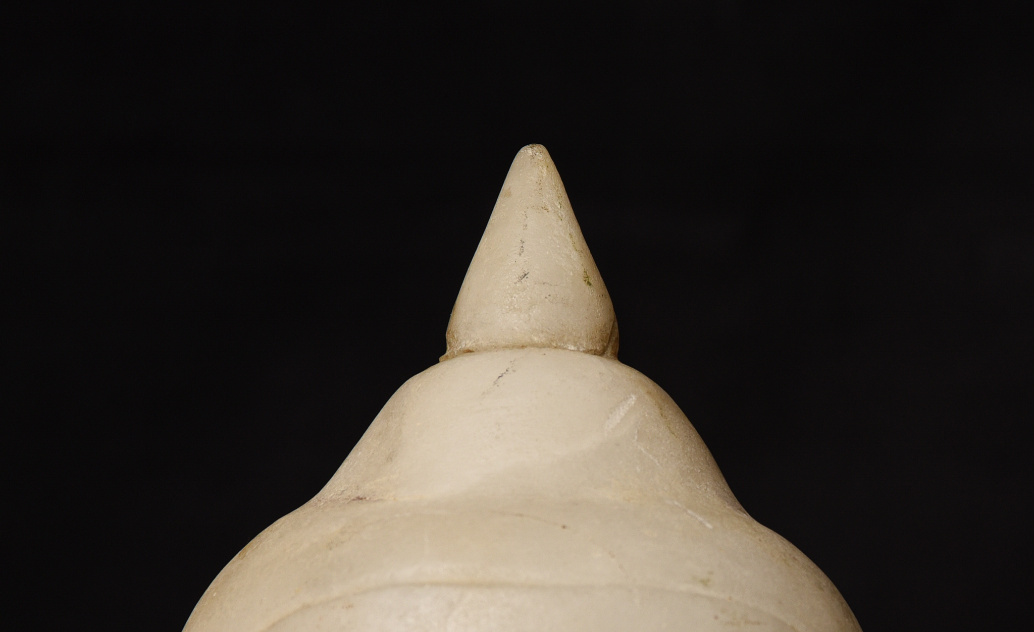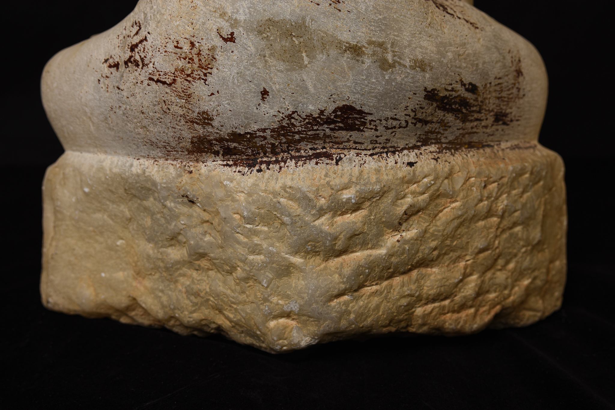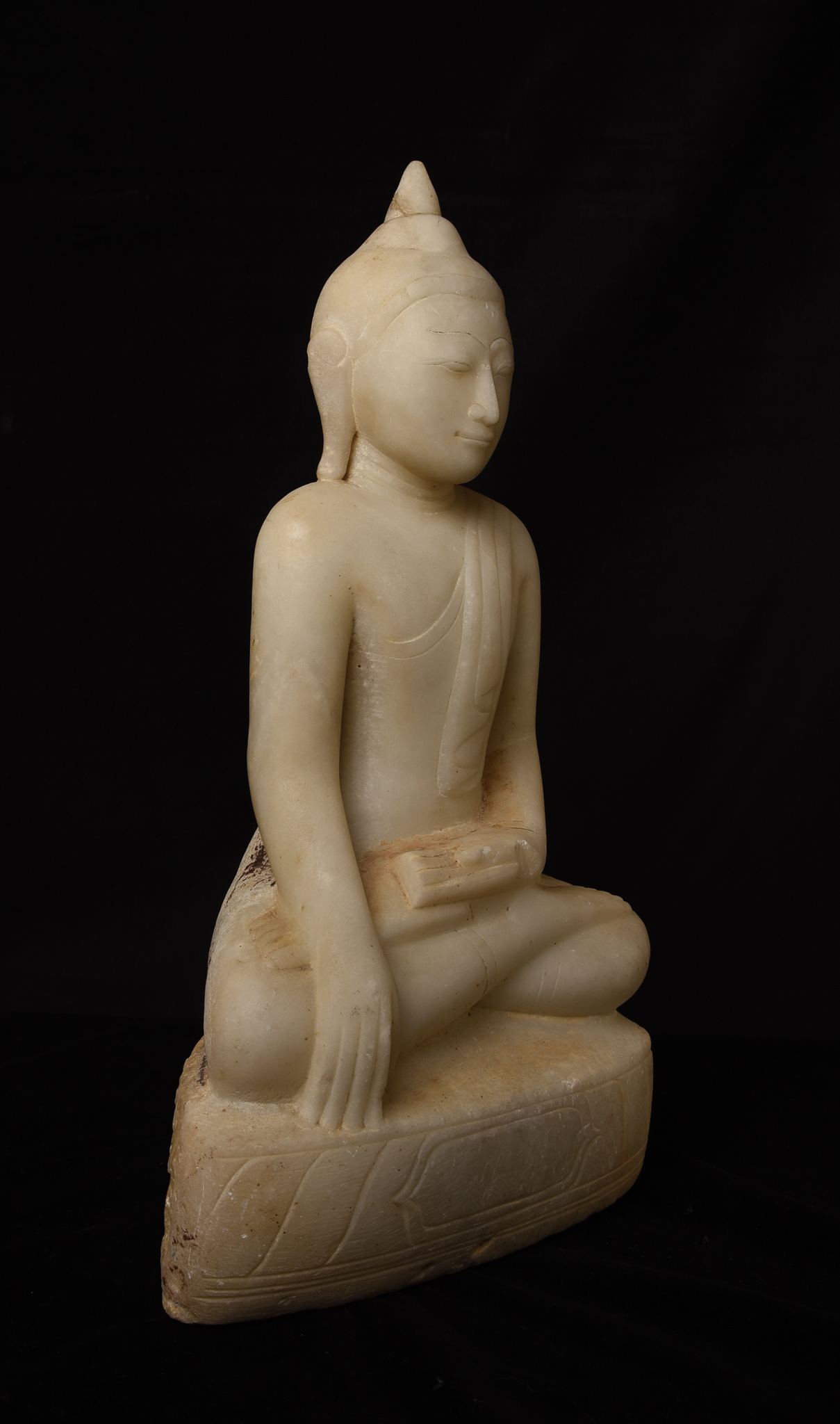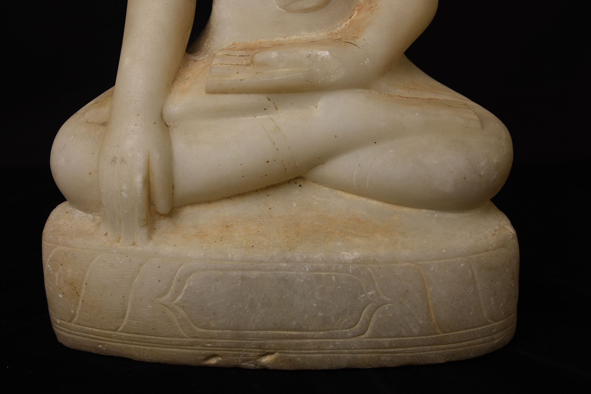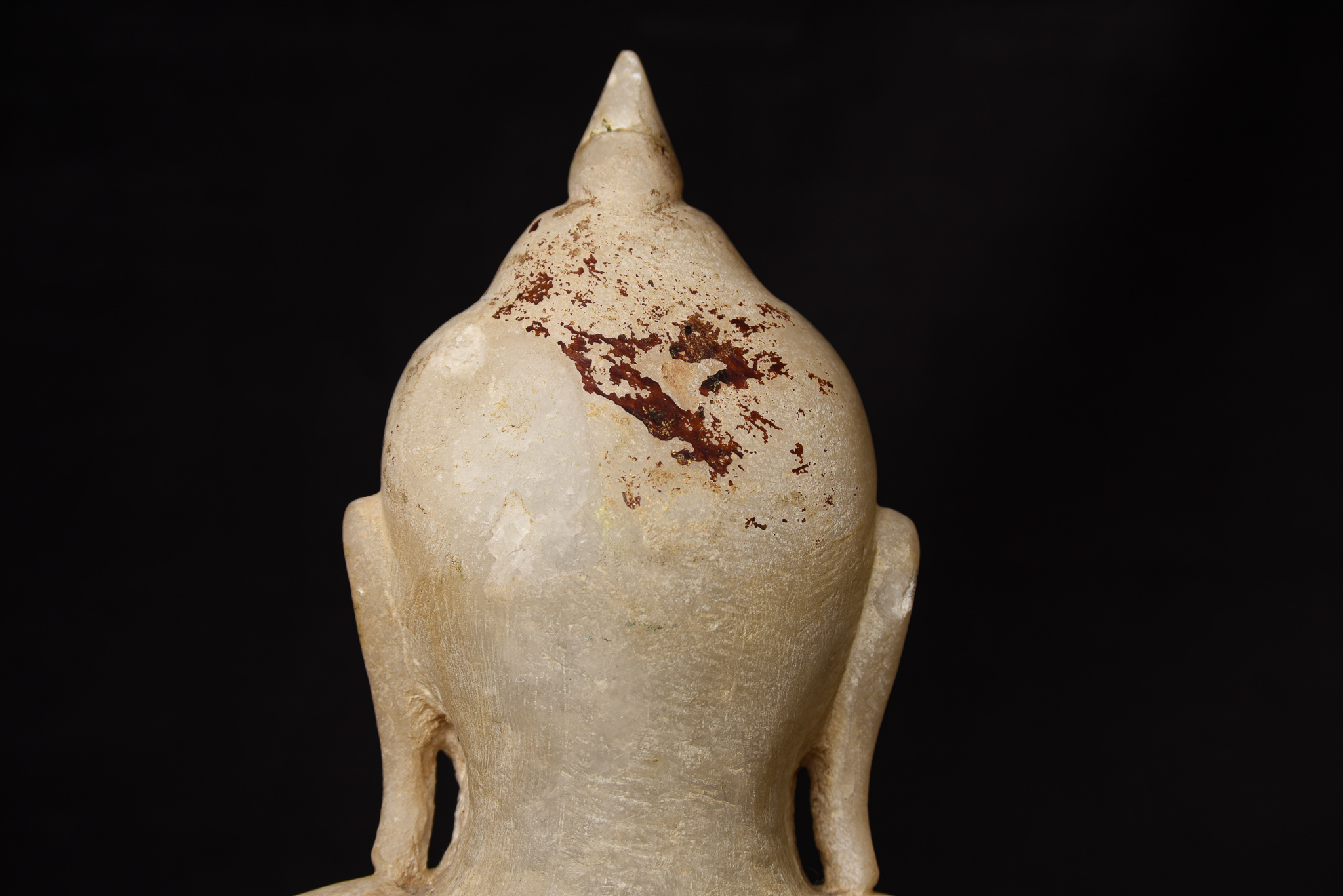 Superb 17thC Burmese Ava Buddha carved in Alabaster. This is a stellar example in every way. Large size, outstanding condition, beautiful skillful carving, and most importantly, it has an exquisite face that lights up the world. Traces of more than one layer of lacquer (both red and black). Often this type of Buddha was found in caves in large numbers. My best understanding is that the multiple Buddhas amplified the spiritual power of the location. One of the nicest of this type I've ever had the pleasure of offering. Will fill up any room with its presence. Repair to the tip of the finial. Condition is exceptional for alabaster, which is much more likely to chip and crack than marble. Often this type of Buddha has significant breaks and losses. This one looks great -look at the photos carefully!! Sits an impressive 20" (50.08cm).