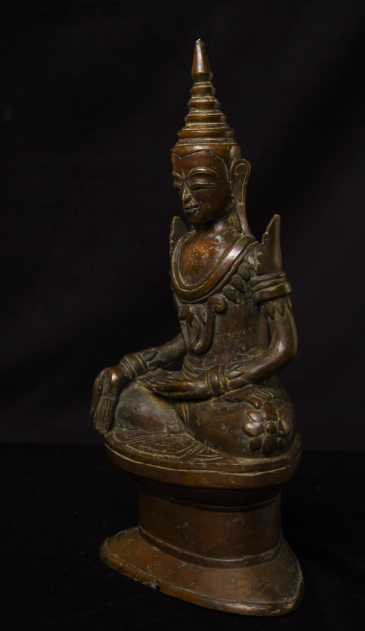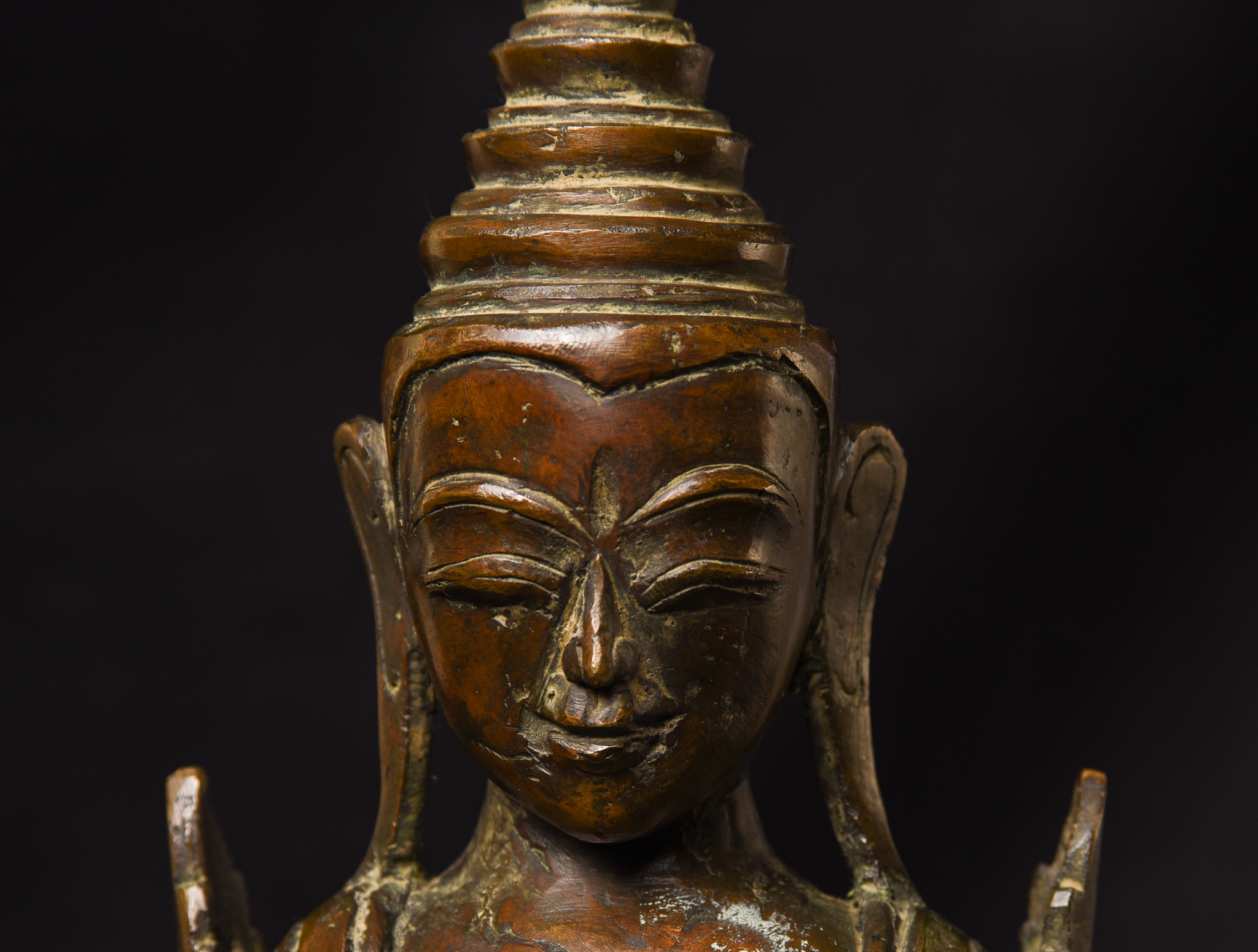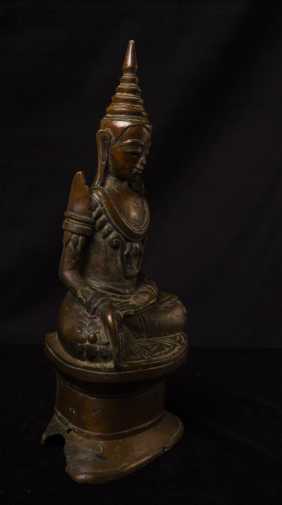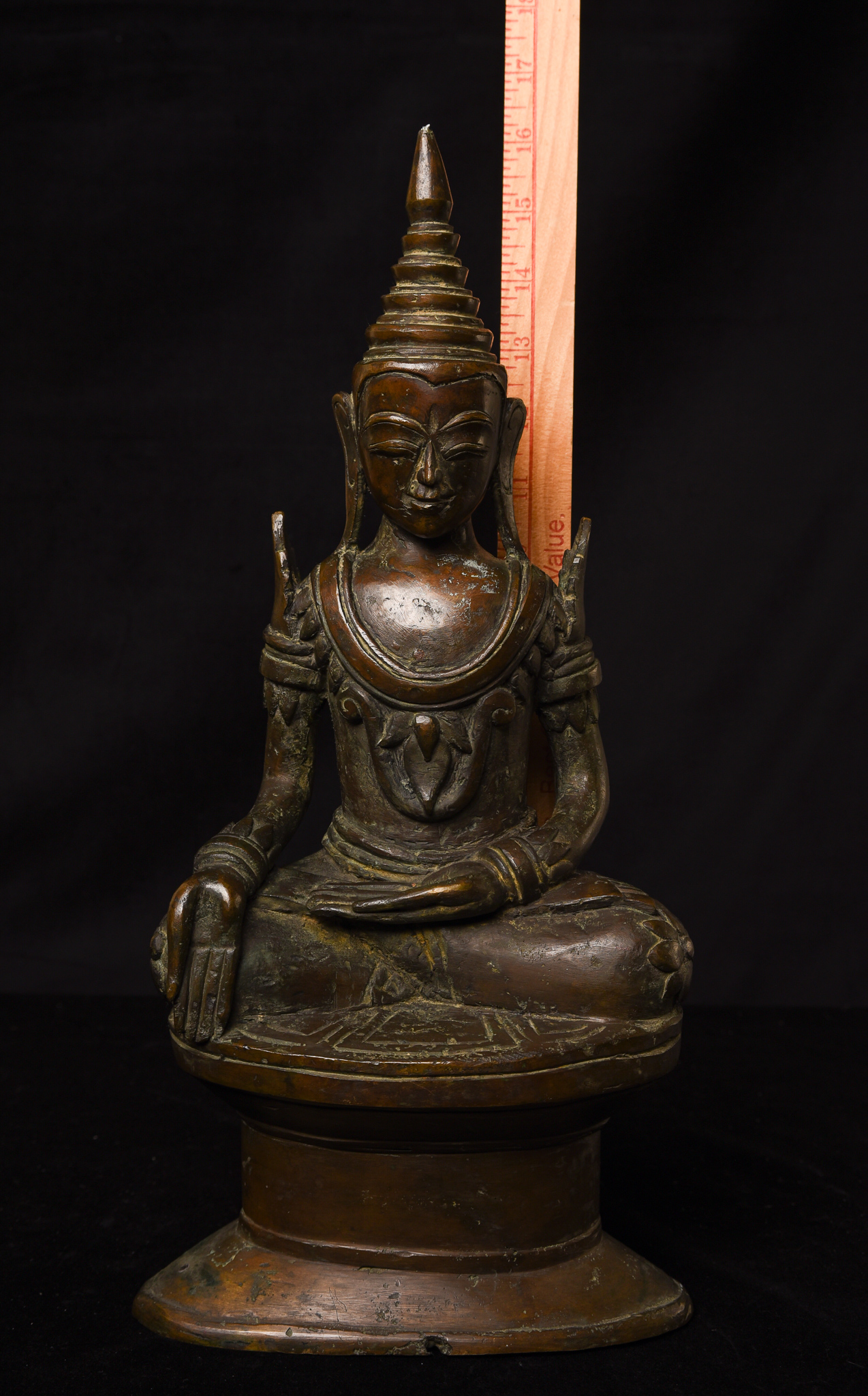 Unusual Burmese tribal Buddha. Not one of the major types from this period that are shown in the books on Burmese Buddhas (Shan, Mandalay, Mon, Arakan), but is from one of the smaller groups that is less well-known. It is a fascinating looking Buddha and a great piece for a collector who wants to have a very different and rare Buddha of substantial size for a very reasonable price. Lotus flowers on his knees!. H 16.5" (41.91cm)