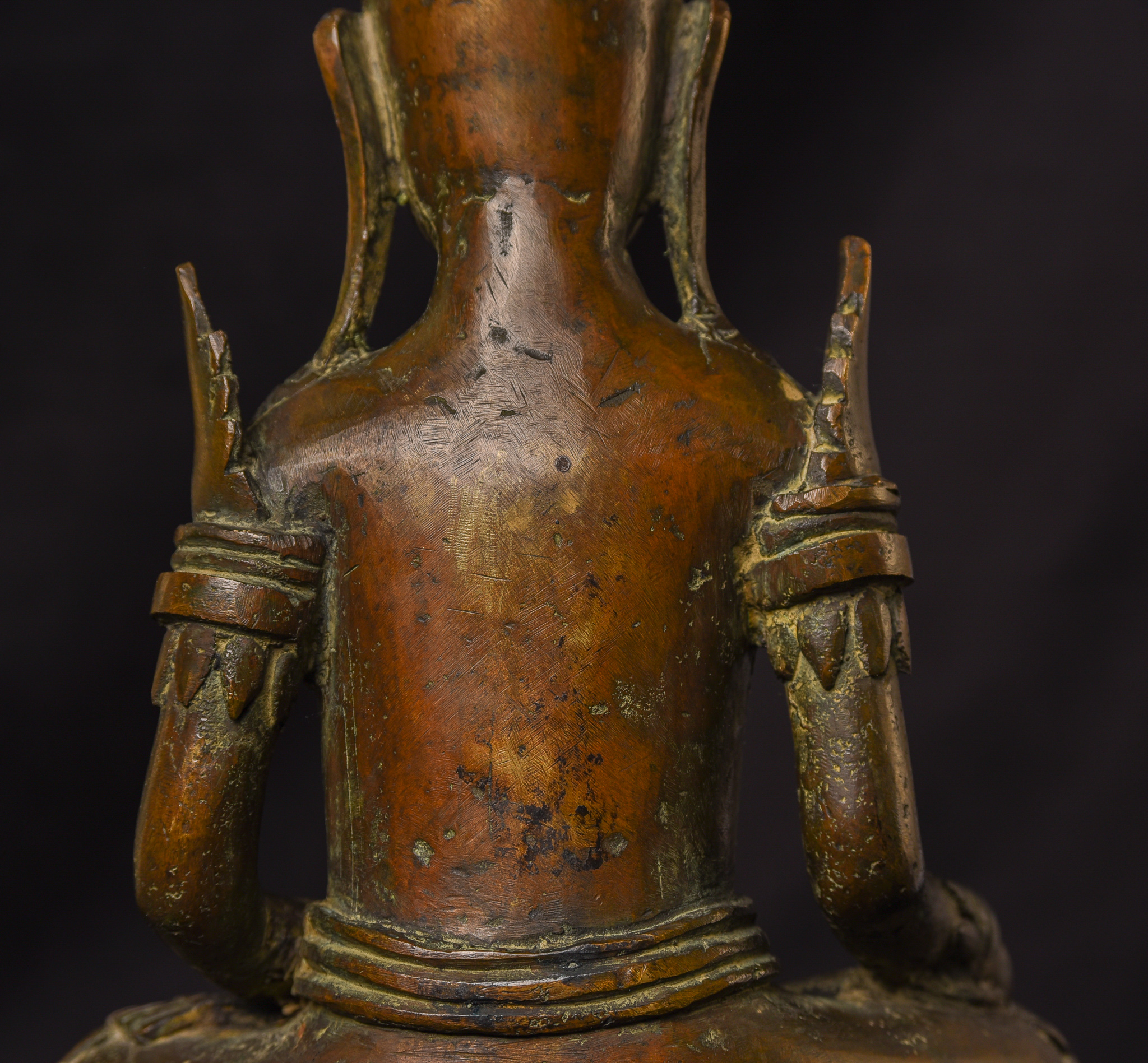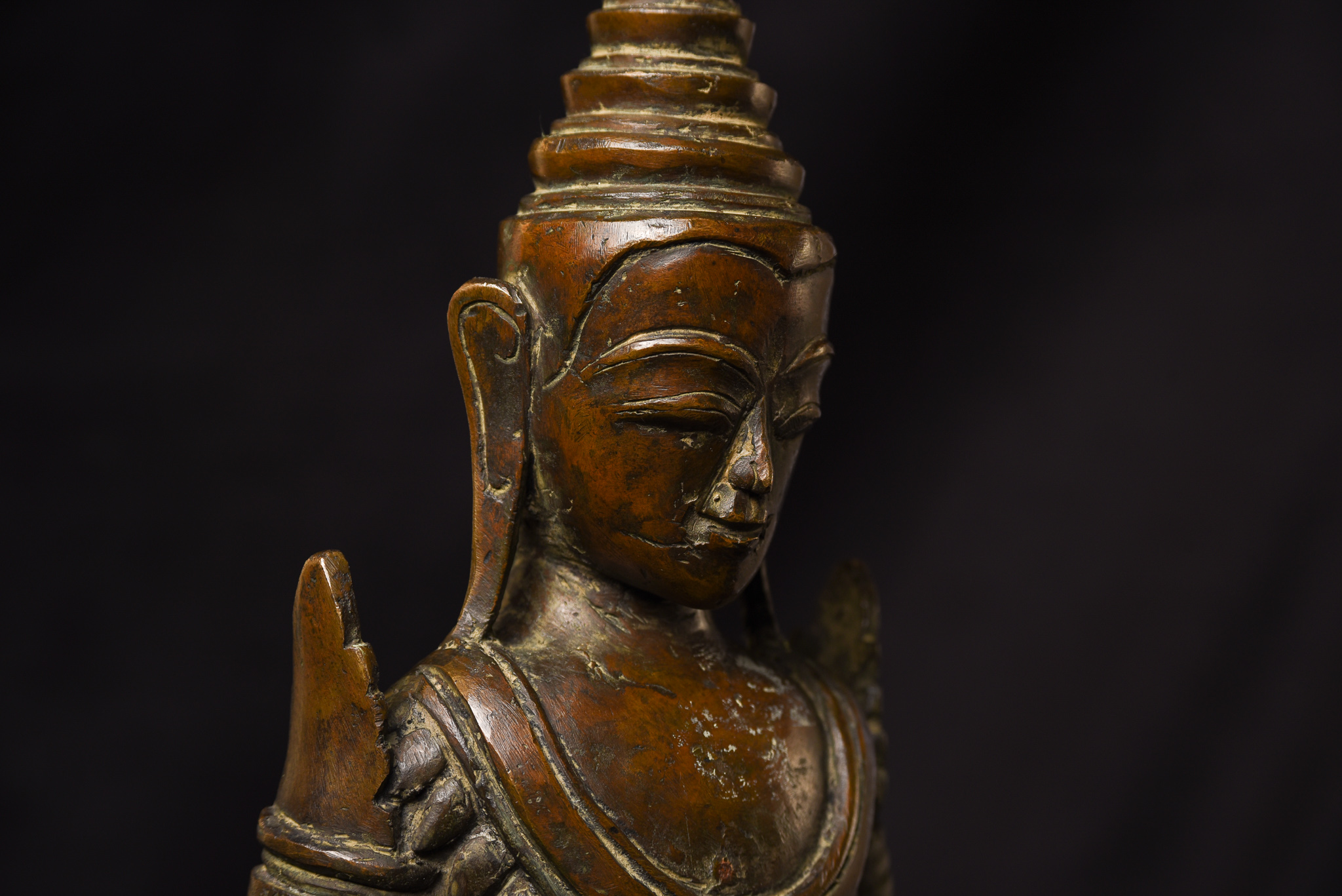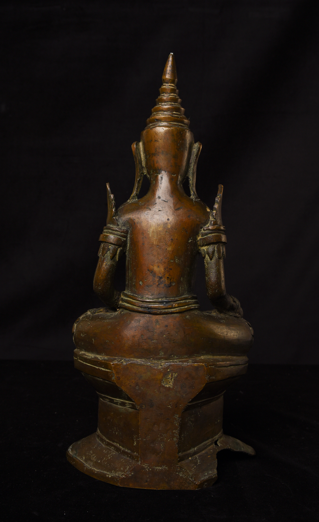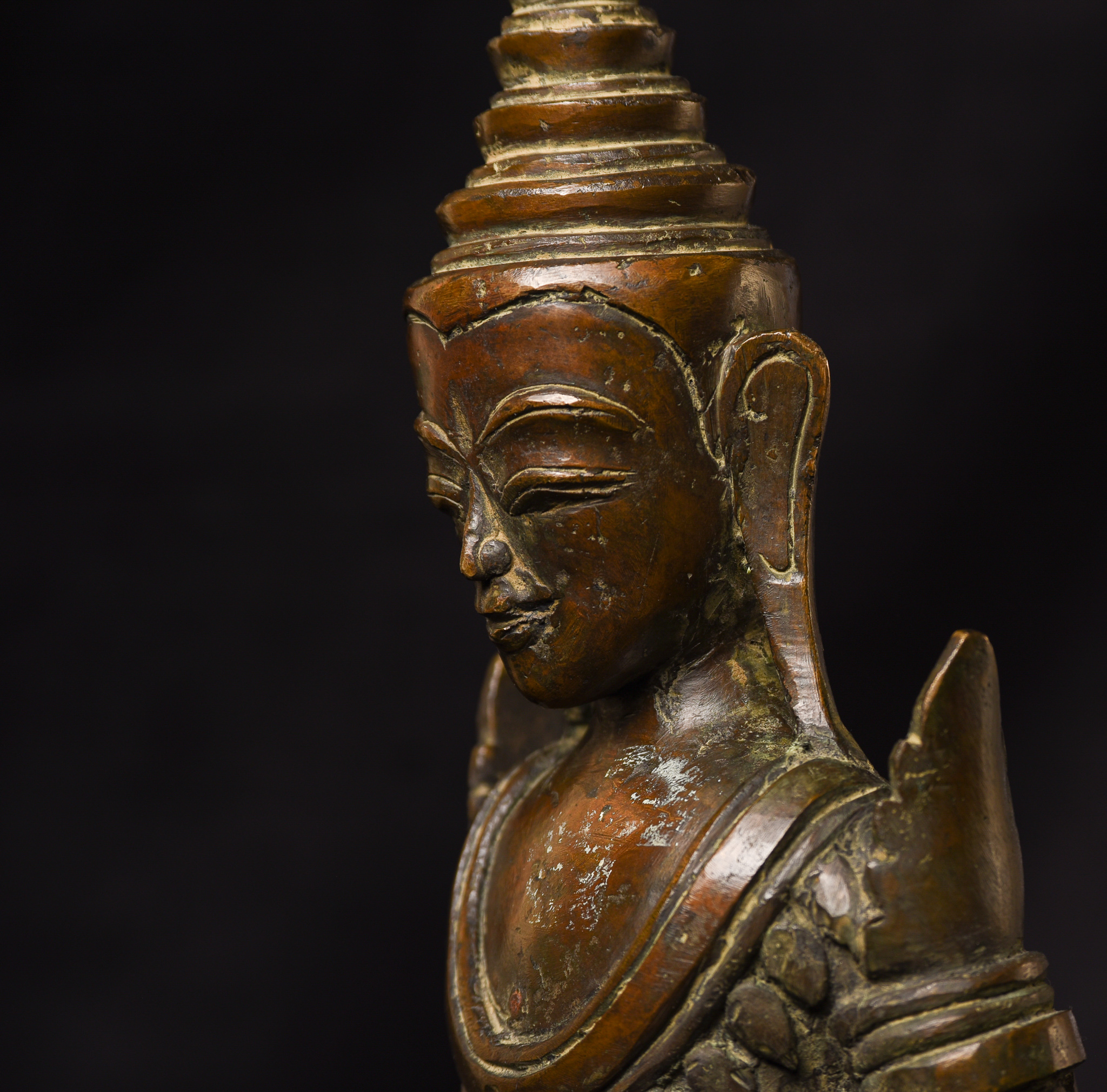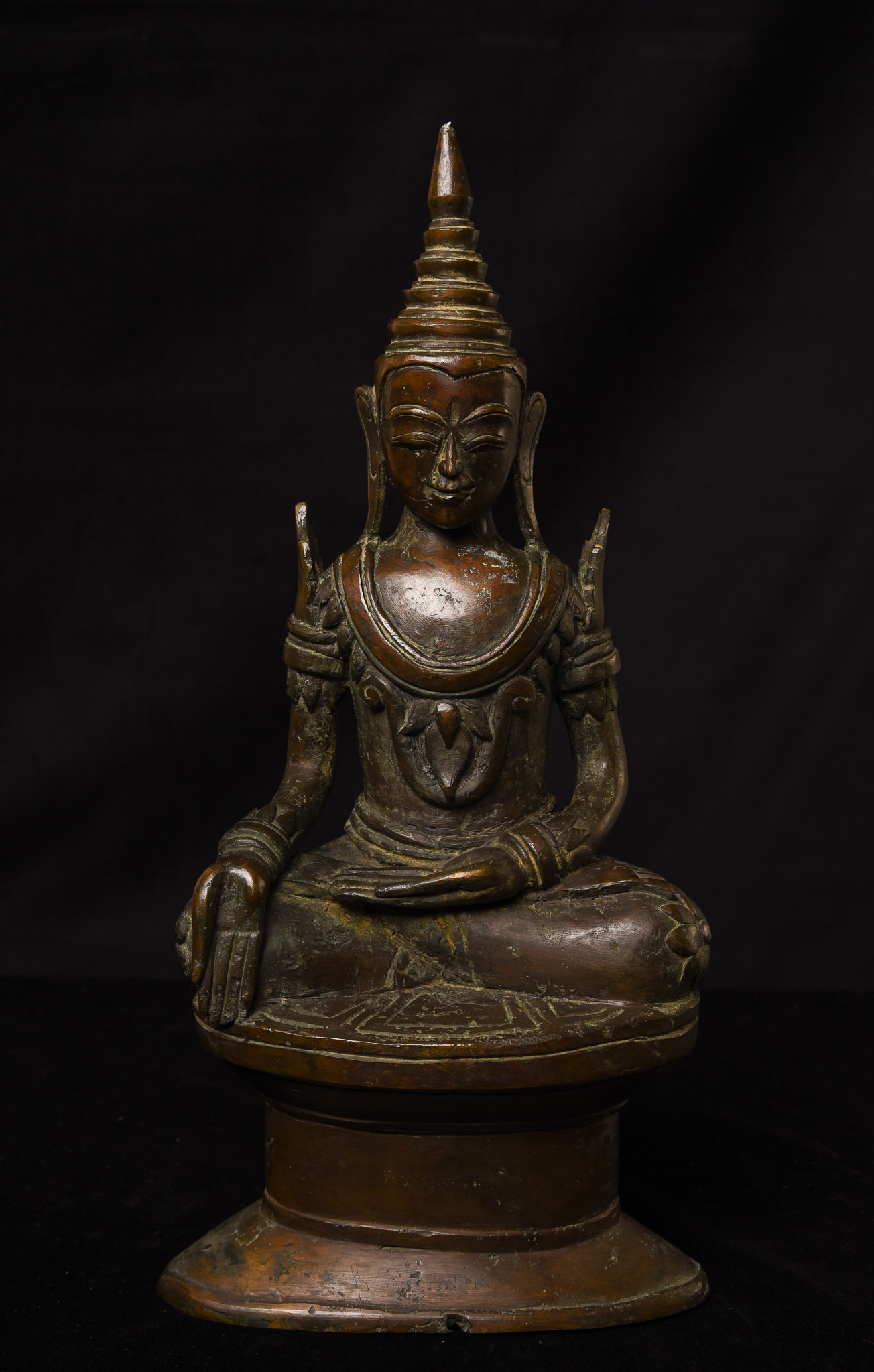 Unusual Burmese tribal Buddha. Not one of the major types from this period that are shown in the books on Burmese Buddhas (Shan, Mandalay, Mon, Arakan), but is from one of the smaller groups that is less well-known. It is a fascinating looking Buddha and a great piece for a collector who wants to have a very different and rare Buddha of substantial size for a very reasonable price. Lotus flowers on his knees!. H 16.5" (41.91cm)