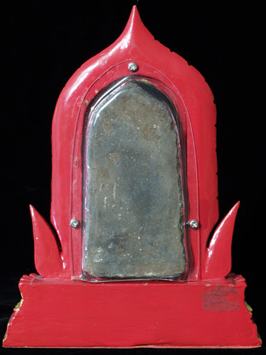 This is an authentic and early Chiang Sen lead-bronze or other alloy Buddha tablet. There are many modern copies of this type, and a few authentic excavated pieces. Authentic pieces such as this, in excellent condition, with different types of polychrome or lacquer, are extremely rare. This is the best if its type I have encountered. The previous owner thought enough of this piece to have it encased in Lucite and then have an elaborate stand constructed. The actual Buddha tablet stands over 4,25 inches tall by 2 inches wide, and it is fairly thick. In the stand it is 8 inches tall by 6 inches wide.