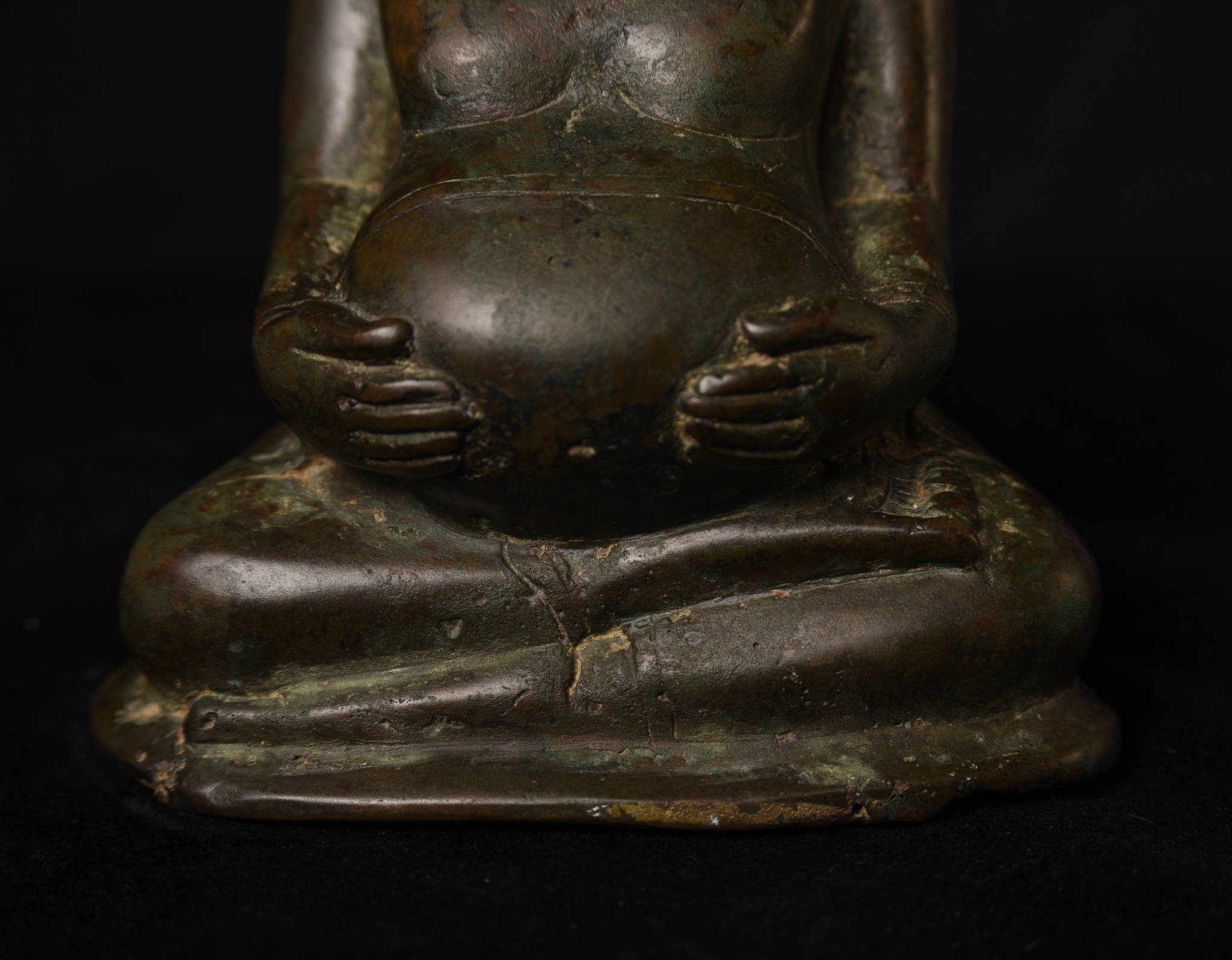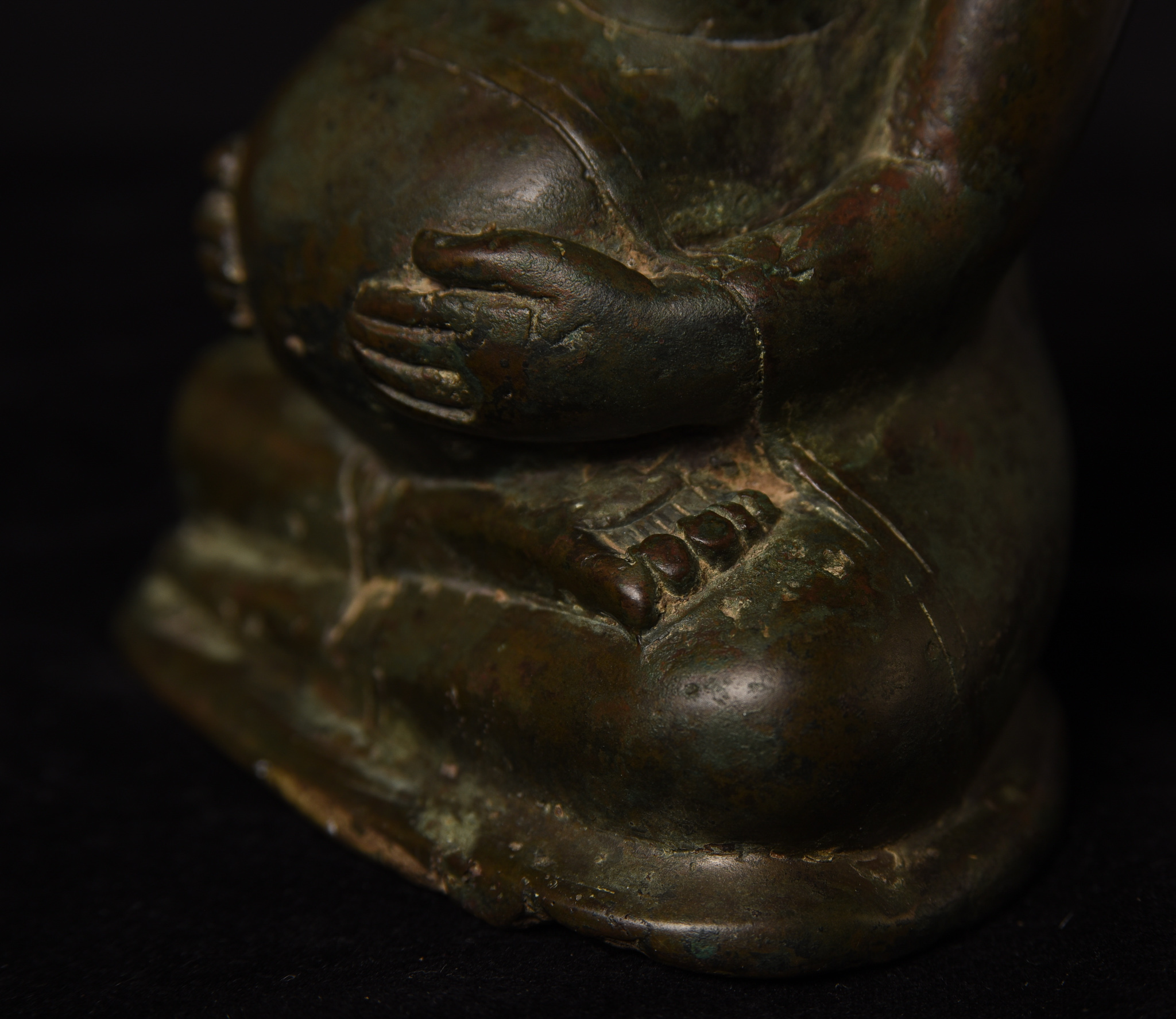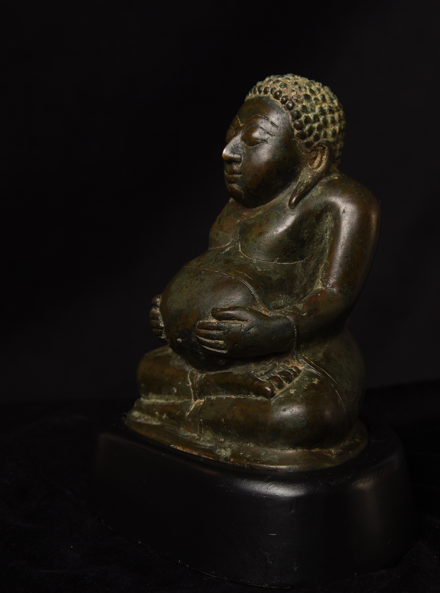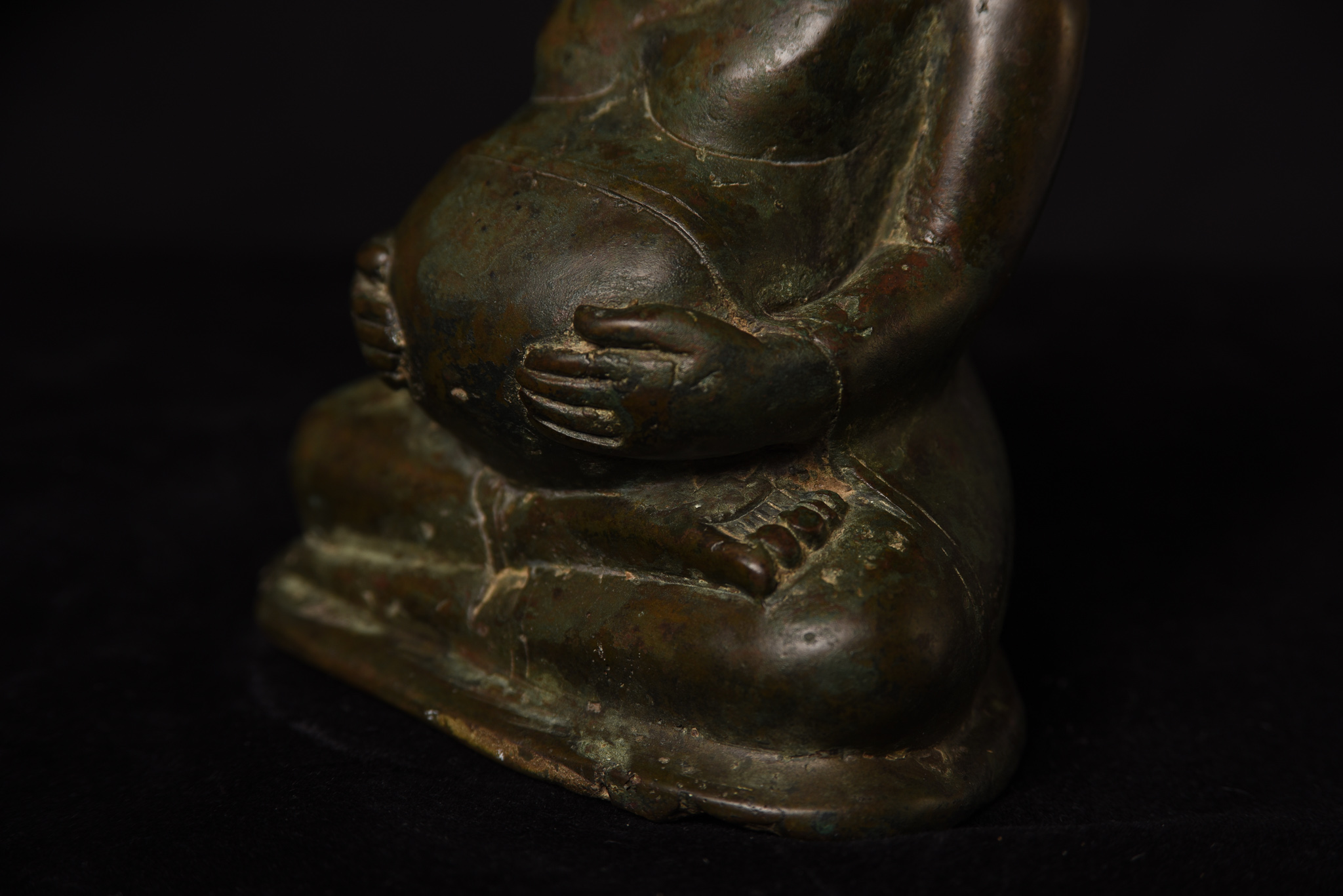 Authentic 16/17thC Ayuthaya bronze Saenkajai (Thai form of "Happy Buddha"). Very rare to find a true period piece of this type. based on how few I have seen over the decades, I believe they were very few originally made. most of those on the market today are recent copies. this one, based on the old bits of lacquer, on the way the underside looks, and on the wear patterns, and the overall look and feel of the statue, is the real thing. Great face. Great size. H 6.5" (16.51cm)