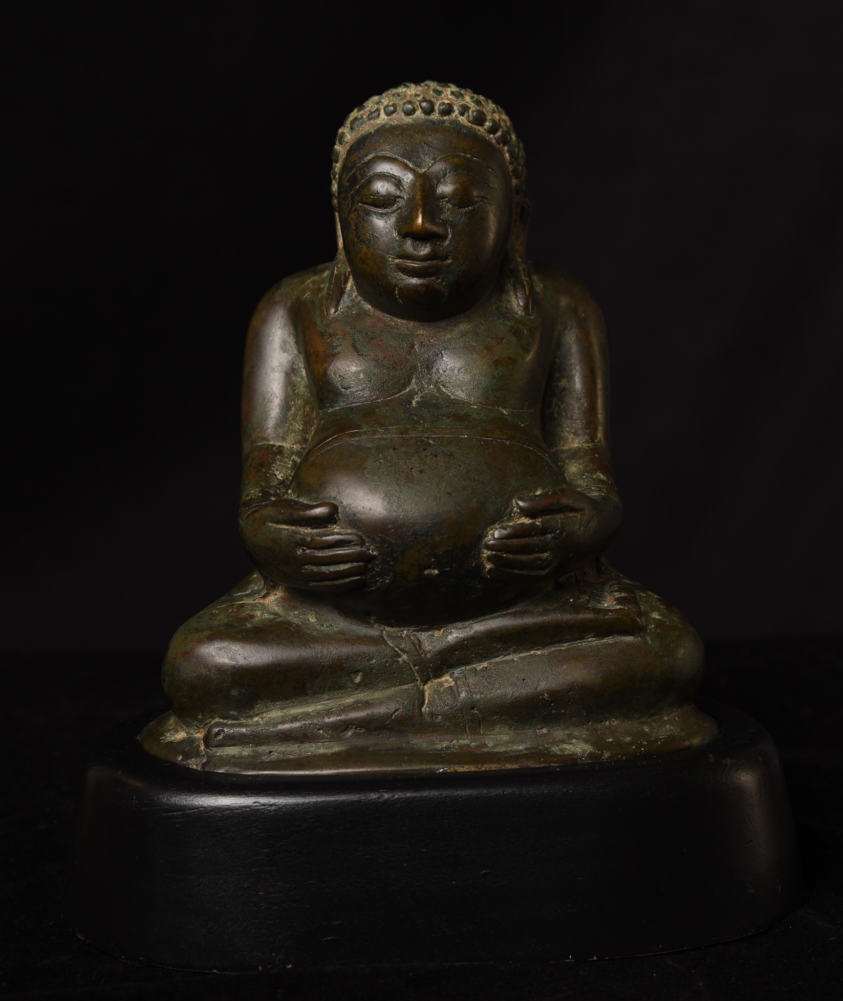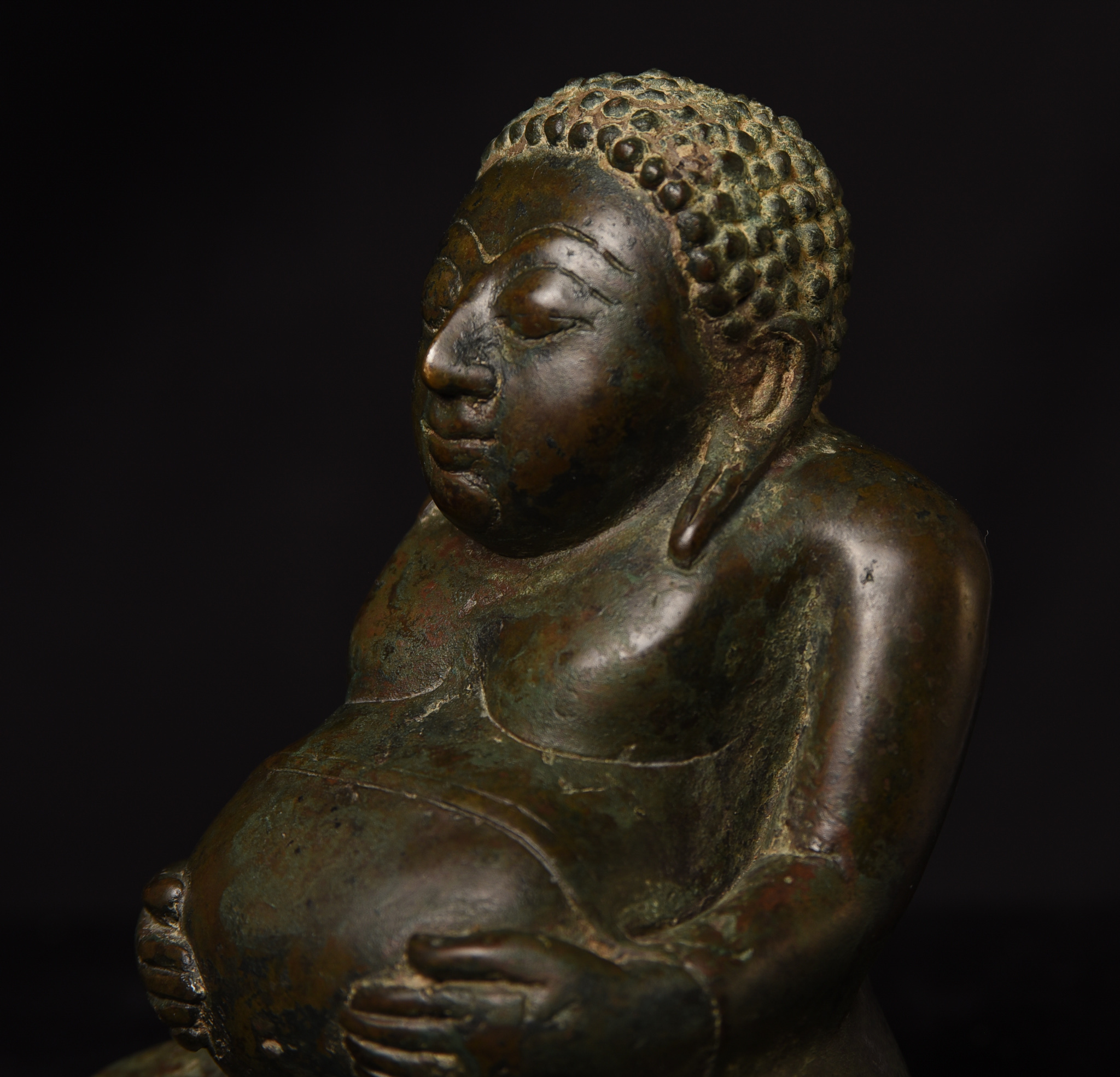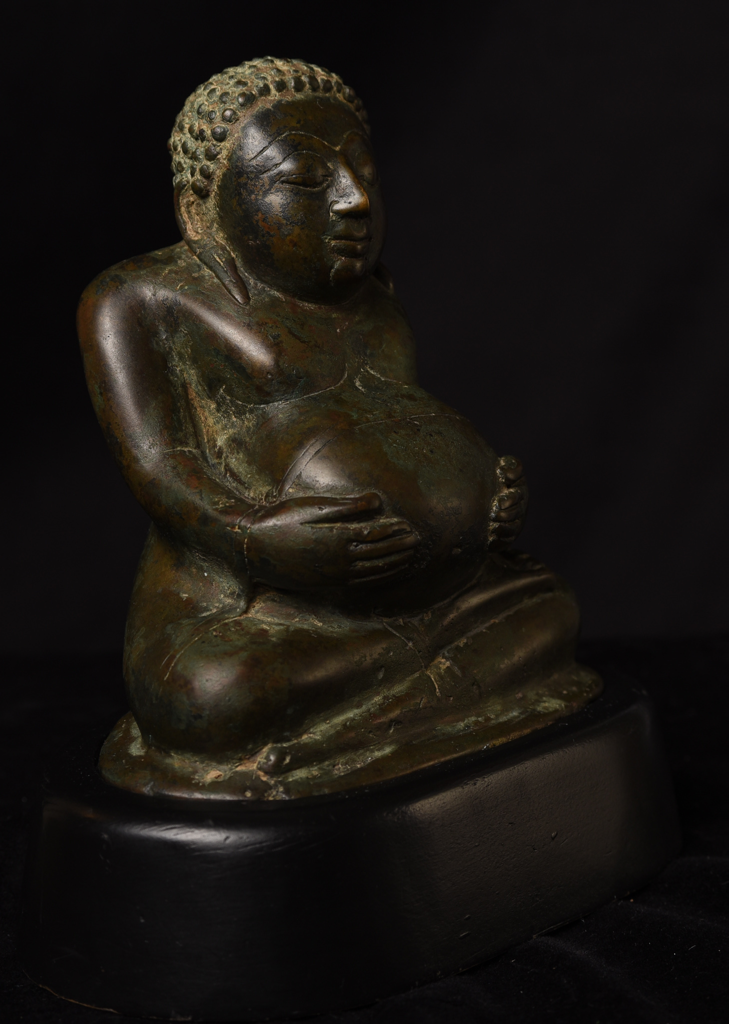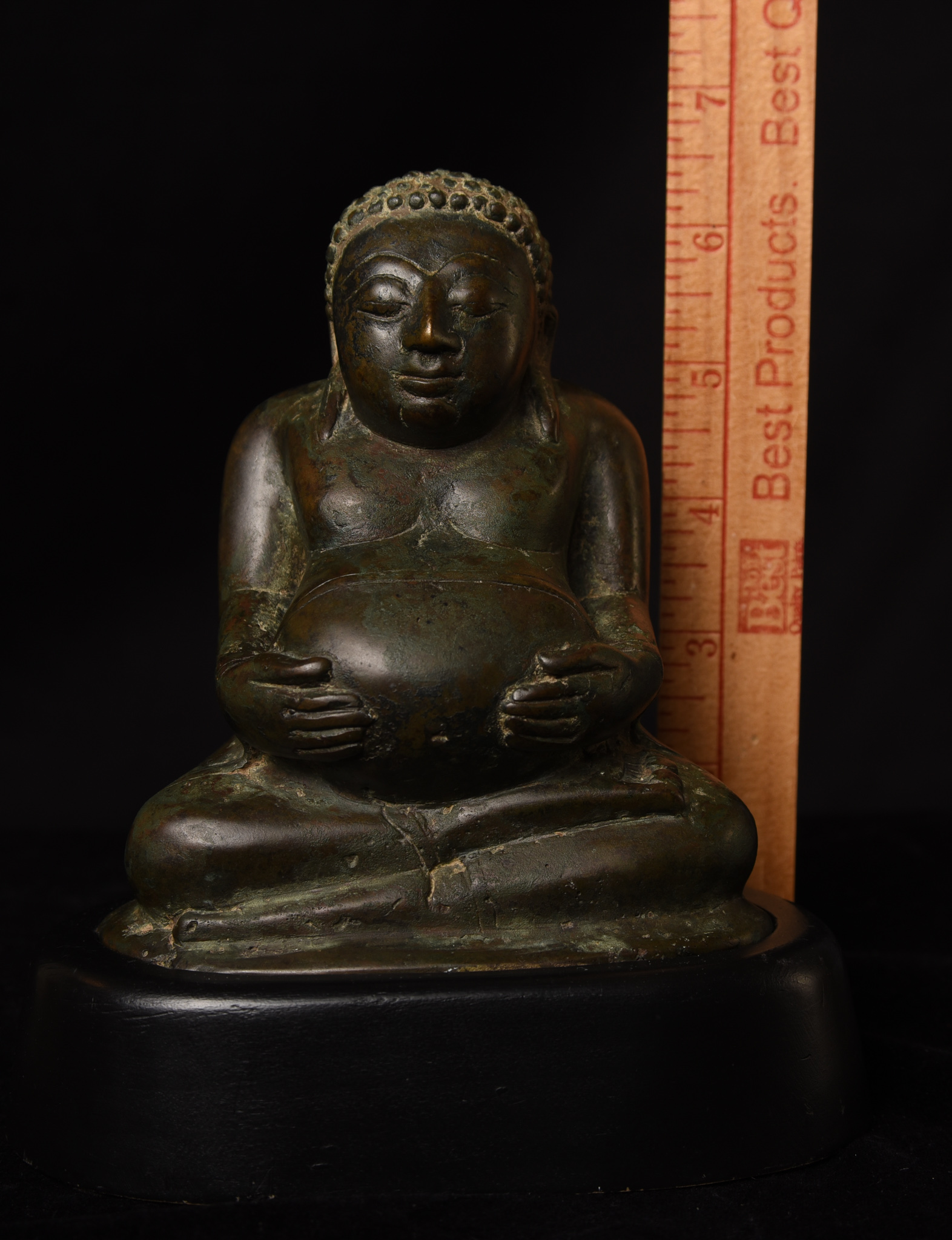 Authentic 16/17thC Ayuthaya bronze Saenkajai (Thai form of "Happy Buddha"). Very rare to find a true period piece of this type. based on how few I have seen over the decades, I believe they were very few originally made. most of those on the market today are recent copies. this one, based on the old bits of lacquer, on the way the underside looks, and on the wear patterns, and the overall look and feel of the statue, is the real thing. Great face. Great size. H 6.5" (16.51cm)