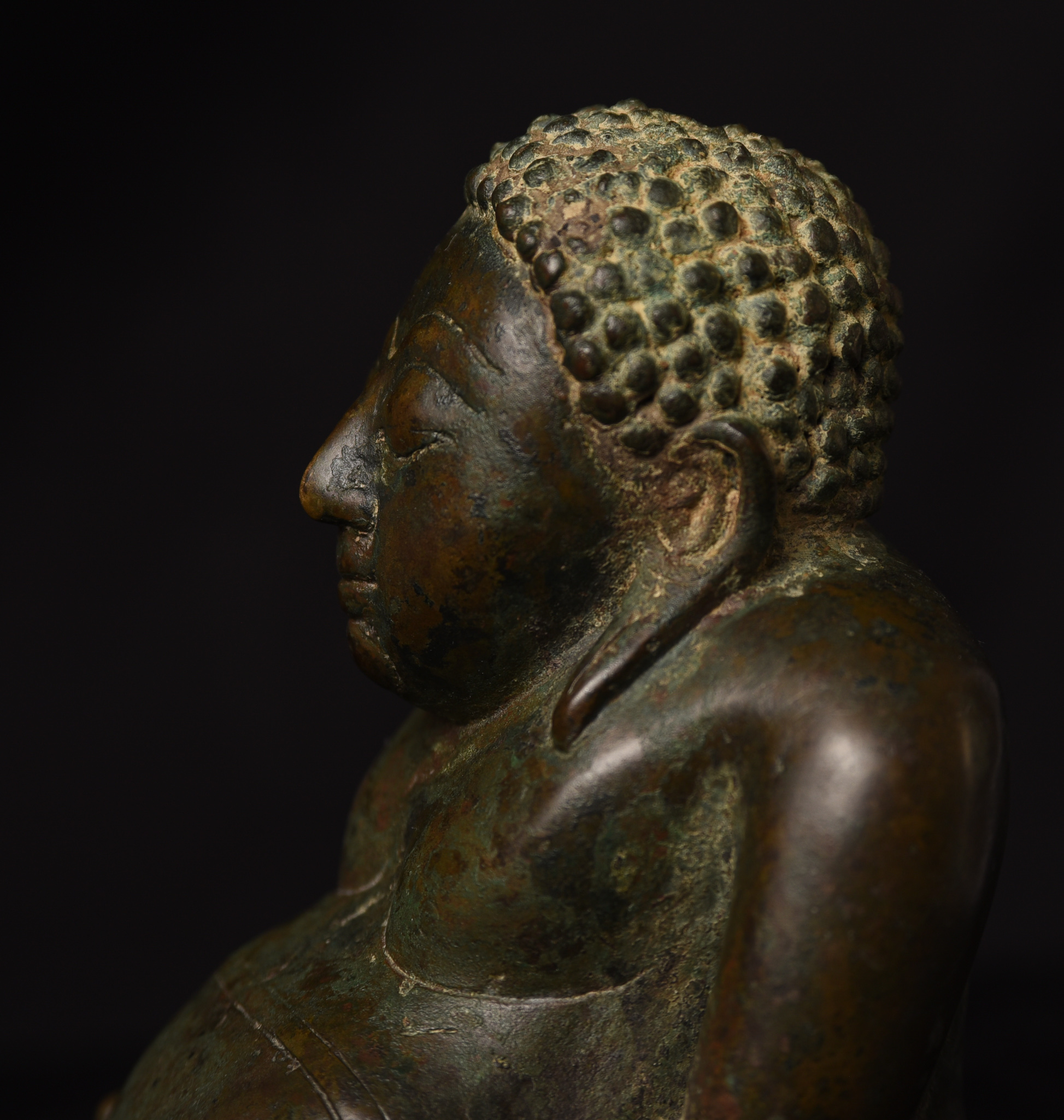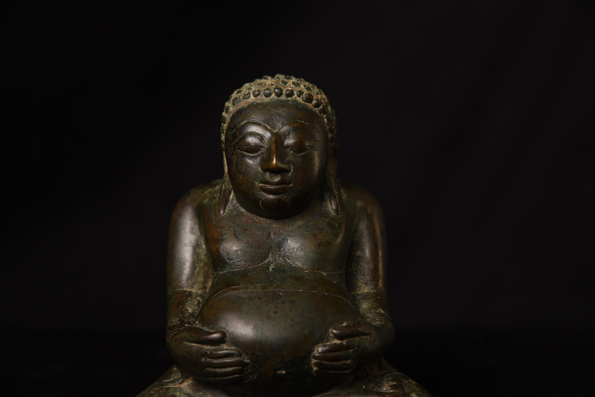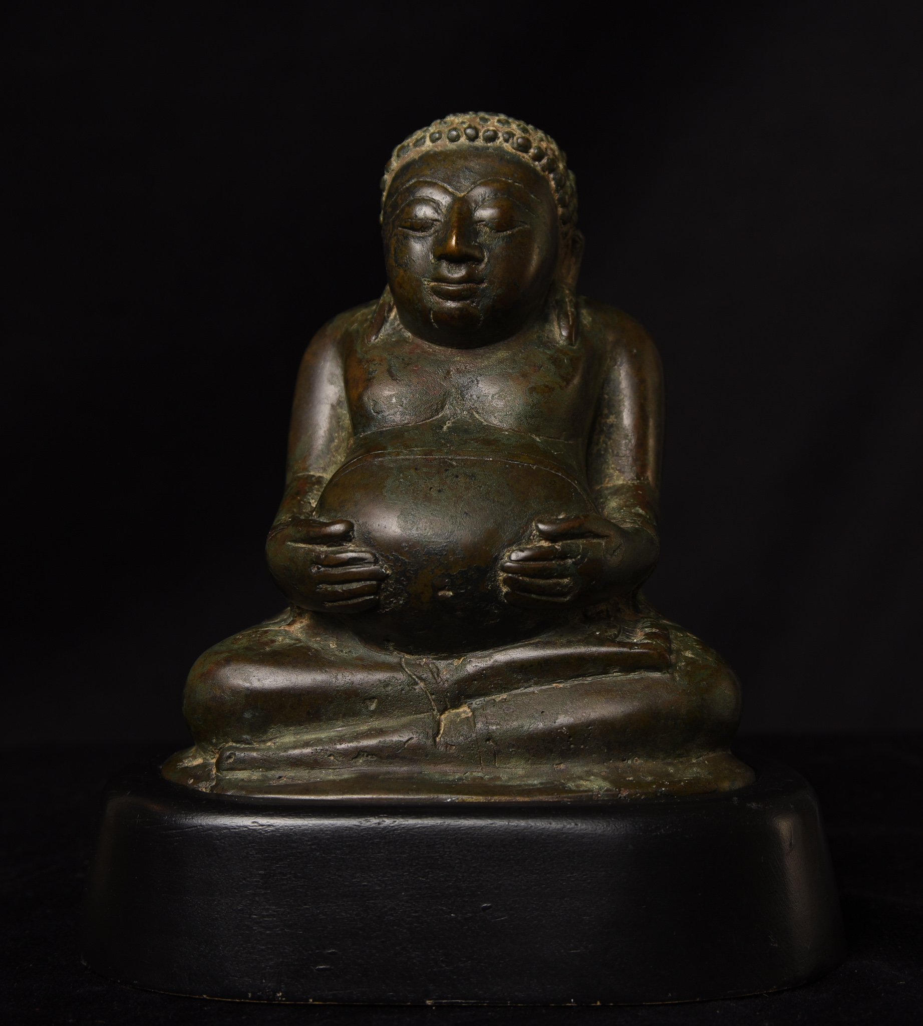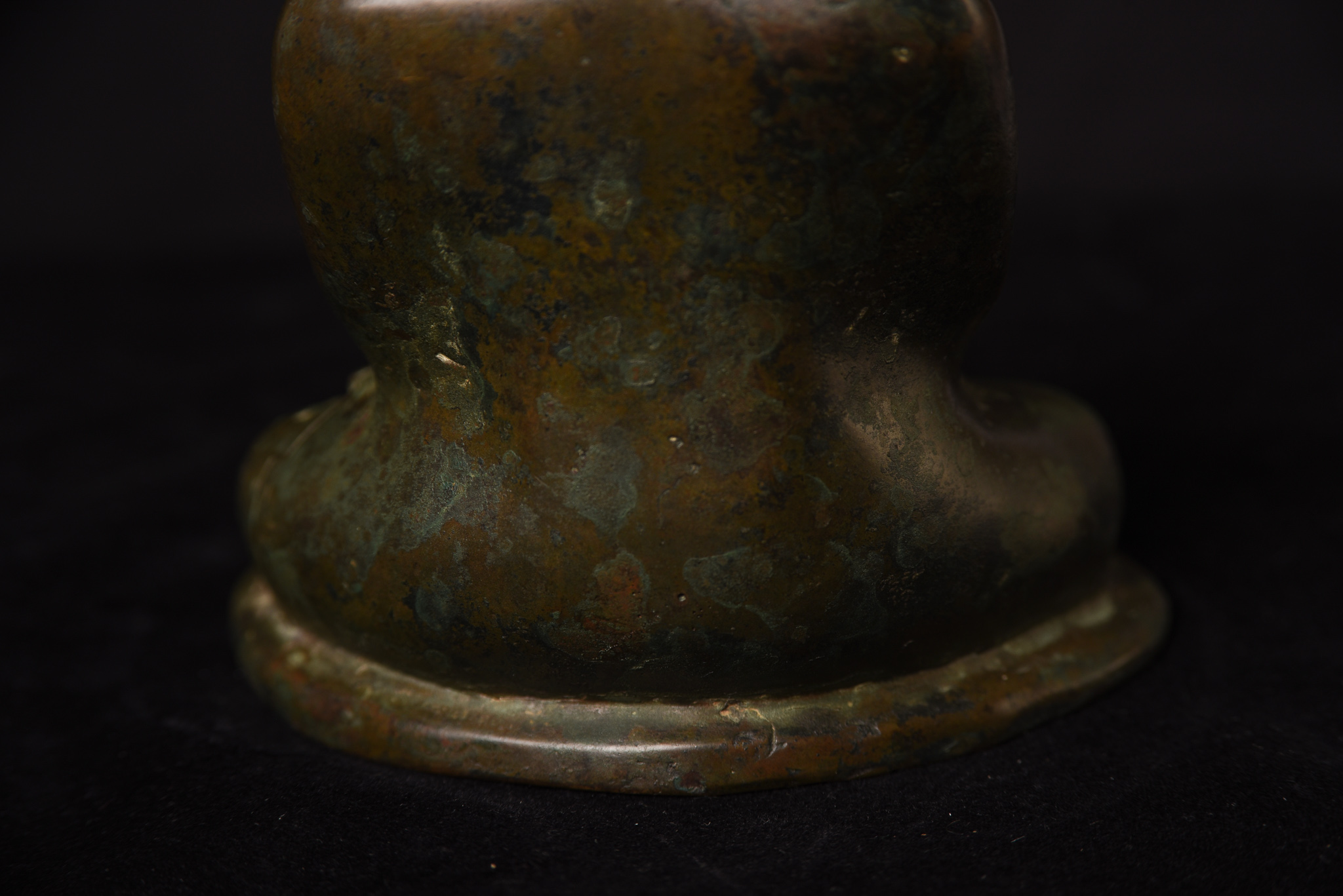 Authentic 16/17thC Ayuthaya bronze Saenkajai (Thai form of "Happy Buddha"). Very rare to find a true period piece of this type. based on how few I have seen over the decades, I believe they were very few originally made. most of those on the market today are recent copies. this one, based on the old bits of lacquer, on the way the underside looks, and on the wear patterns, and the overall look and feel of the statue, is the real thing. Great face. Great size. H 6.5" (16.51cm)