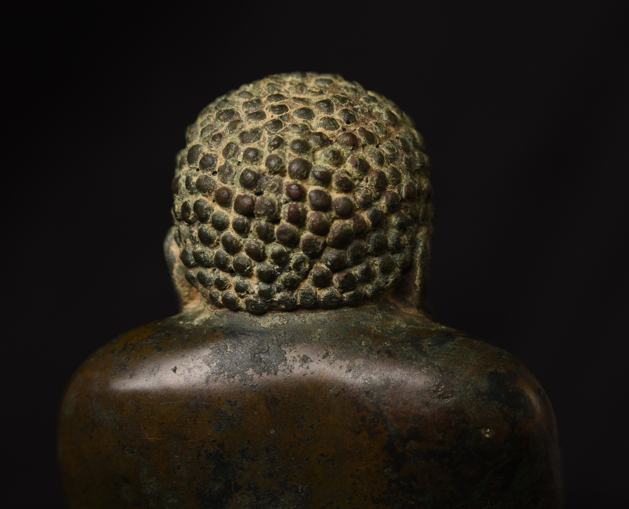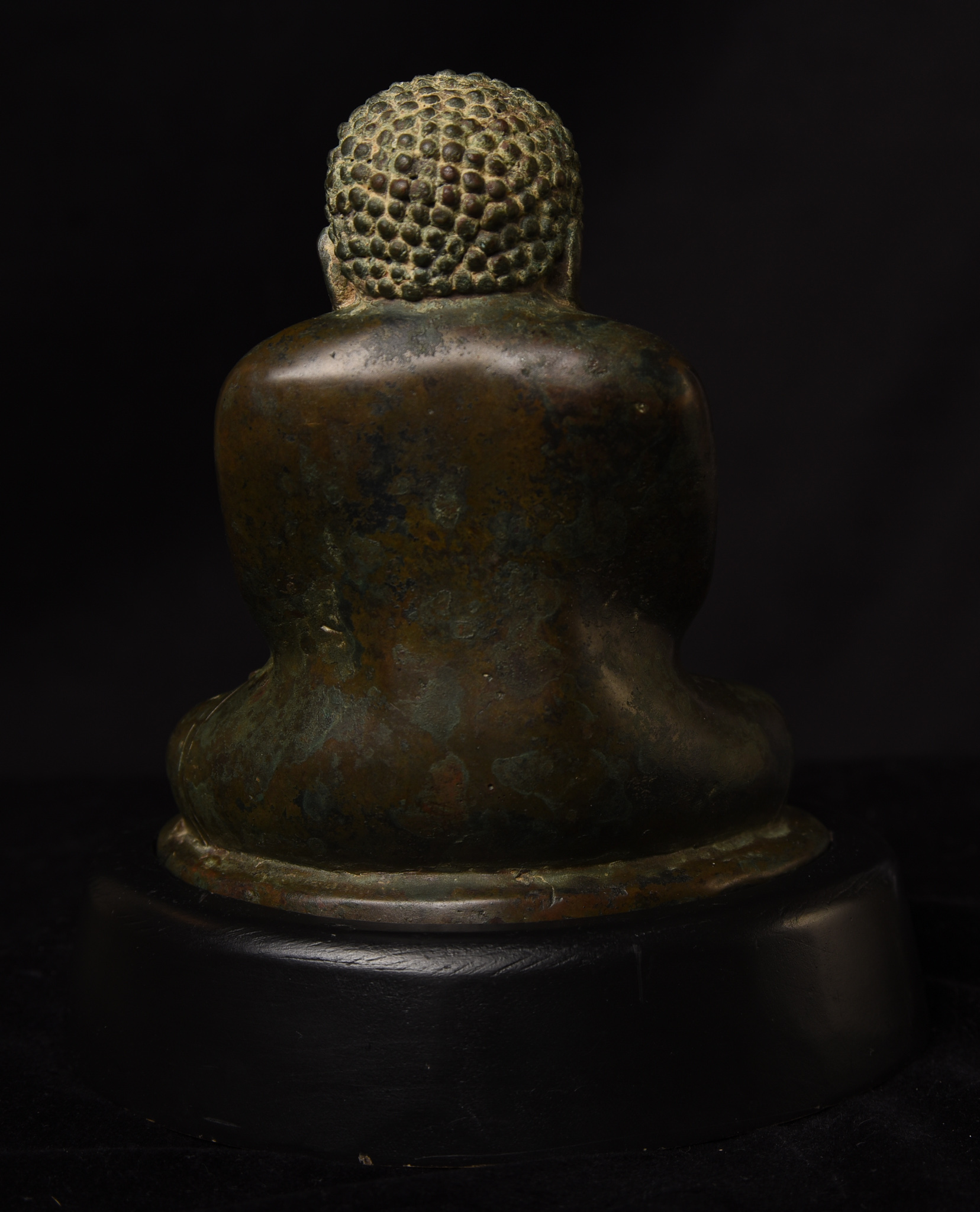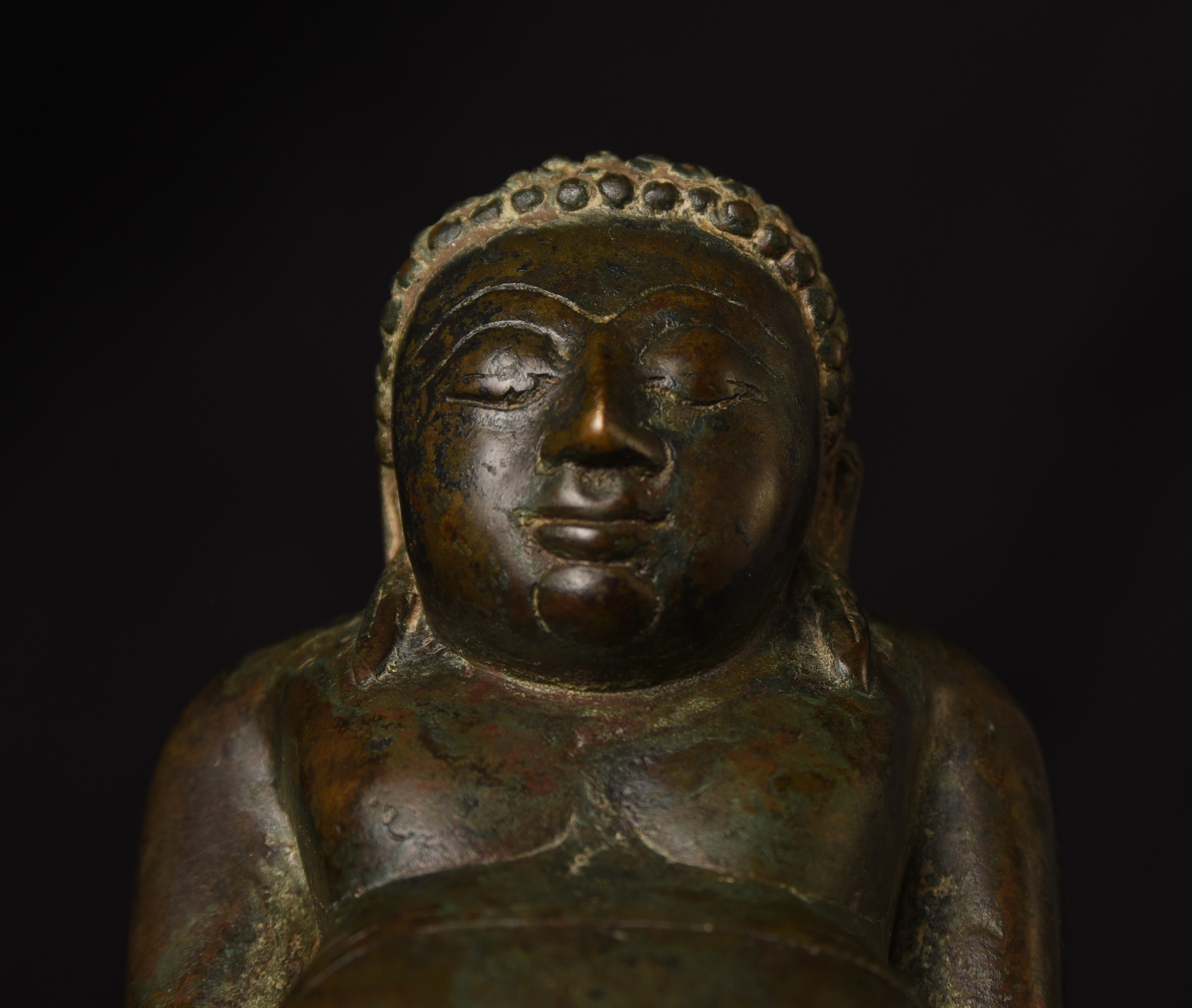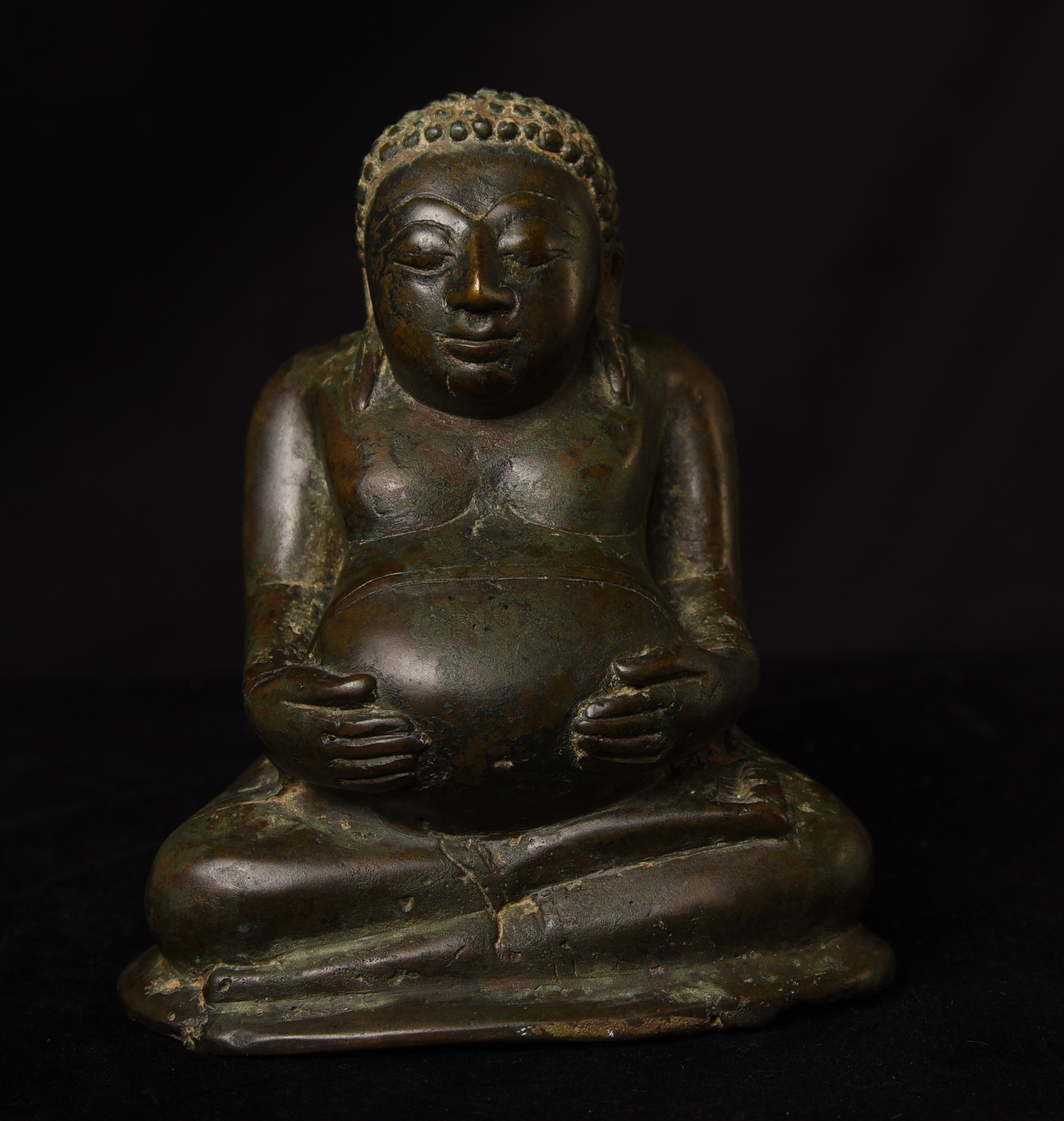 Authentic 16/17thC Ayuthaya bronze Saenkajai (Thai form of "Happy Buddha"). Very rare to find a true period piece of this type. based on how few I have seen over the decades, I believe they were very few originally made. most of those on the market today are recent copies. this one, based on the old bits of lacquer, on the way the underside looks, and on the wear patterns, and the overall look and feel of the statue, is the real thing. Great face. Great size. H 6.5" (16.51cm)