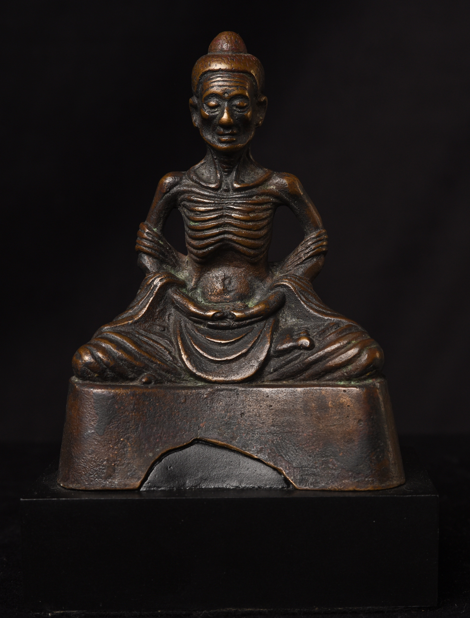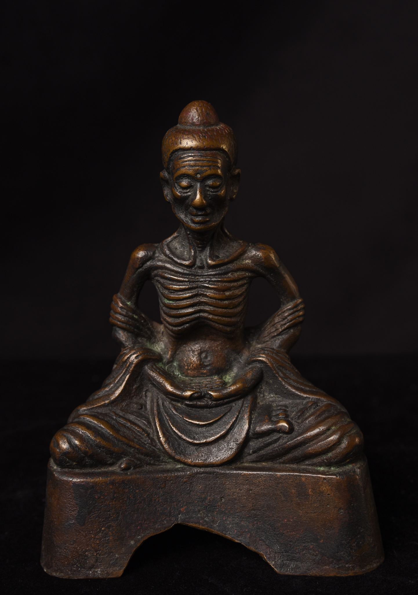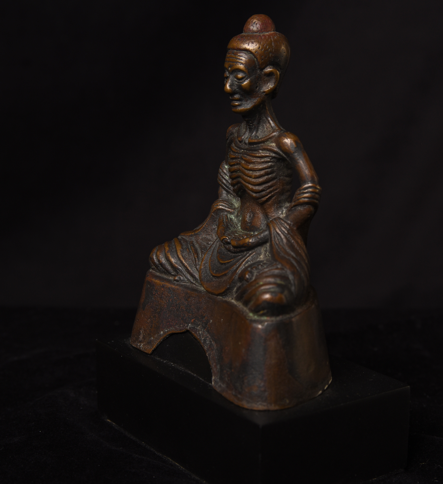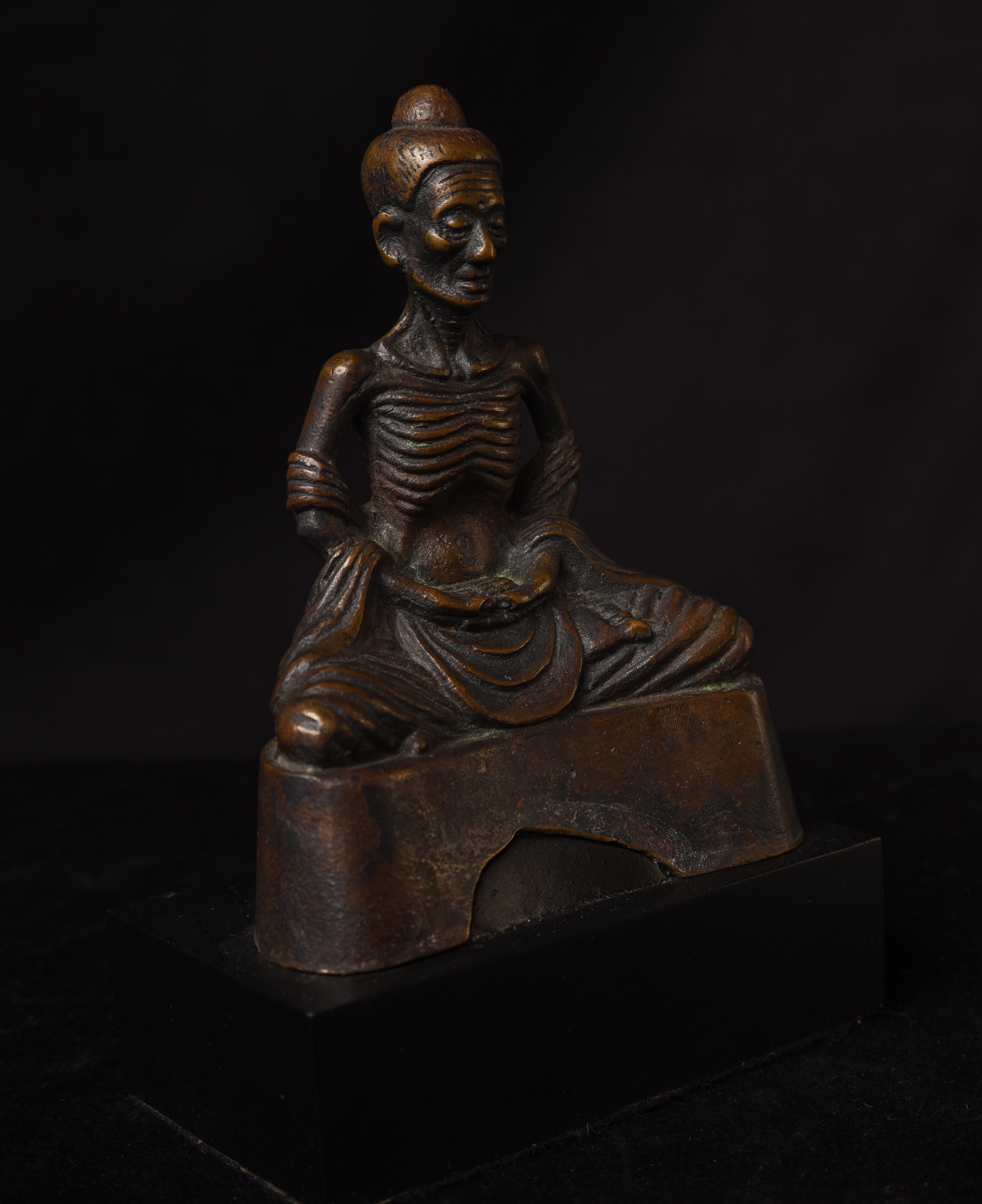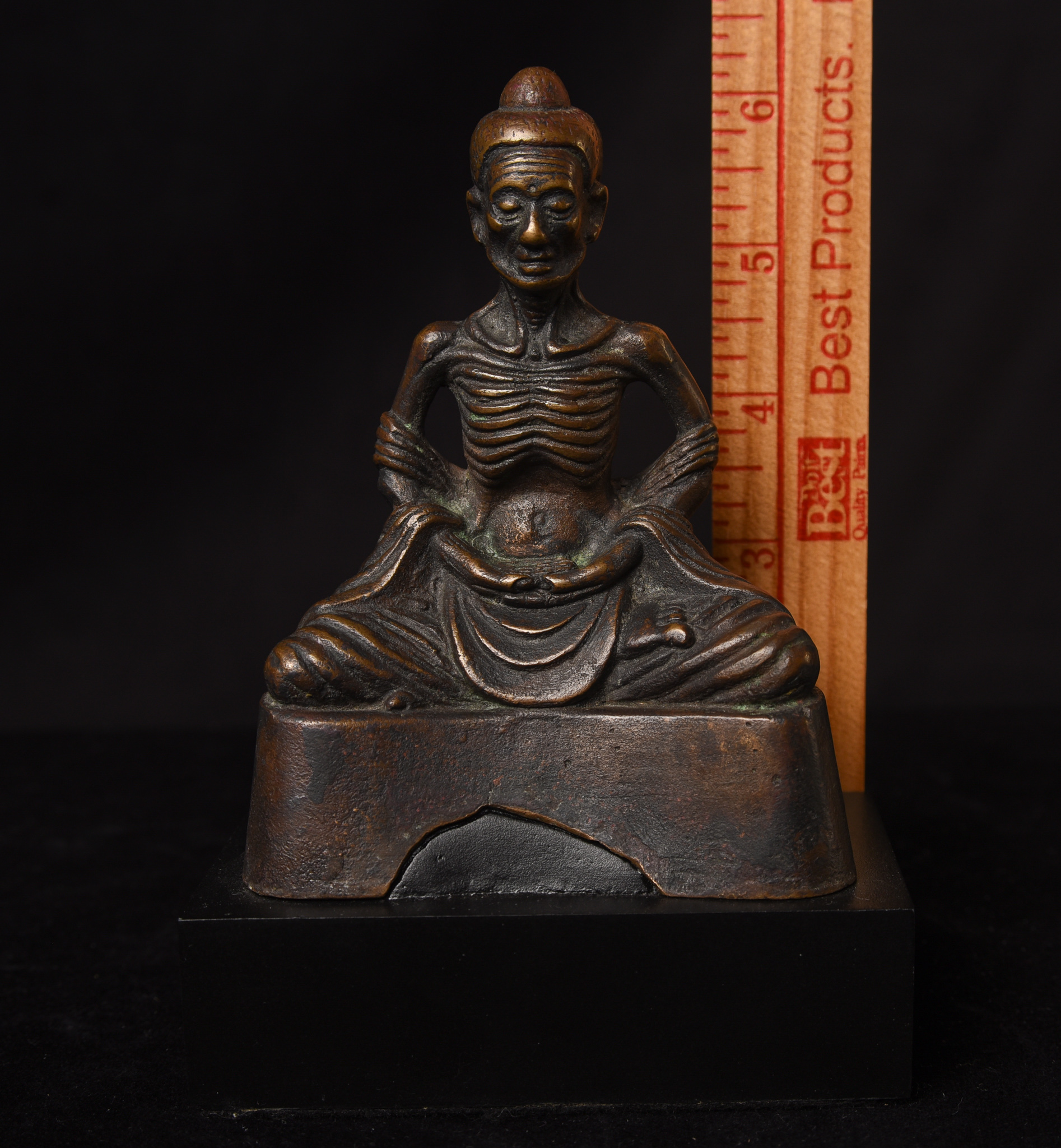 This is a remarkable ascetic Buddha from Thailand, from the late 19th century or earlier. Purchased from a respected San Francisco Bay area scholar in Indian bronzes who reported that it had previously been sold through Jonathan Tucker , London . If you search my website you will find a number of ascetic or starving buddhas that are related to this one, but none of them have the same joyous personality. Some of the others have the most intricate detail to their ribs and veins, but none show the overall balance and artistry that this one displays. It is supremely difficult to take such a challenging subject as the seven year fast of the Buddha and to represent it in a sculpture that encourages people to have thoughts and feelings related to the journey of the Buddha through this difficult time, while at the same time displaying a sculpture that makes them smile and feel better. Spend time gazing into his face and you will see what I mean. He is remarkably balanced and joyful for such a hungry fellow. H 6.25" (15.875cm)