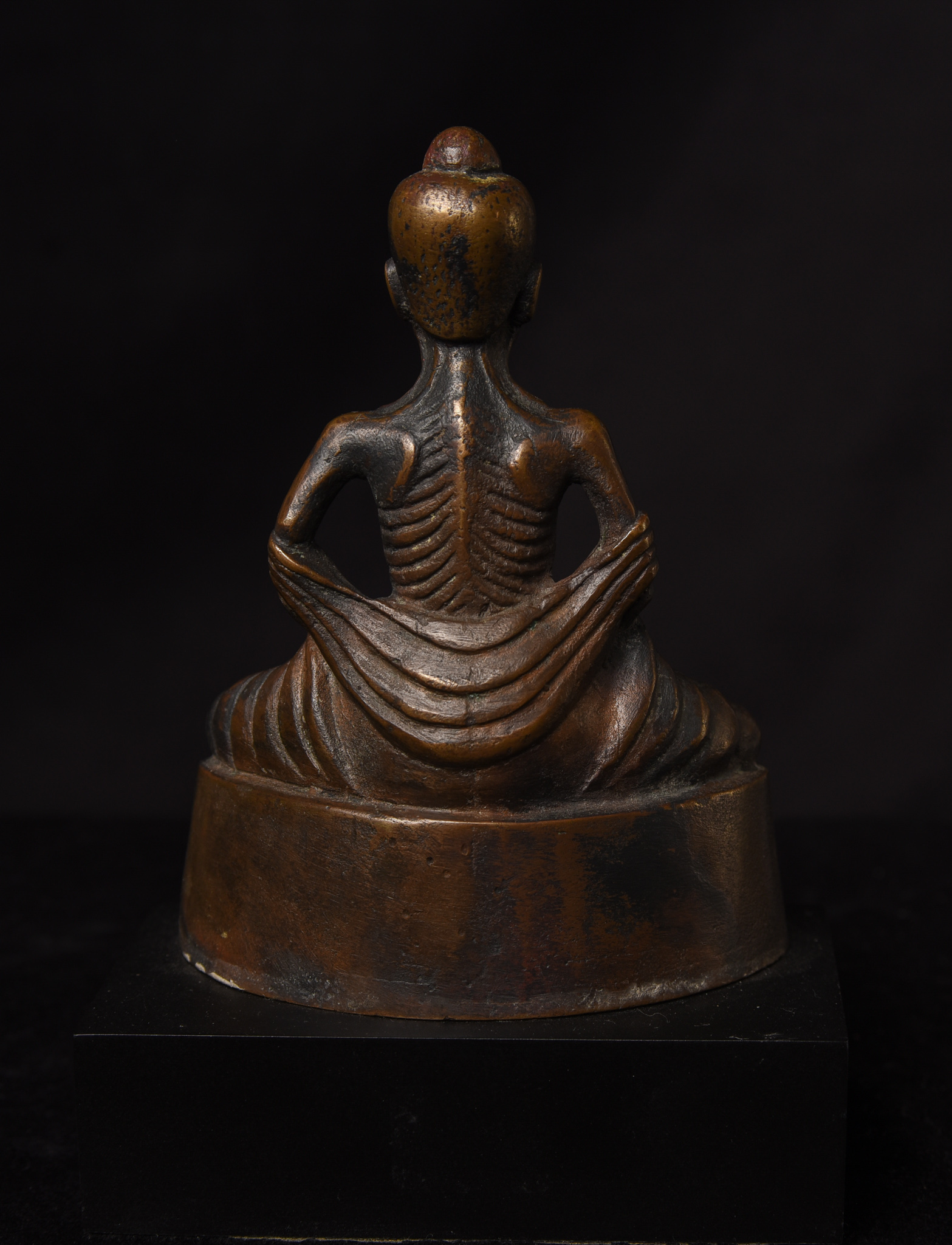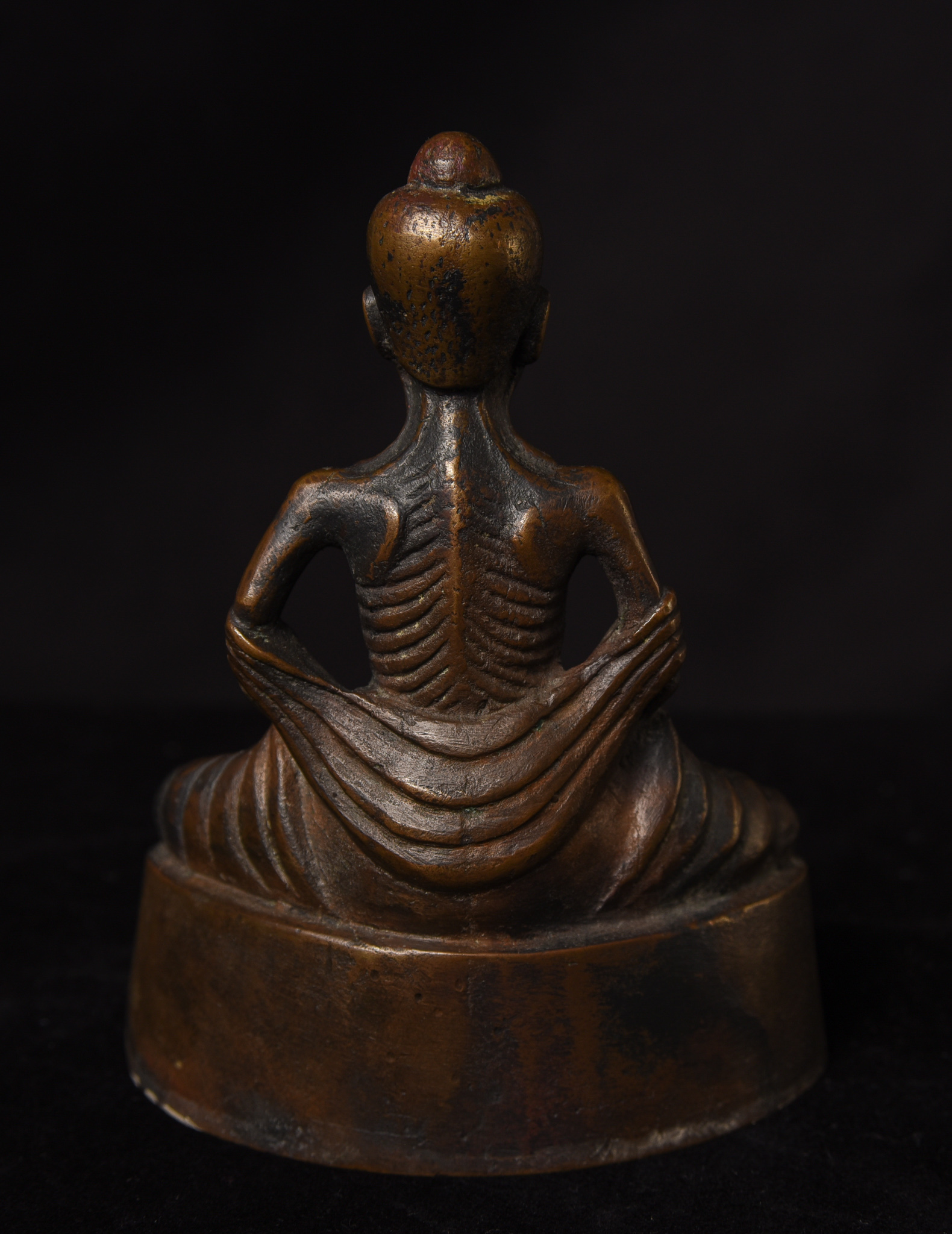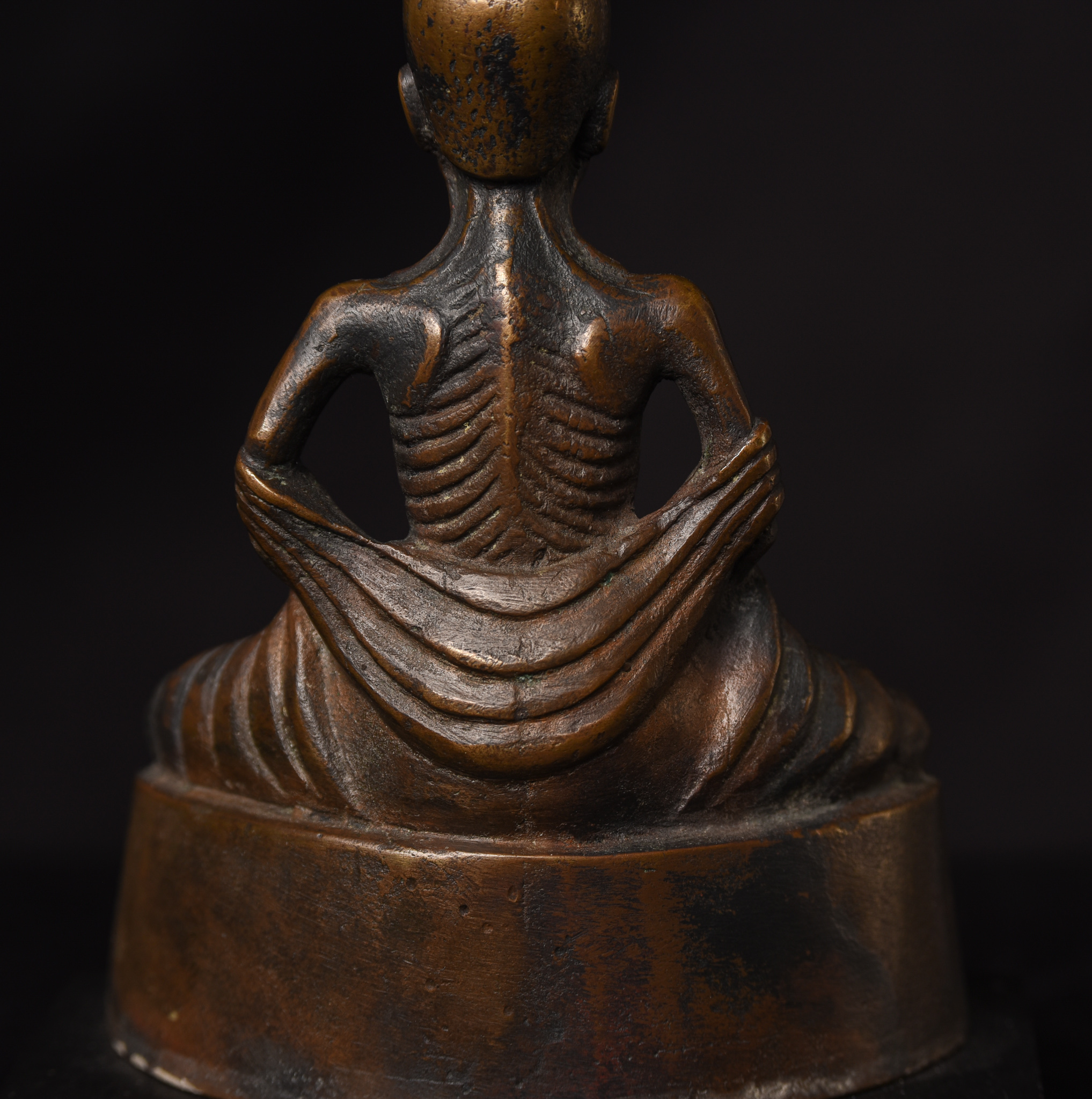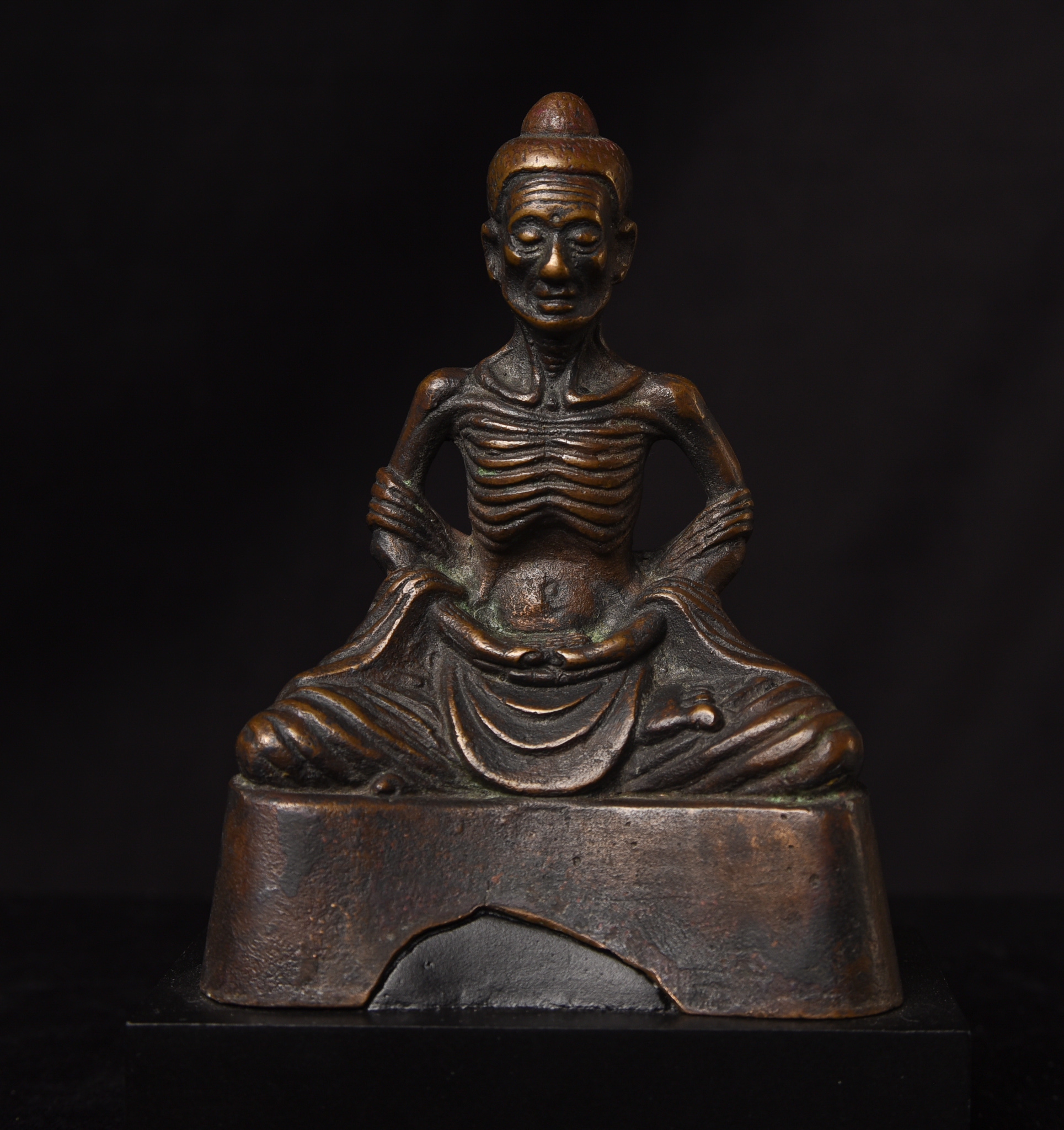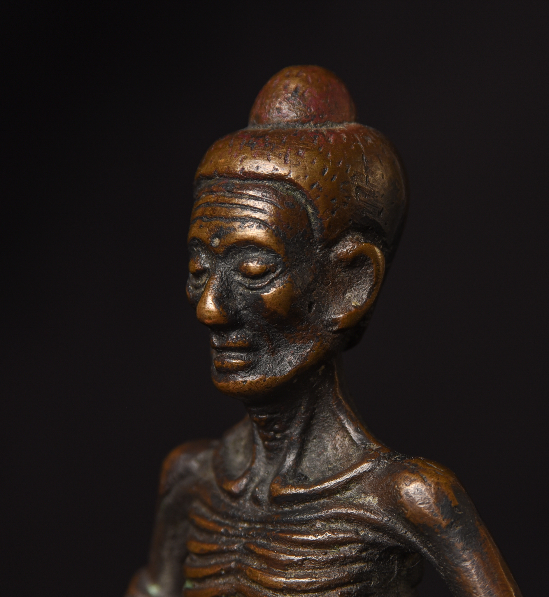 This is a remarkable ascetic Buddha from Thailand, from the late 19th century or earlier. Purchased from a respected San Francisco Bay area scholar in Indian bronzes who reported that it had previously been sold through Jonathan Tucker , London . If you search my website you will find a number of ascetic or starving buddhas that are related to this one, but none of them have the same joyous personality. Some of the others have the most intricate detail to their ribs and veins, but none show the overall balance and artistry that this one displays. It is supremely difficult to take such a challenging subject as the seven year fast of the Buddha and to represent it in a sculpture that encourages people to have thoughts and feelings related to the journey of the Buddha through this difficult time, while at the same time displaying a sculpture that makes them smile and feel better. Spend time gazing into his face and you will see what I mean. He is remarkably balanced and joyful for such a hungry fellow. H 6.25" (15.875cm)