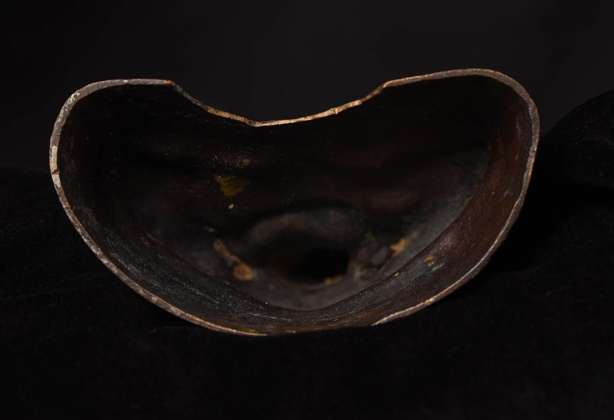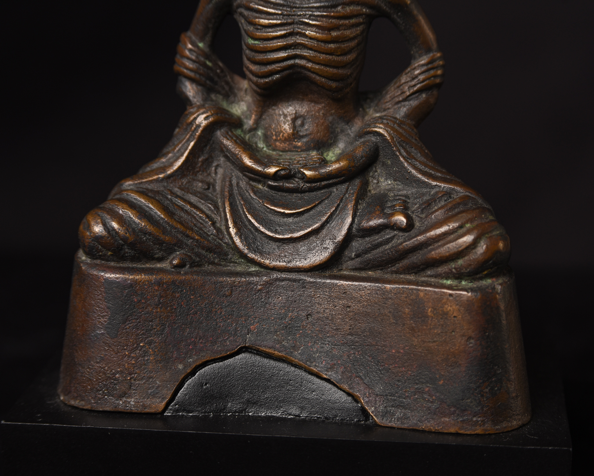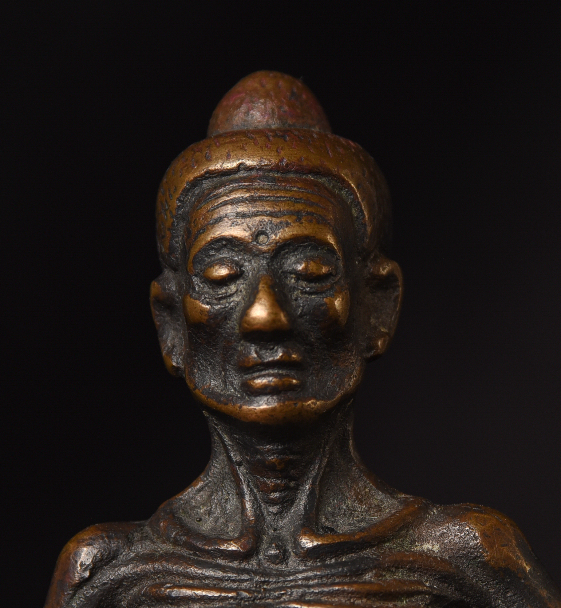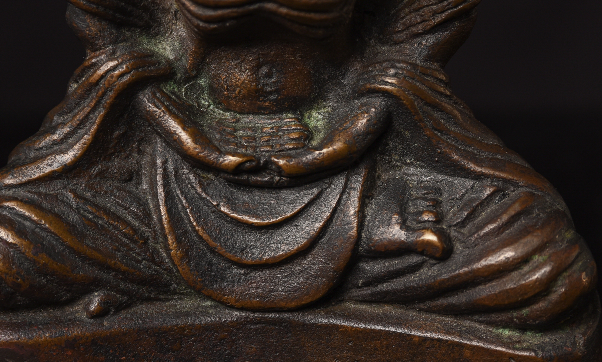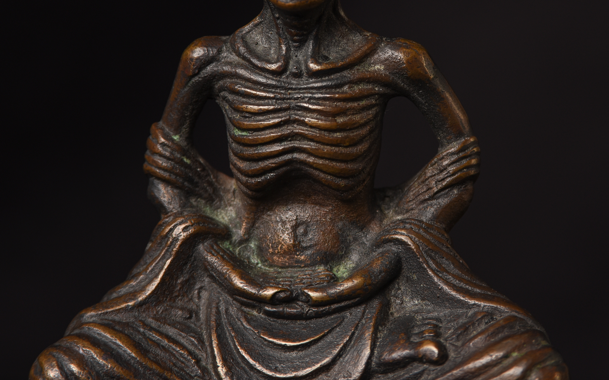 This is a remarkable ascetic Buddha from Thailand, from the late 19th century or earlier. Purchased from a respected San Francisco Bay area scholar in Indian bronzes who reported that it had previously been sold through Jonathan Tucker , London . If you search my website you will find a number of ascetic or starving buddhas that are related to this one, but none of them have the same joyous personality. Some of the others have the most intricate detail to their ribs and veins, but none show the overall balance and artistry that this one displays. It is supremely difficult to take such a challenging subject as the seven year fast of the Buddha and to represent it in a sculpture that encourages people to have thoughts and feelings related to the journey of the Buddha through this difficult time, while at the same time displaying a sculpture that makes them smile and feel better. Spend time gazing into his face and you will see what I mean. He is remarkably balanced and joyful for such a hungry fellow. H 6.25" (15.875cm)
