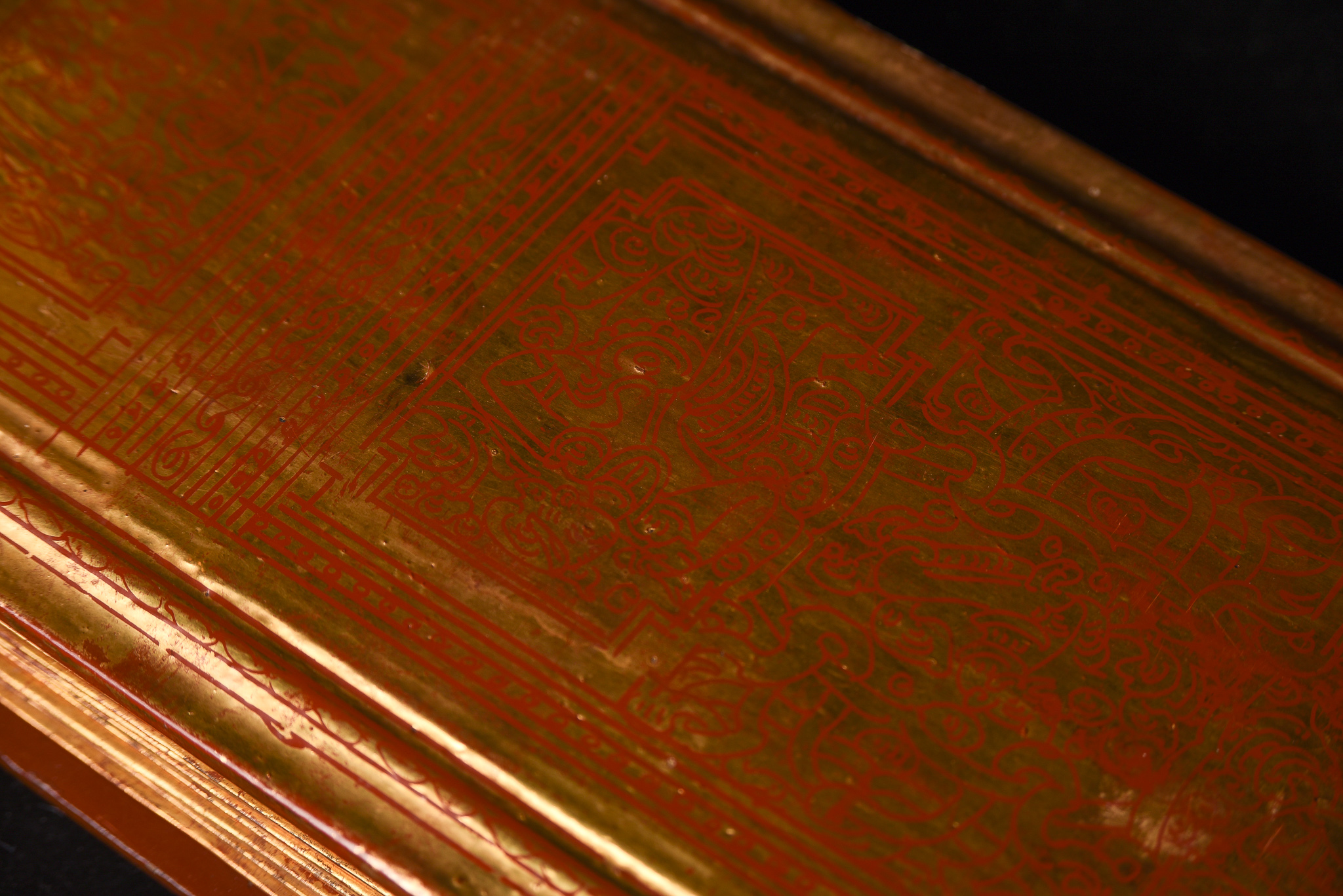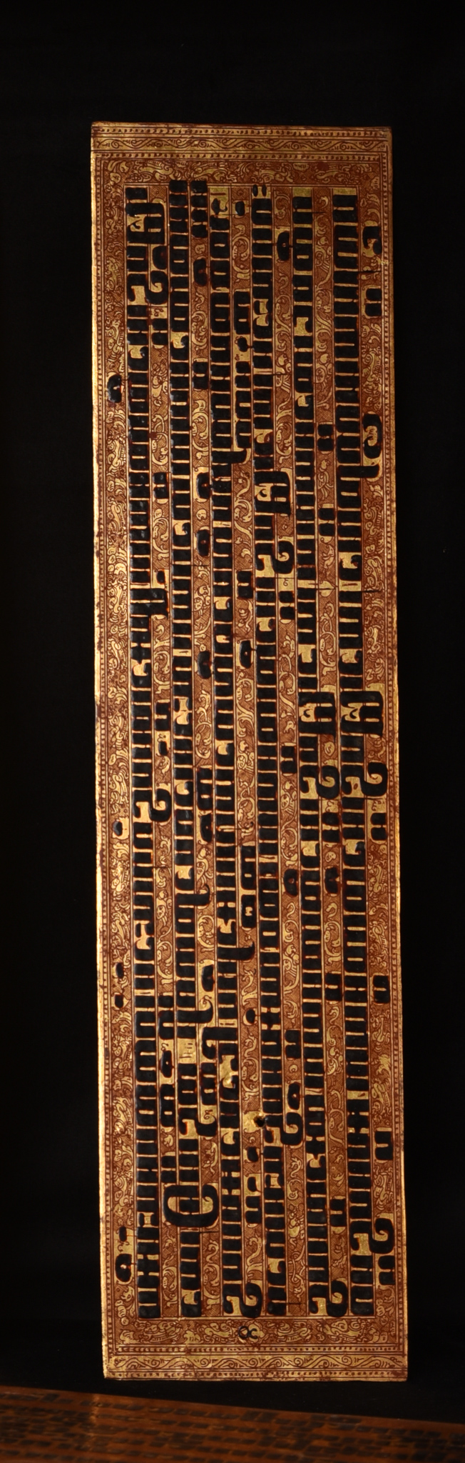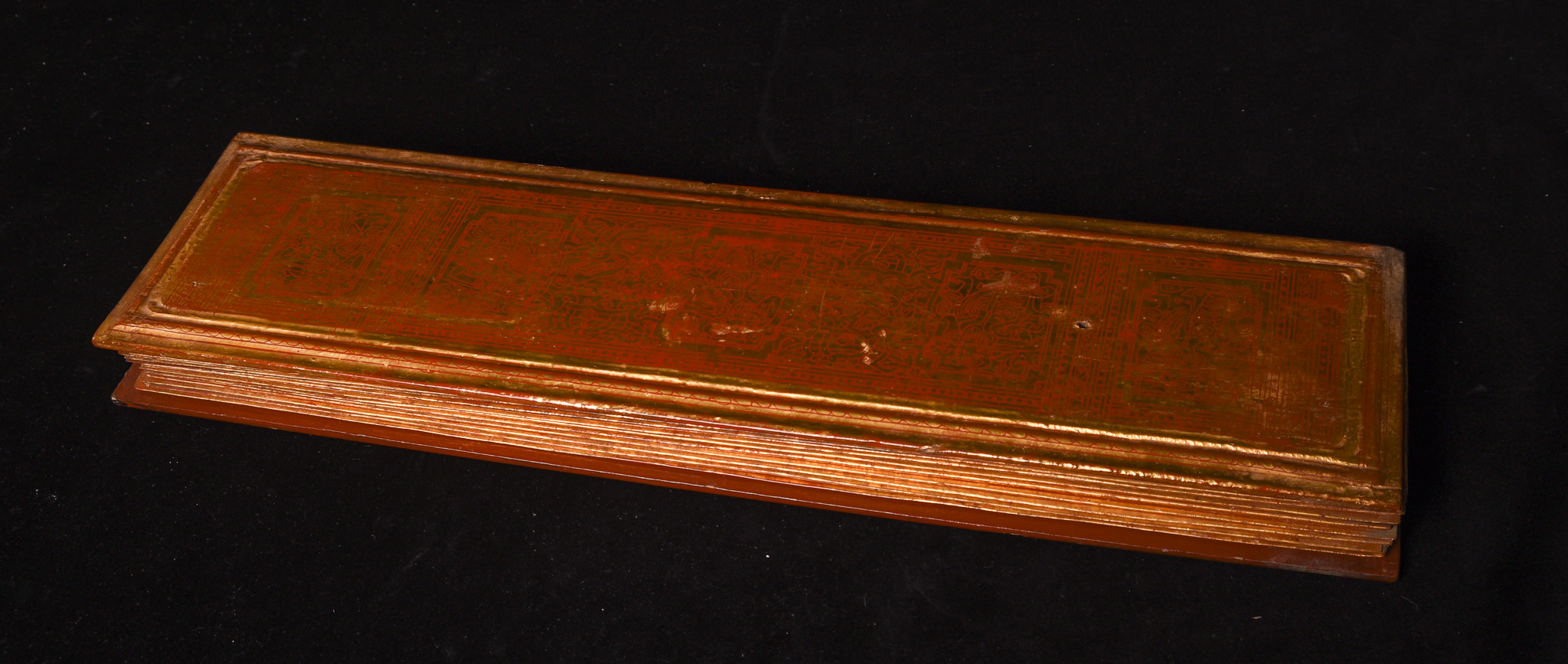 Beautiful old Burmese Bible- 23"x6" (58.42cm x 15.24cm) double sided pages plus covers. This type looks beautiful mounted and framed, which is why so many are broken up and sold that way. This leaves fewer and fewer complete sets on the market. Measures, ( 14 ) pages plus the 2 covers.