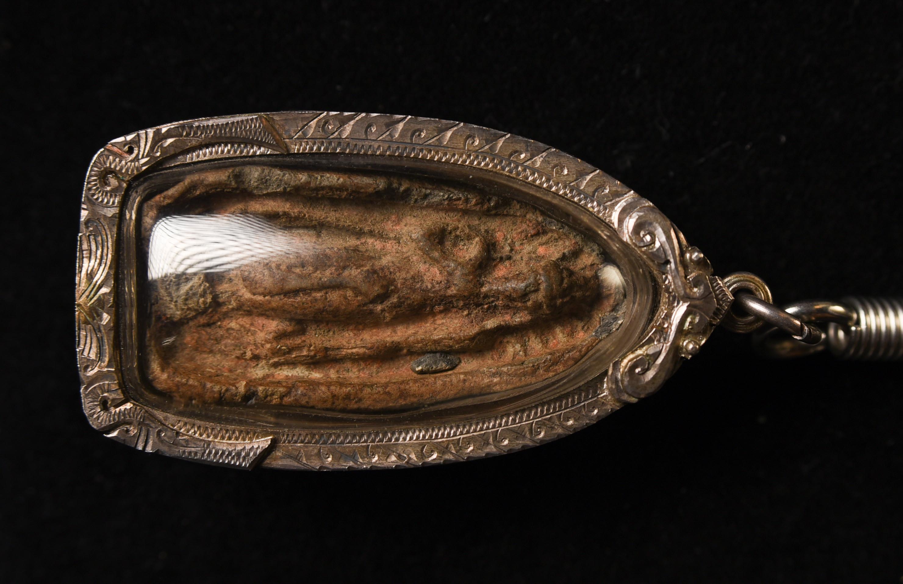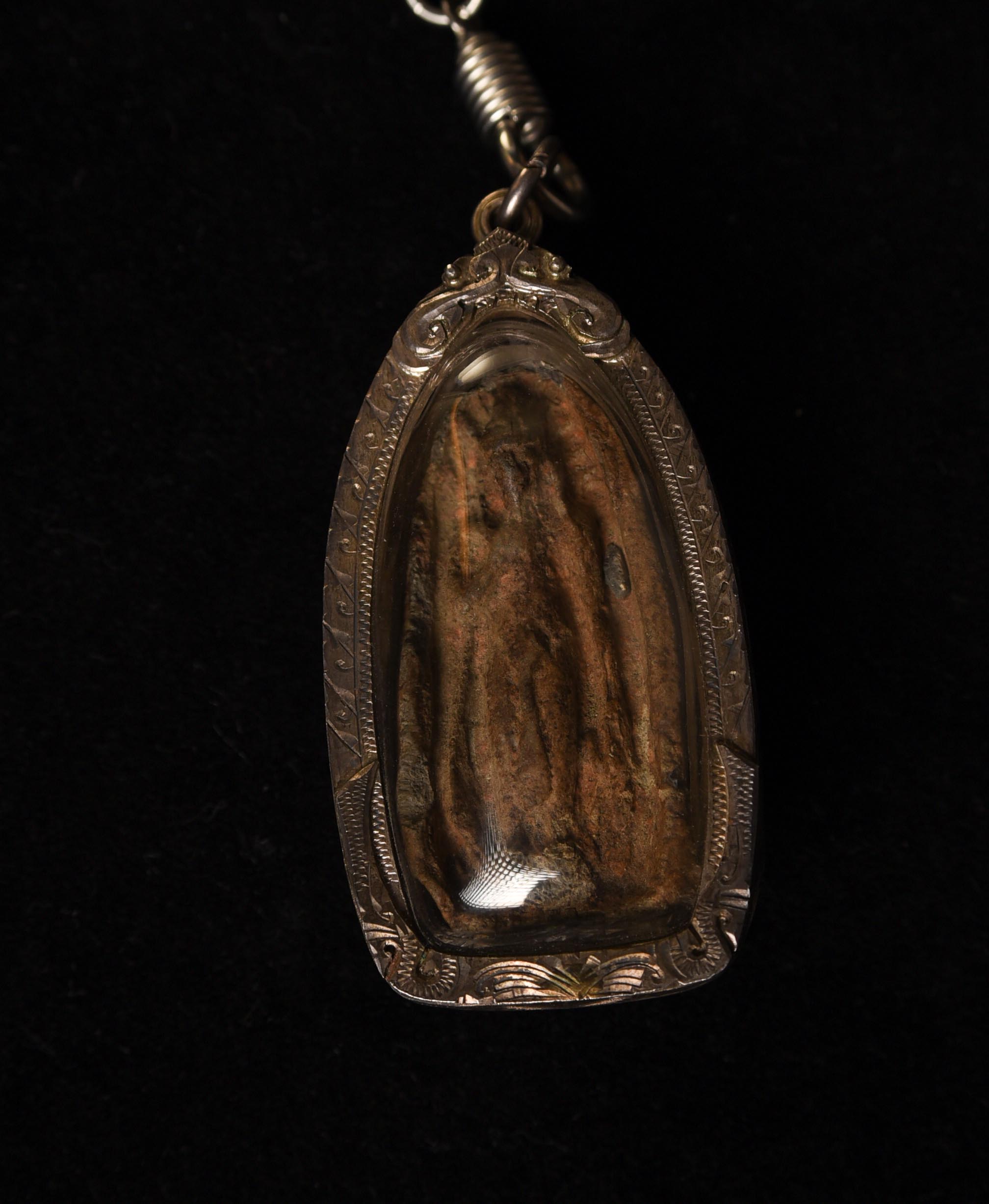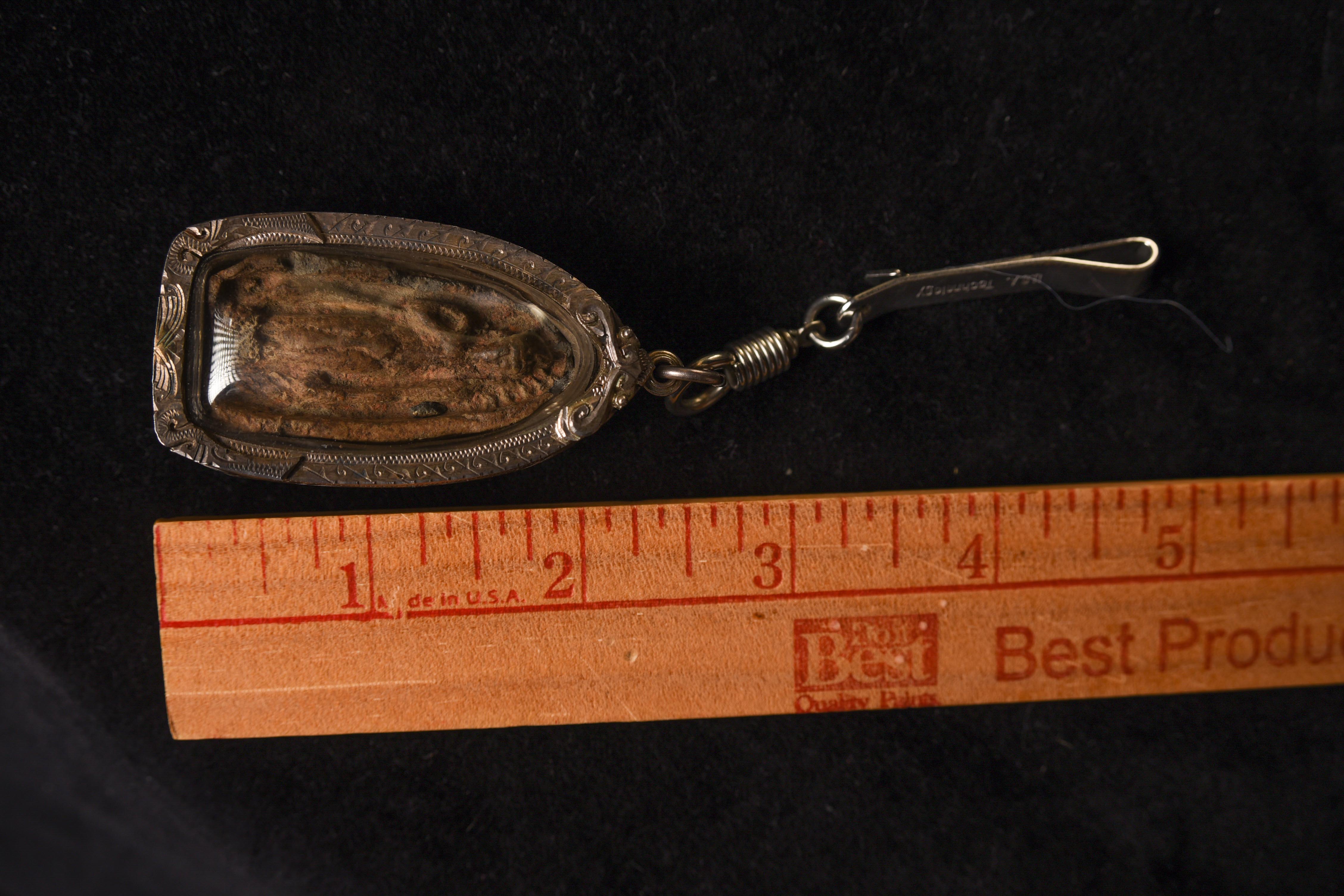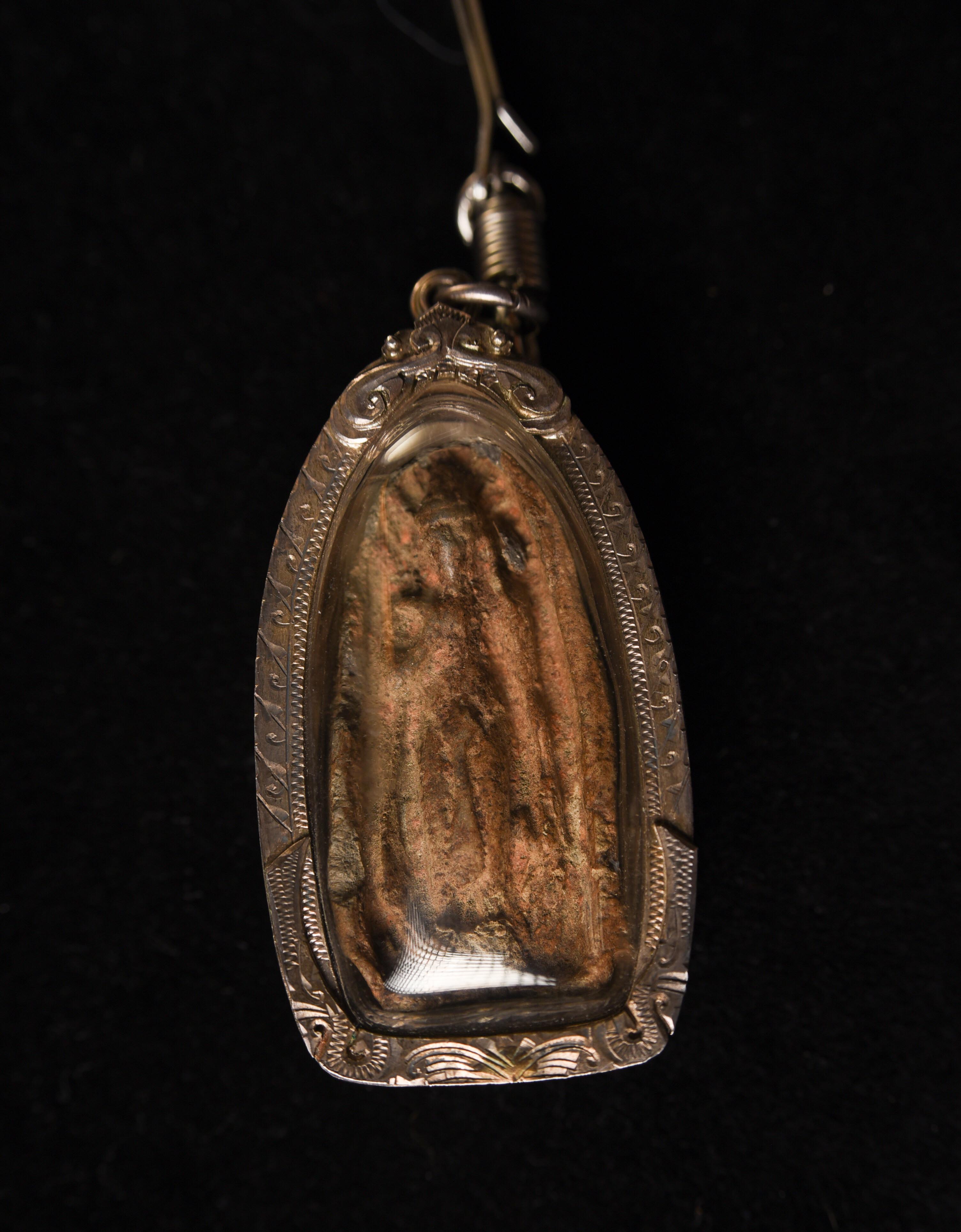 Thai Antique Clay Walking Buddha Amulet in a Sukhithai style. Looks to be a period (14-16thC) piece, but almost impossible to know the age, especially without destroying the case. I believe this to be an authentic antique example and not a repro.