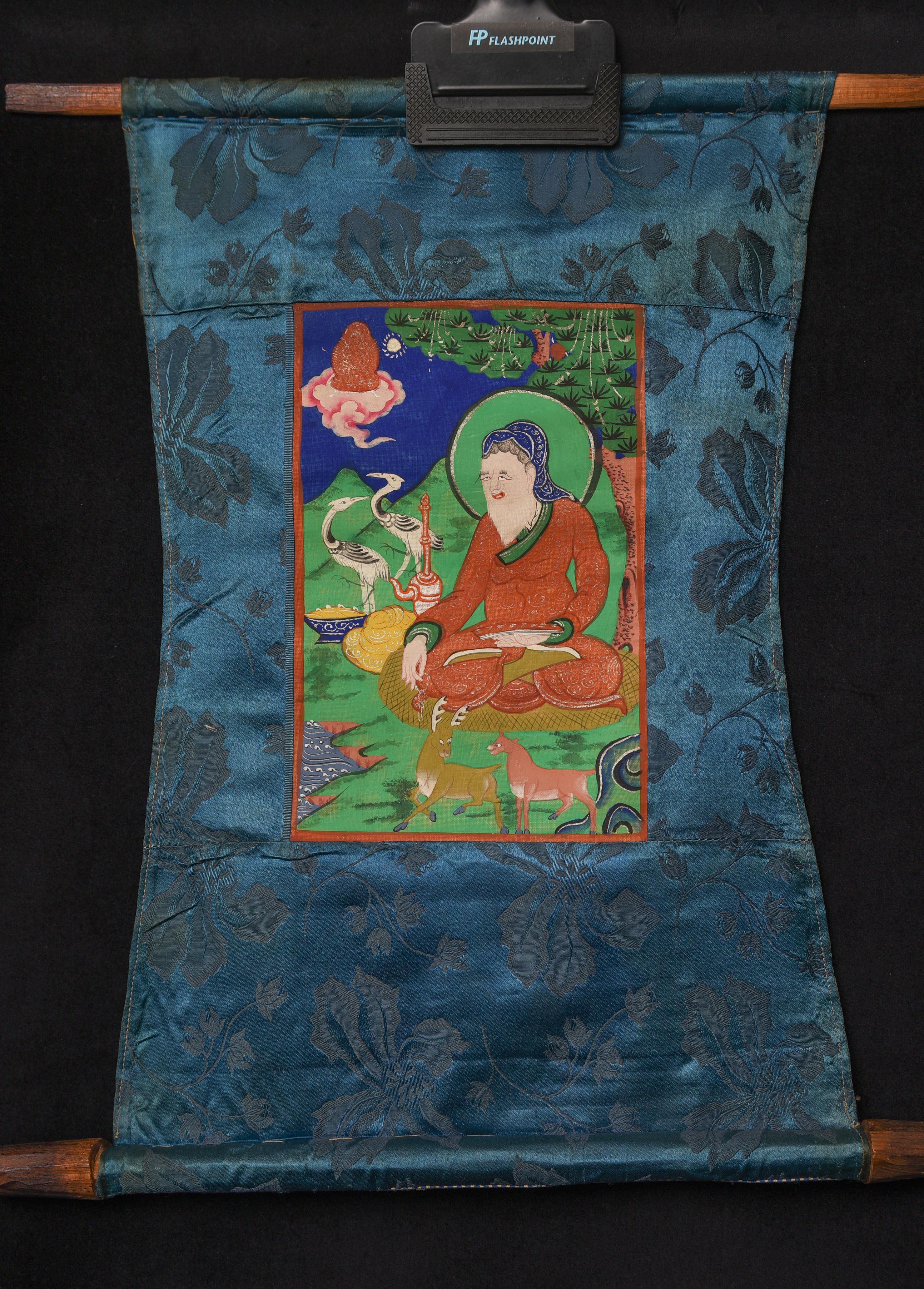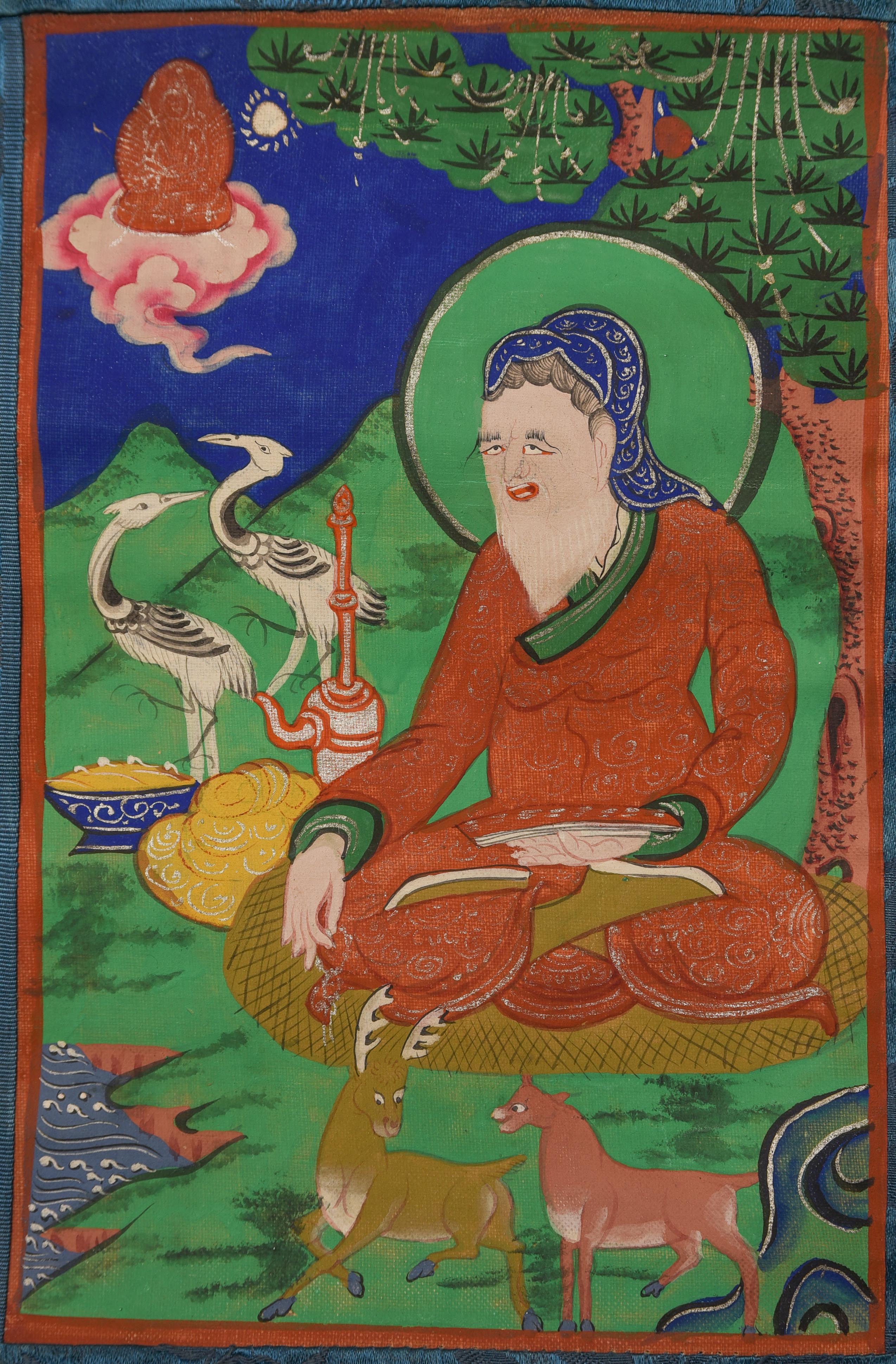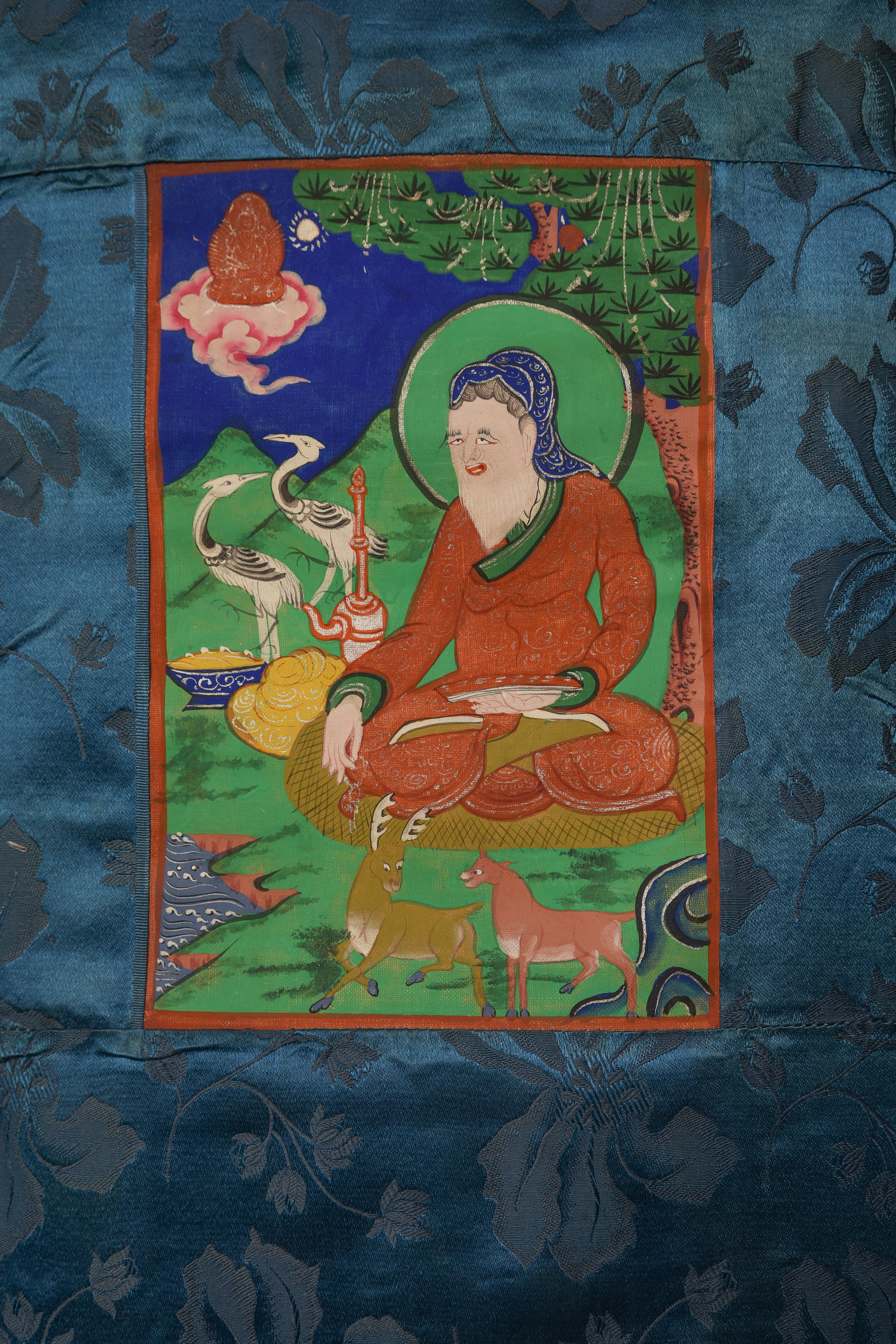 This classic 20th Century Mongolian thangka depicts a contemplative sage seated in a lush landscape alive with deer, cranes, flowing water, and mountain forms—an uncommon and captivating subject rendered in vibrant traditional pigments. The scene radiates warmth and serenity, framed by its original blue silk mounting with floral motifs. Purchased from a European collection, the work reflects the distinctive storytelling charm of Mongolian Buddhist art. The painted image measures 8 × 5 inches, while the full textile mount extends to 16 × 10 inches. A charming, collectible piece offered at a deep discount, ideal for both new and seasoned collectors.