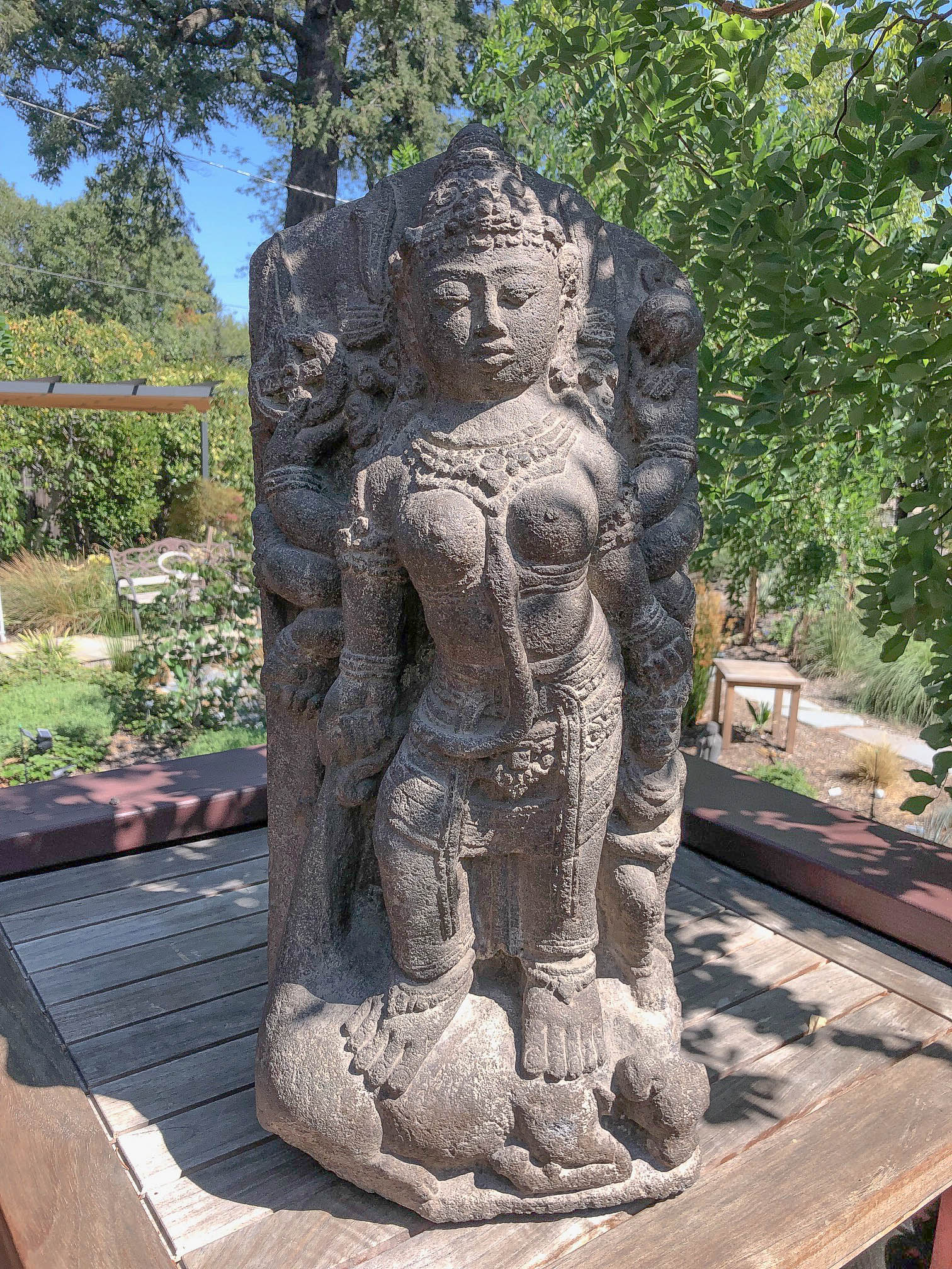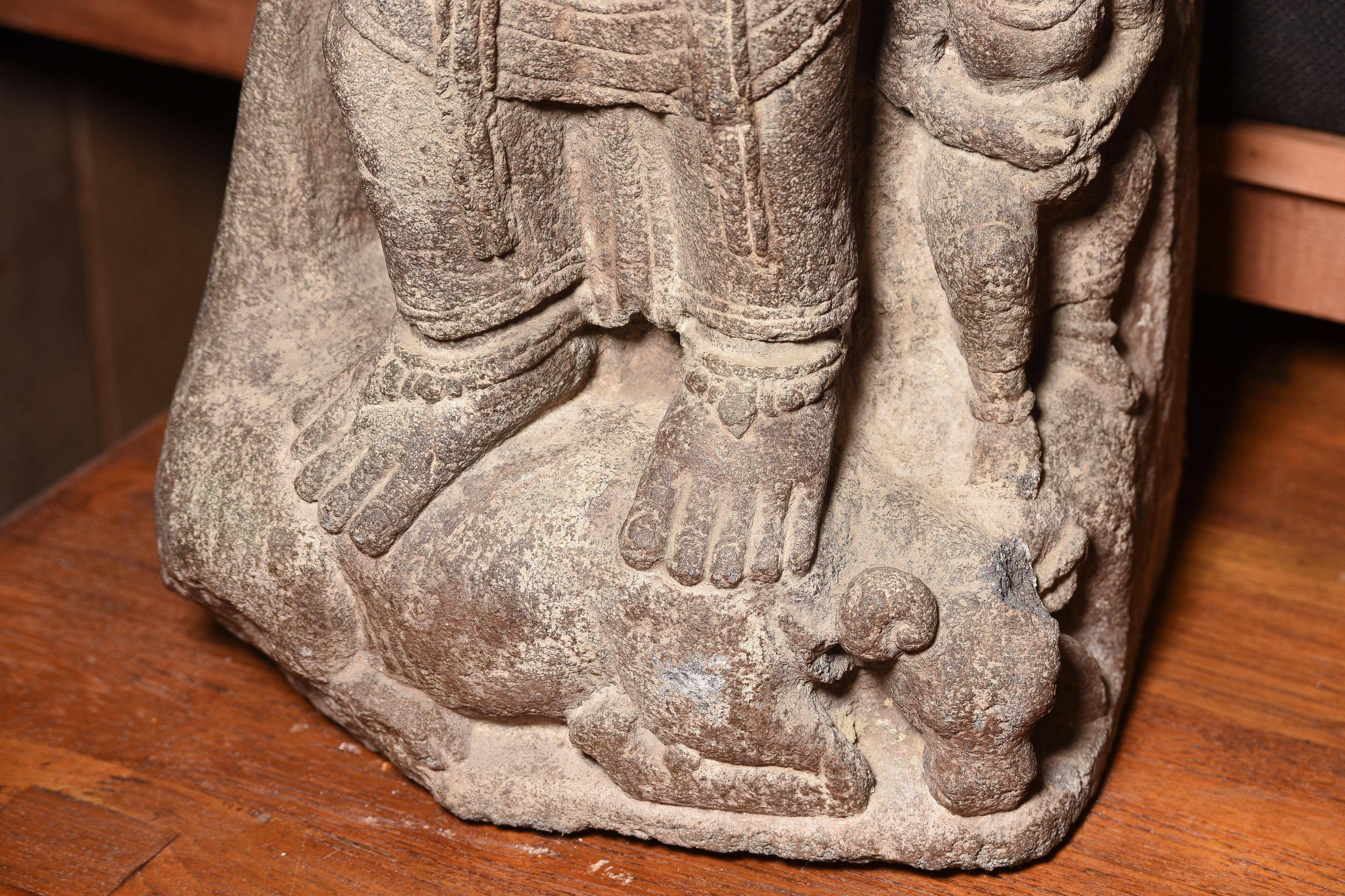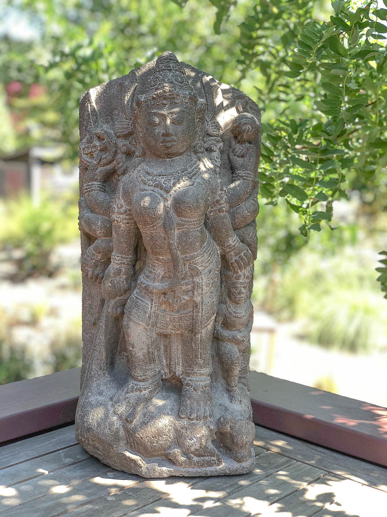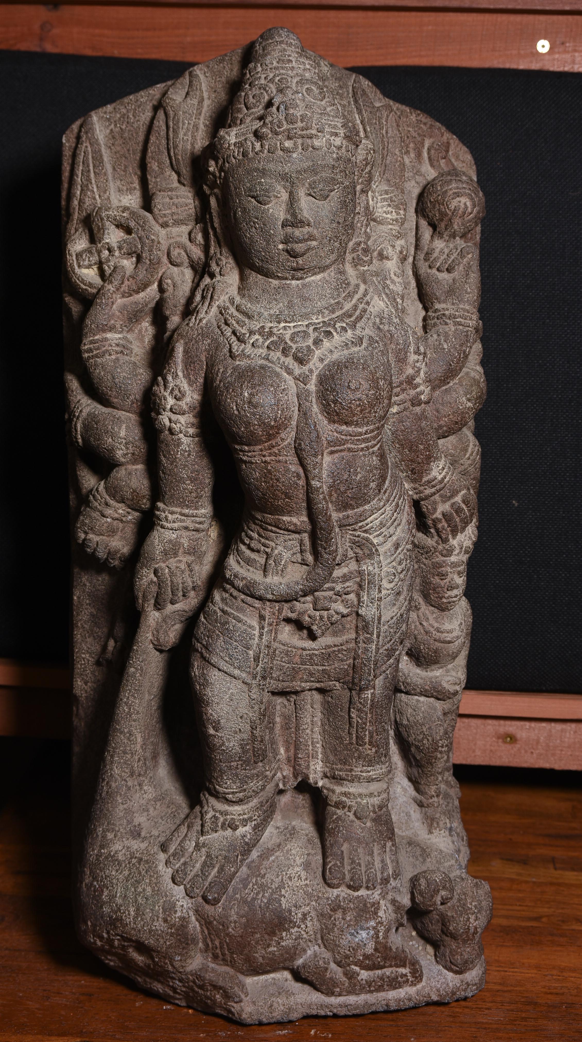 Masterpiece 9th century Stone Durga from Java. This sculpture is one of the finest I've had the pleasure of offering in over 30 years. The Deep spiritual presence is palpable in the face and overall stance of the Durga figure. the carving is classic. The patina is original and untouched. Impressive at approx. 100 pounds and with dimensions of H: 23"x W: 11". An all-time favorite that commands a central place on the main altar in my home gallery. Bull missing one otherwise near perfect for 1200 years old. This piece came to The Buddha Gallery many years ago from a South-African collection. ( H: 23"x W: 11"x D 7.5" )