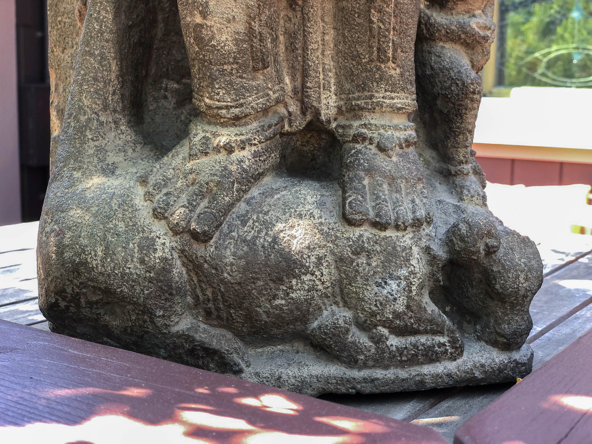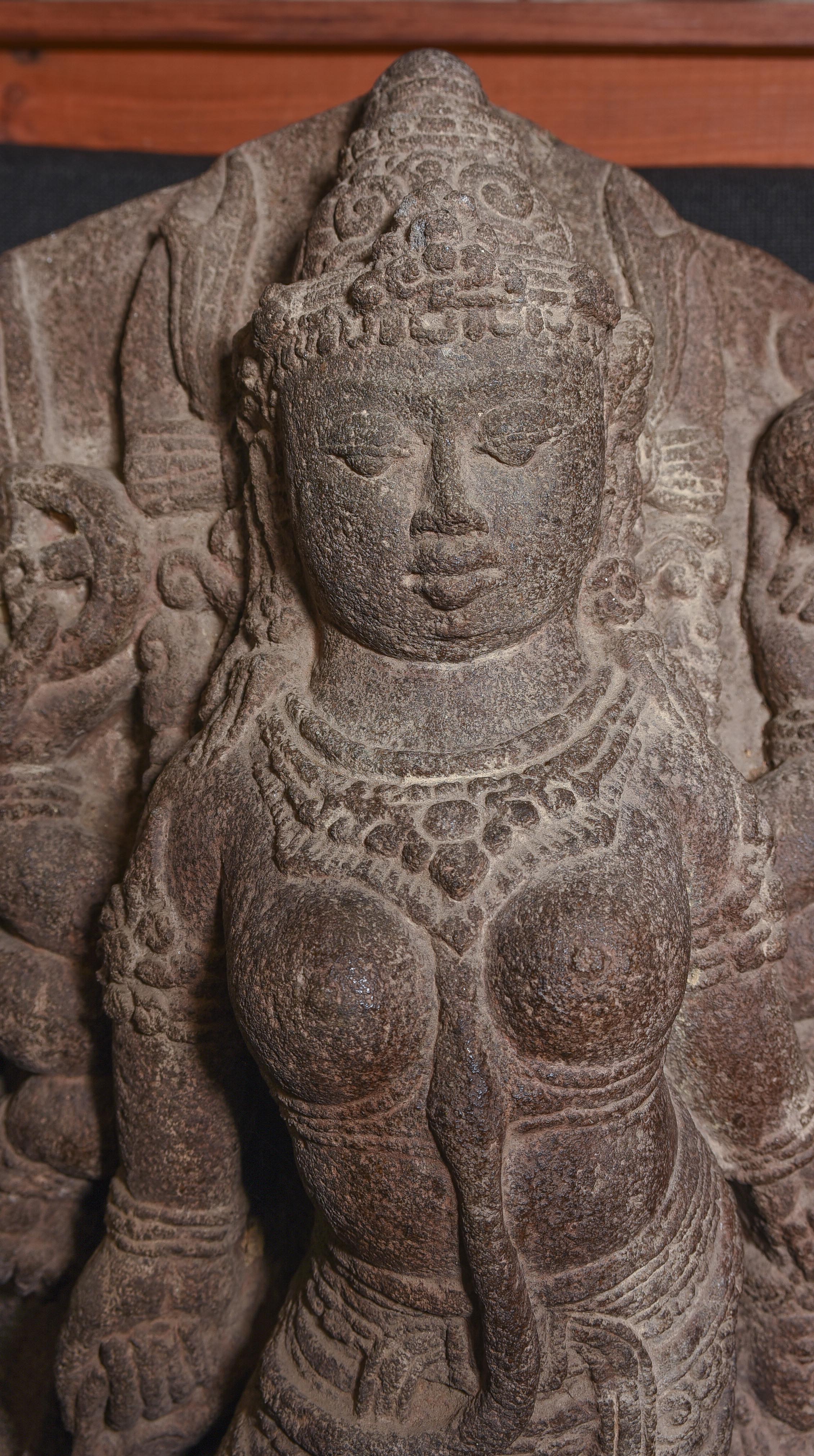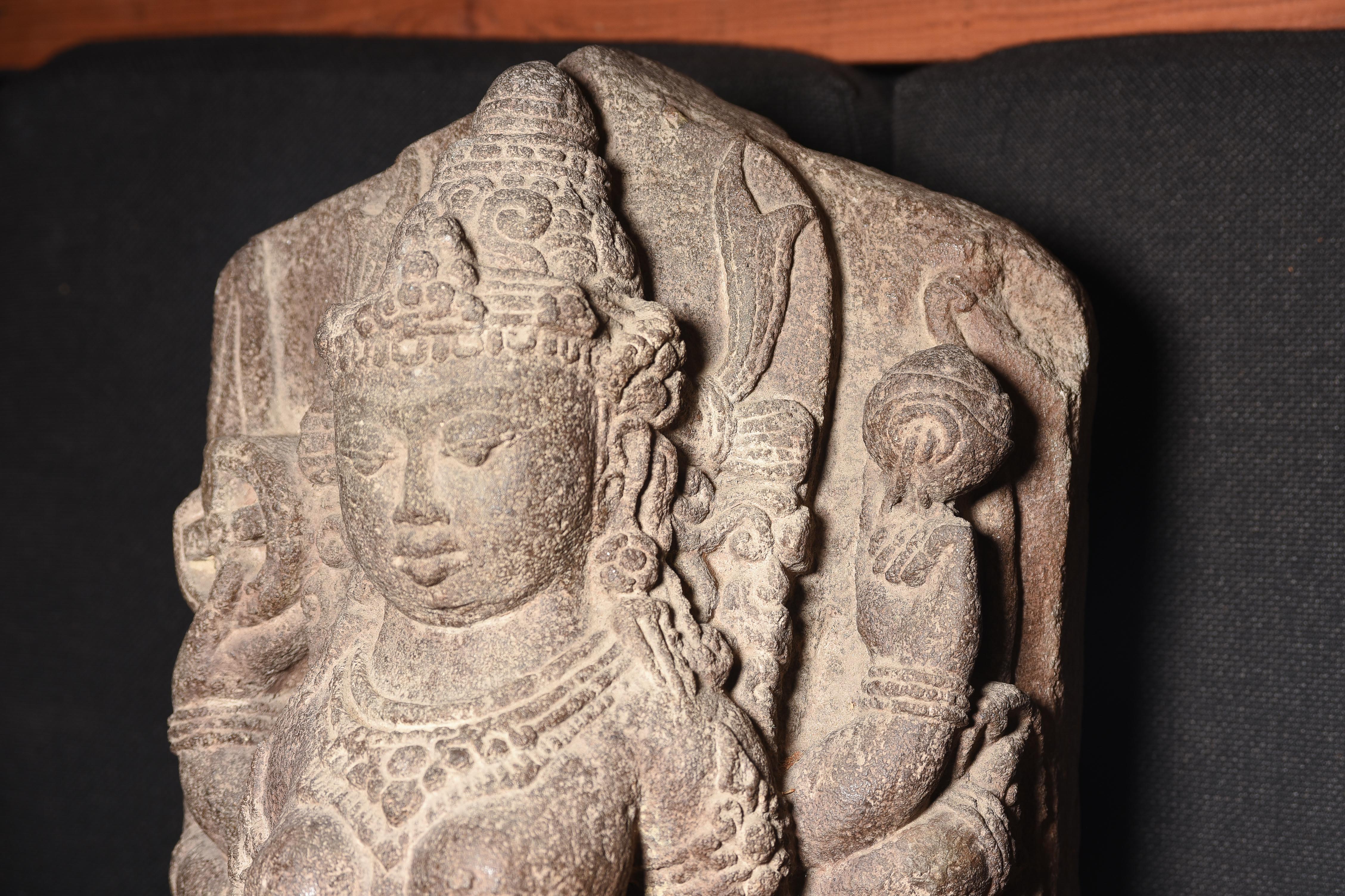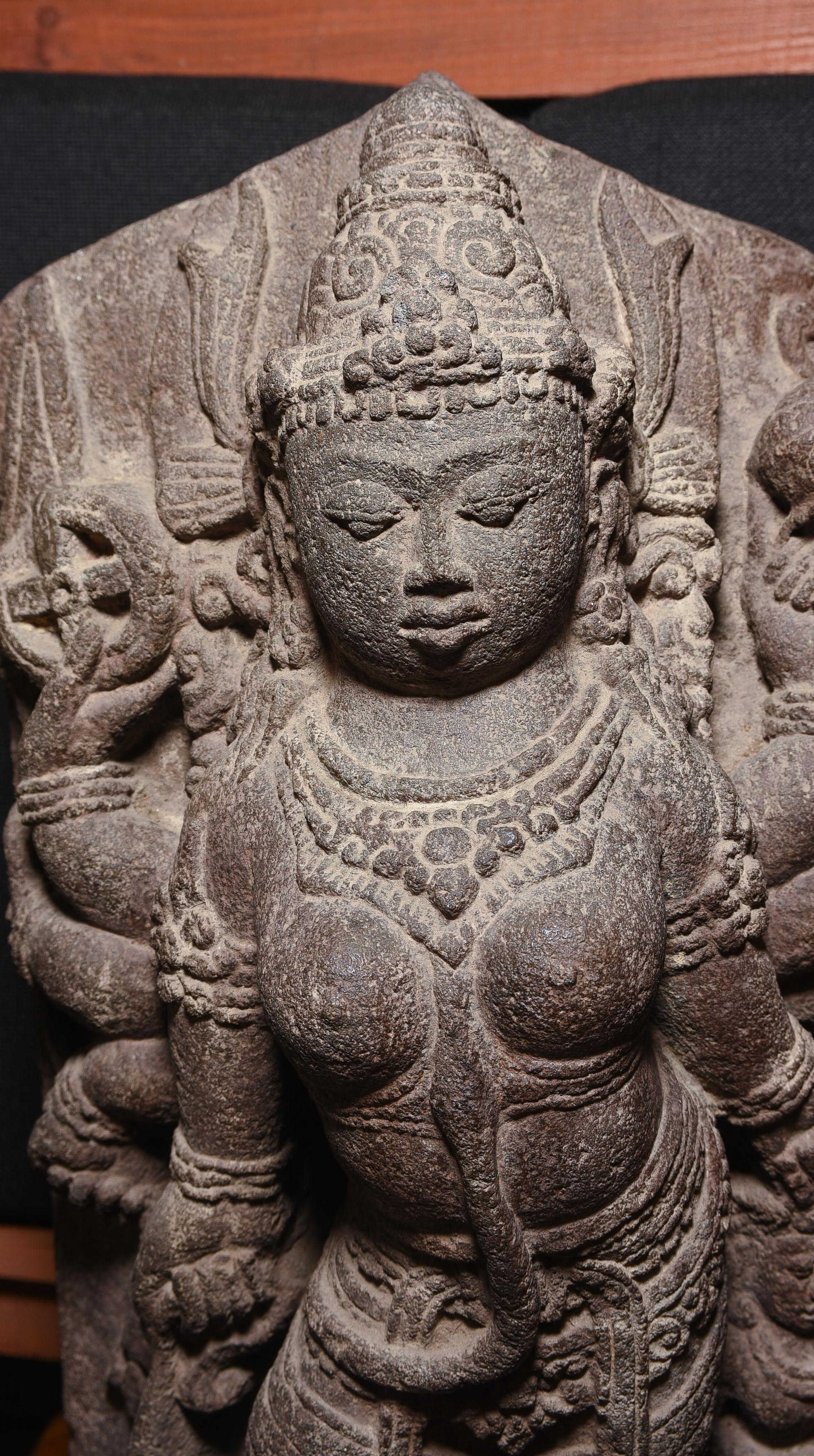 Masterpiece 9th century Stone Durga from Java. This sculpture is one of the finest I've had the pleasure of offering in over 30 years. The Deep spiritual presence is palpable in the face and overall stance of the Durga figure. the carving is classic. The patina is original and untouched. Impressive at approx. 100 pounds and with dimensions of H: 23"x W: 11". An all-time favorite that commands a central place on the main altar in my home gallery. Bull missing one otherwise near perfect for 1200 years old. This piece came to The Buddha Gallery many years ago from a South-African collection. ( H: 23"x W: 11"x D 7.5" )