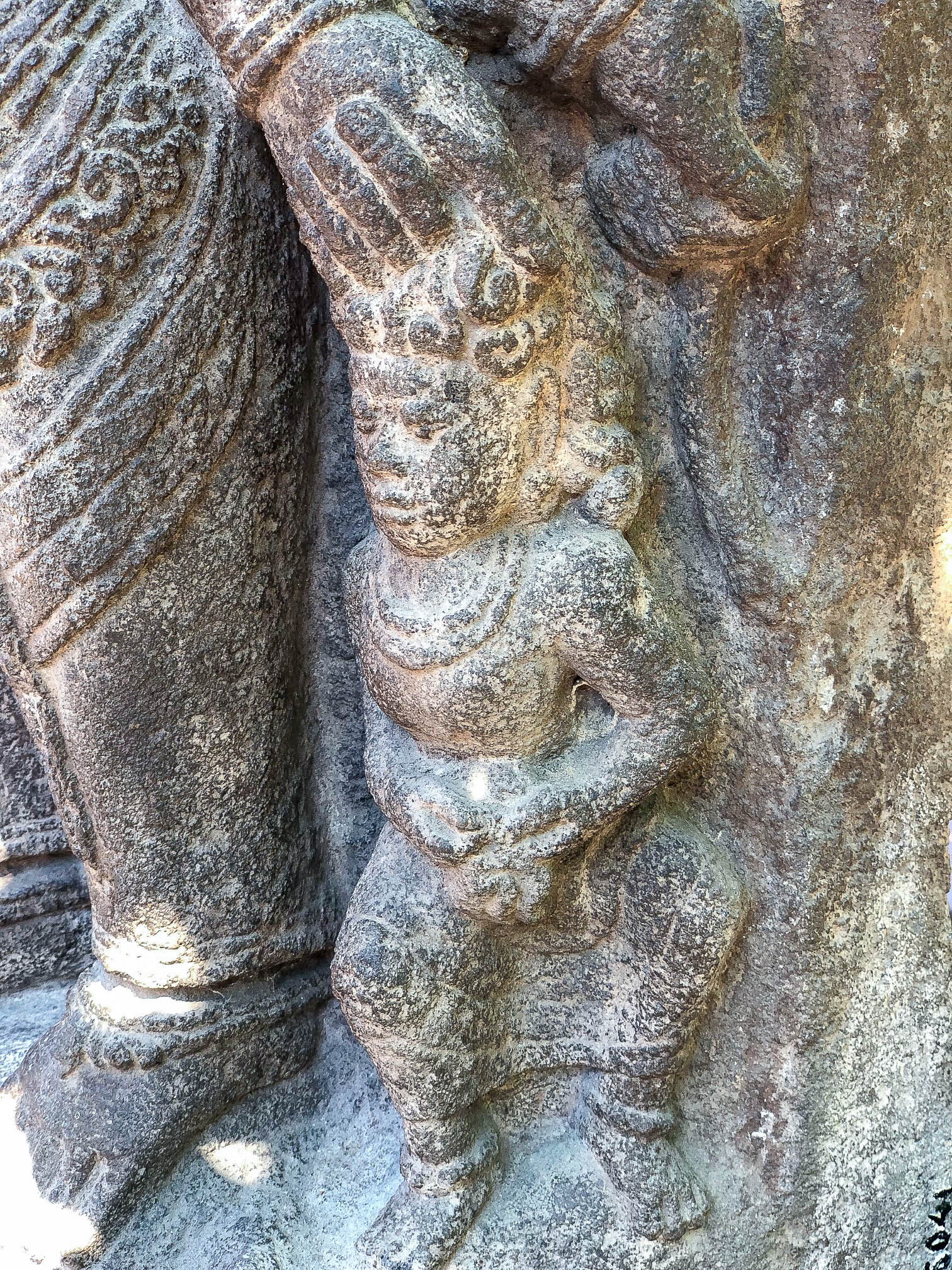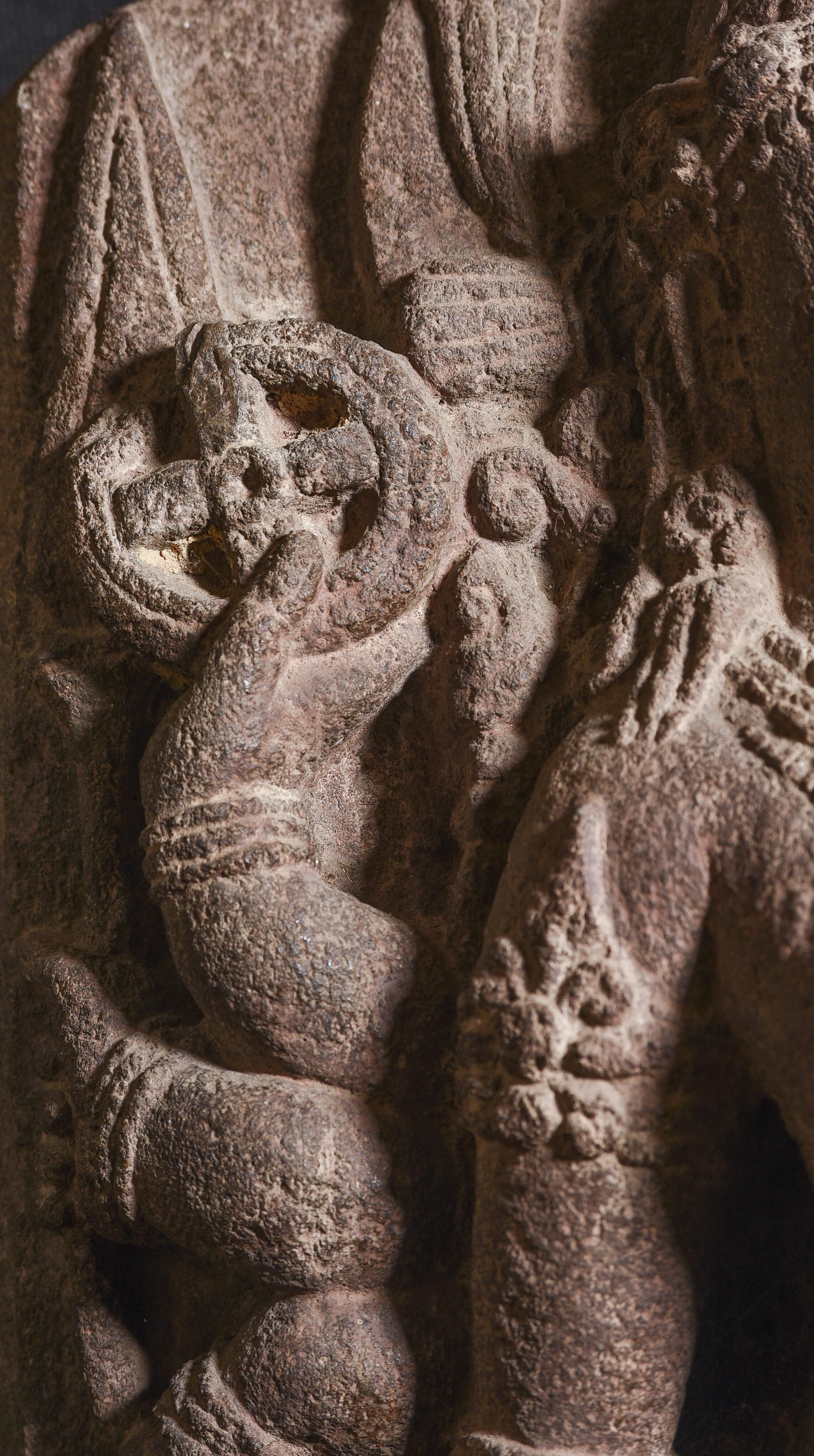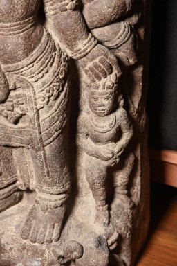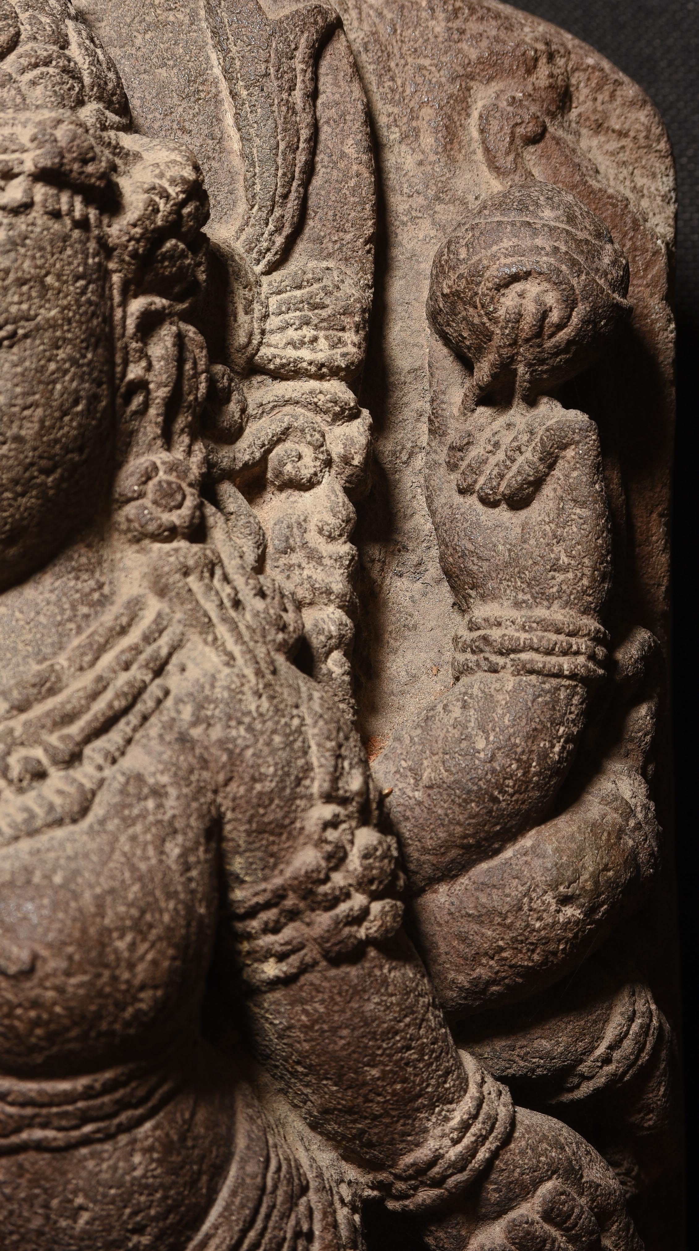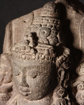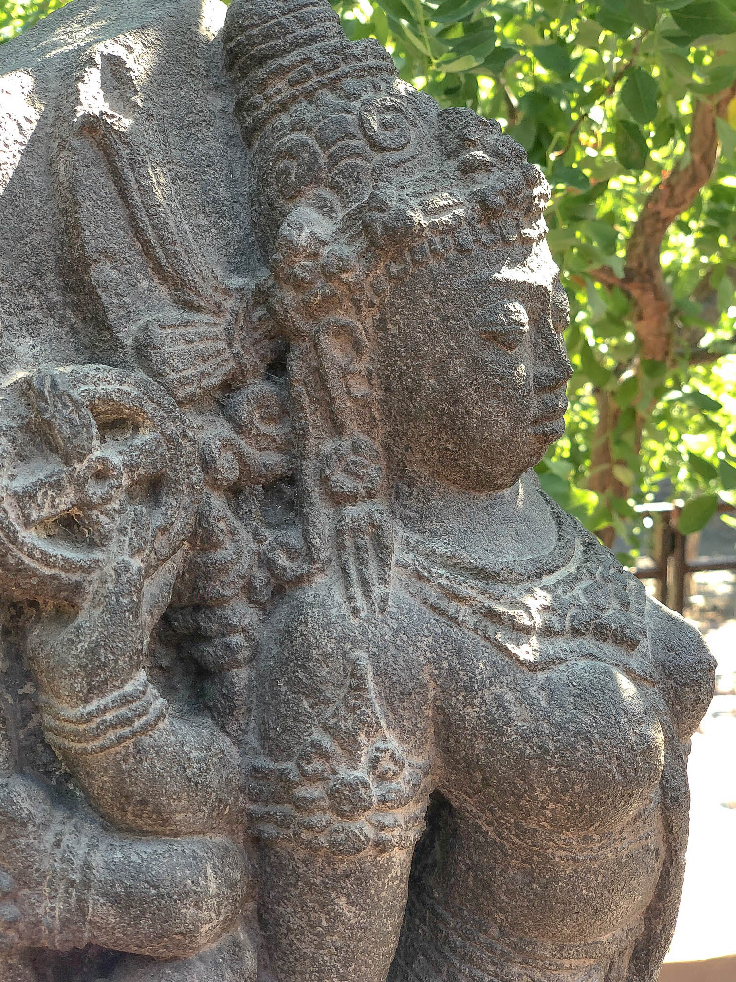 Masterpiece 9th century Stone Durga from Java. This sculpture is one of the finest I've had the pleasure of offering in over 30 years. The Deep spiritual presence is palpable in the face and overall stance of the Durga figure. the carving is classic. The patina is original and untouched. Impressive at approx. 100 pounds and with dimensions of H: 23"x W: 11". An all-time favorite that commands a central place on the main altar in my home gallery. Bull missing one otherwise near perfect for 1200 years old. This piece came to The Buddha Gallery many years ago from a South-African collection. ( H: 23"x W: 11"x D 7.5" )