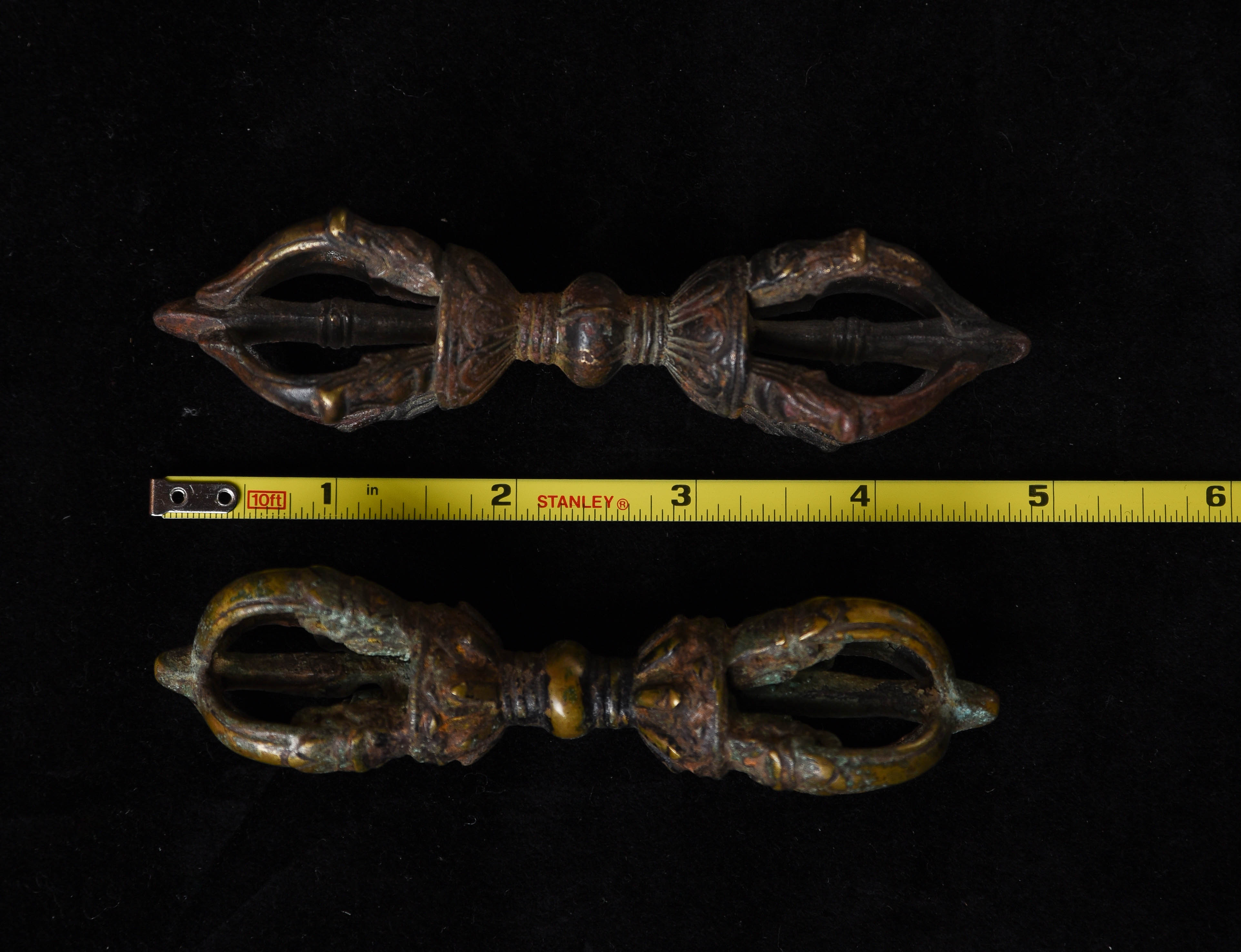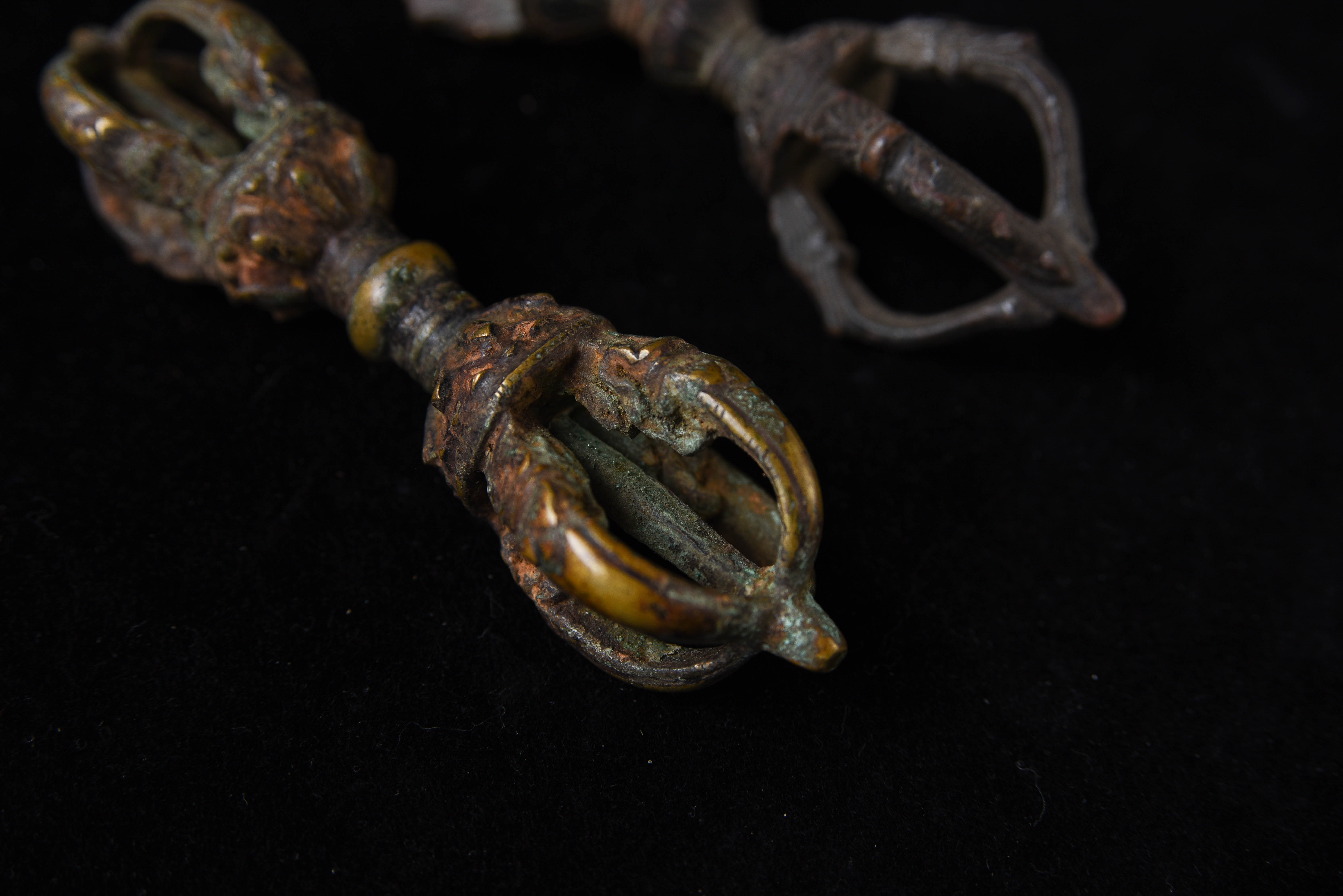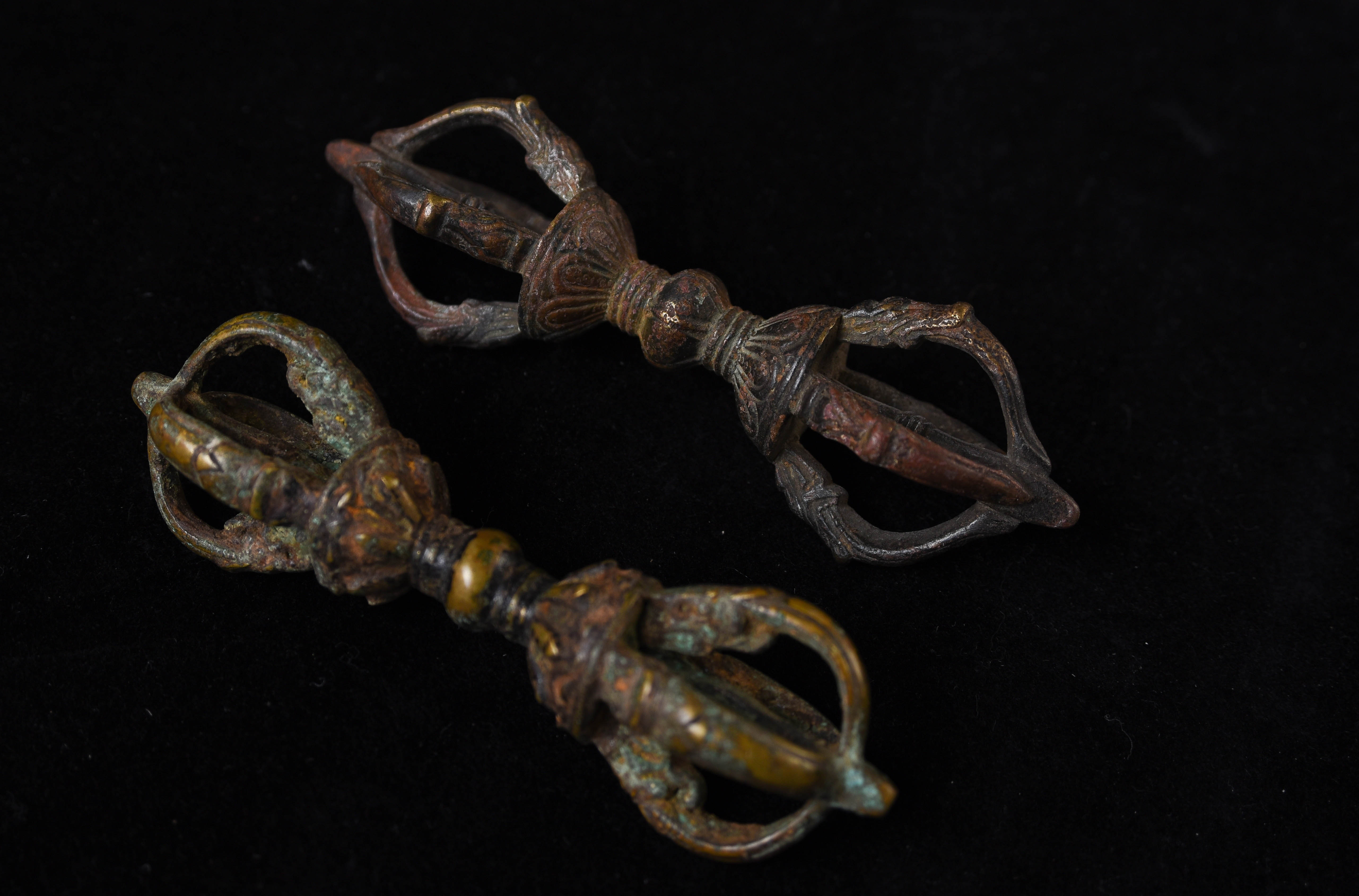 I recently found a box of Mongolian ritual implements that I collected in the 1990s when Mongolia was first opening up to the West after the fall of the Soviet Union. Most were made of different colored metals, and seemed to be from one local area in Mongolia. It was also a period when the internet was first beginning to be used by the general public to sell antique items directly between different countries, as PayPal and eBay we're just beginning to become the powerhouses that they are today. I was able to collect more than 30 Dorjes, Vadras, Bells, and other ritual implements made of bronze, brass, and other metals. There were a few classic style dorjes and Vadras in the group, including these two. While purchased out of Mongolia, maybe Tibetan or Mongolian. This auction is for 2 Tibetan or Mongolian ritual thunderbolts that are made of 3 different metals. They are classic type and are 19th or 20th centuries. This auction is for both.