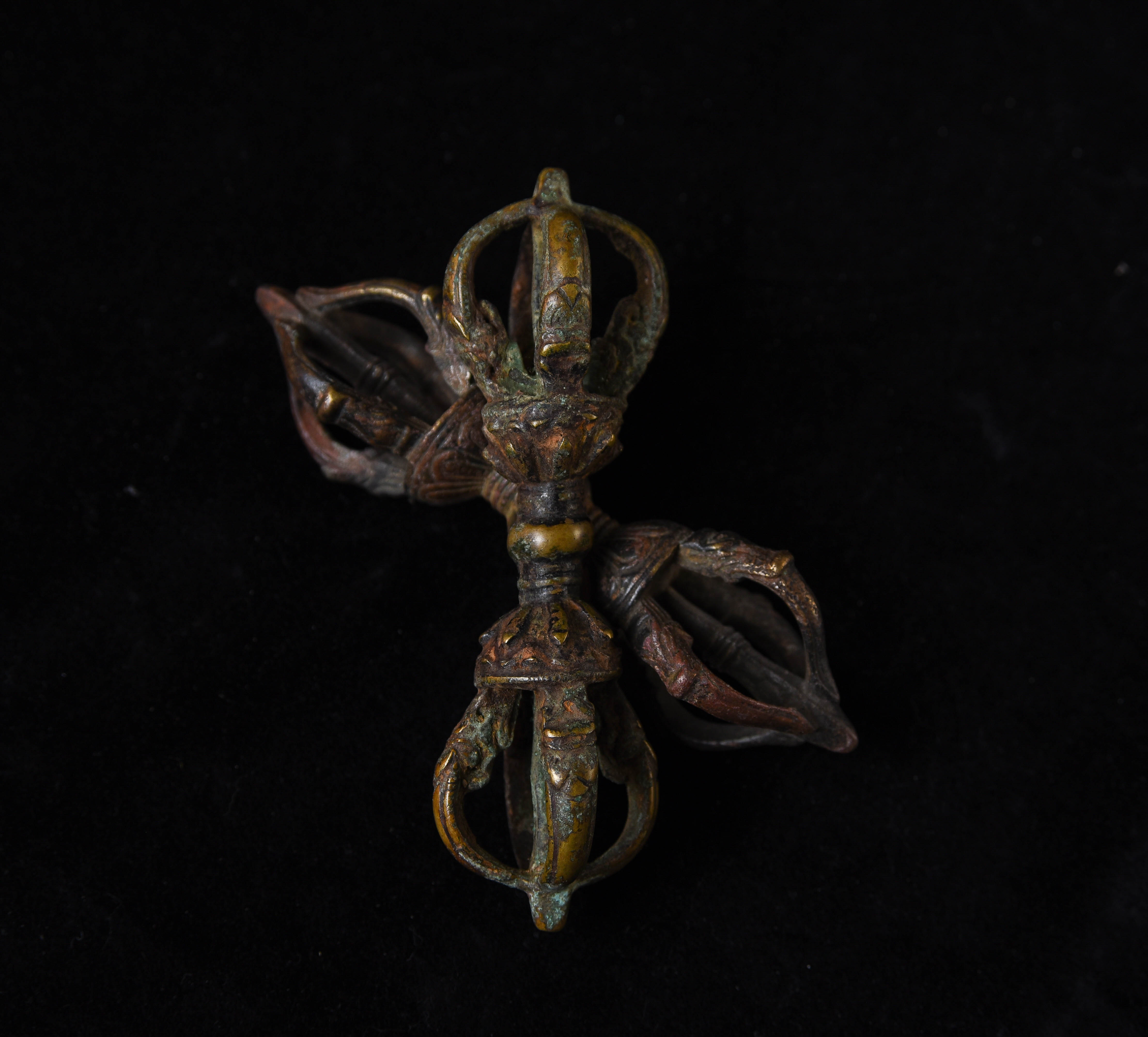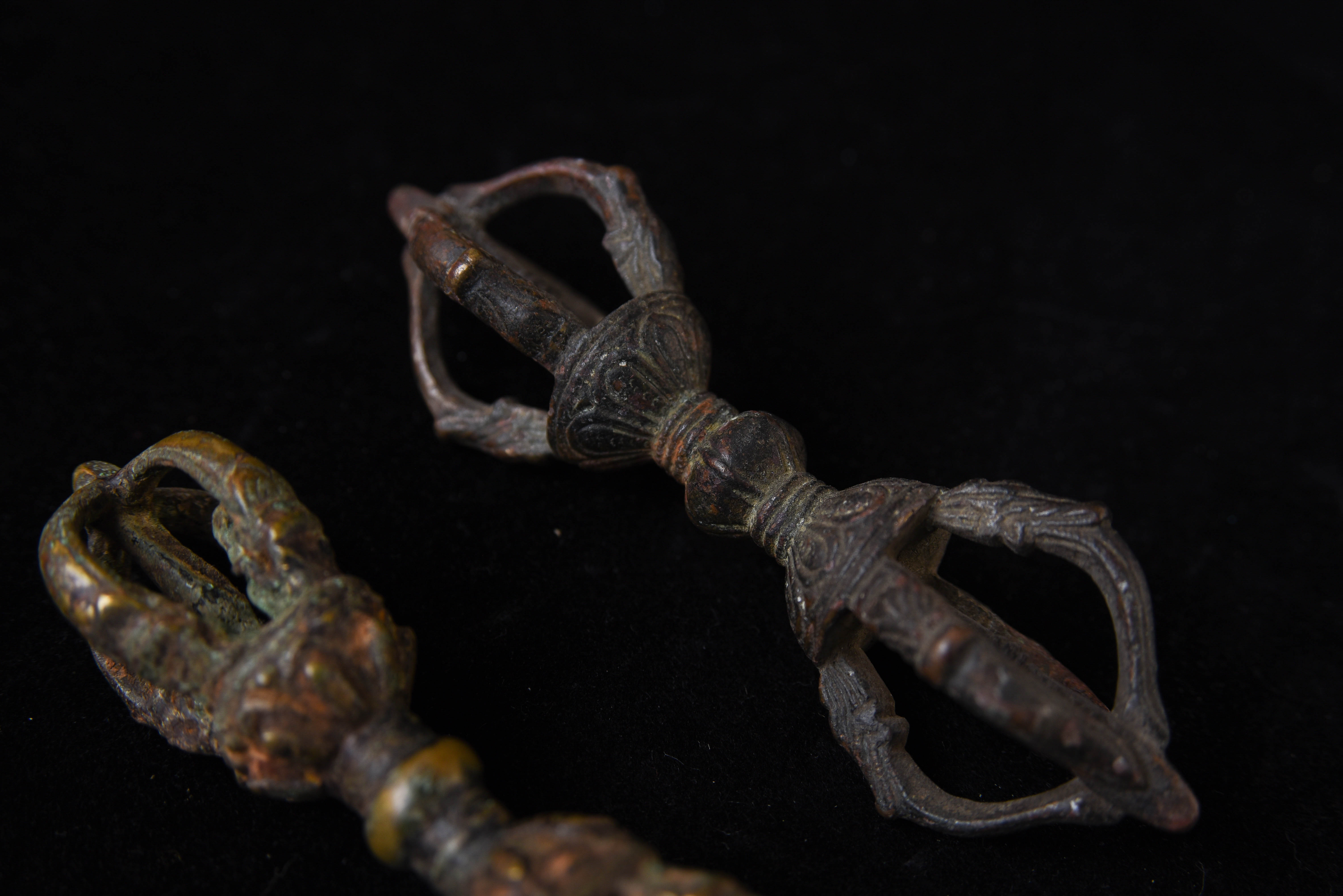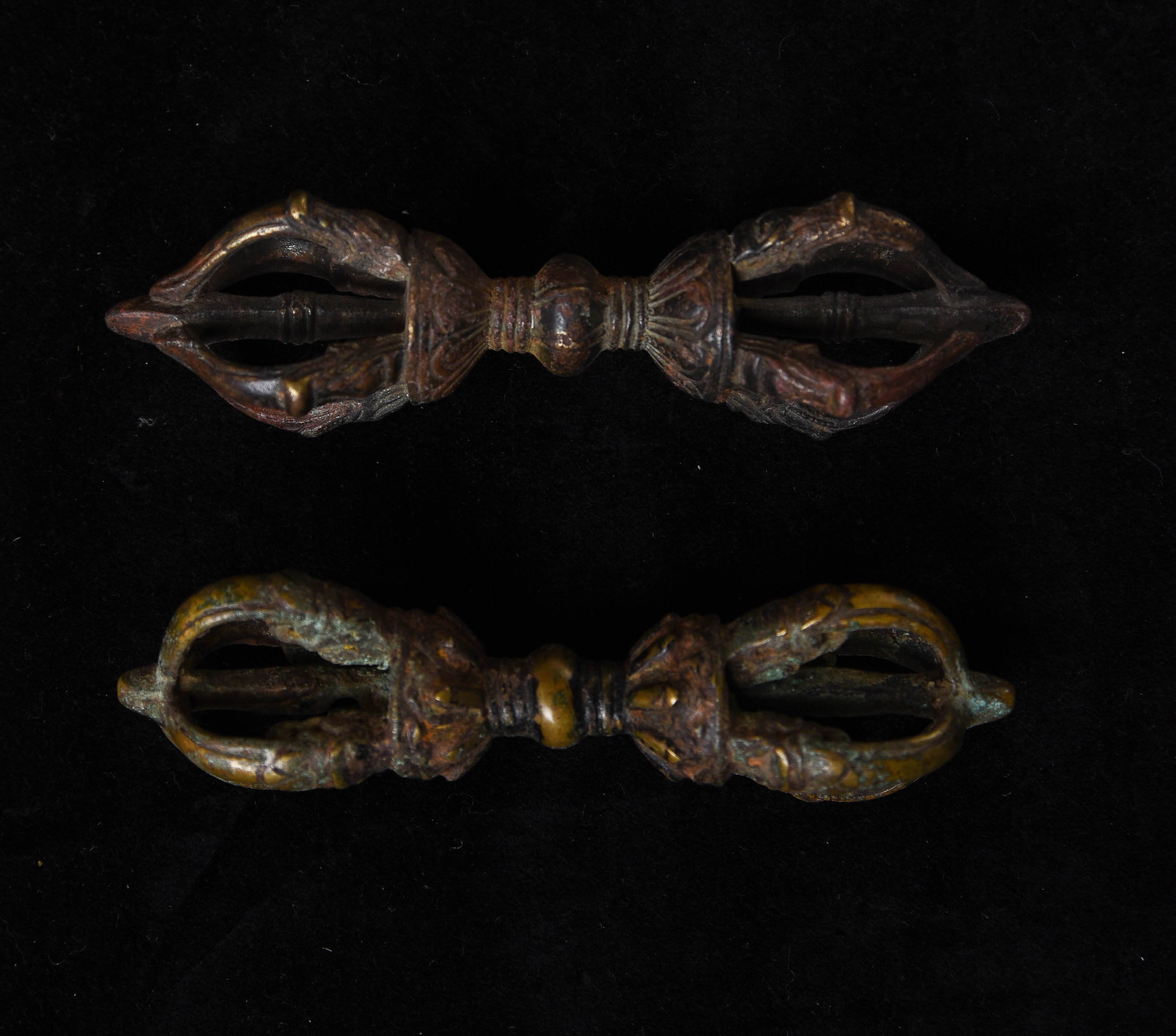 I recently found a box of Mongolian ritual implements that I collected in the 1990s when Mongolia was first opening up to the West after the fall of the Soviet Union. Most were made of different colored metals, and seemed to be from one local area in Mongolia. It was also a period when the internet was first beginning to be used by the general public to sell antique items directly between different countries, as PayPal and eBay we're just beginning to become the powerhouses that they are today. I was able to collect more than 30 Dorjes, Vadras, Bells, and other ritual implements made of bronze, brass, and other metals. There were a few classic style dorjes and Vadras in the group, including these two. While purchased out of Mongolia, maybe Tibetan or Mongolian. This auction is for 2 Tibetan or Mongolian ritual thunderbolts that are made of 3 different metals. They are classic type and are 19th or 20th centuries. This auction is for both.