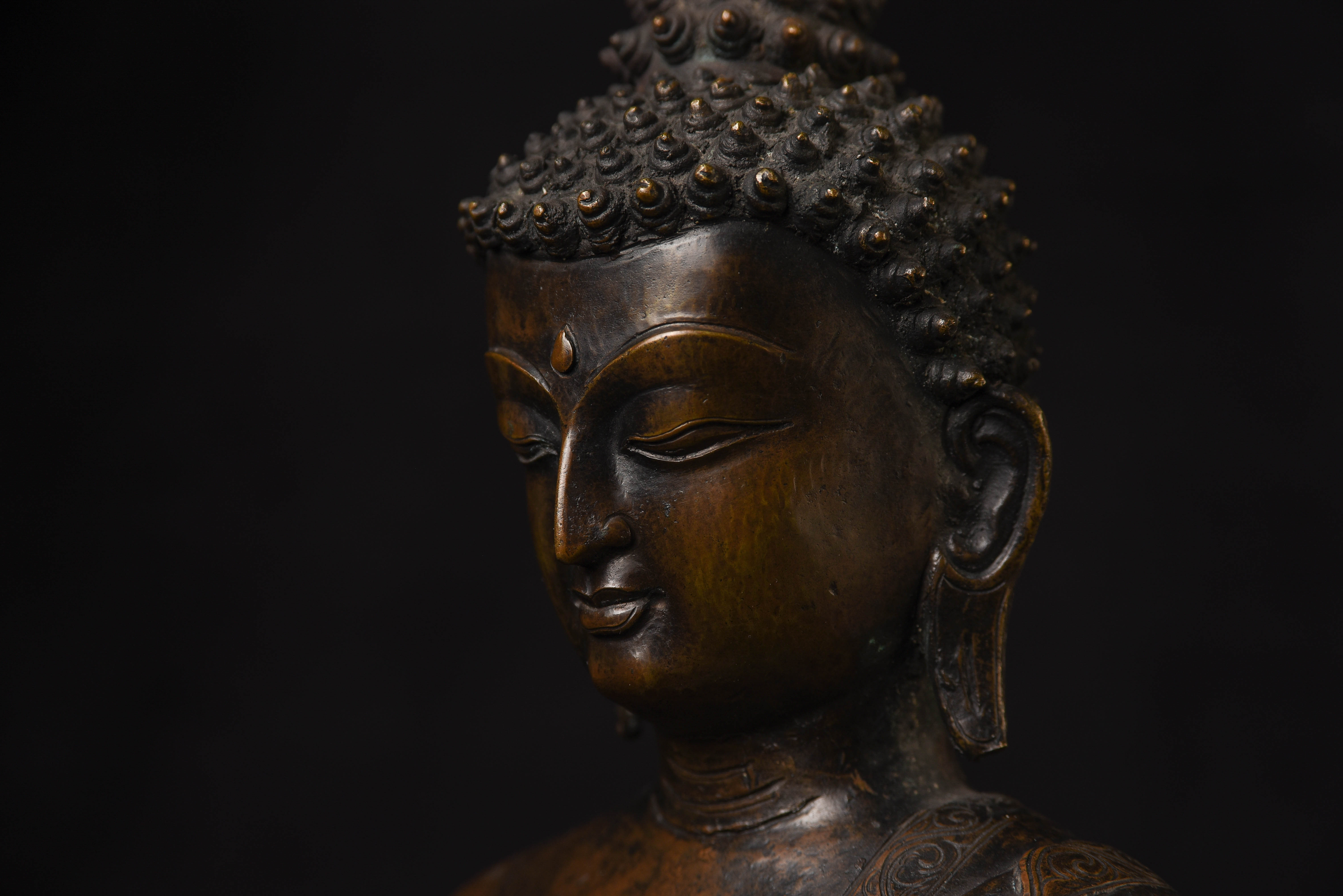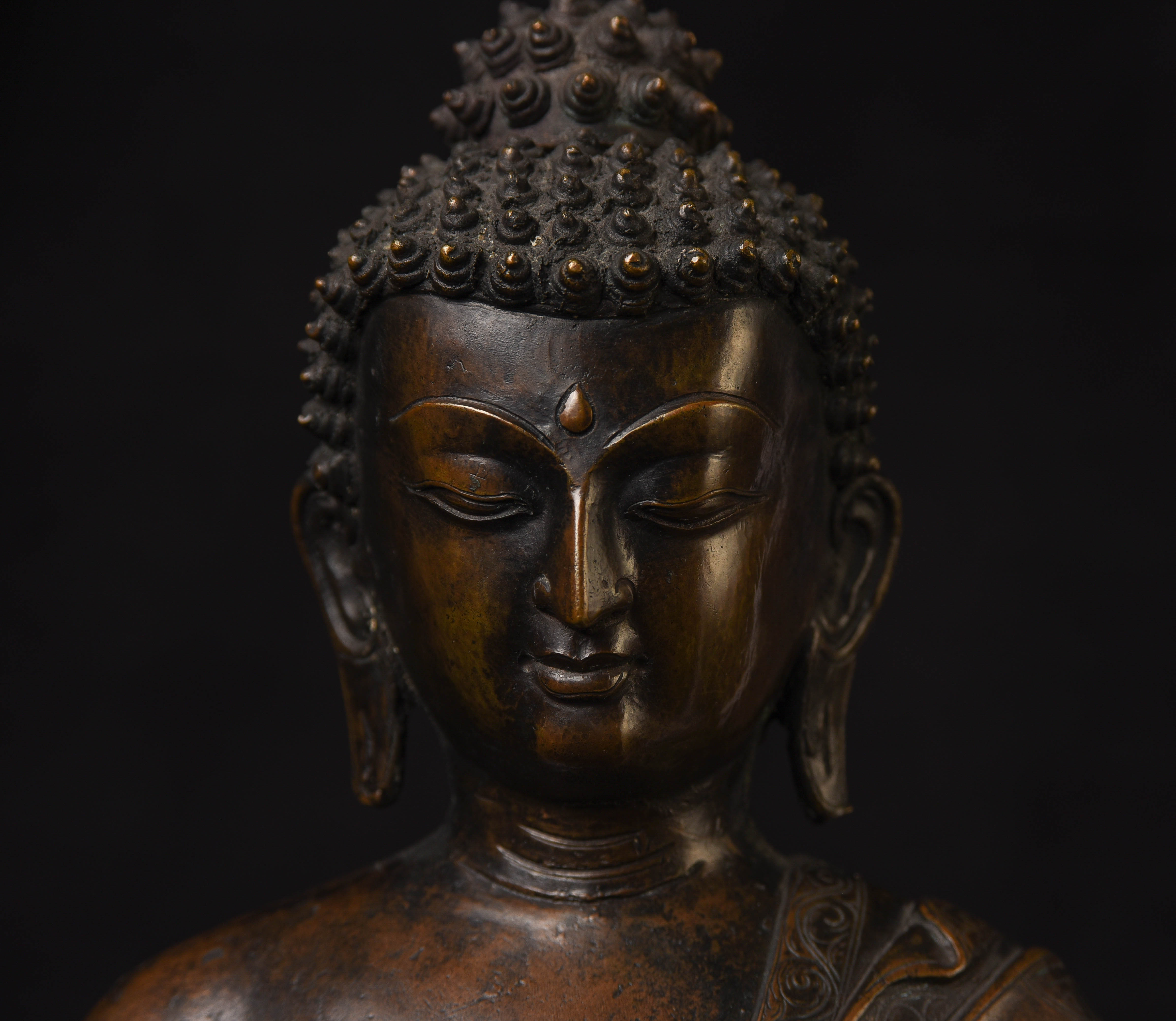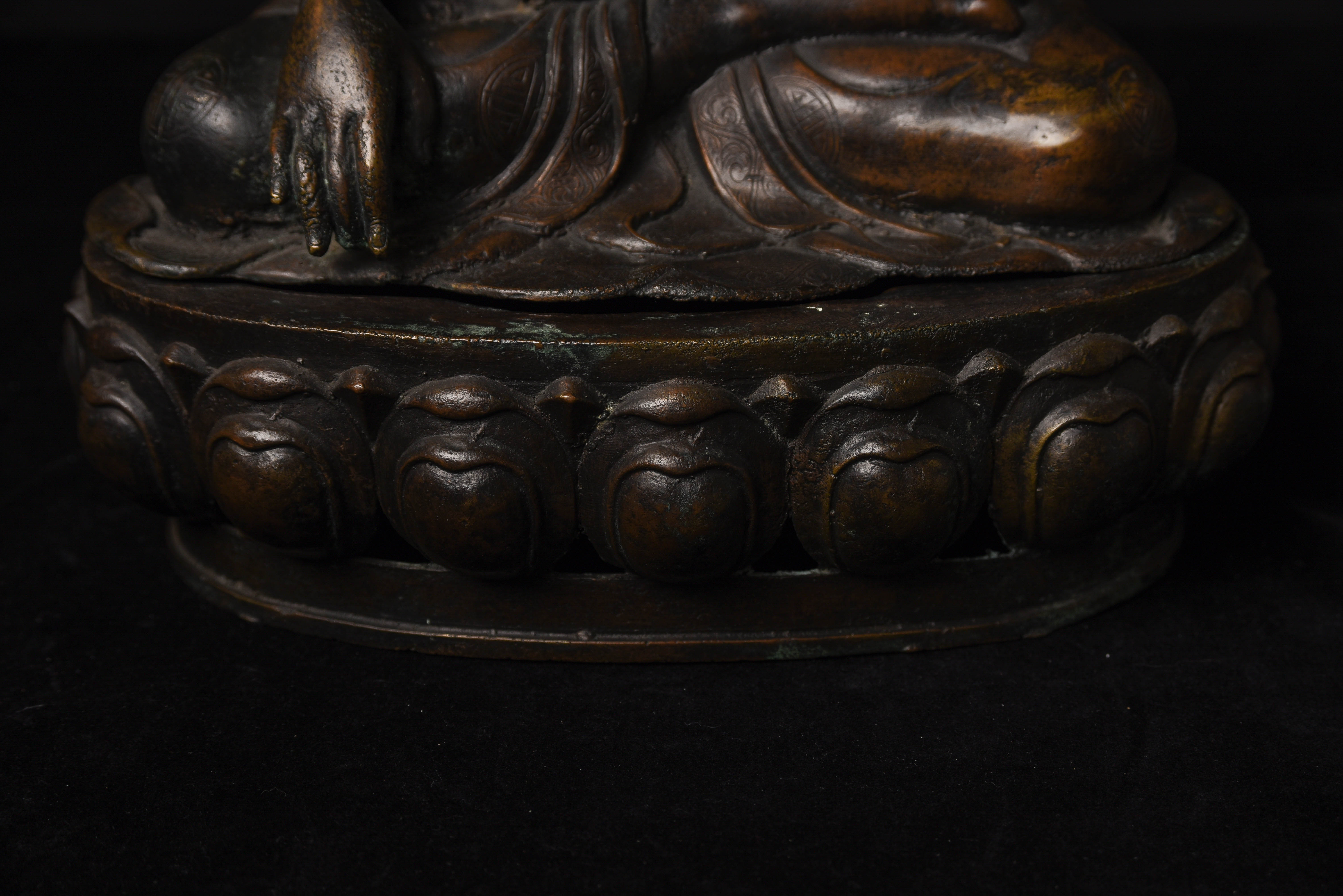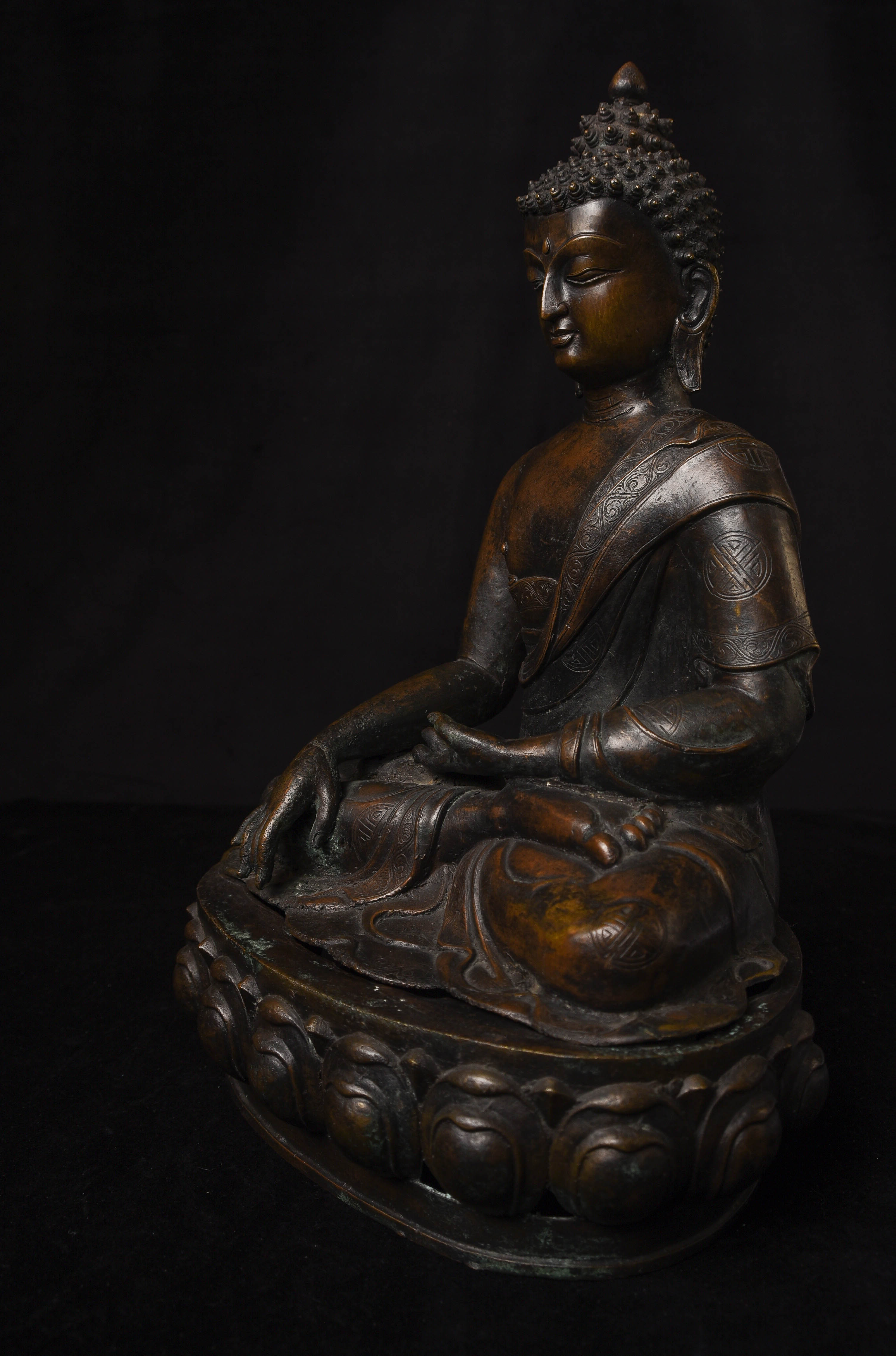 Fine and large early 20thC Nepalese Buddha. Beautiful chocolate patina. Nice crisp casting. Looks to be sculpted out of a copper alloy. Supremely peaceful. 16"H x 12"