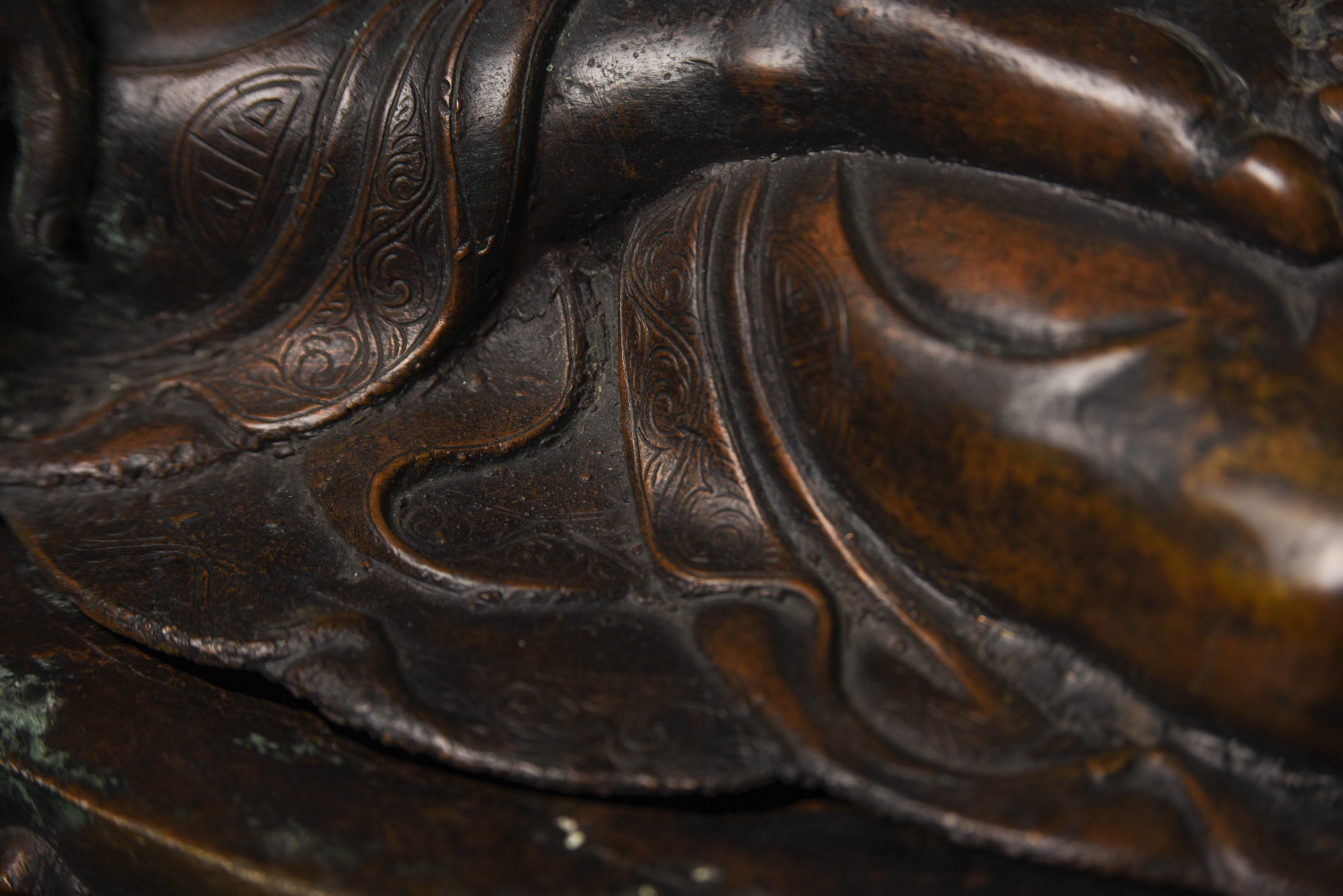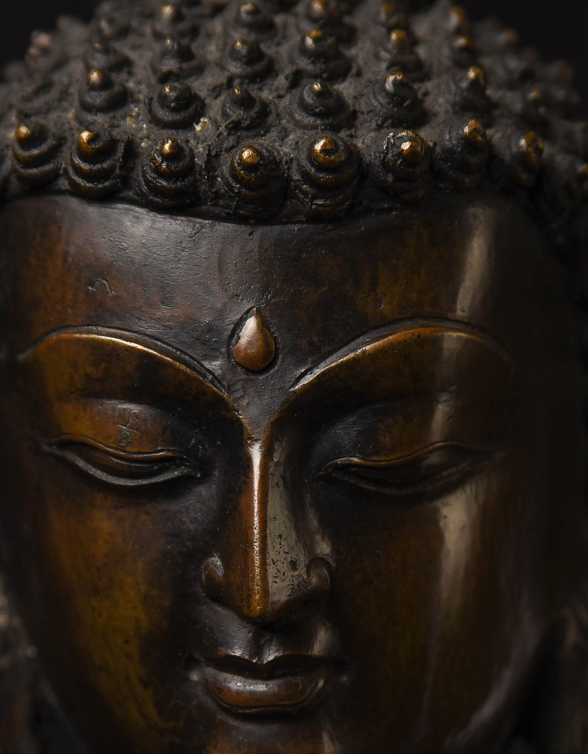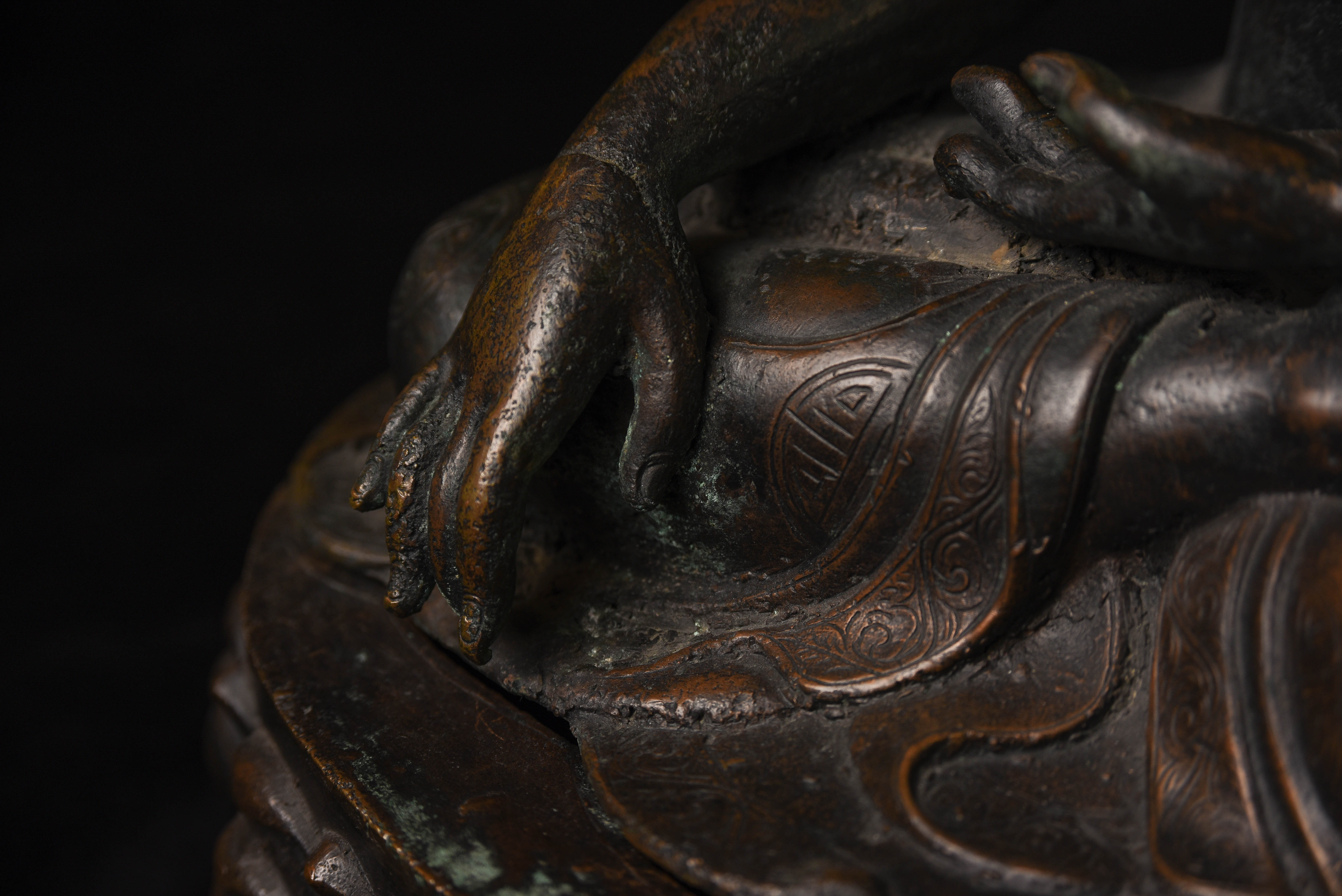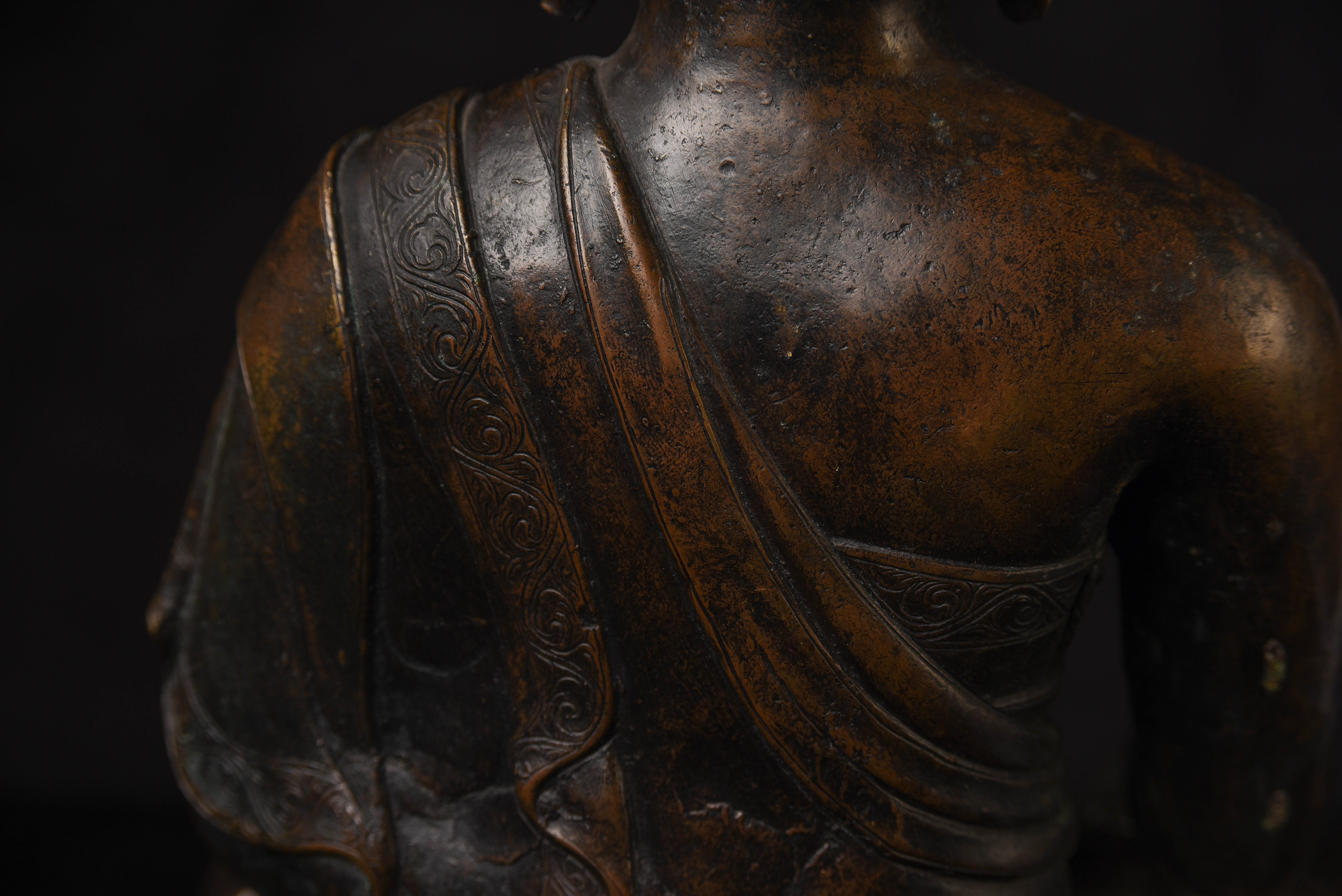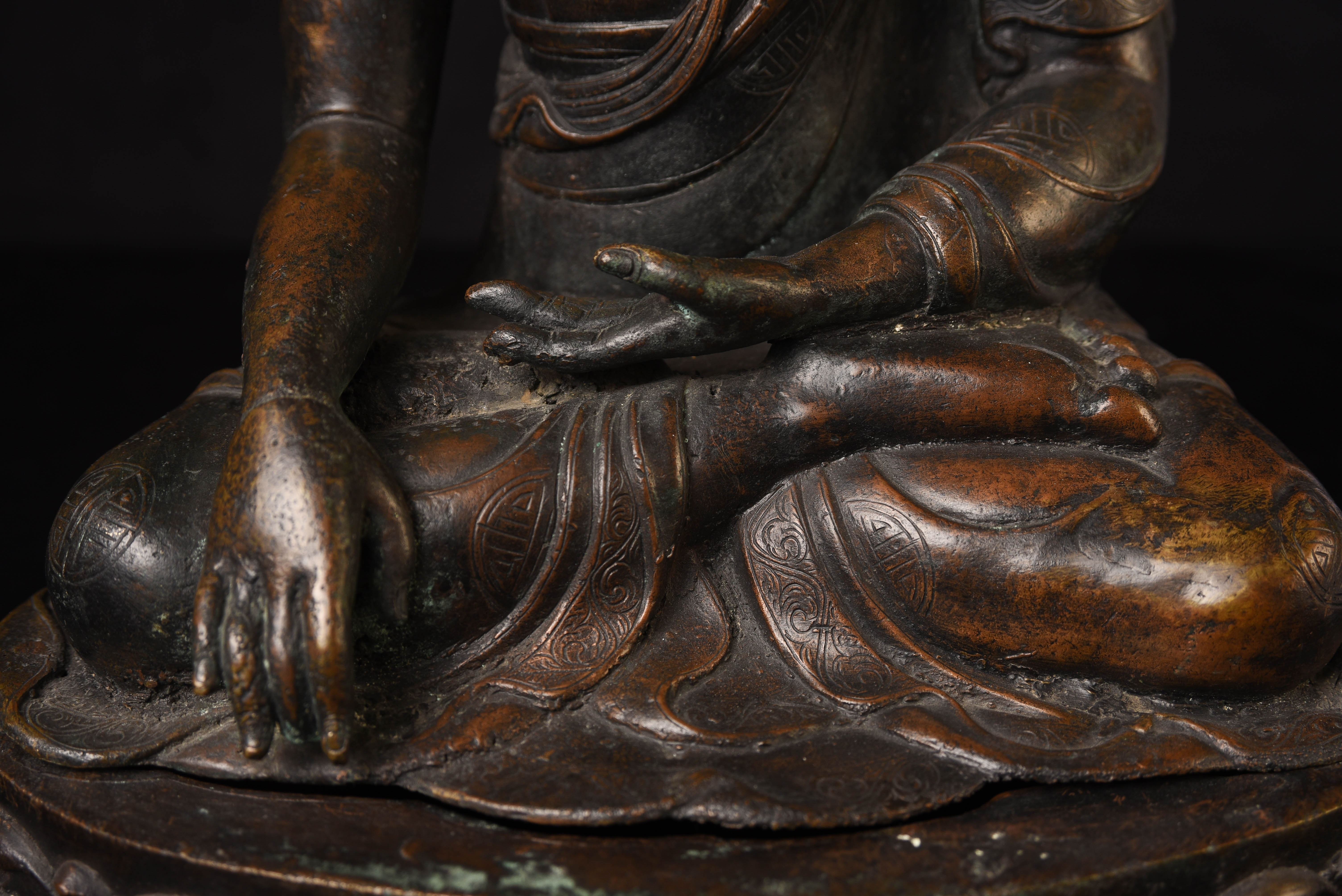 Fine and large early 20thC Nepalese Buddha. Beautiful chocolate patina. Nice crisp casting. Looks to be sculpted out of a copper alloy. Supremely peaceful. 16"H x 12"