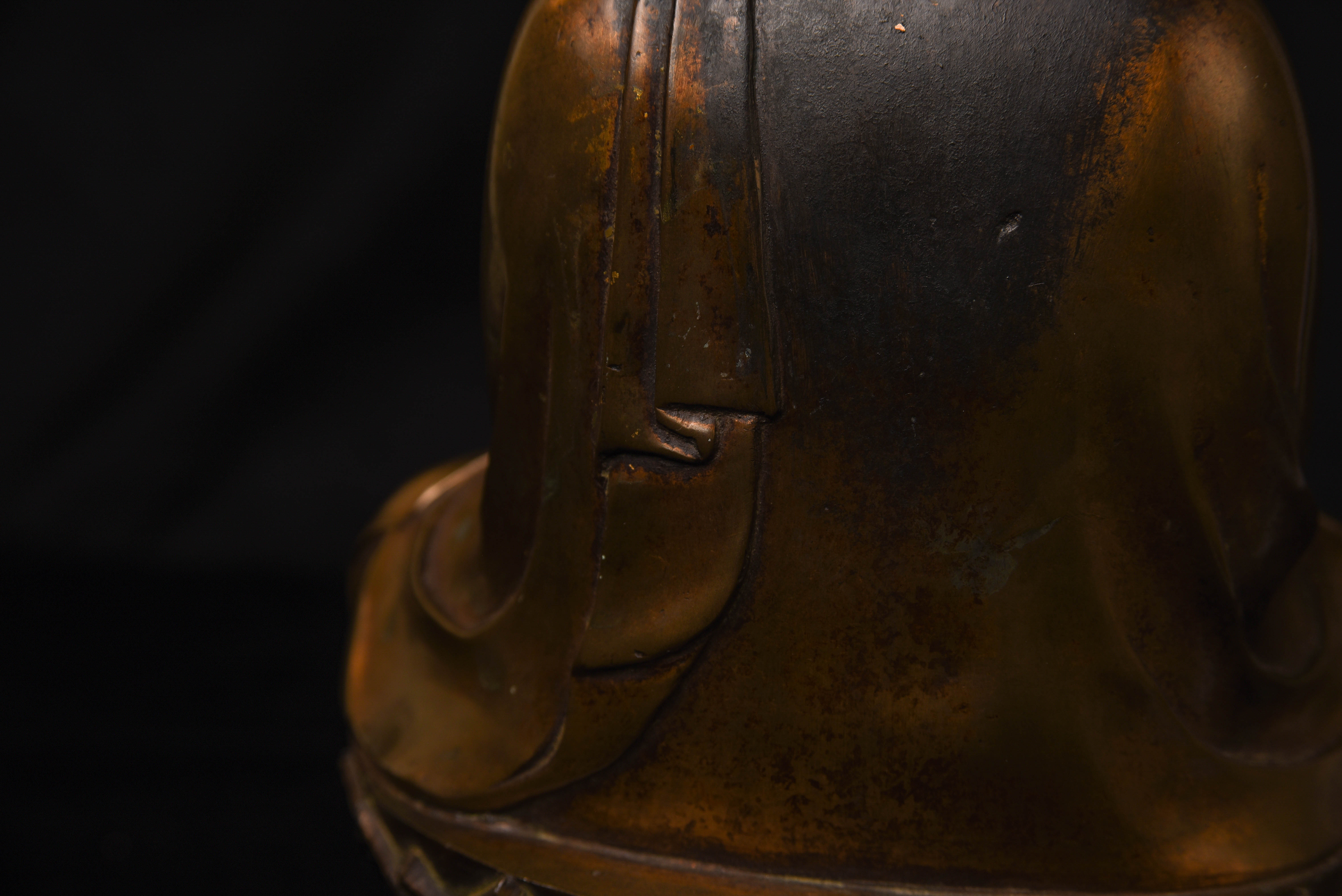 I believe that it may have been cleaned at some point and that it may have been darker at one time. It has a very distinctive head shape that was a signature feature of the Kamakura Buddha. (12\" H X 8\"W)