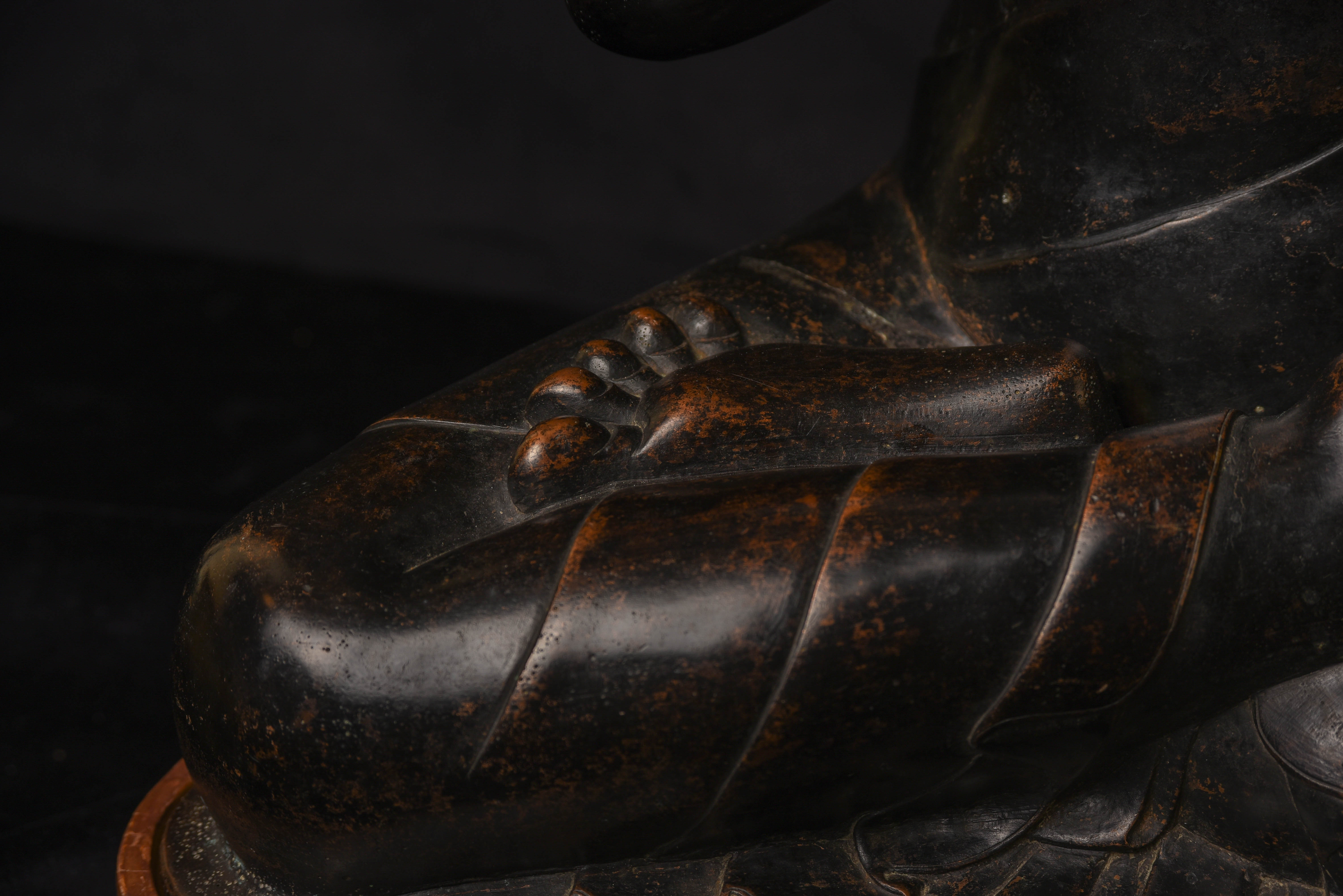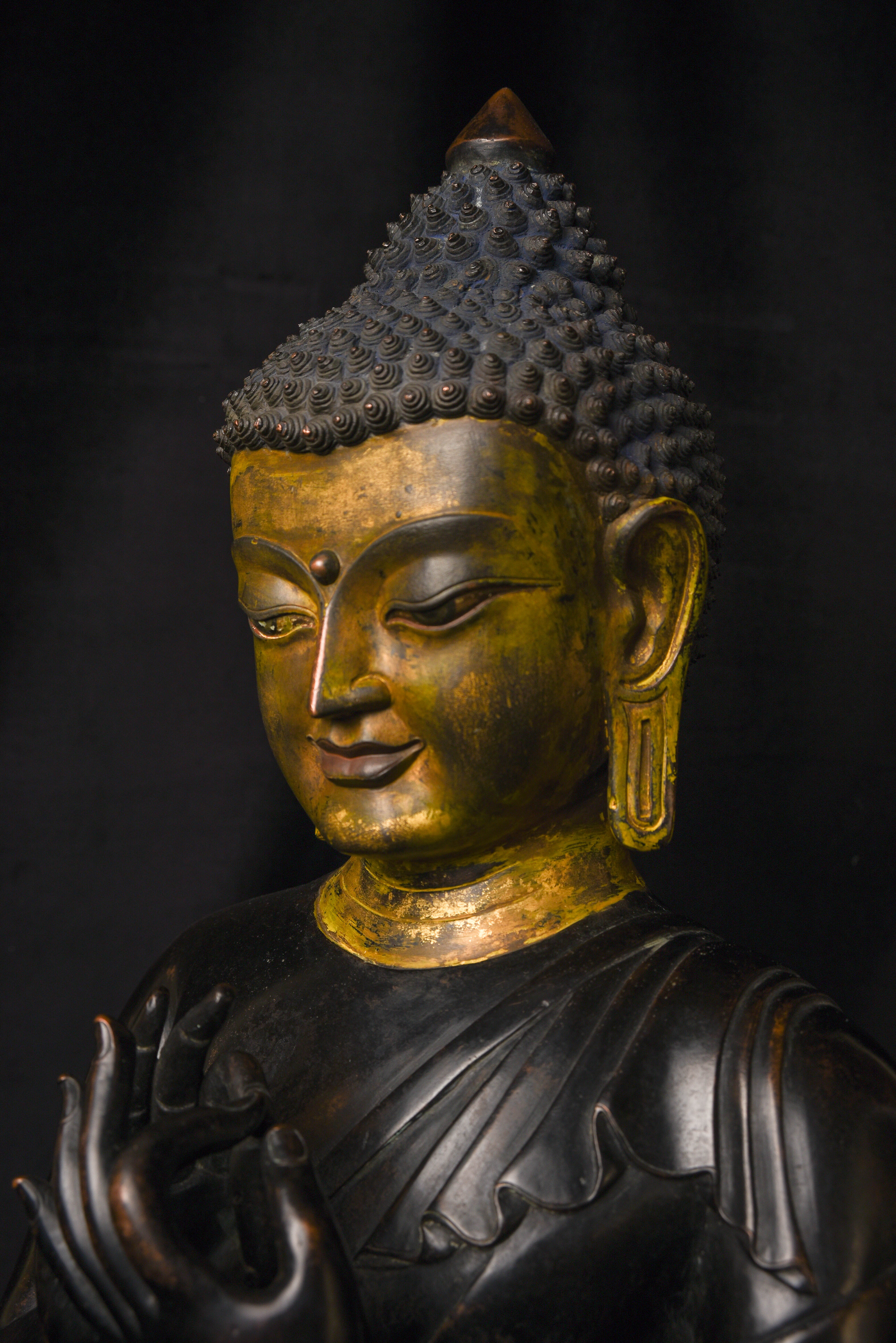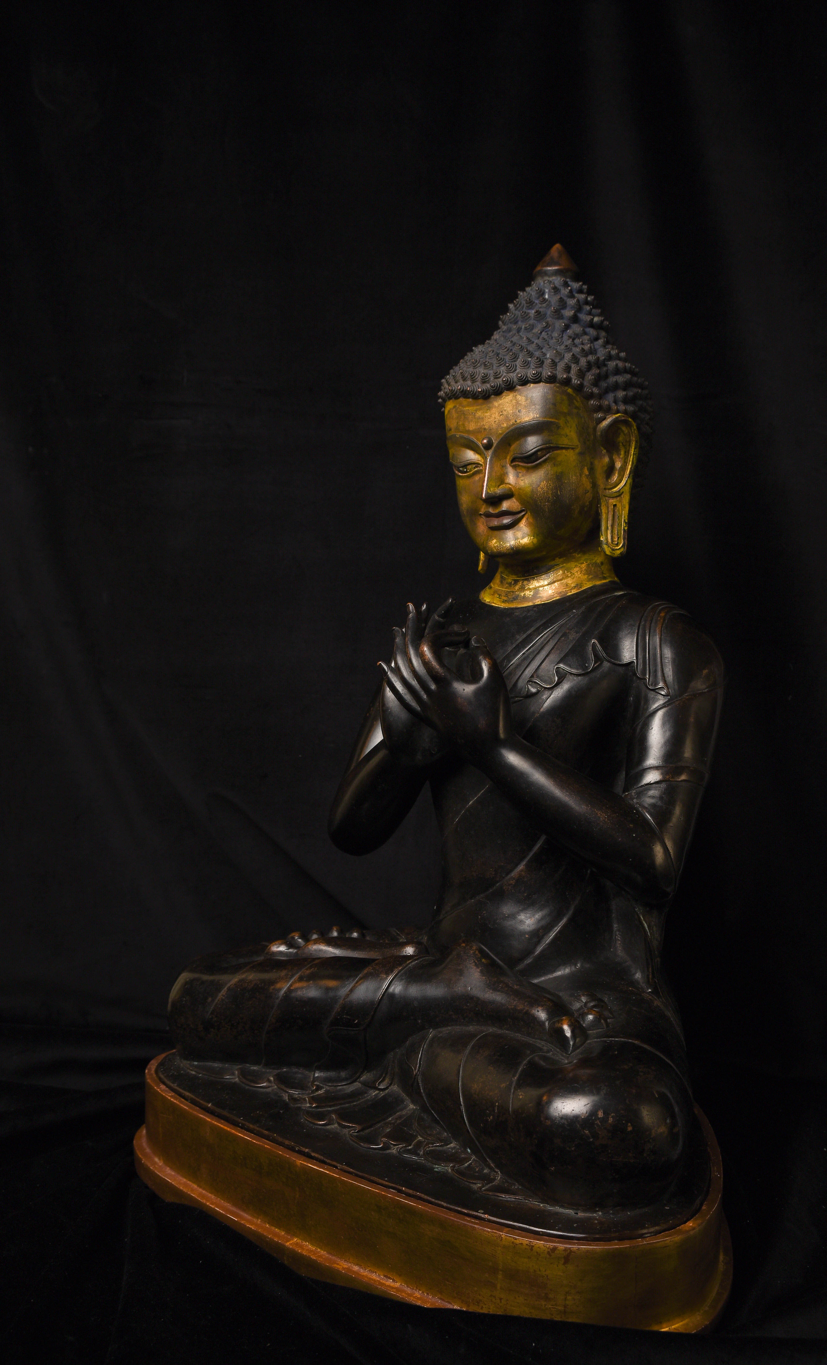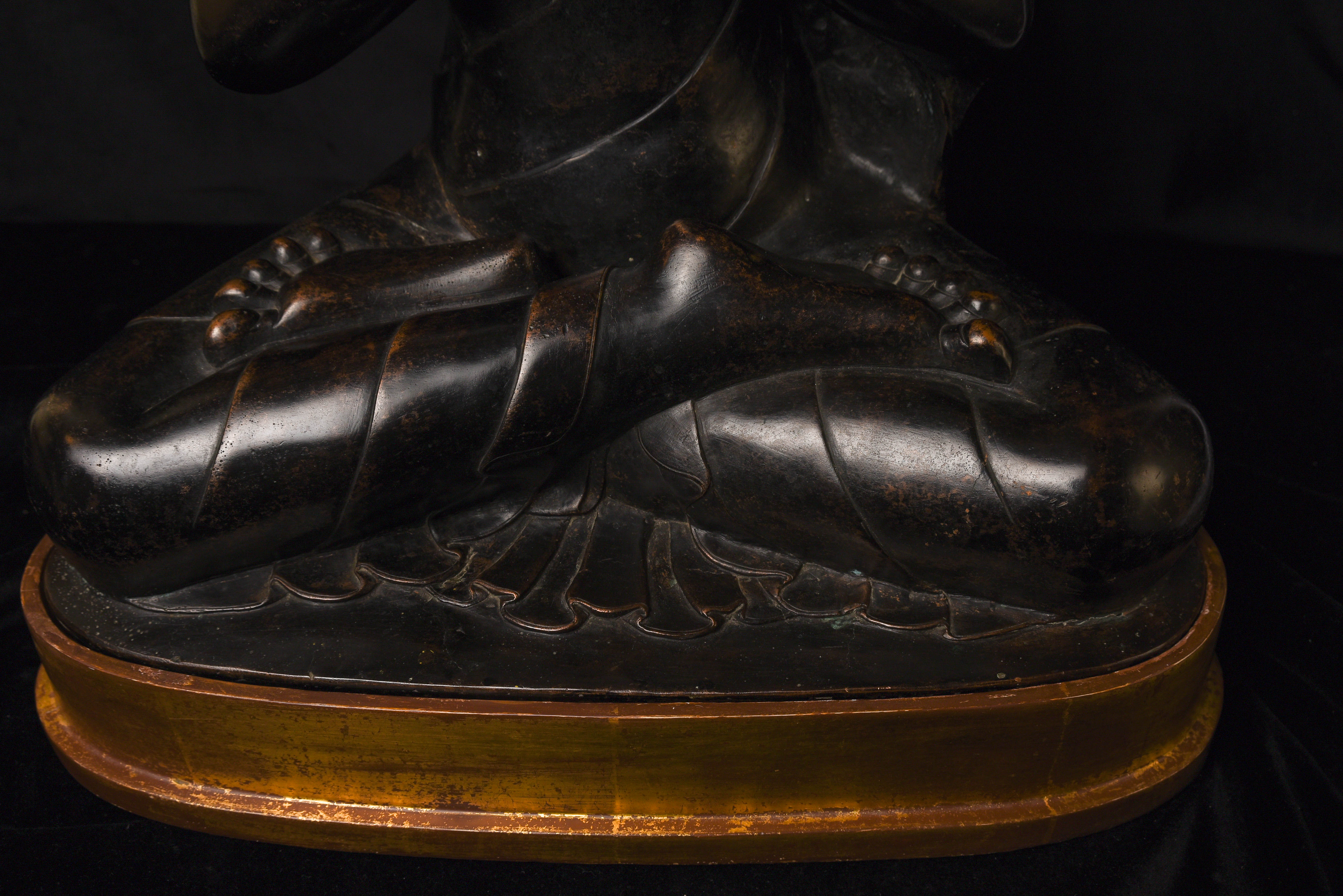 Extremely large at 22.5 in tall by 16.5 inches wide at the knees for the bronze alone, and on its original wooden base, it sits a formidable 25 inches tall by almost 18 in. wide at the knees. Very fine casting and finishing-delicate features. Spend time looking at the pictures. You'll see how crisp every detail is. Cold gilt applied to the face only. Very distinctive sculpting, with a large head and strong neck that is tilted ever so slightly to one side. His head is almost triangle-shaped, also slightly off balance. All this gives him a friendly yet powerful presence. The consecration plate on the bottom was loose and had clearly been previously removed, so I removed it so I could photograph the inside. To give a sense of how substantial the statue is, the copper consecration plate weighs a pound and a half by itself. Comes from an old European Collection. Weighs over 45 lbs