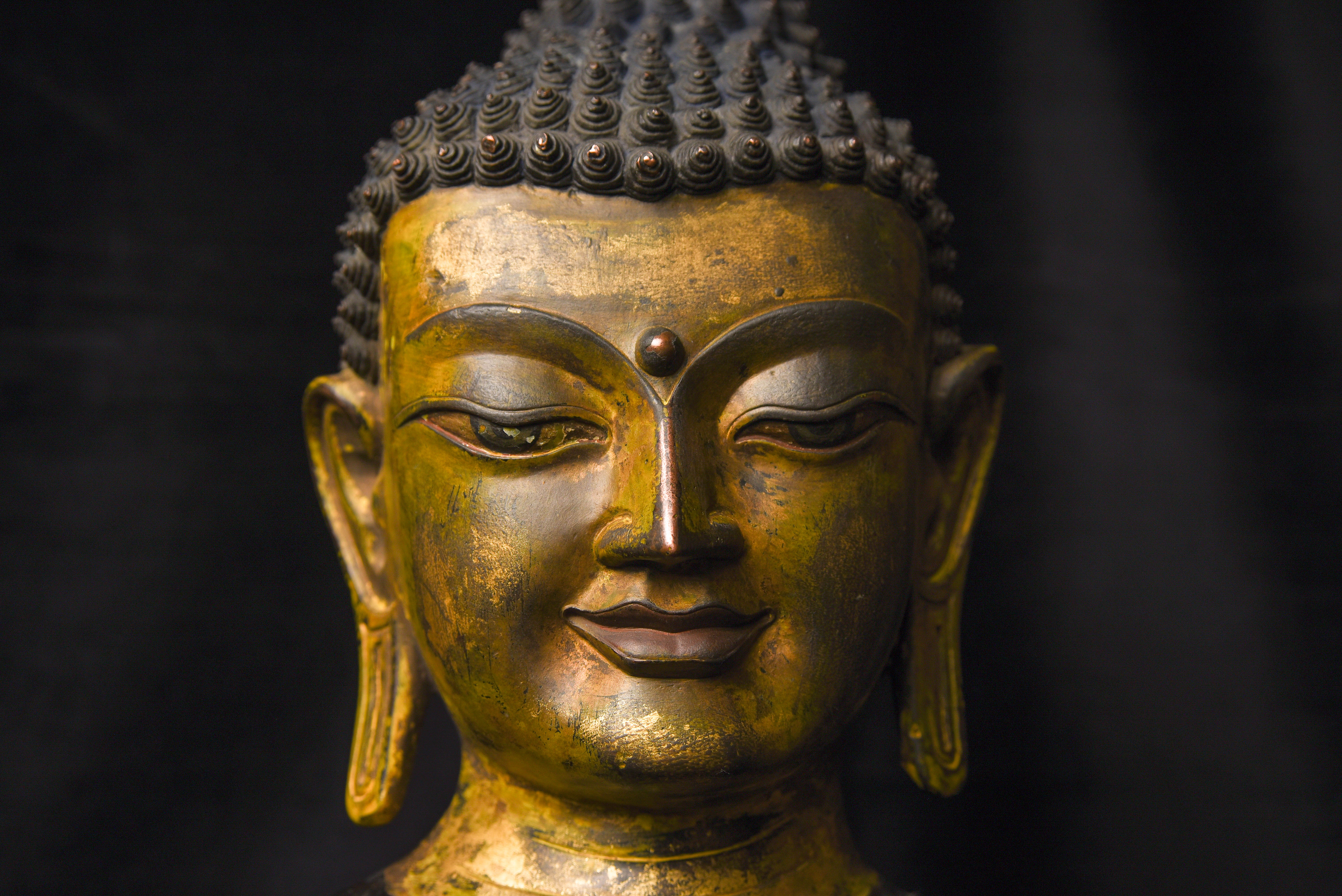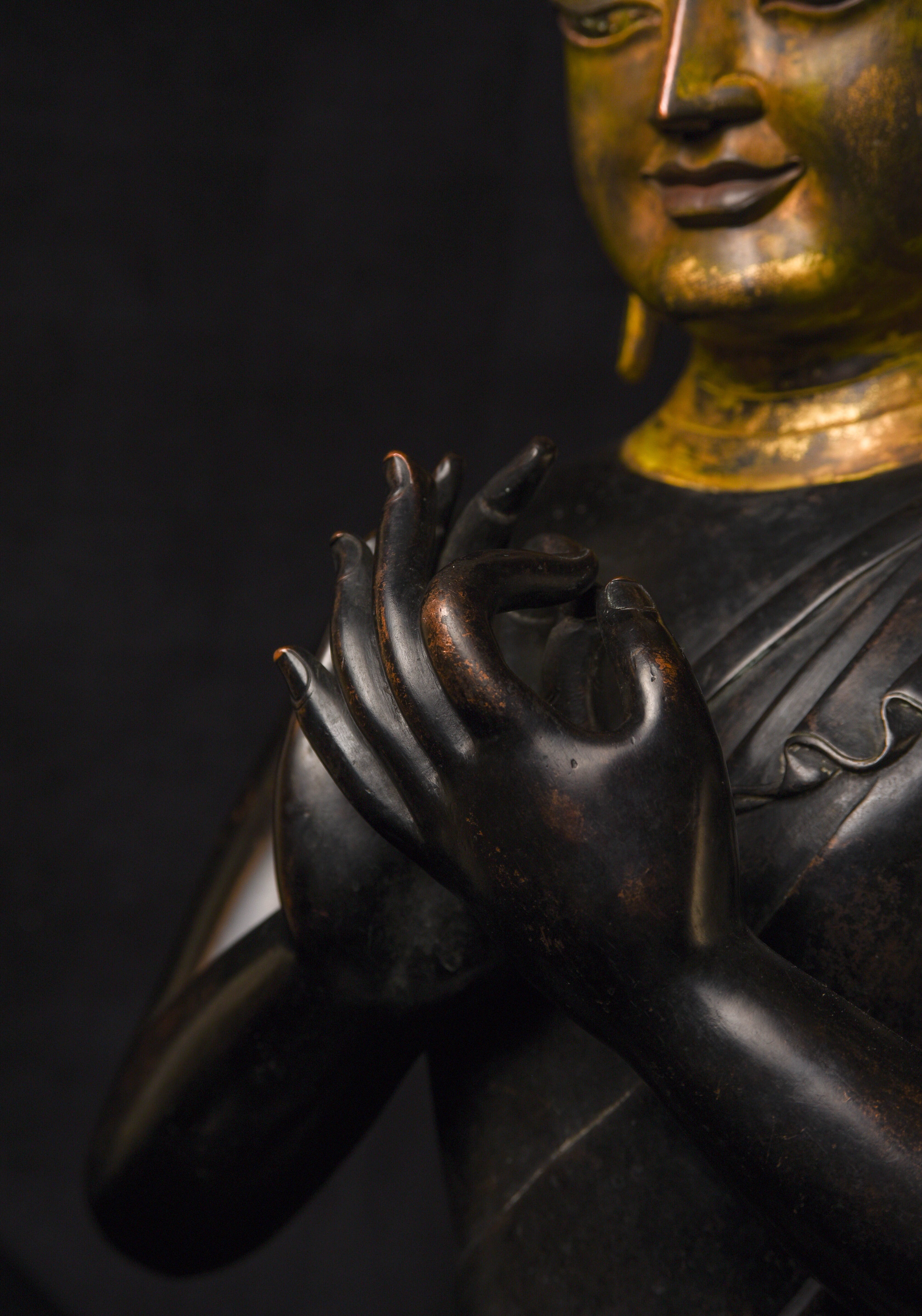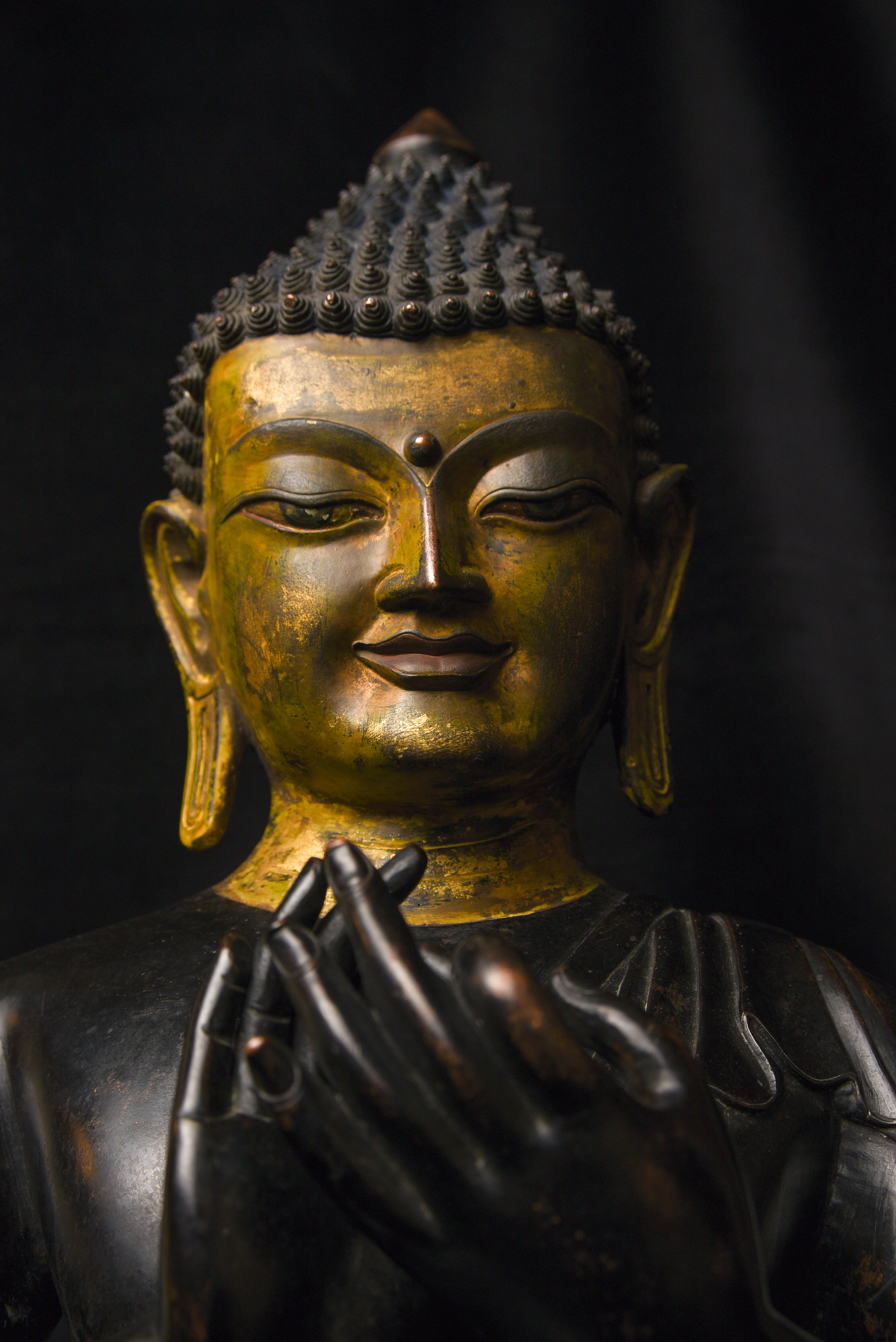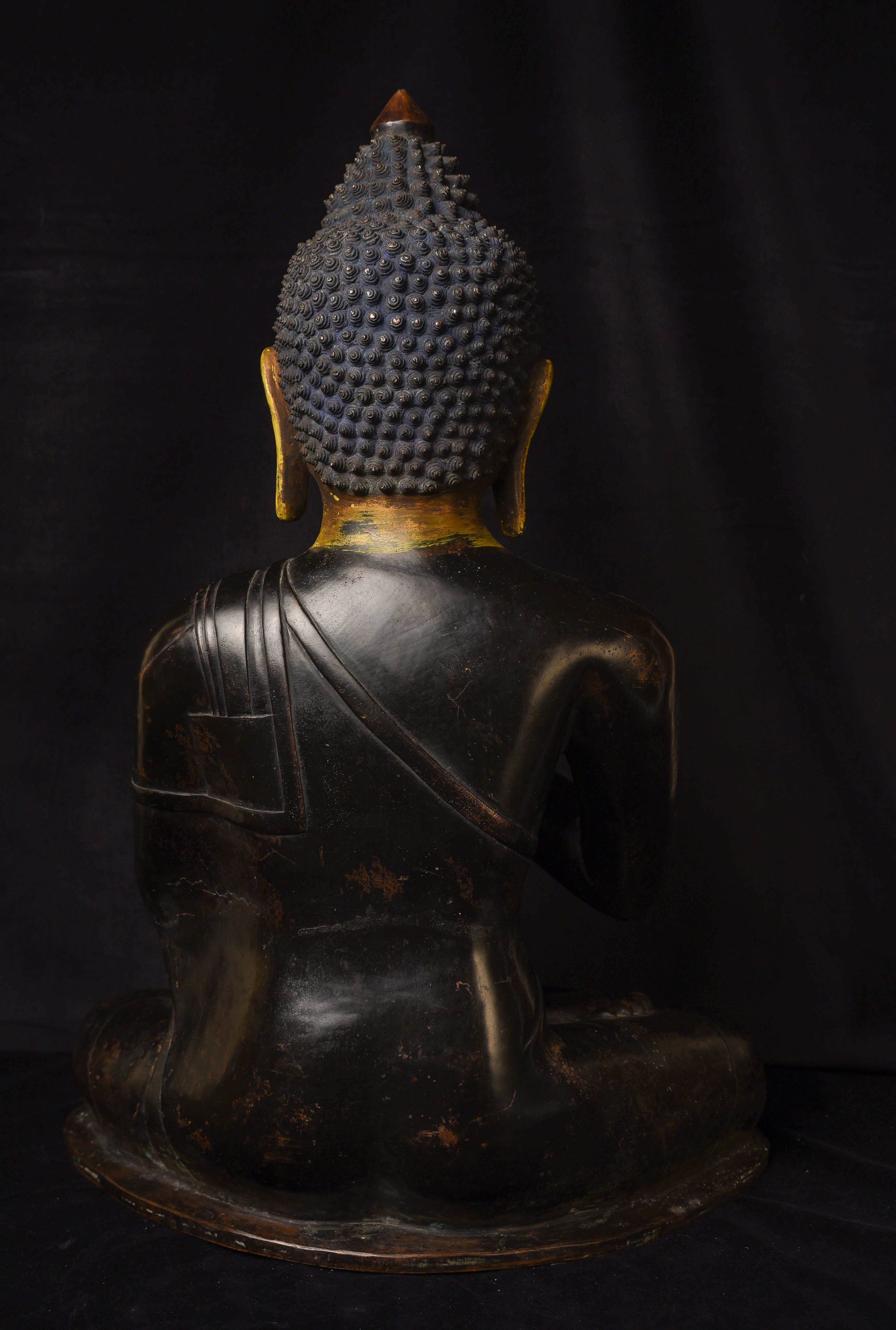 Extremely large at 22.5 in tall by 16.5 inches wide at the knees for the bronze alone, and on its original wooden base, it sits a formidable 25 inches tall by almost 18 in. wide at the knees. Very fine casting and finishing-delicate features. Spend time looking at the pictures. You'll see how crisp every detail is. Cold gilt applied to the face only. Very distinctive sculpting, with a large head and strong neck that is tilted ever so slightly to one side. His head is almost triangle-shaped, also slightly off balance. All this gives him a friendly yet powerful presence. The consecration plate on the bottom was loose and had clearly been previously removed, so I removed it so I could photograph the inside. To give a sense of how substantial the statue is, the copper consecration plate weighs a pound and a half by itself. Comes from an old European Collection. Weighs over 45 lbs