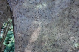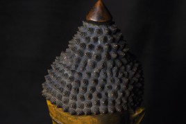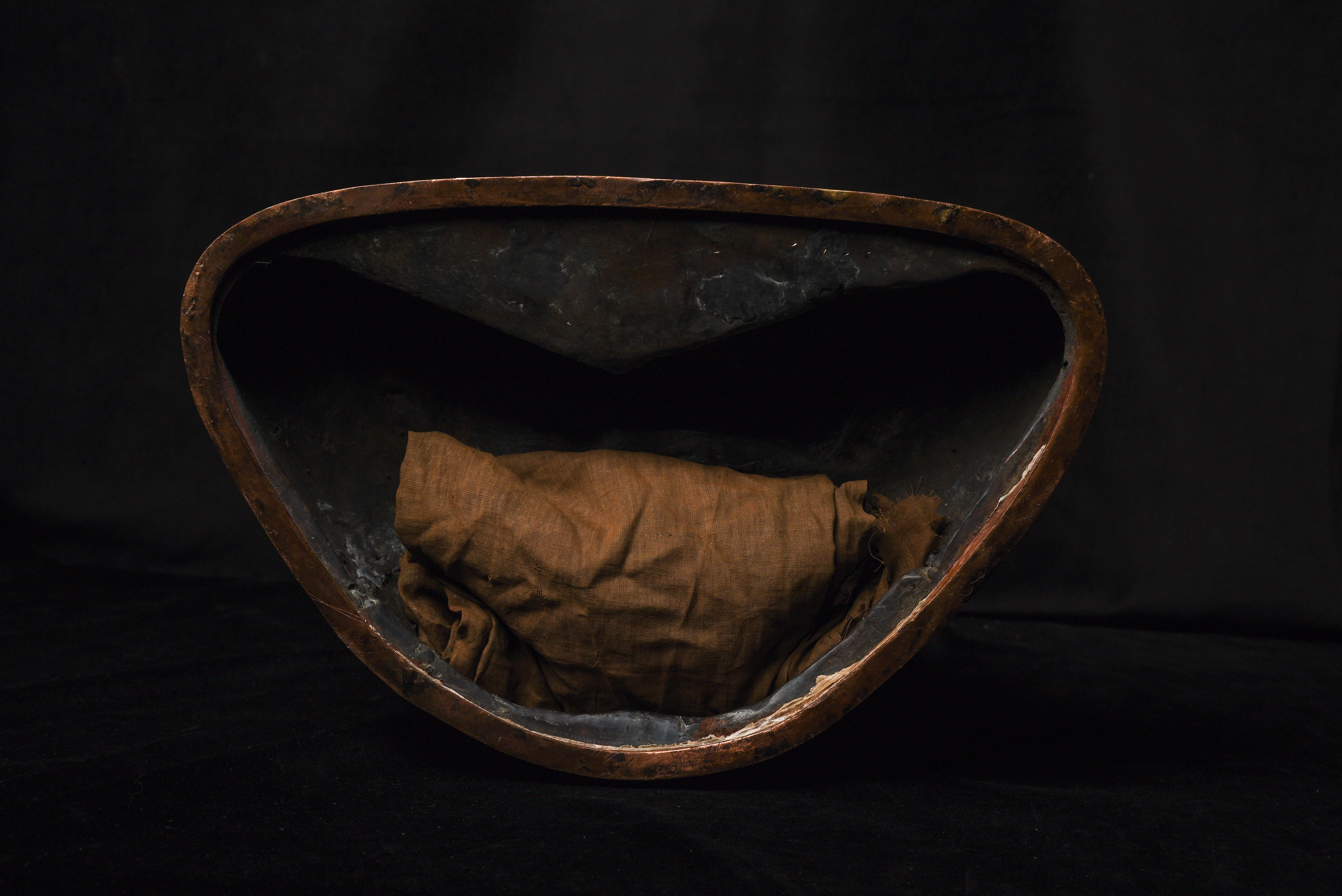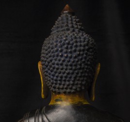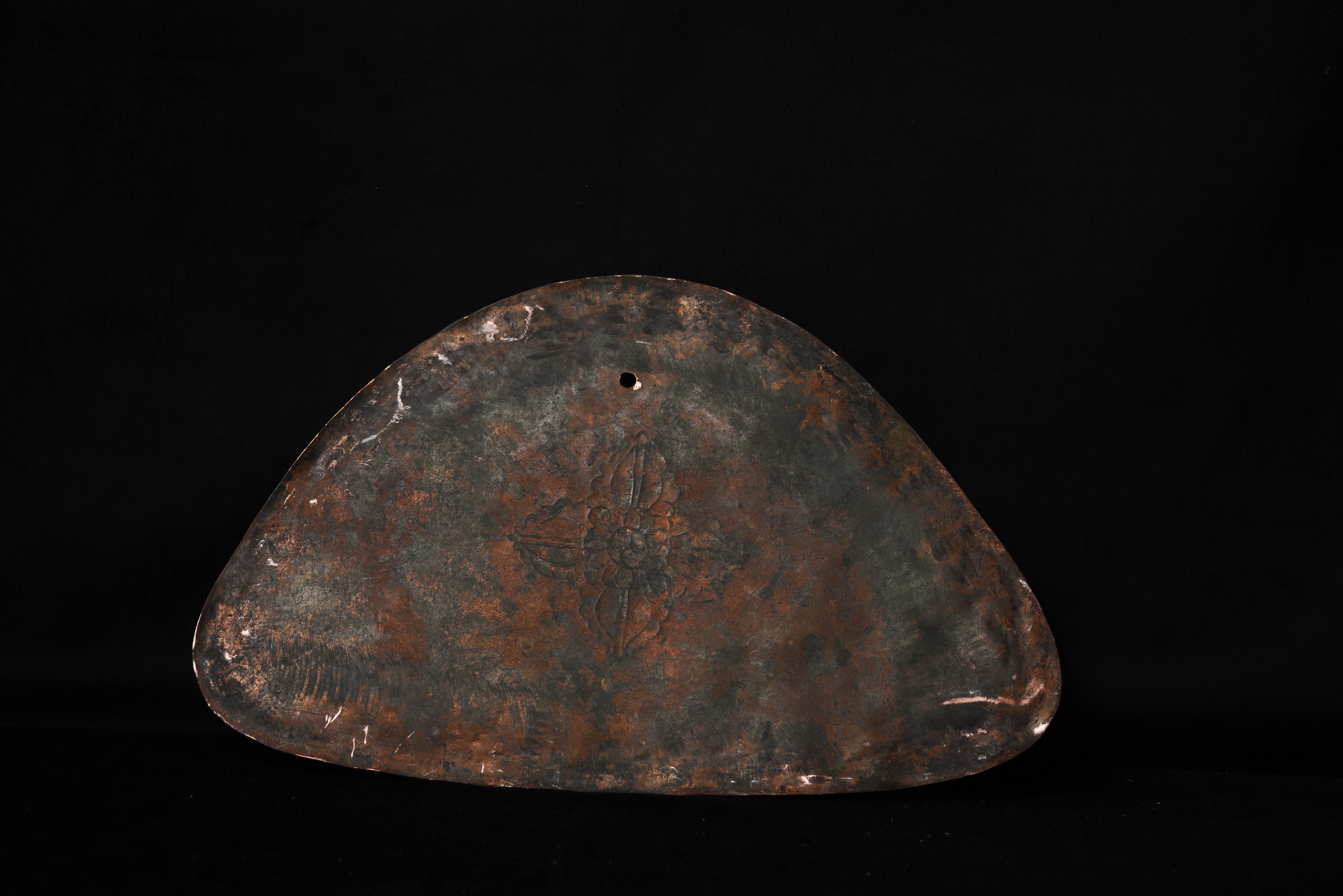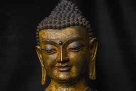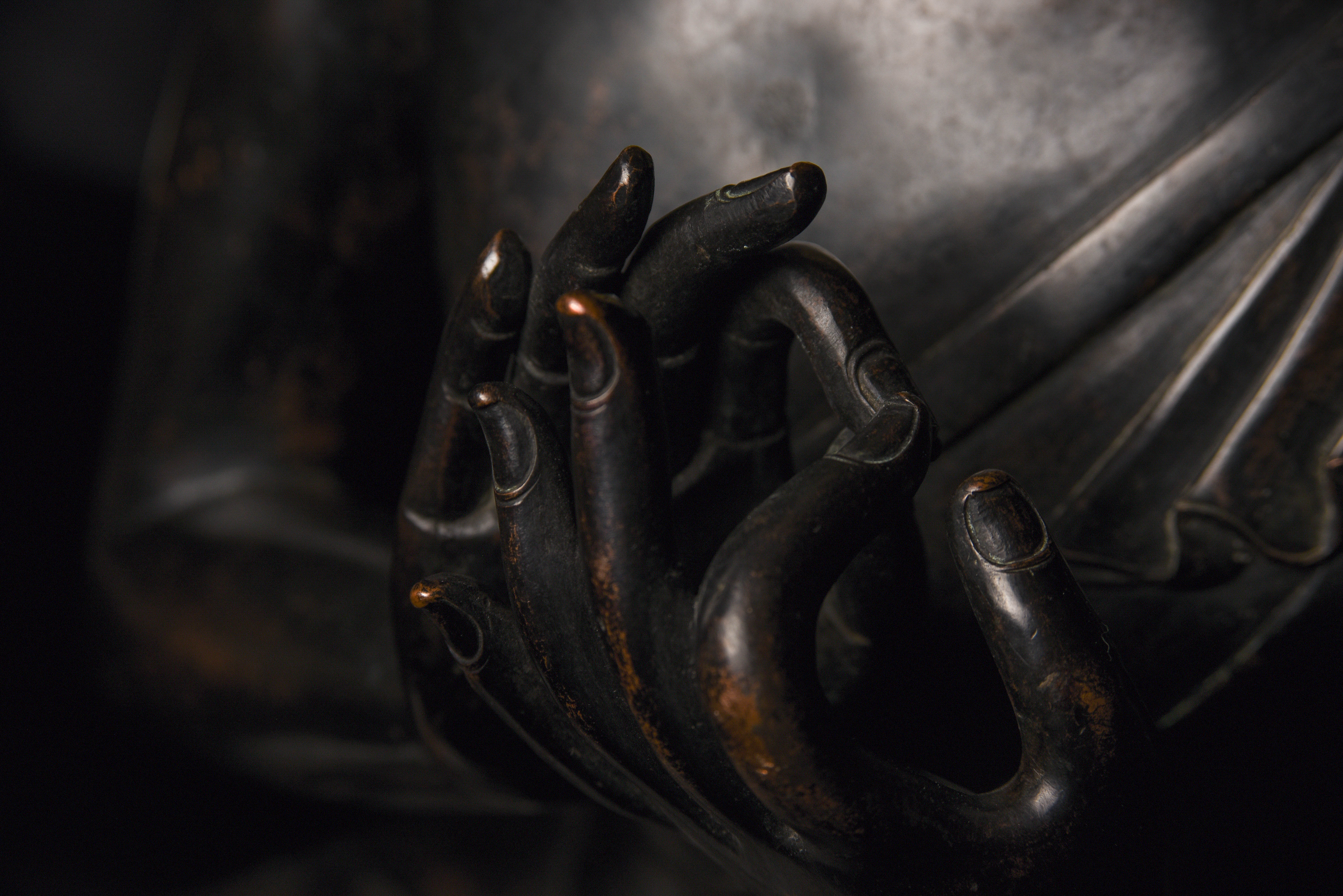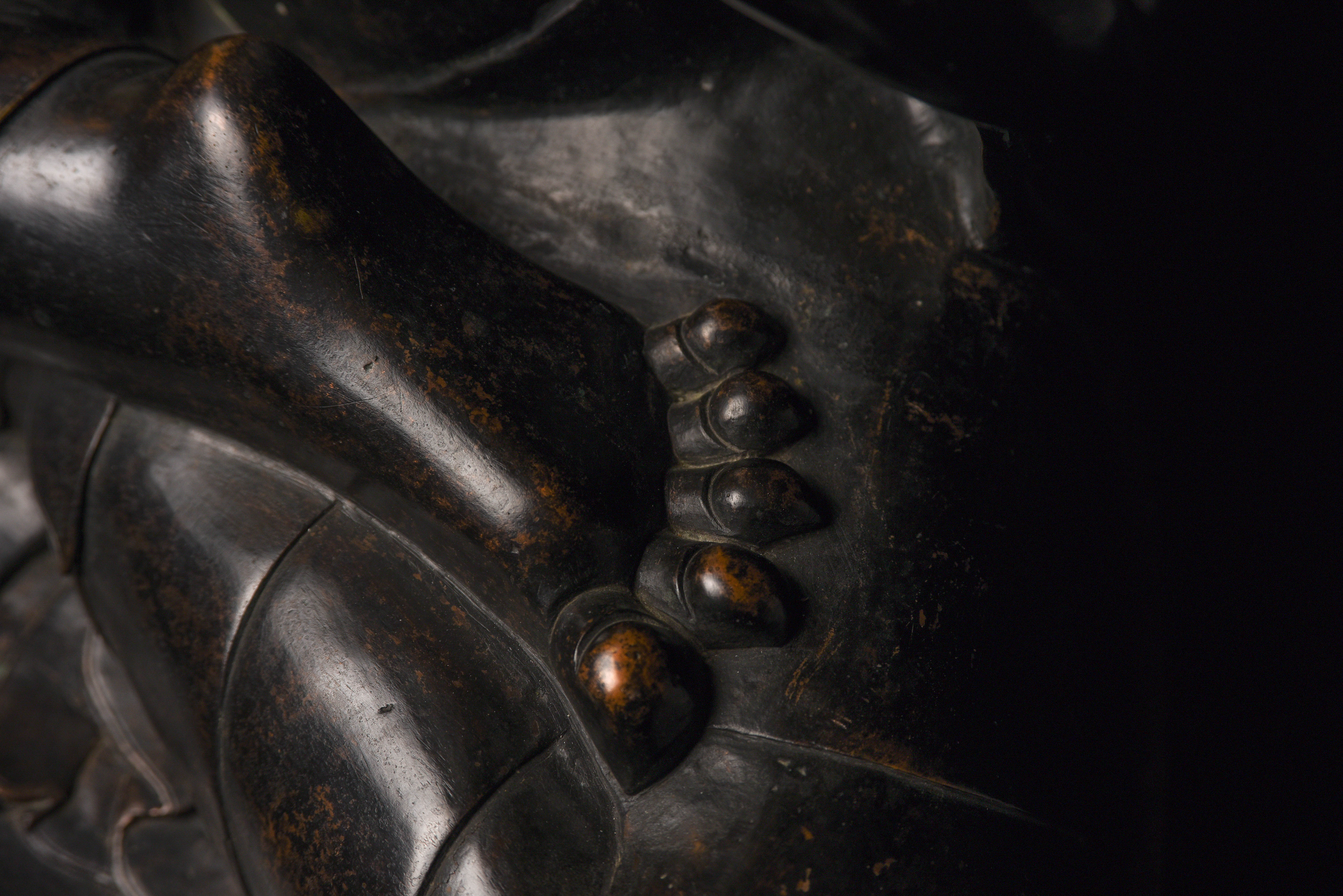 Extremely large at 22.5 in tall by 16.5 inches wide at the knees for the bronze alone, and on its original wooden base, it sits a formidable 25 inches tall by almost 18 in. wide at the knees. Very fine casting and finishing-delicate features. Spend time looking at the pictures. You'll see how crisp every detail is. Cold gilt applied to the face only. Very distinctive sculpting, with a large head and strong neck that is tilted ever so slightly to one side. His head is almost triangle-shaped, also slightly off balance. All this gives him a friendly yet powerful presence. The consecration plate on the bottom was loose and had clearly been previously removed, so I removed it so I could photograph the inside. To give a sense of how substantial the statue is, the copper consecration plate weighs a pound and a half by itself. Comes from an old European Collection. Weighs over 45 lbs