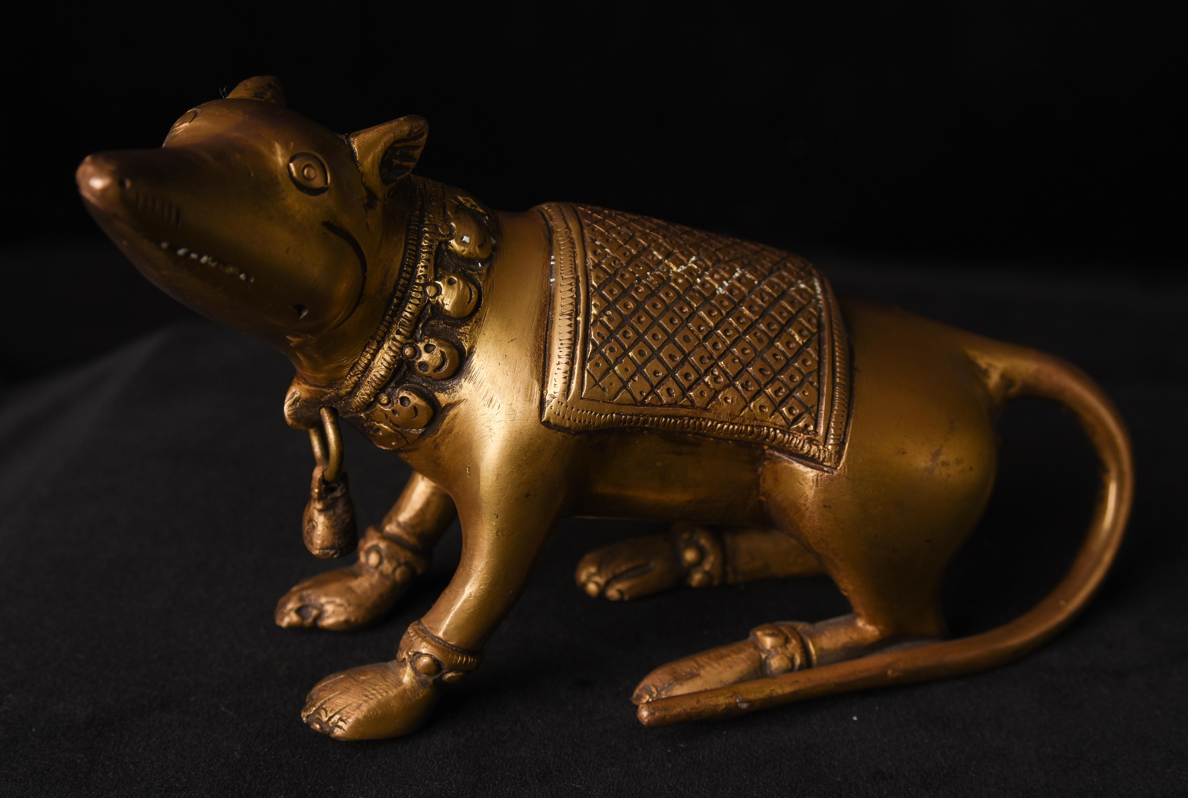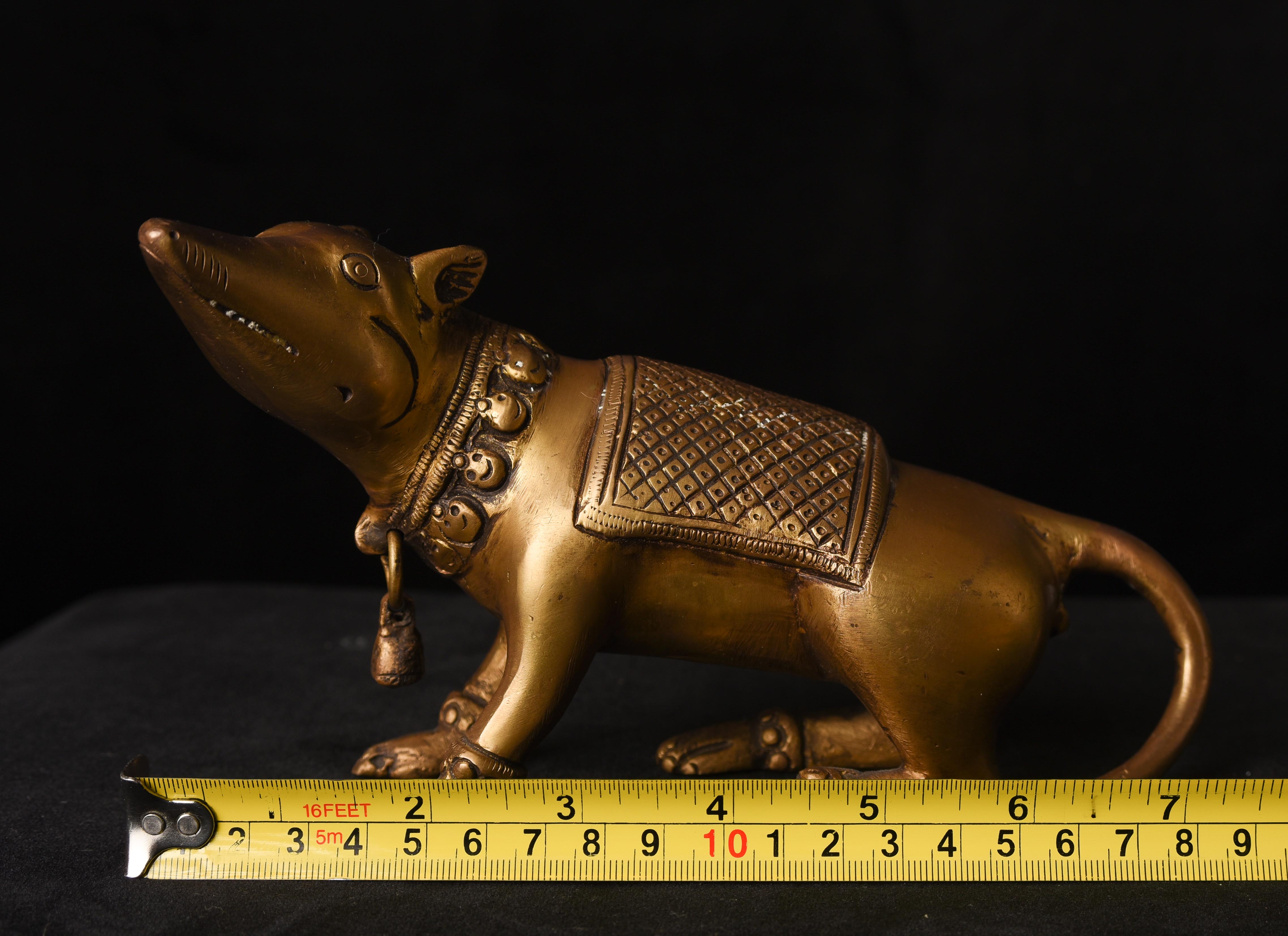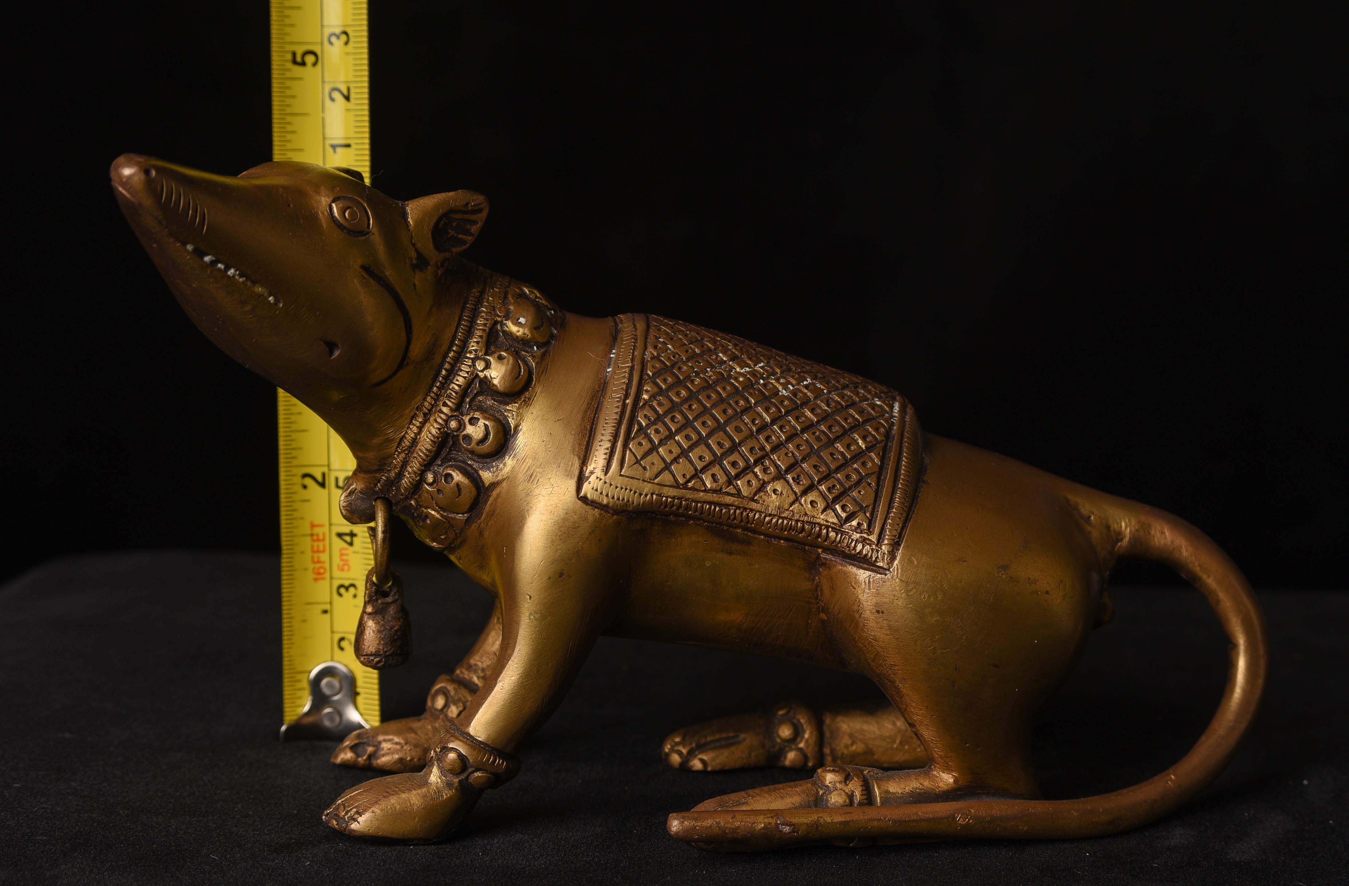 Something I've never come across before in all my years of collecting and dealing-a large solid cast rat- sidekick to Ganesh. This fellow has the stance of a devoted dog. The sculptor managed to turn his head in a way that makes him look almost alive. Note he is wearing a saddle , plus a necklace covered with skulls (look more like smiley faces) - 3.46lbs - 1.570kg _ 7.5"H x 4.25"W.