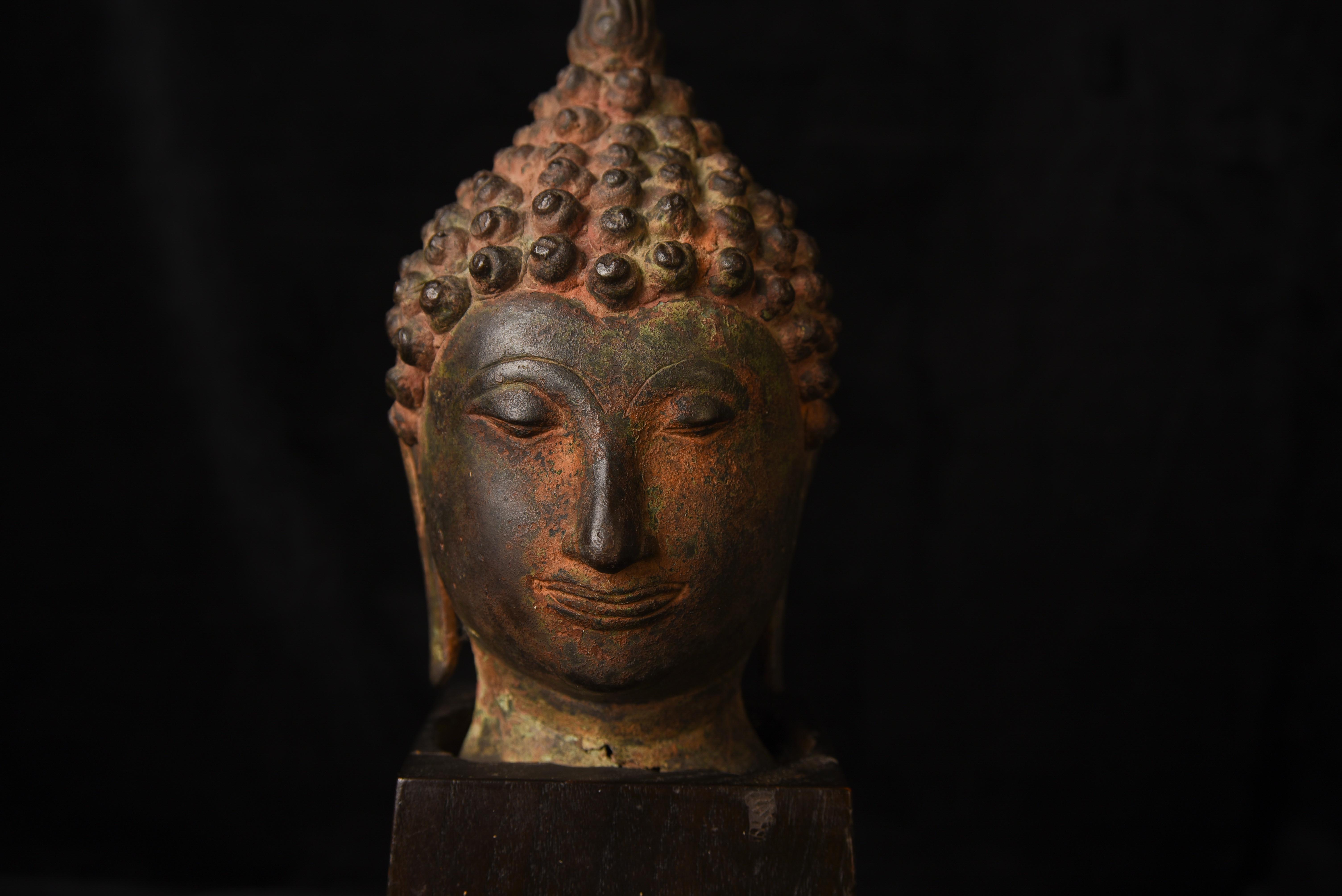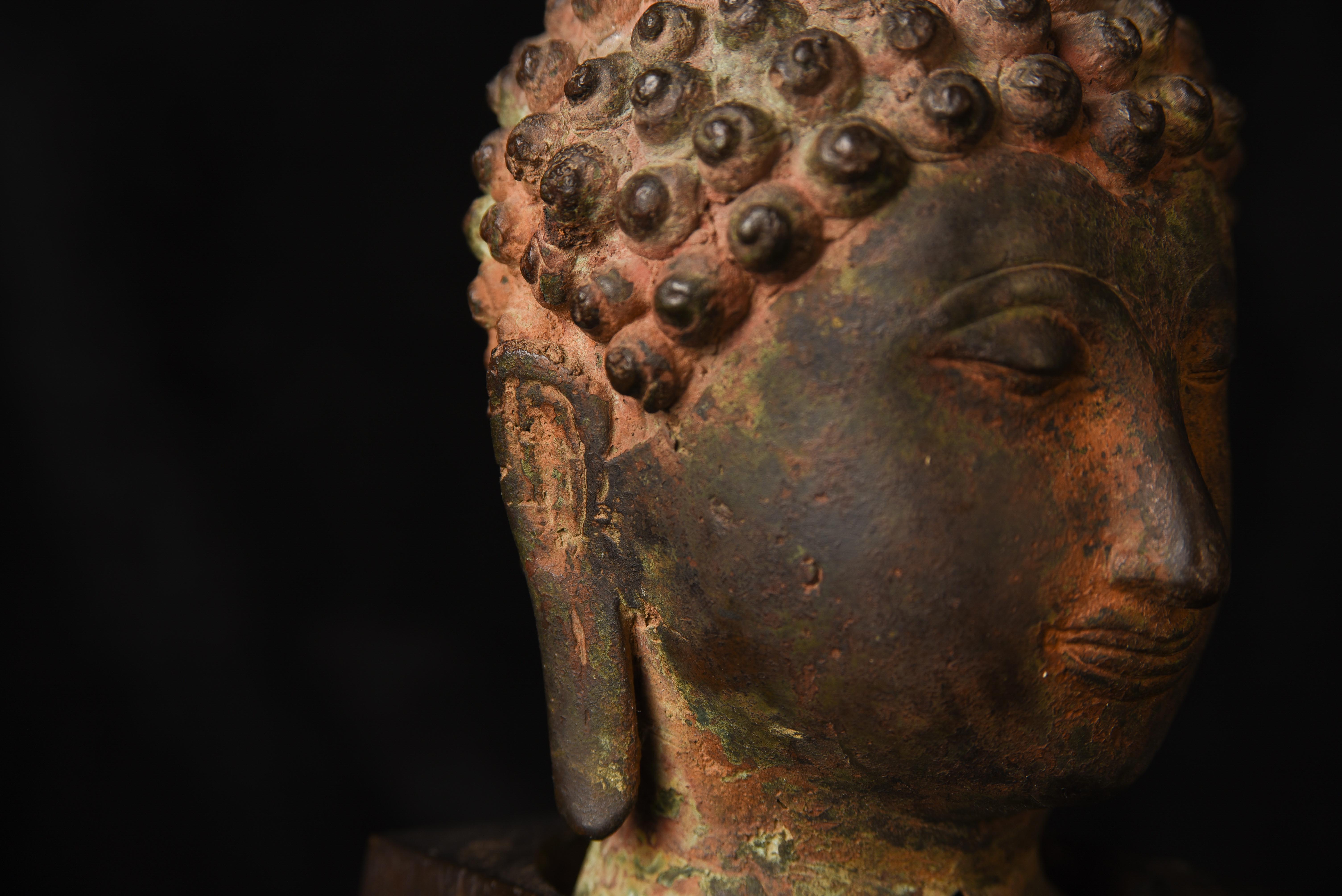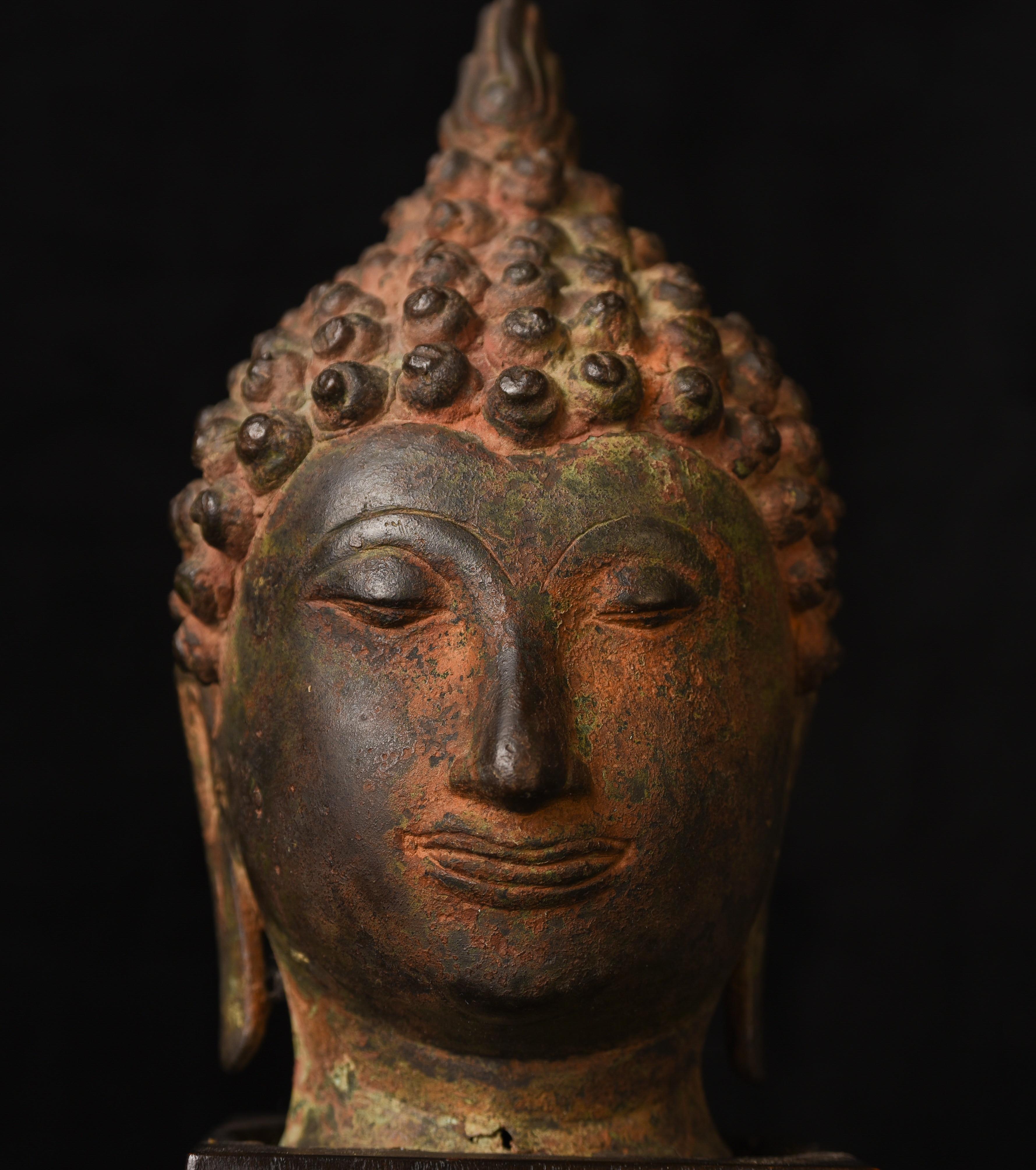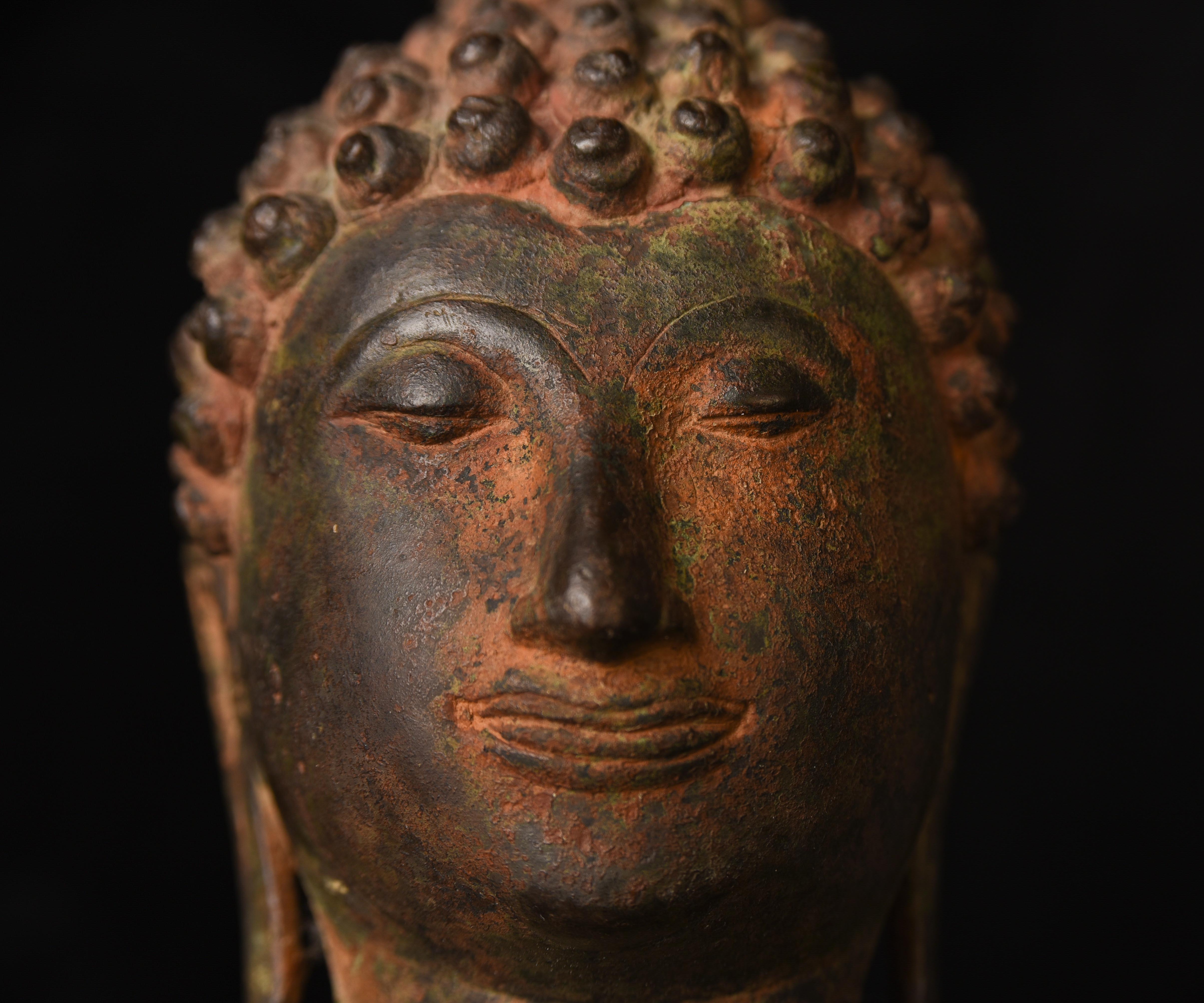 13/early 14thC Early Sukhothai Bronze Buddha Head. this head is extremely close to the large walking Buddha I have listed for sale on my site as item 8993. I described that item as: "EARLY (13th/early 14th C) Sukothai Walking Buddha-rounded body with defined buttocks, short, thick well formed limbs lead to elegant yet broad hands and wide thick feet.