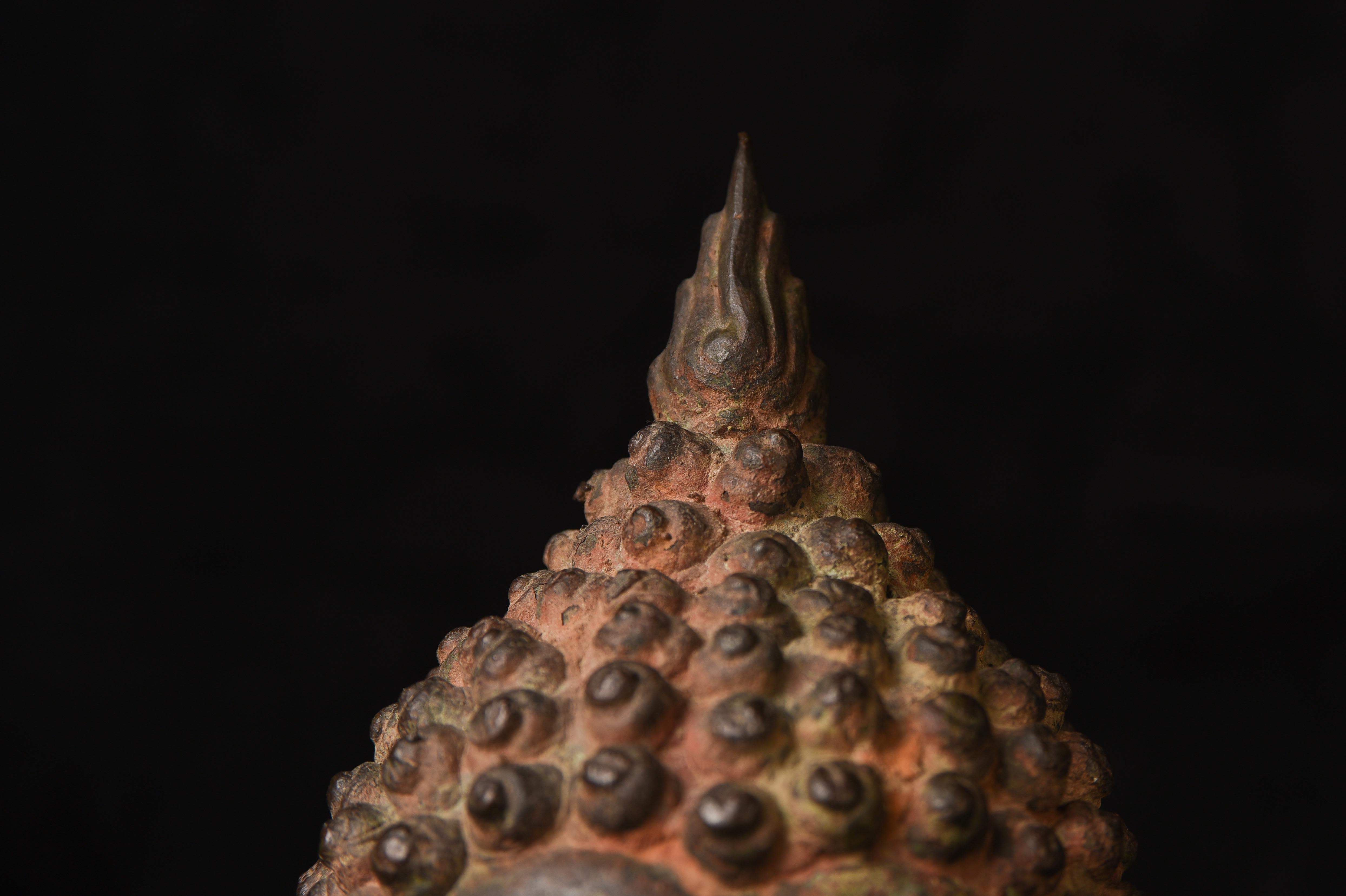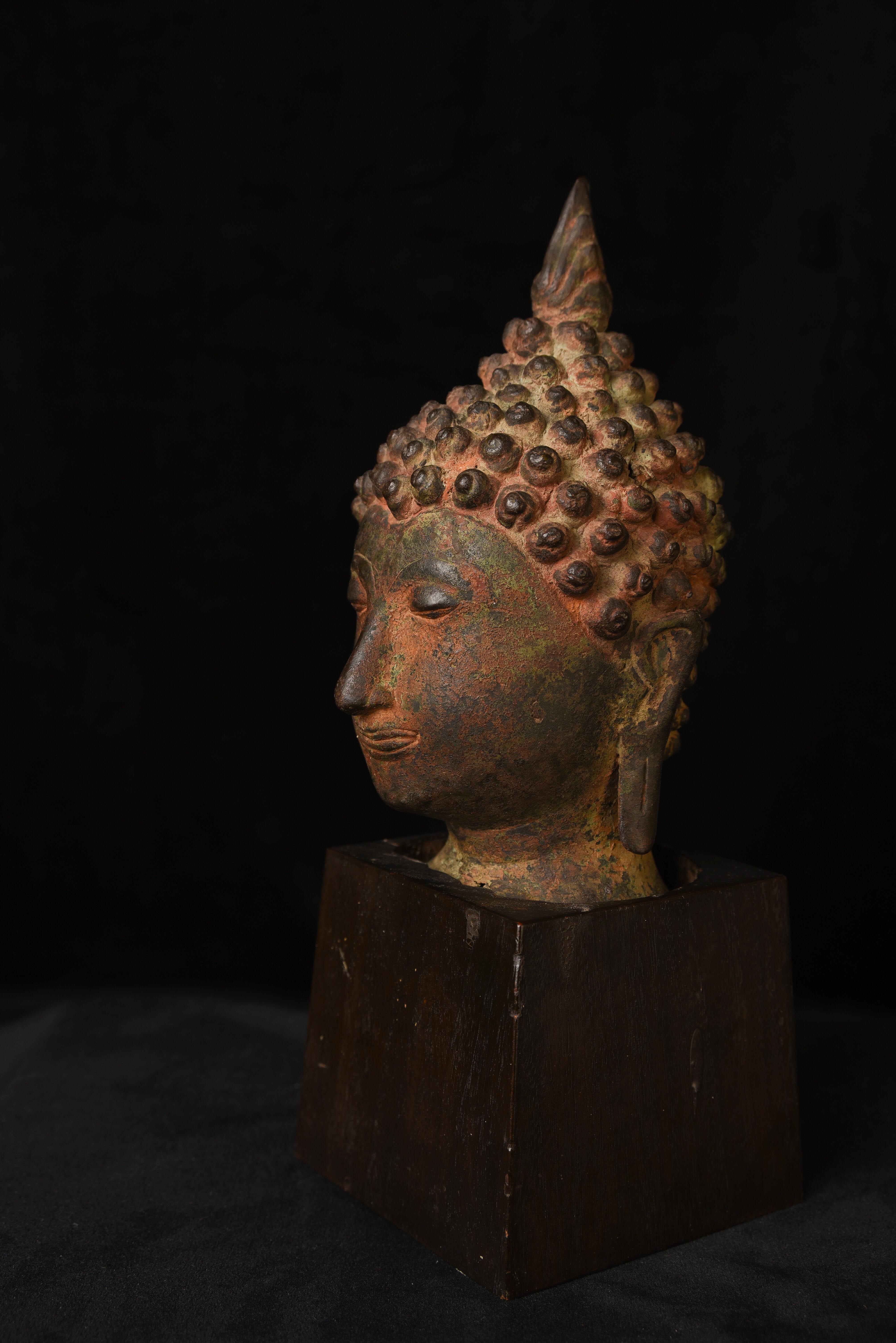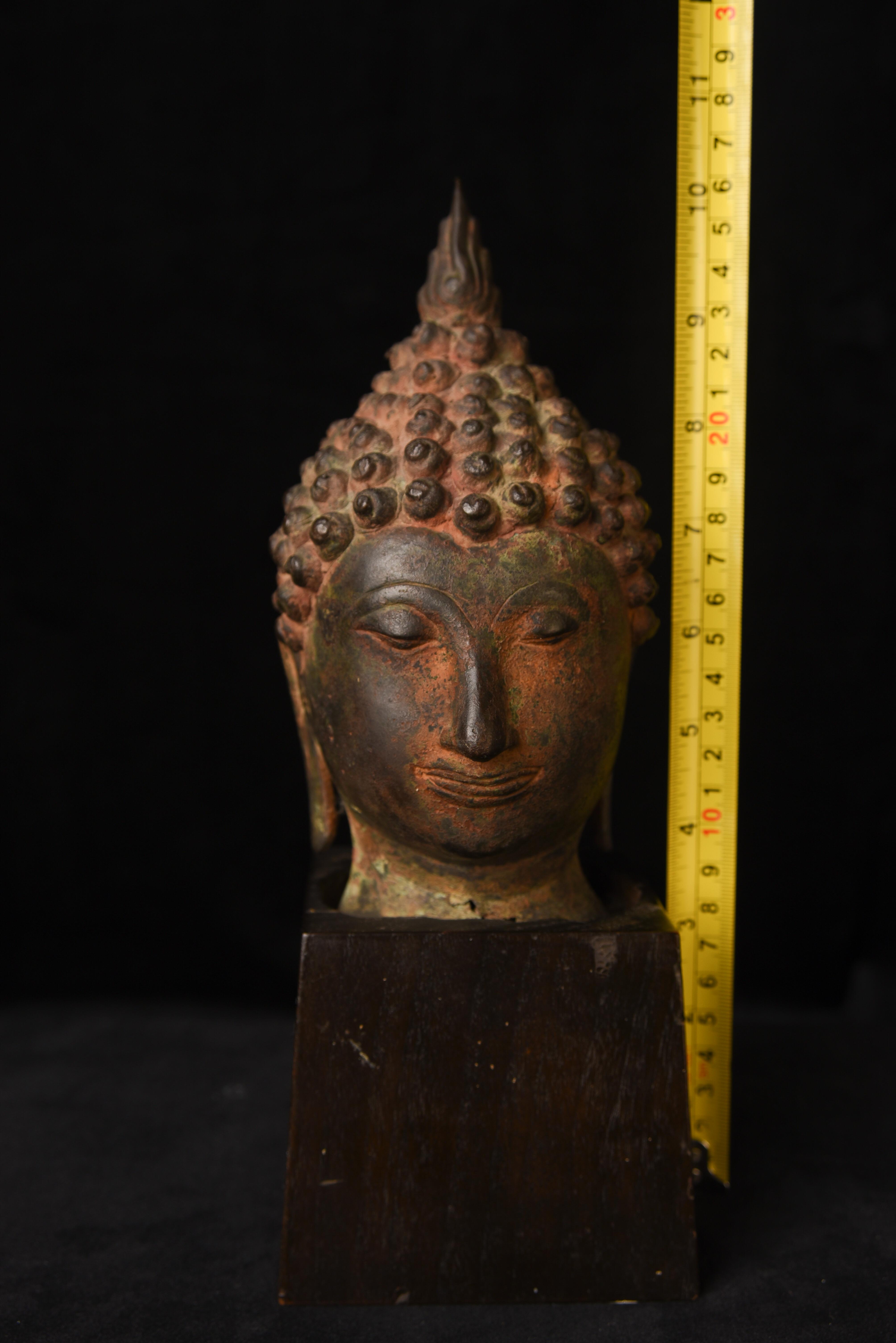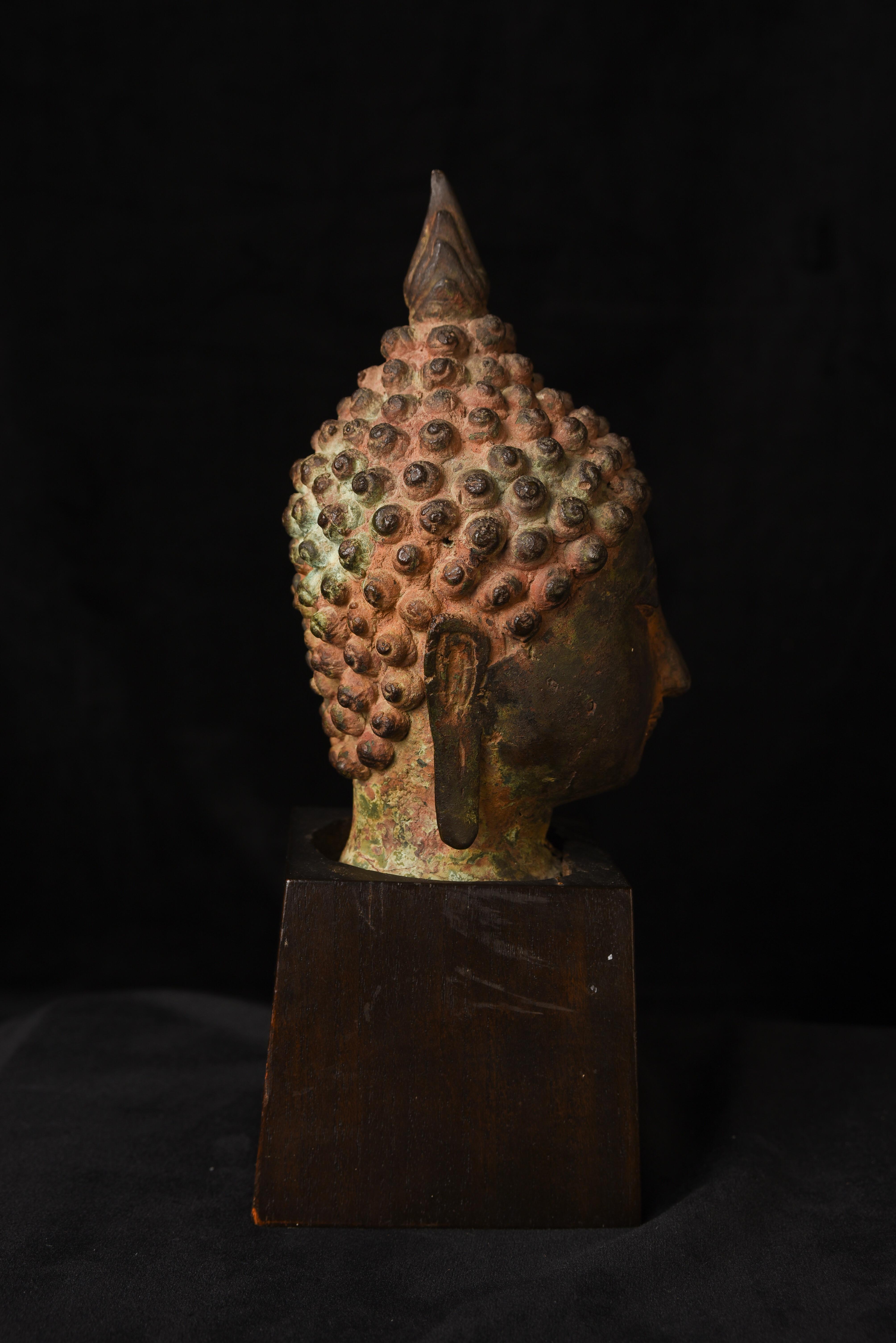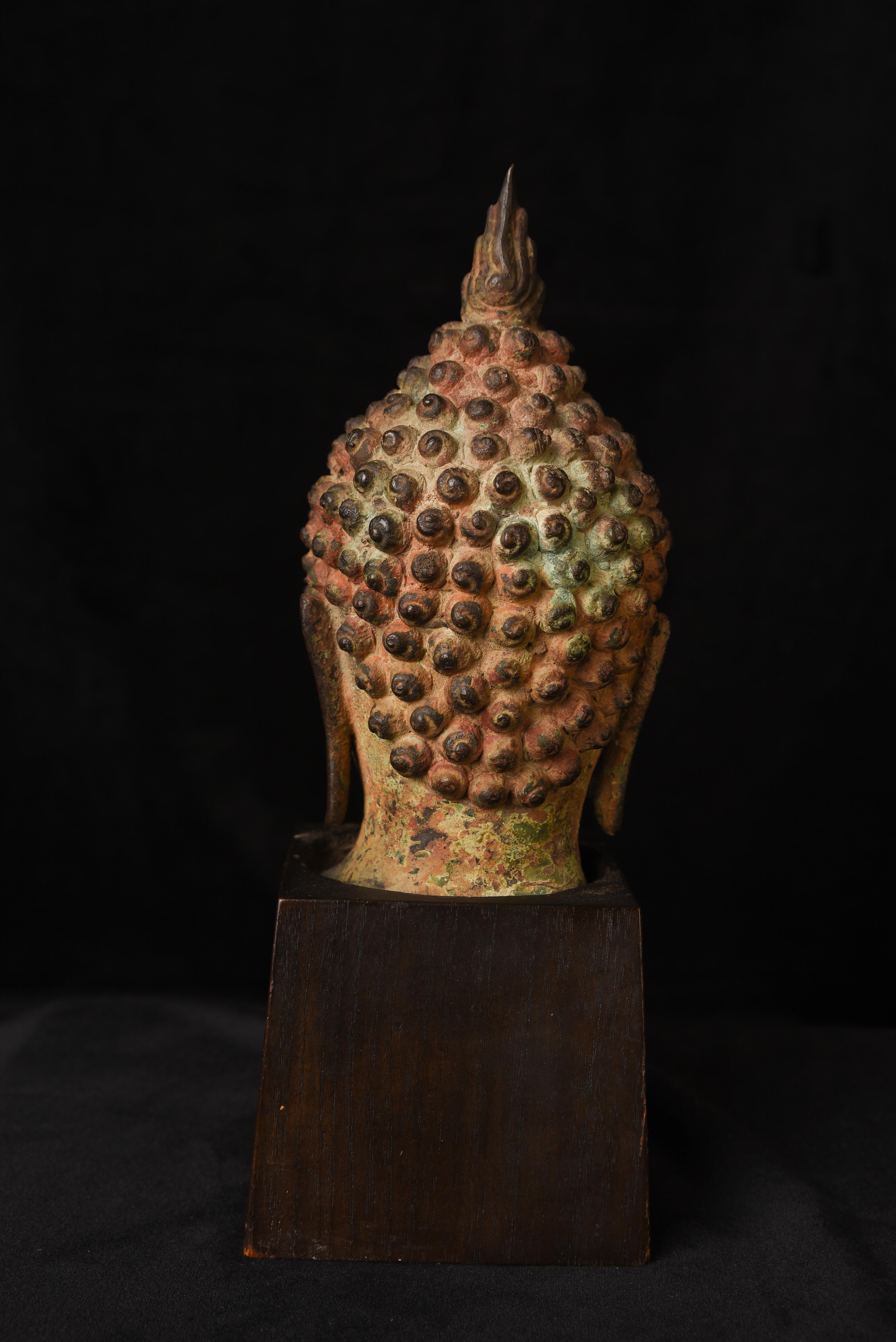 13/early 14thC Early Sukhothai Bronze Buddha Head. this head is extremely close to the large walking Buddha I have listed for sale on my site as item 8993. I described that item as: "EARLY (13th/early 14th C) Sukothai Walking Buddha-rounded body with defined buttocks, short, thick well formed limbs lead to elegant yet broad hands and wide thick feet.
