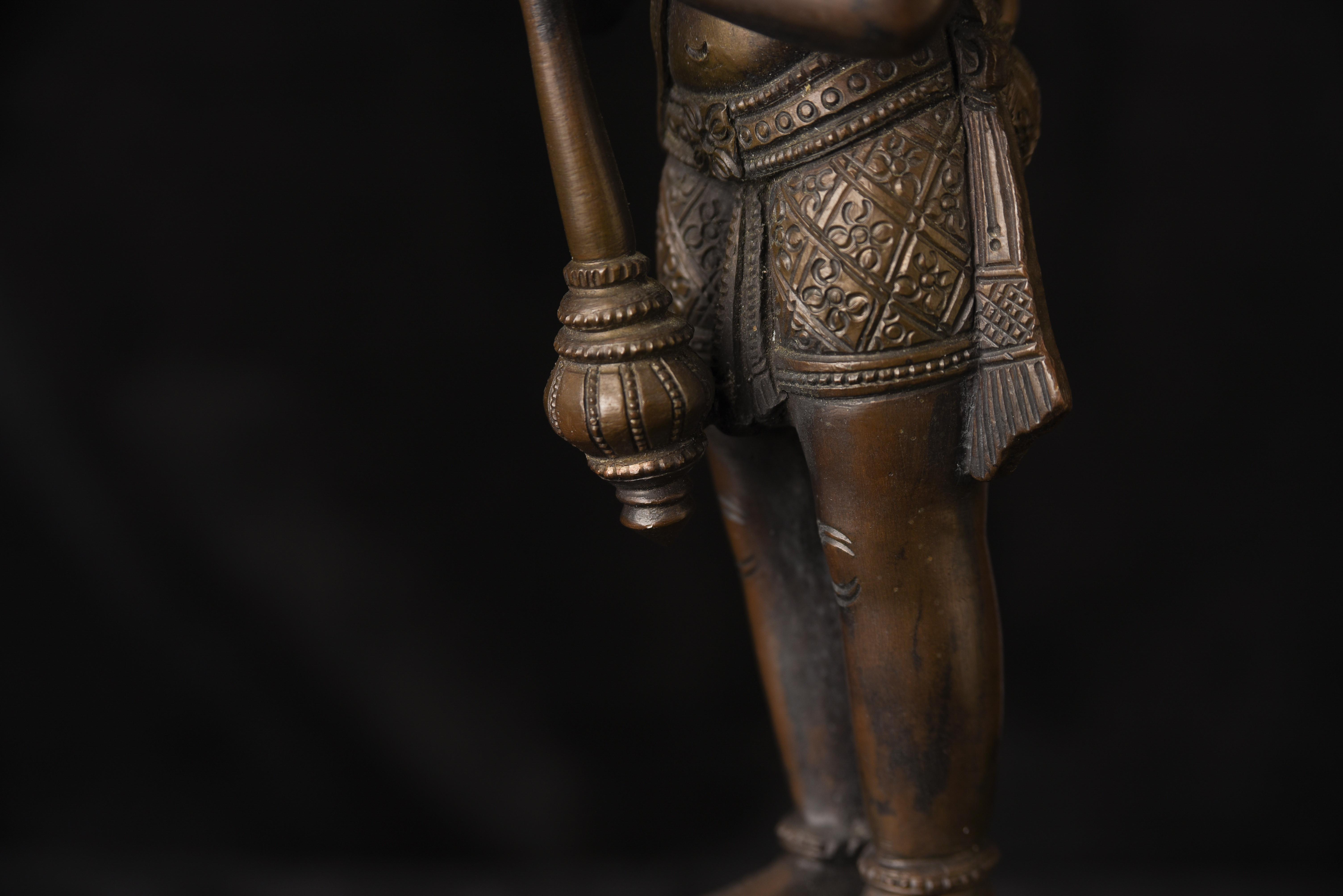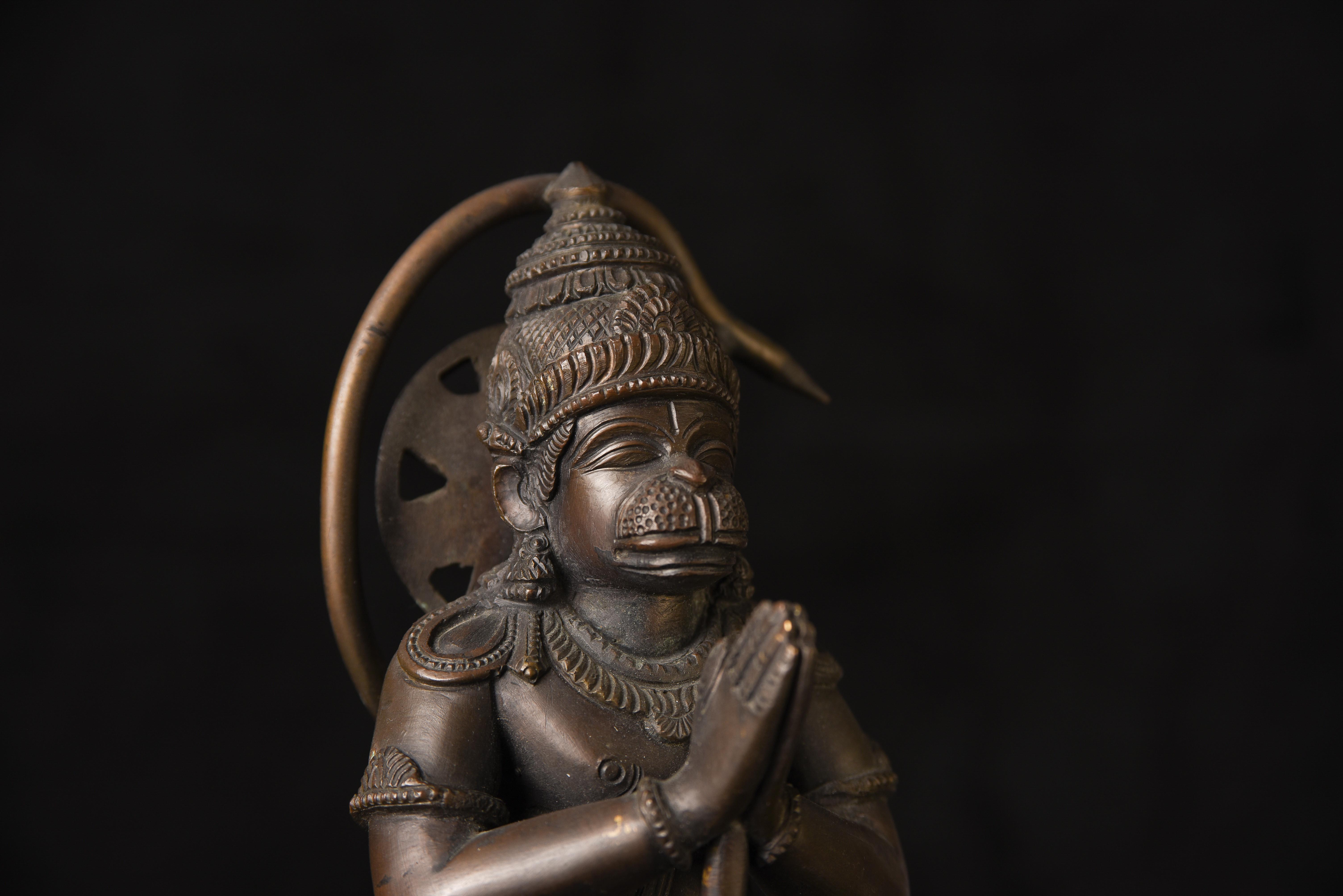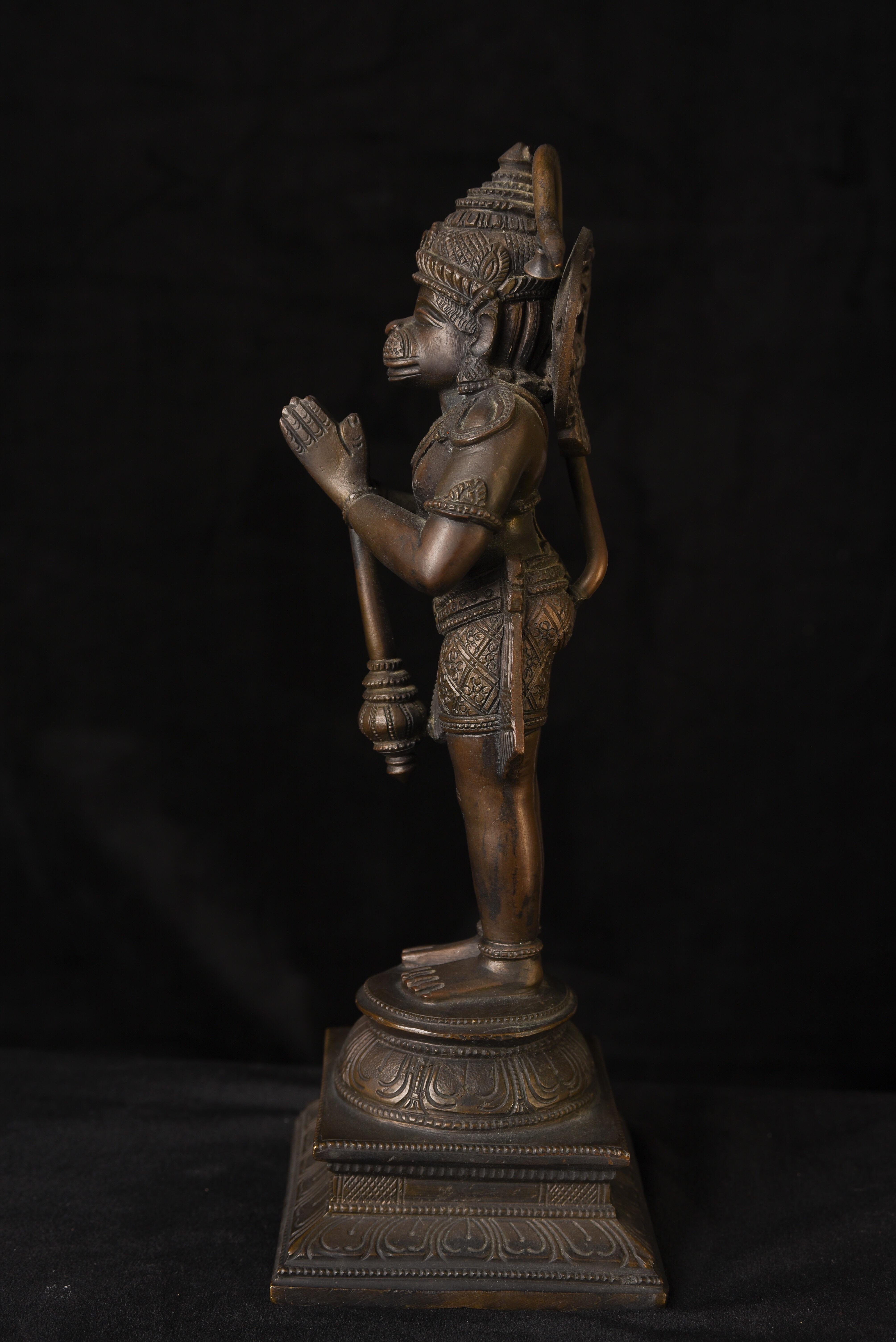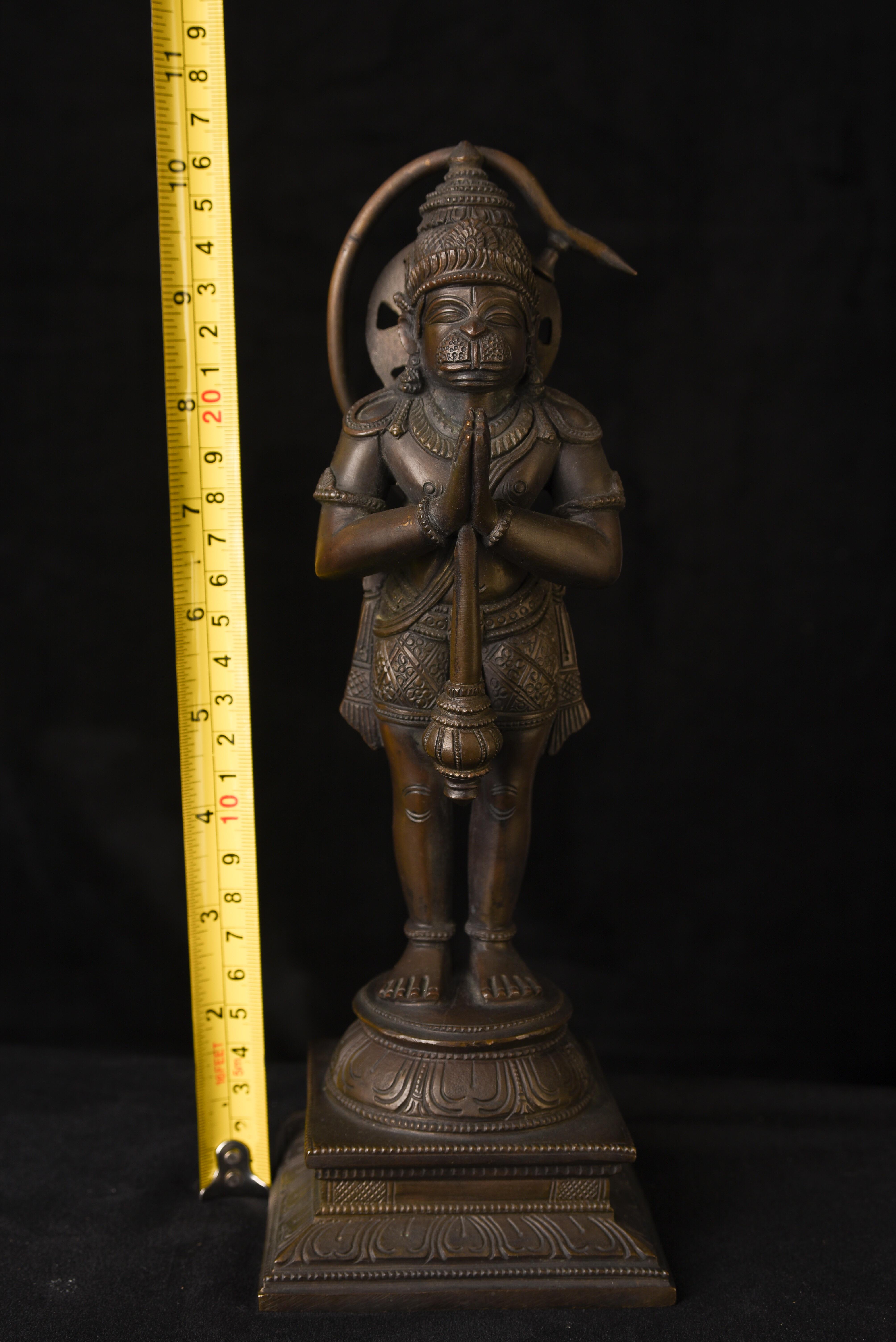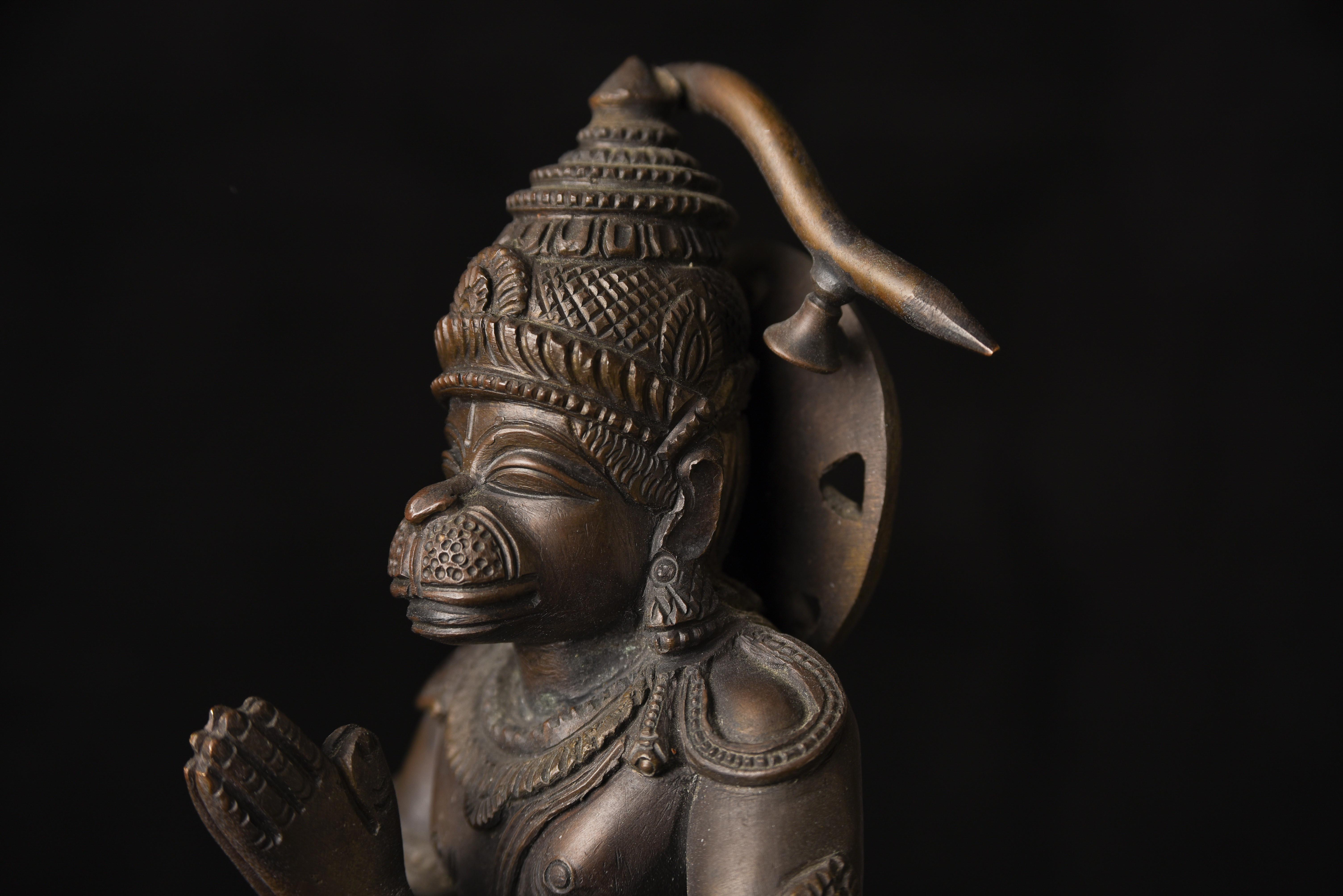 Vintage Hanuman, cast in bronze from India. Extremely well cast and sculpted in the classic way. He is shown as the spirit of service, which is an inspiring reminder. He is quite large and heavy. In 30 years I've only had 2 or 3 Hanuman sculptures of this massive size to offer, as Indian examples must be solid cast in order to meet the strict religious criteria. Any heavier than this and they become extremely difficult to cast in one solid piece and they become difficult to transport. - 5.13lbs - 2.325kg _ 10"H x 4"W.