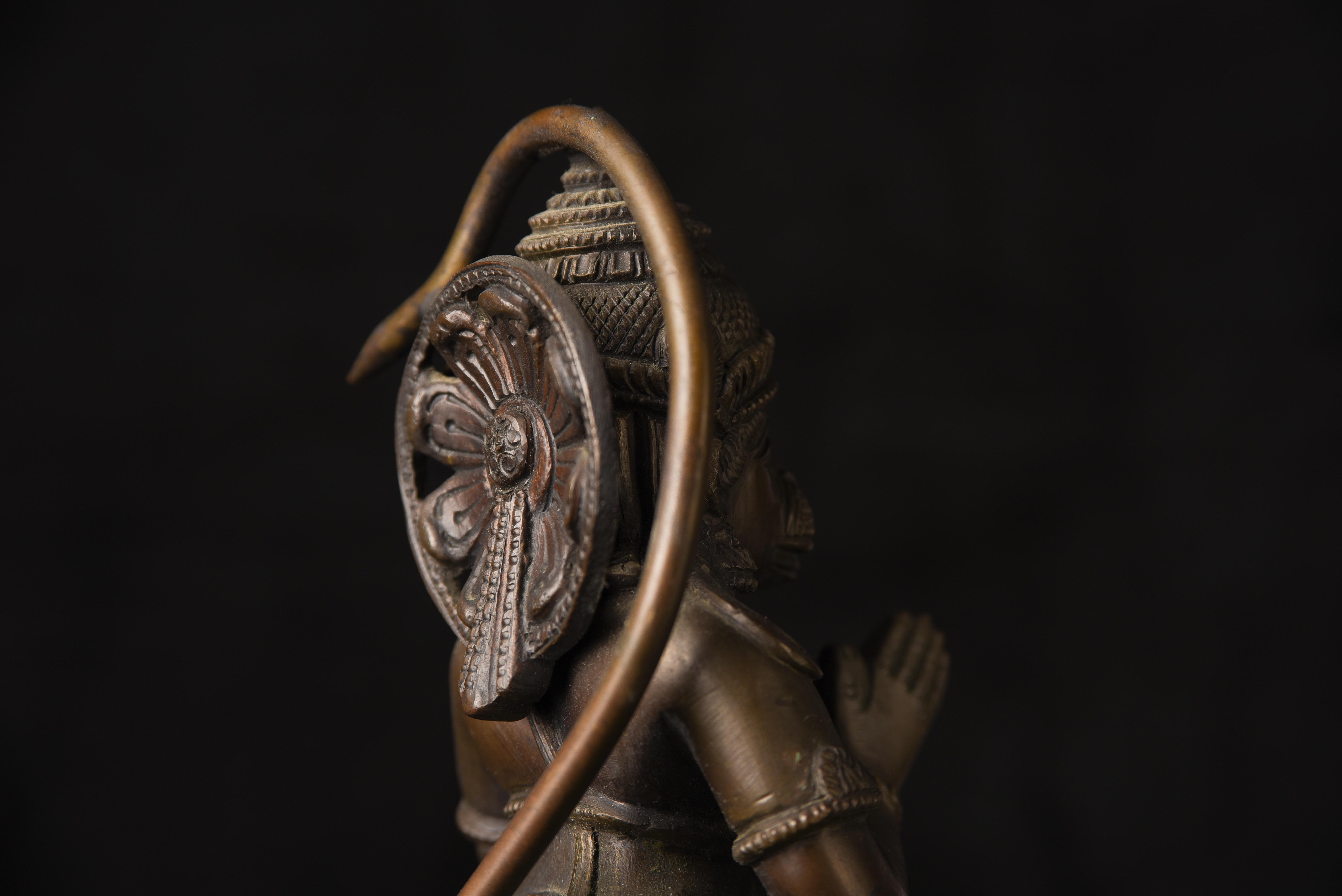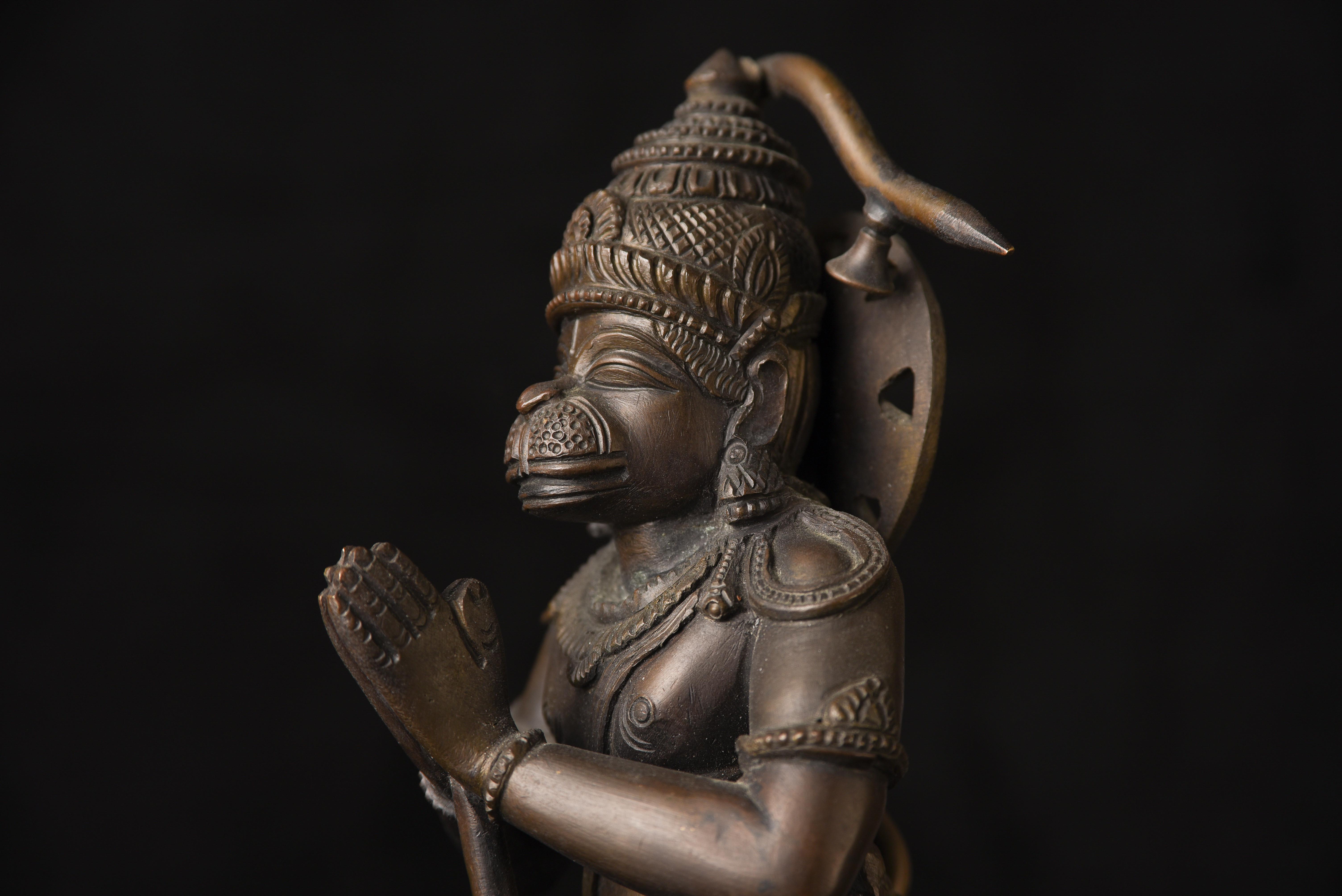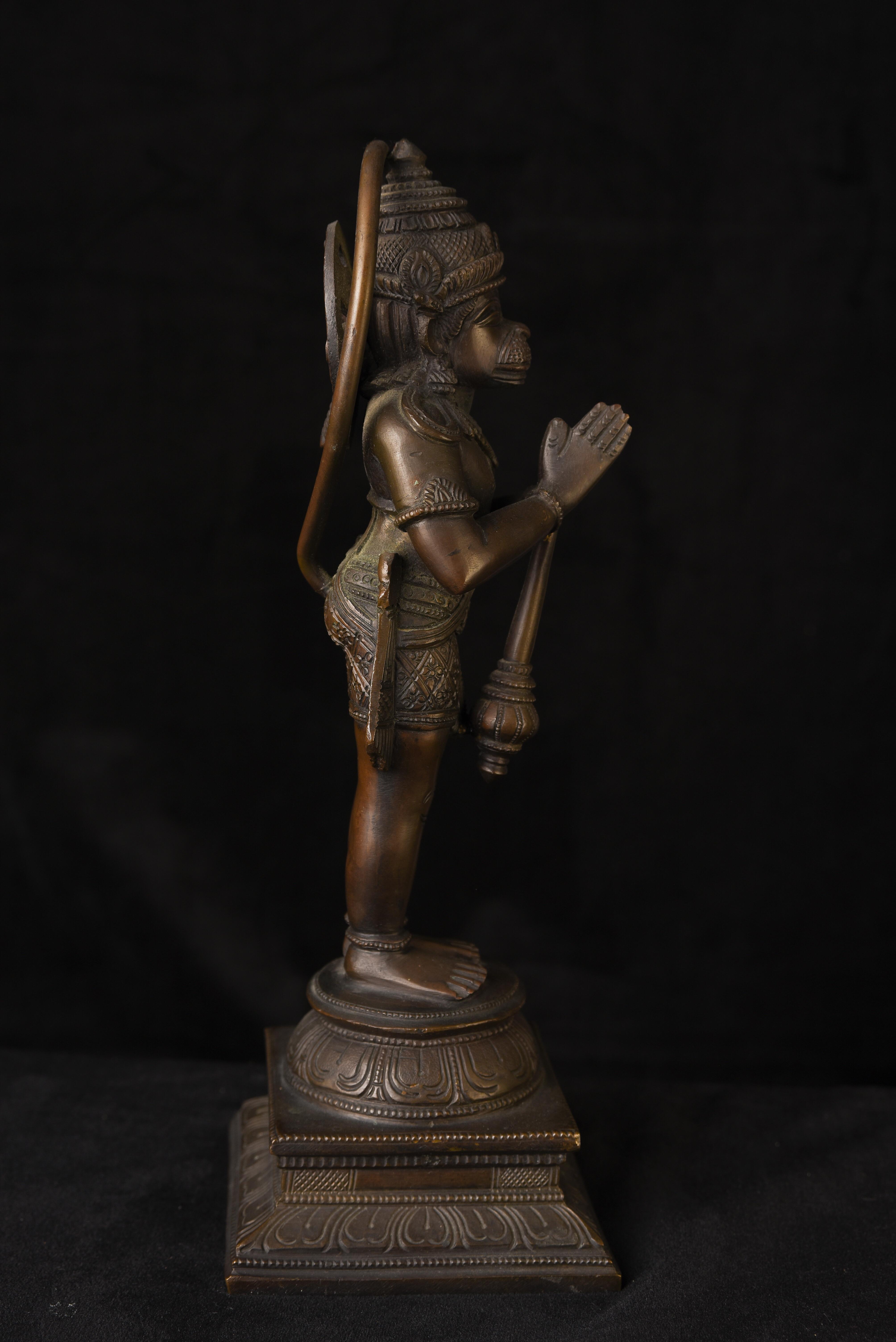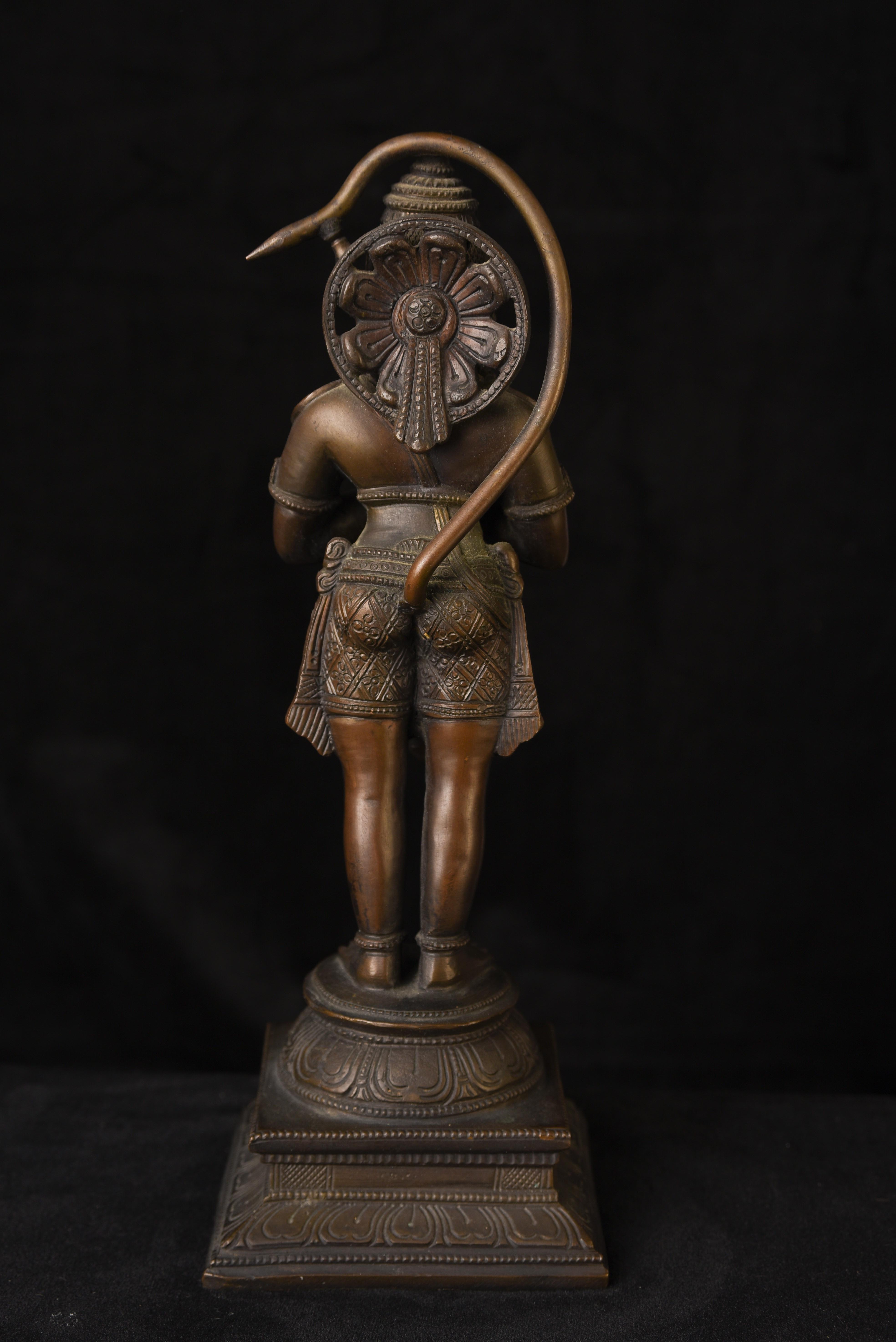 Vintage Hanuman, cast in bronze from India. Extremely well cast and sculpted in the classic way. He is shown as the spirit of service, which is an inspiring reminder. He is quite large and heavy. In 30 years I've only had 2 or 3 Hanuman sculptures of this massive size to offer, as Indian examples must be solid cast in order to meet the strict religious criteria. Any heavier than this and they become extremely difficult to cast in one solid piece and they become difficult to transport. - 5.13lbs - 2.325kg _ 10"H x 4"W.
