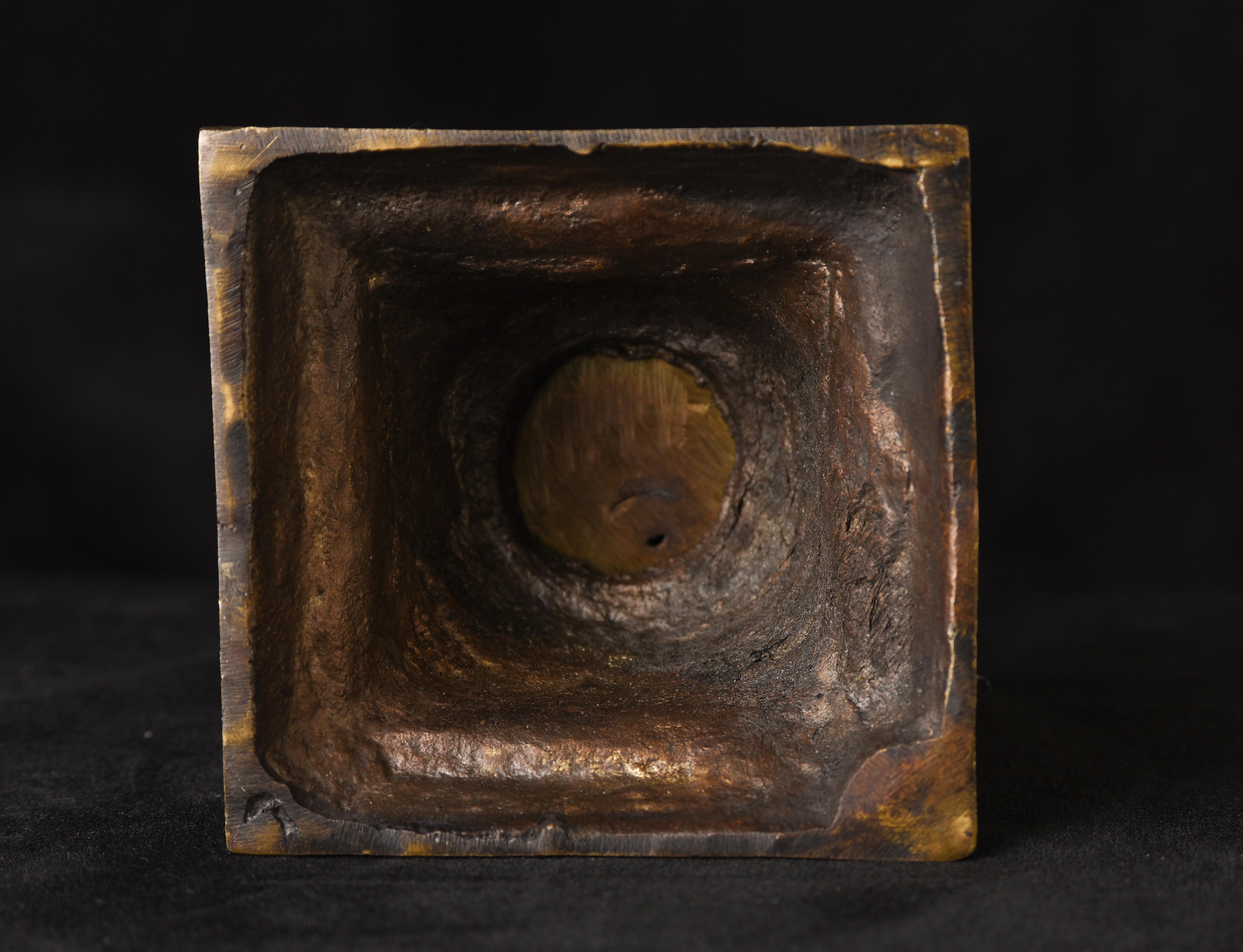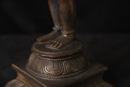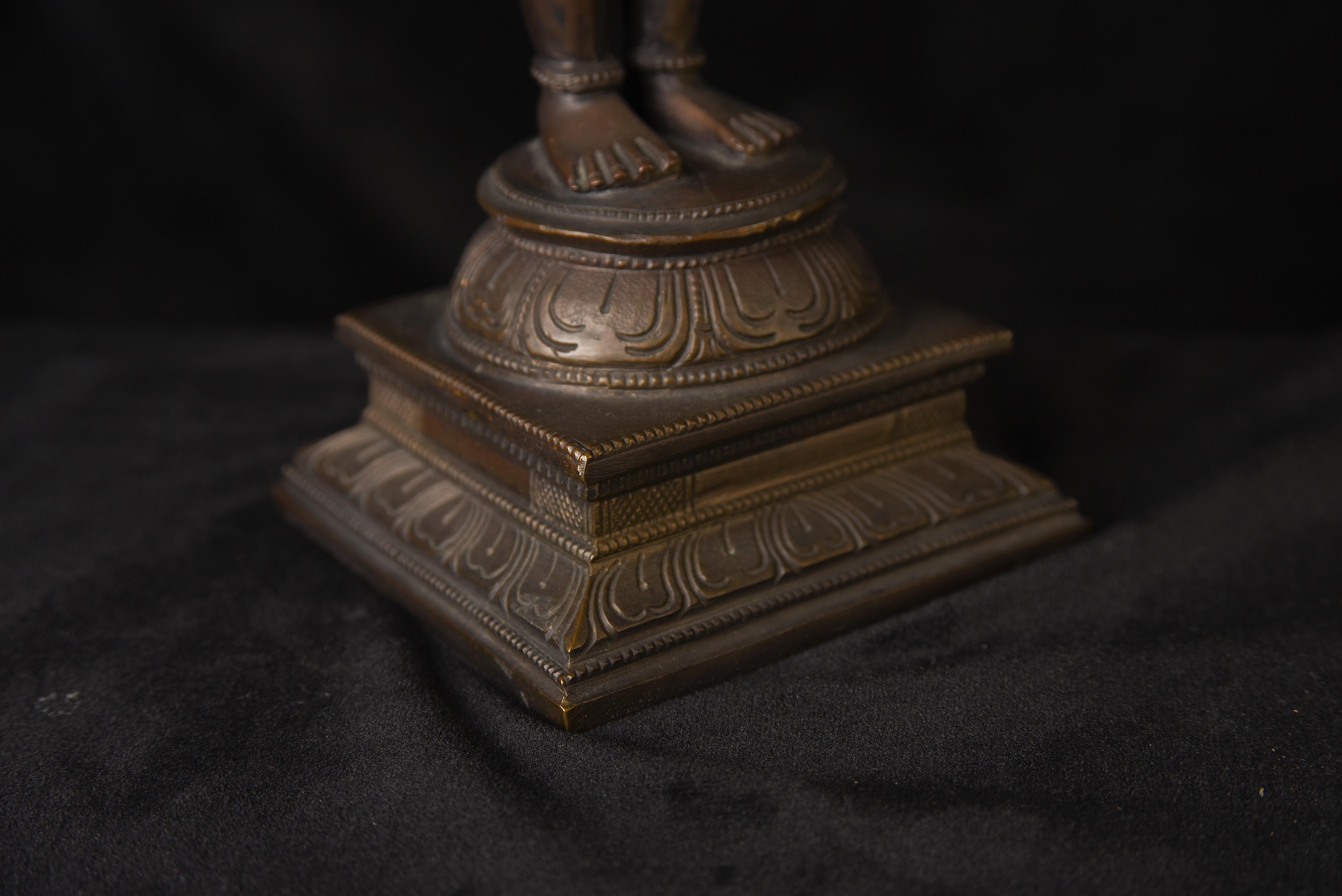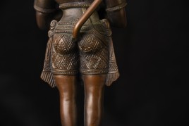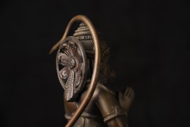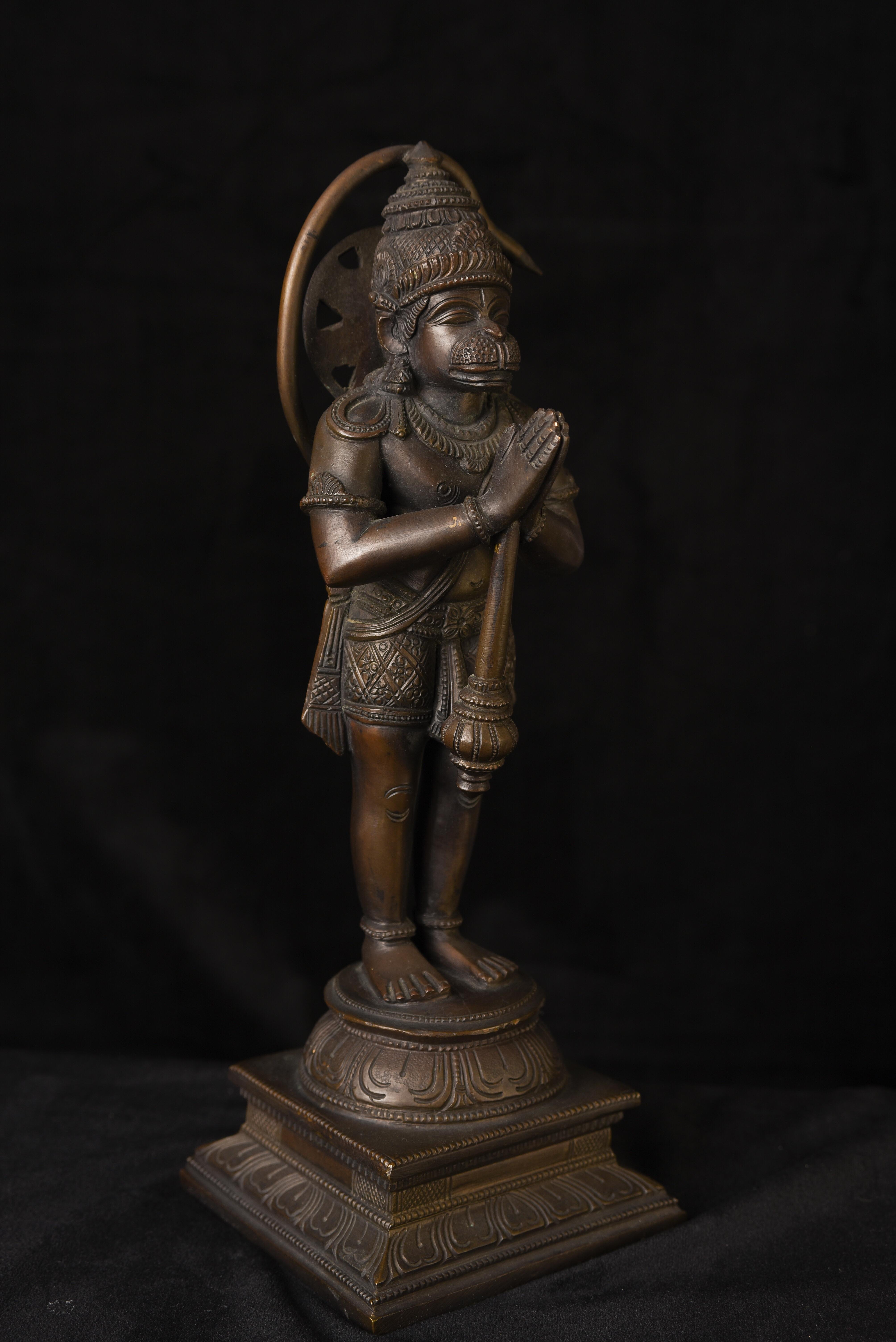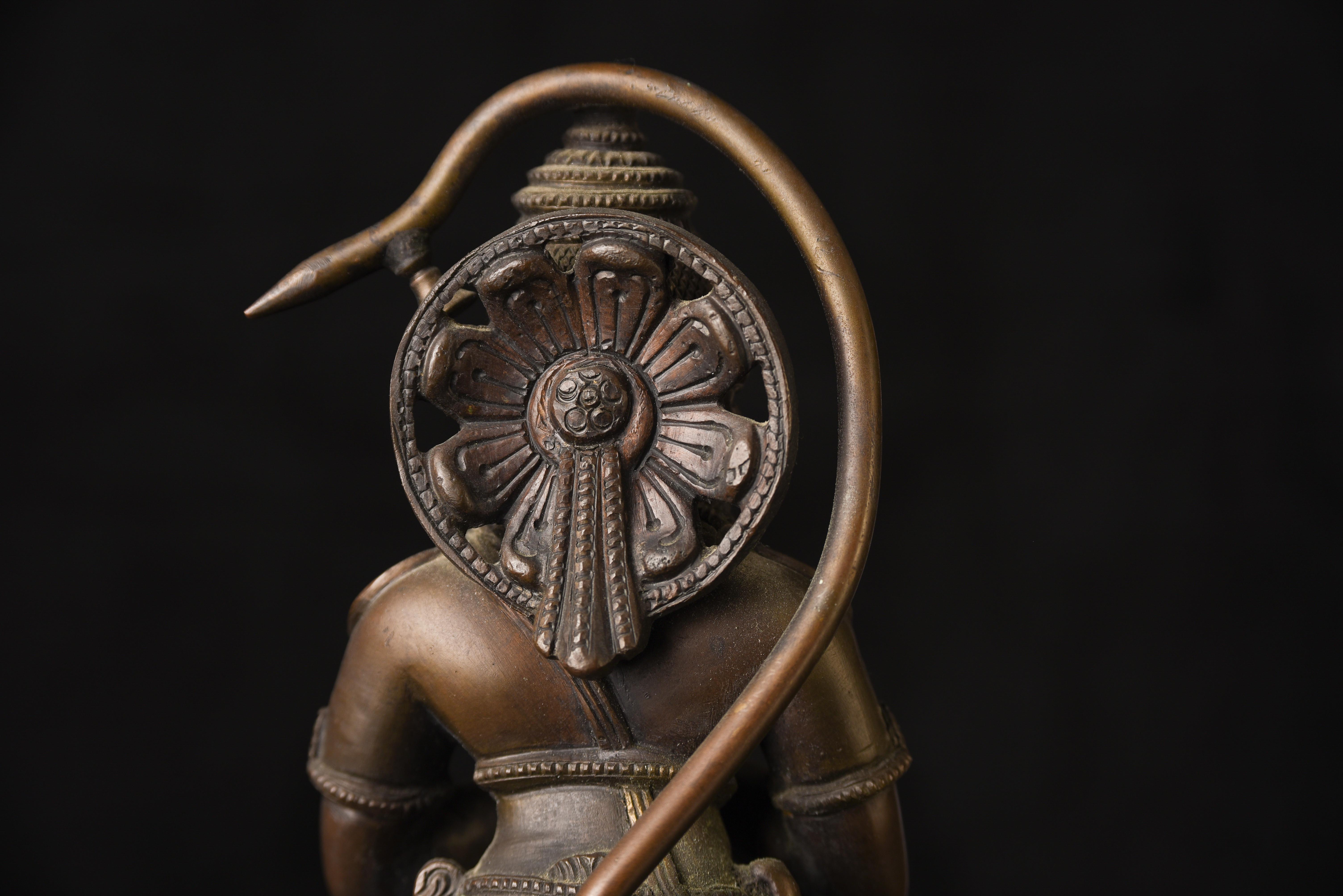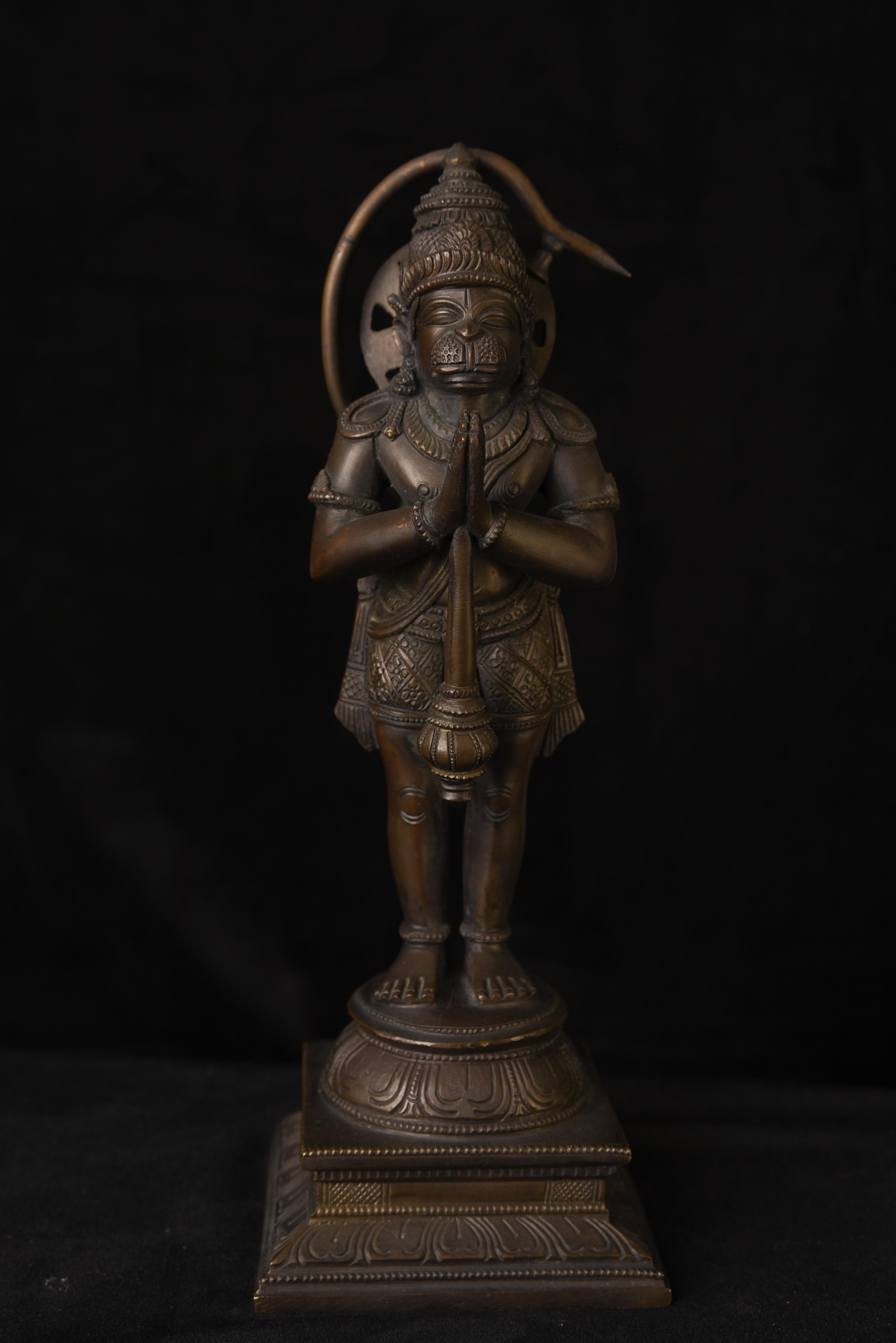 Vintage Hanuman, cast in bronze from India. Extremely well cast and sculpted in the classic way. He is shown as the spirit of service, which is an inspiring reminder. He is quite large and heavy. In 30 years I've only had 2 or 3 Hanuman sculptures of this massive size to offer, as Indian examples must be solid cast in order to meet the strict religious criteria. Any heavier than this and they become extremely difficult to cast in one solid piece and they become difficult to transport. - 5.13lbs - 2.325kg _ 10"H x 4"W.