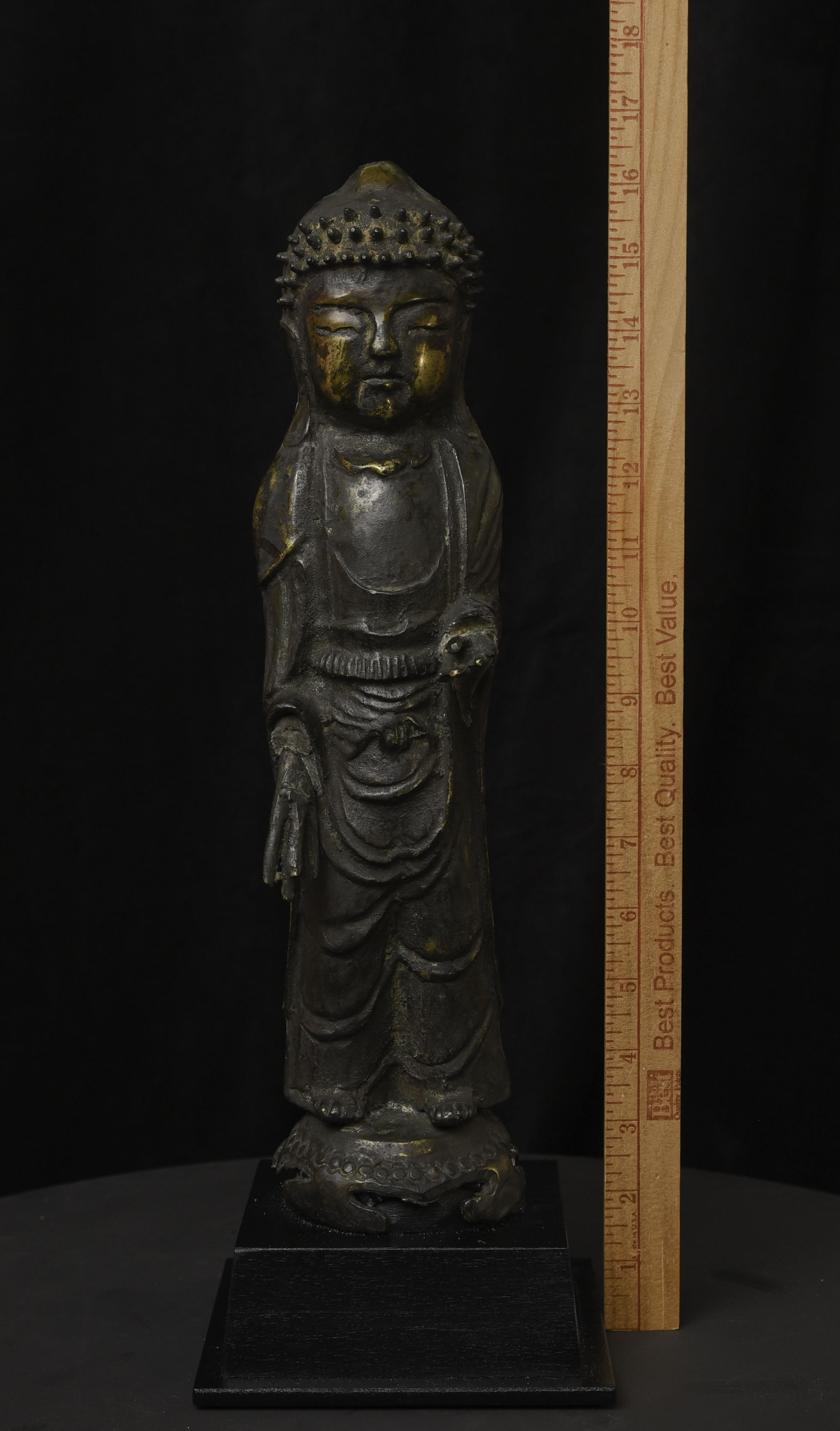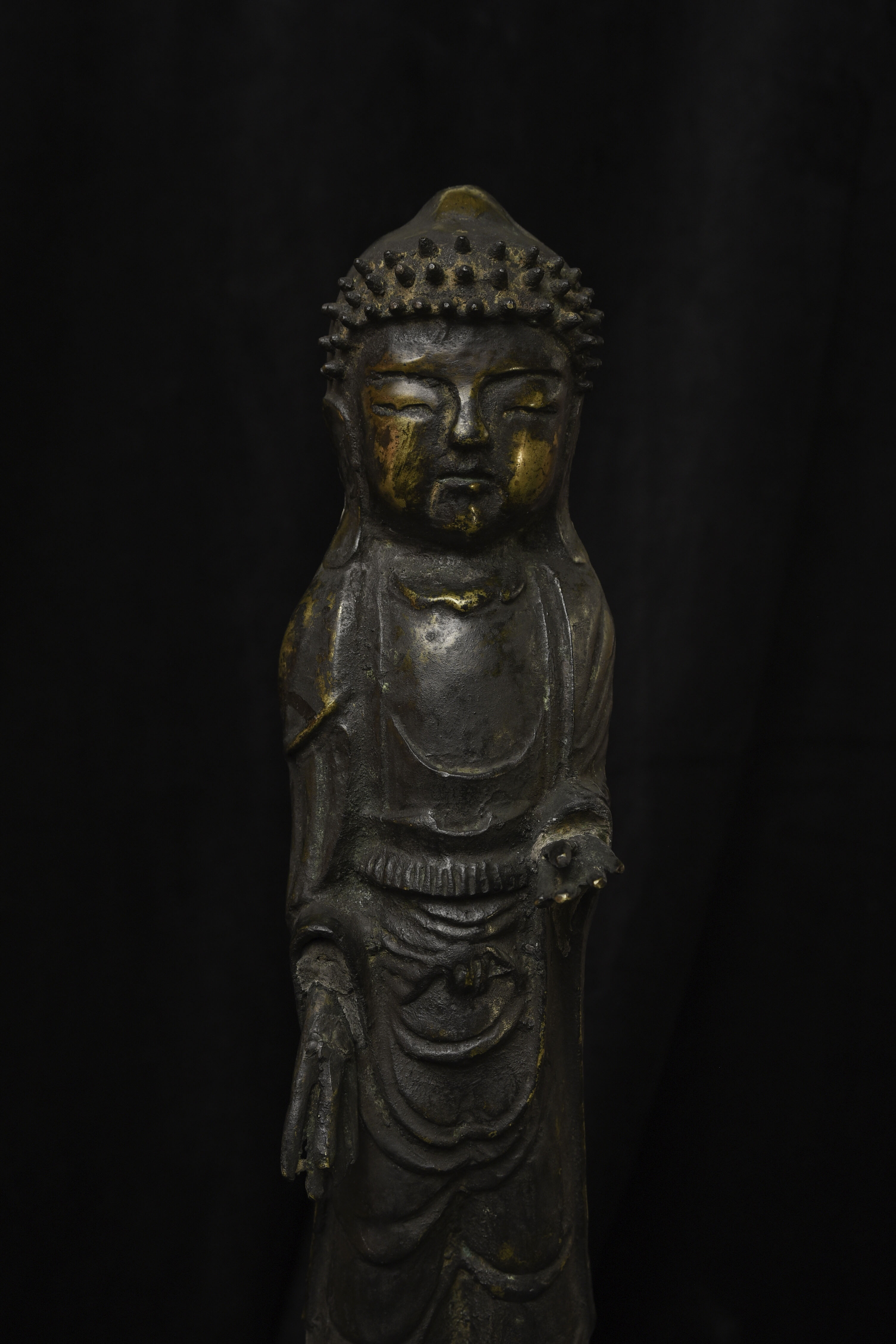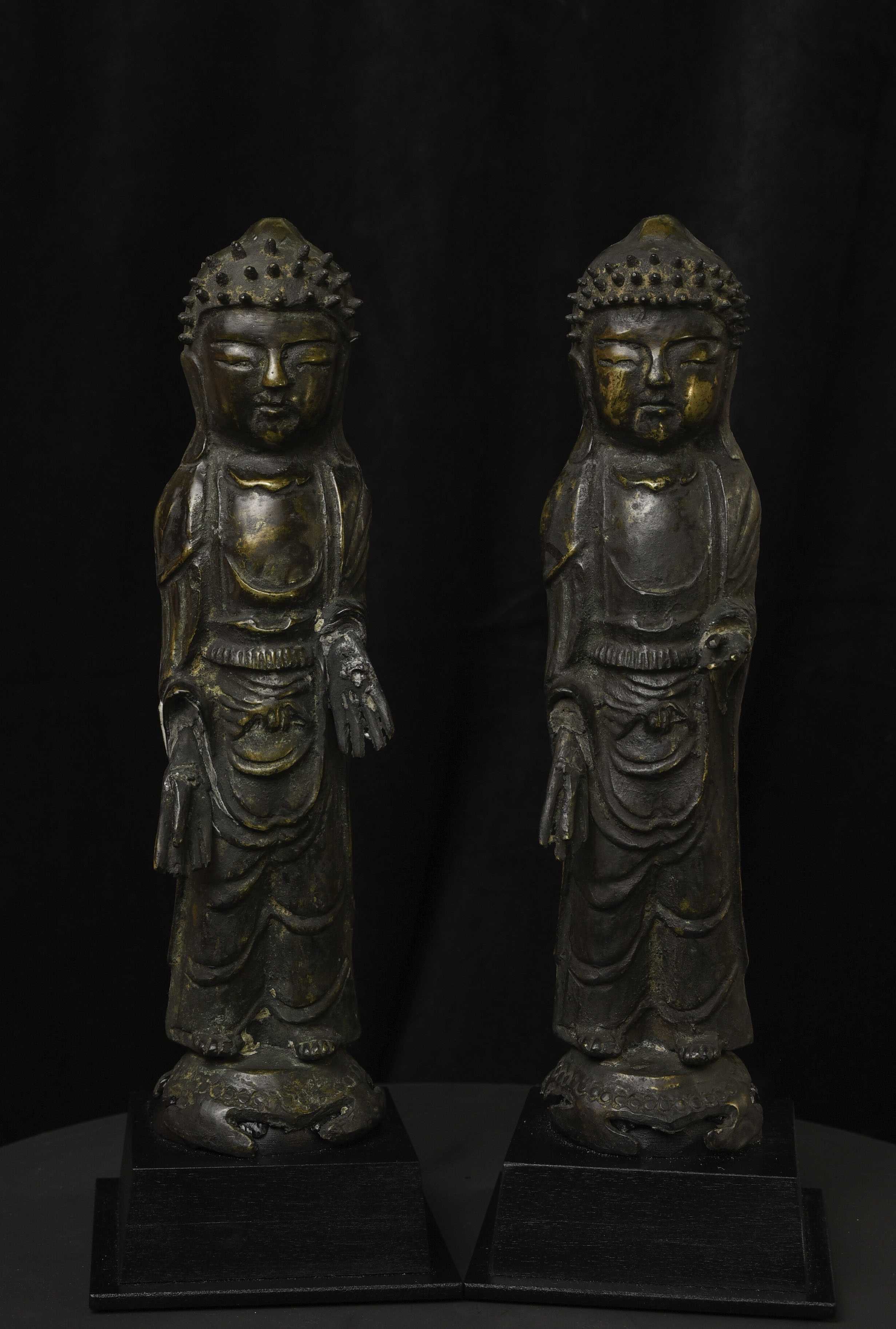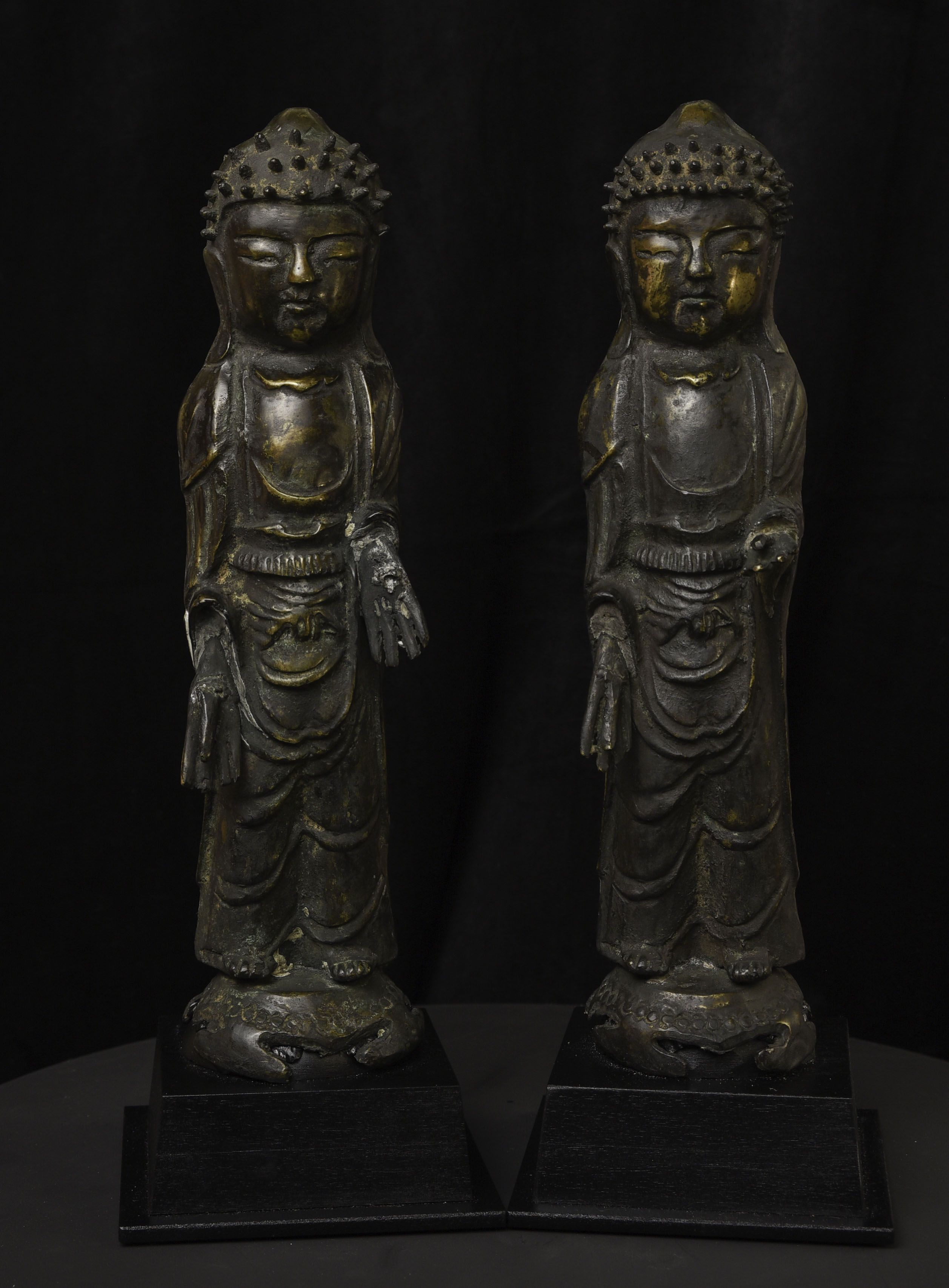 This is a very distinctive 13-15th-century standing bronze Korean Buddha. As you can see in the photos, there is a very closely related companion piece, which I am selling on my website as well. My strong preference is that I sell them together, but based on past experience I am offering them separately so that people have the option of considering them apart. I've never seen a pair like this, and I doubt that very few search closely related pairs exist in the world, especially in such complete condition with their original hands and bases. They are cast in a delightful provincial Style, which at first is deceptively simple and crude. The reality is that the sculptor has managed to create very successful spiritual statues that convey powerful imagery- as powerful as many of the most refined images. just look into the face of this Buddha and its companion. When I first saw this very distinctive standing Buddha and its counterpart, I immediately thought of Buddha Number 9020 on my website (thebuddhagallery.com). If you look at the photos below, you will see one of them that has 9020 alongside this one and its companion piece. As you can see they have a tremendous amount in common, from their oversized heads to the distinctive look and shape of their faces, to the way their robes drape to the way their bases are attached, to the way their backs are open, etc etc. You can see approximately what the backs would look like by looking at the back of 9020, though that statute was made of iron and is of a very different patina.14"H x 3.5"W not including the new custom base.
