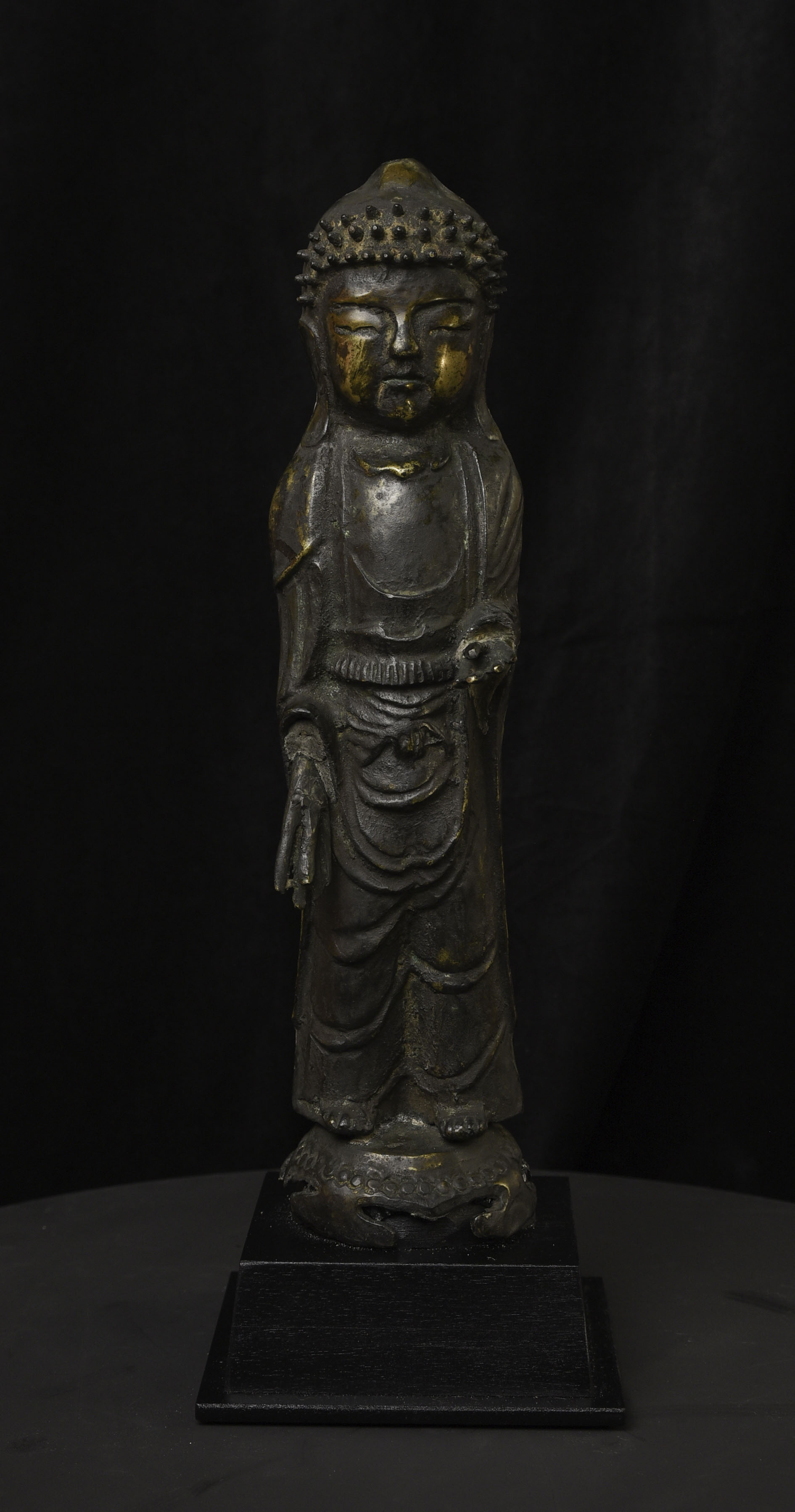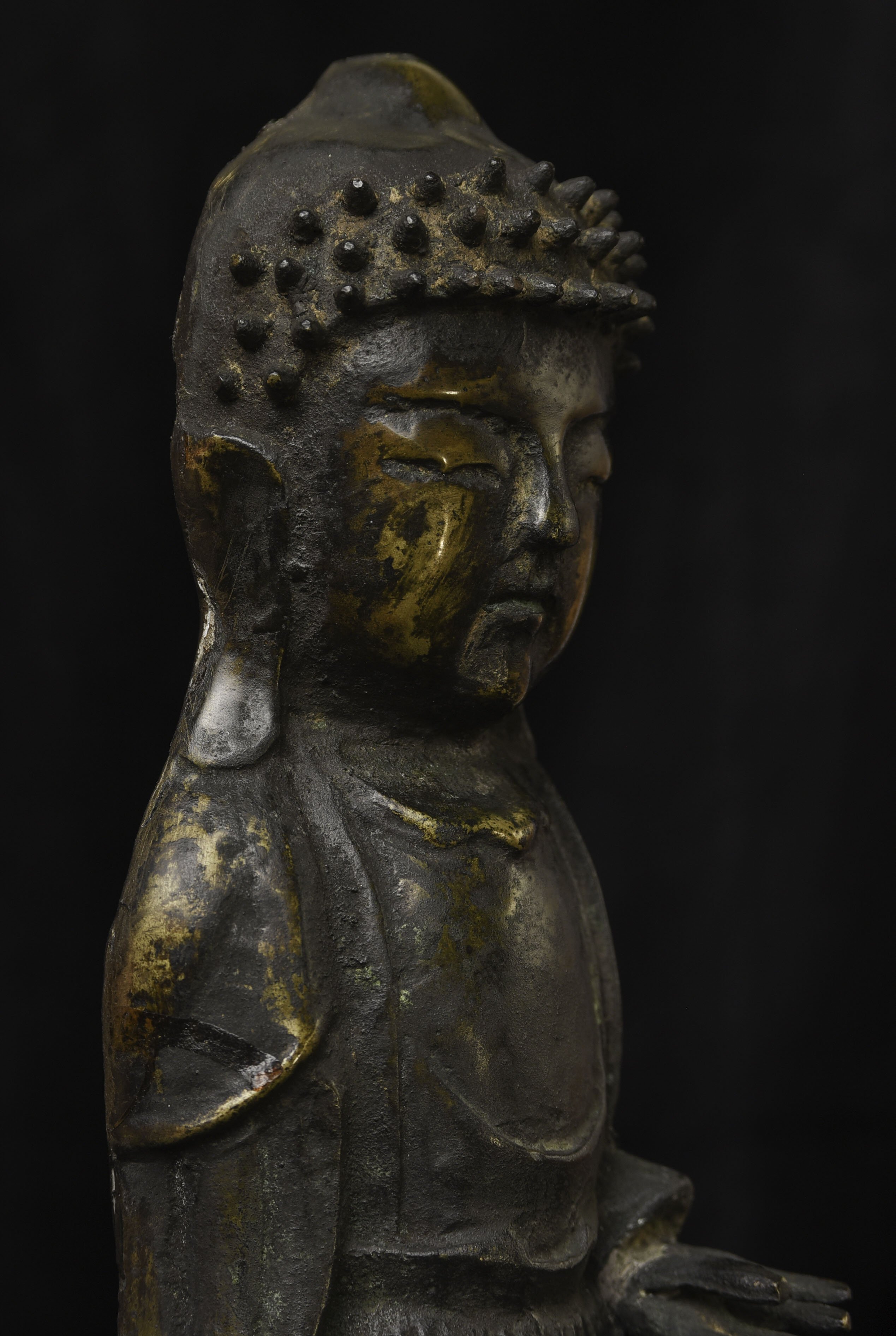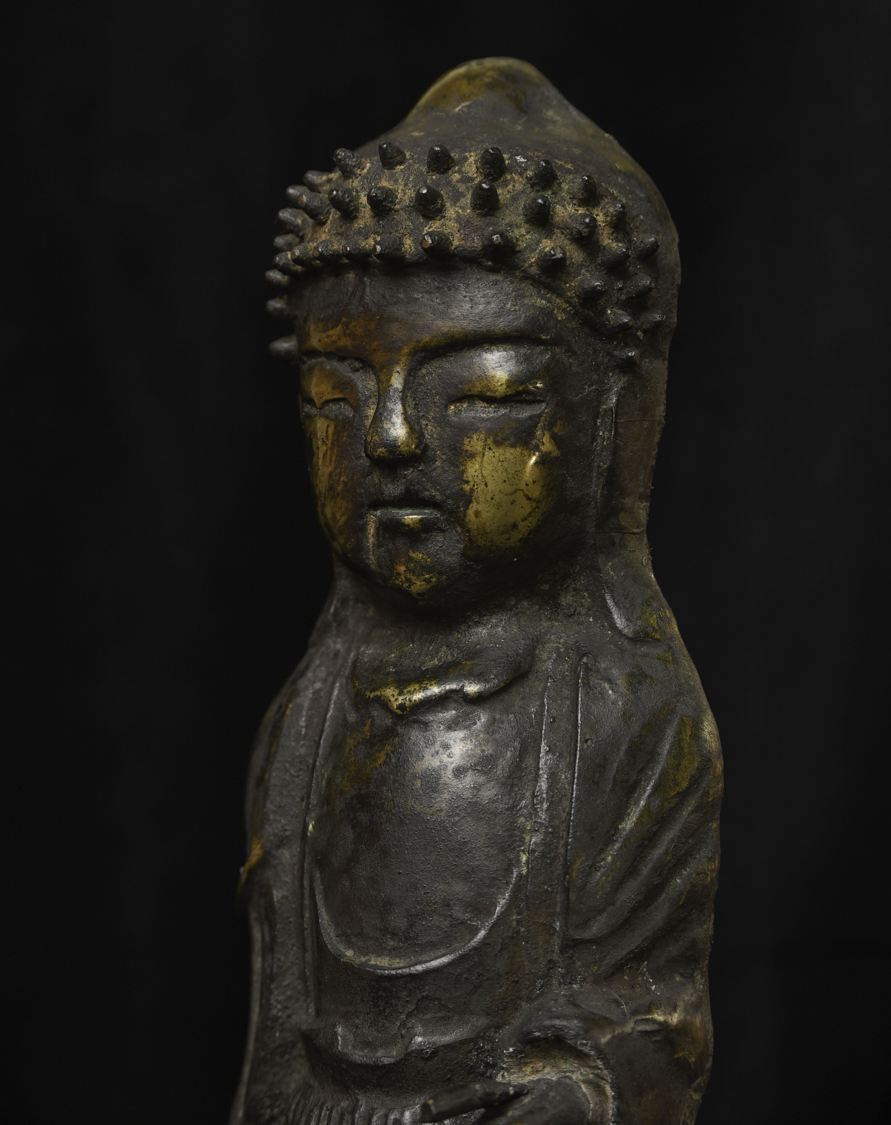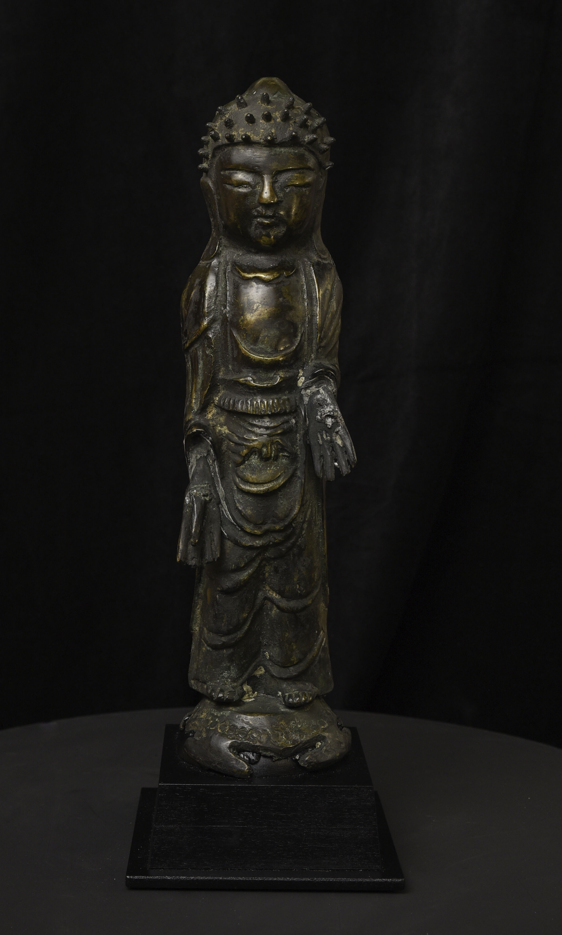 This is a very distinctive 13-15th-century standing bronze Korean Buddha. As you can see in the photos, there is a very closely related companion piece, which I am selling on my website as well. My strong preference is that I sell them together, but based on past experience I am offering them separately so that people have the option of considering them apart. I've never seen a pair like this, and I doubt that very few search closely related pairs exist in the world, especially in such complete condition with their original hands and bases. They are cast in a delightful provincial Style, which at first is deceptively simple and crude. The reality is that the sculptor has managed to create very successful spiritual statues that convey powerful imagery- as powerful as many of the most refined images. just look into the face of this Buddha and its companion. When I first saw this very distinctive standing Buddha and its counterpart, I immediately thought of Buddha Number 9020 on my website (thebuddhagallery.com). If you look at the photos below, you will see one of them that has 9020 alongside this one and its companion piece. As you can see they have a tremendous amount in common, from their oversized heads to the distinctive look and shape of their faces, to the way their robes drape to the way their bases are attached, to the way their backs are open, etc etc. You can see approximately what the backs would look like by looking at the back of 9020, though that statute was made of iron and is of a very different patina.14"H x 3.5"W not including the new custom base.